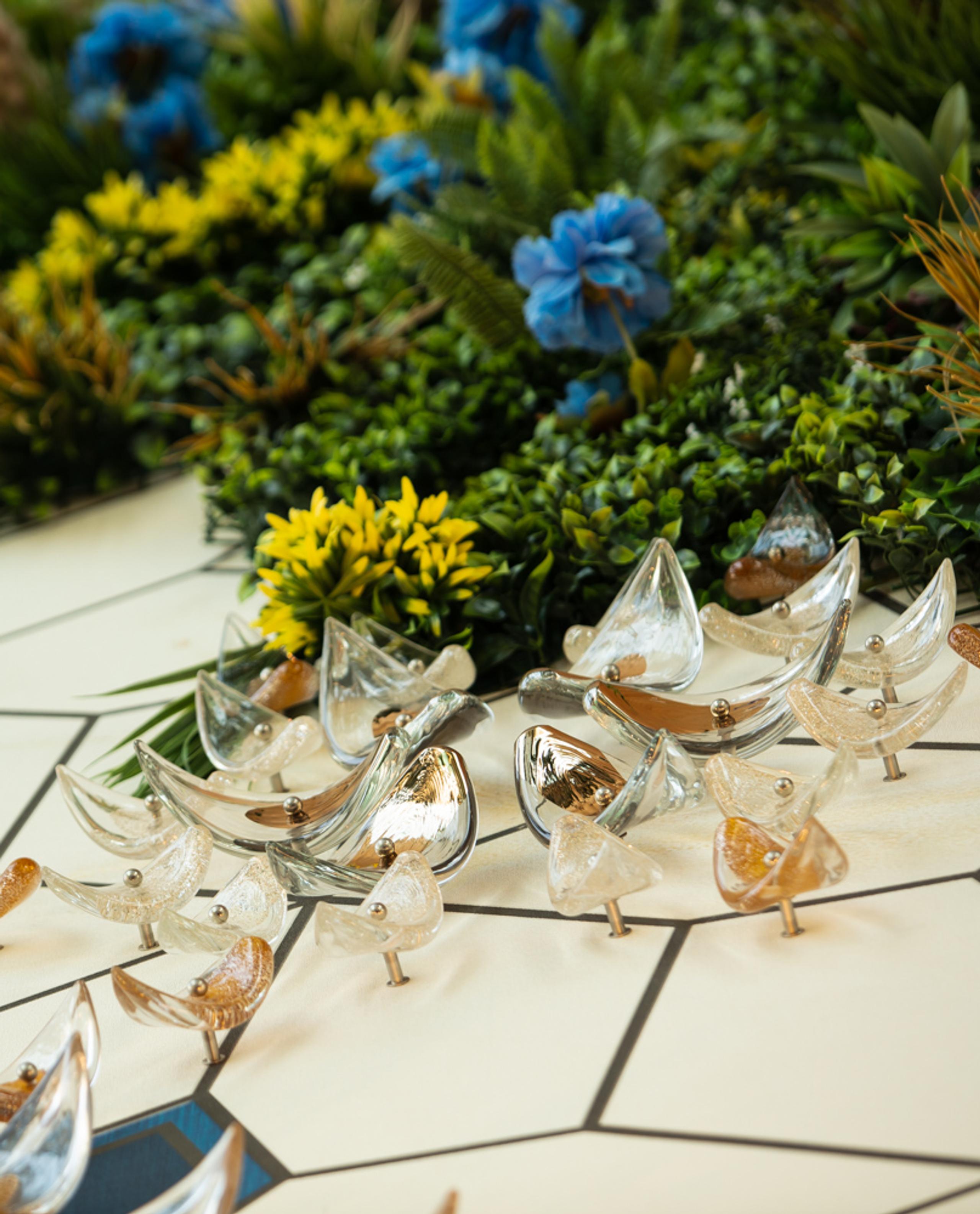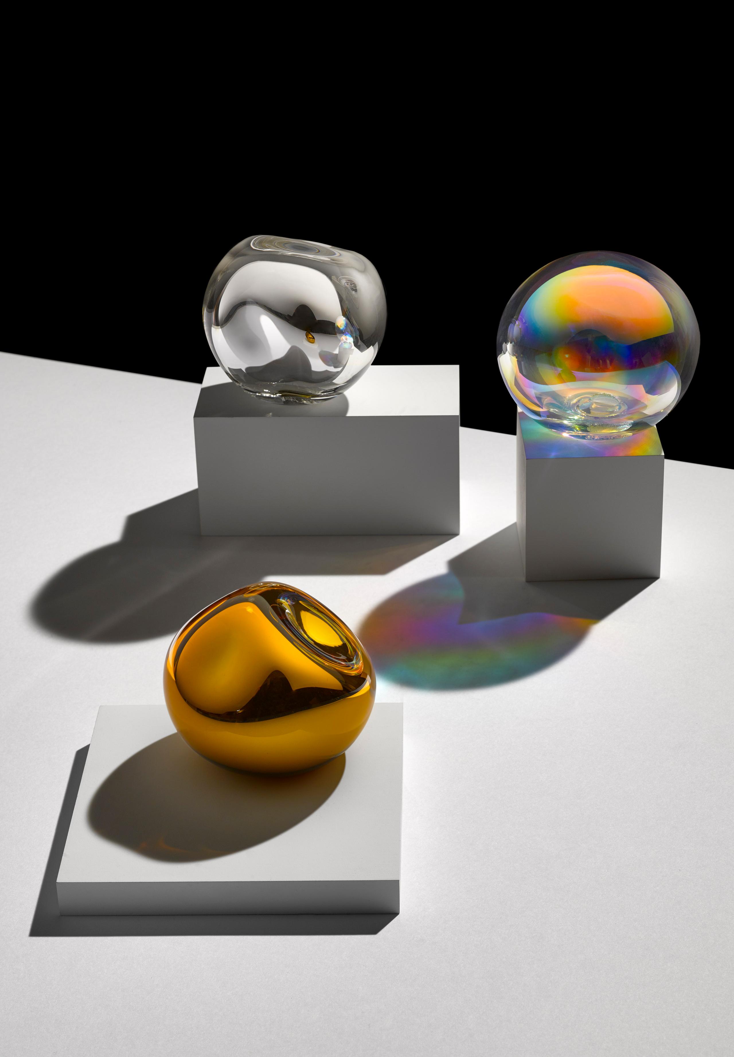 Collaboration with visionary artist and designer Arik Levy for Milano Design Week 2024 featured irregular glass shapes coated with a flawless metallic nano-surface to enhance reflection and light.