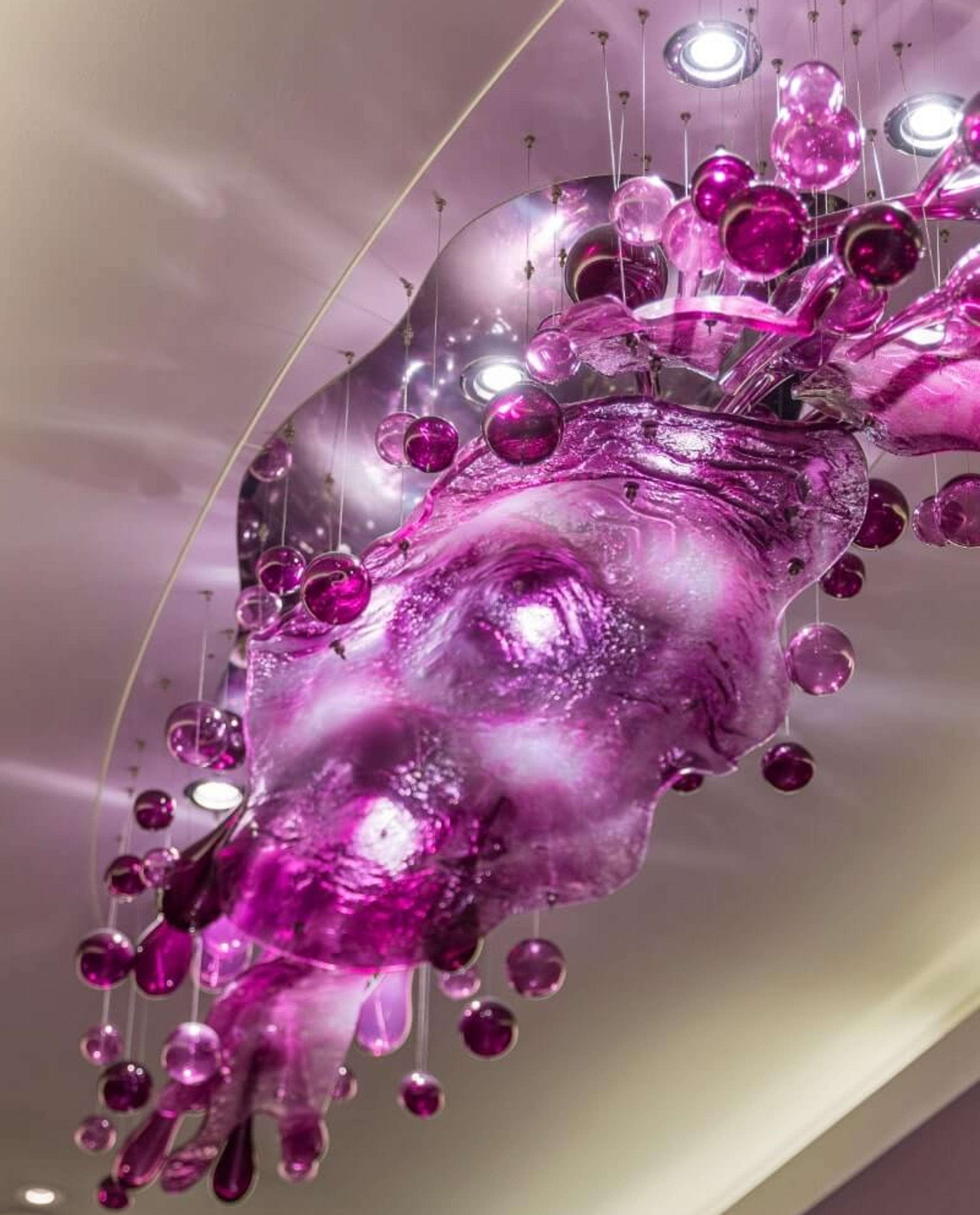 Bold colours and abstract style combine to create our splash installation in the hotel’s lobby. This piece is formed from the unconventional yet captivating combination of slumped and hand-blown glass, finished in purples and pinks.