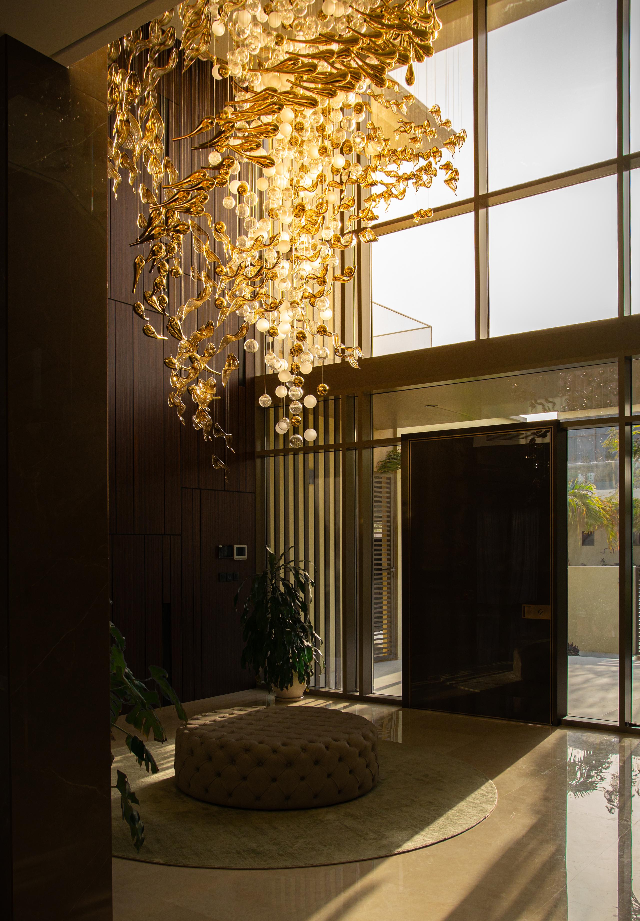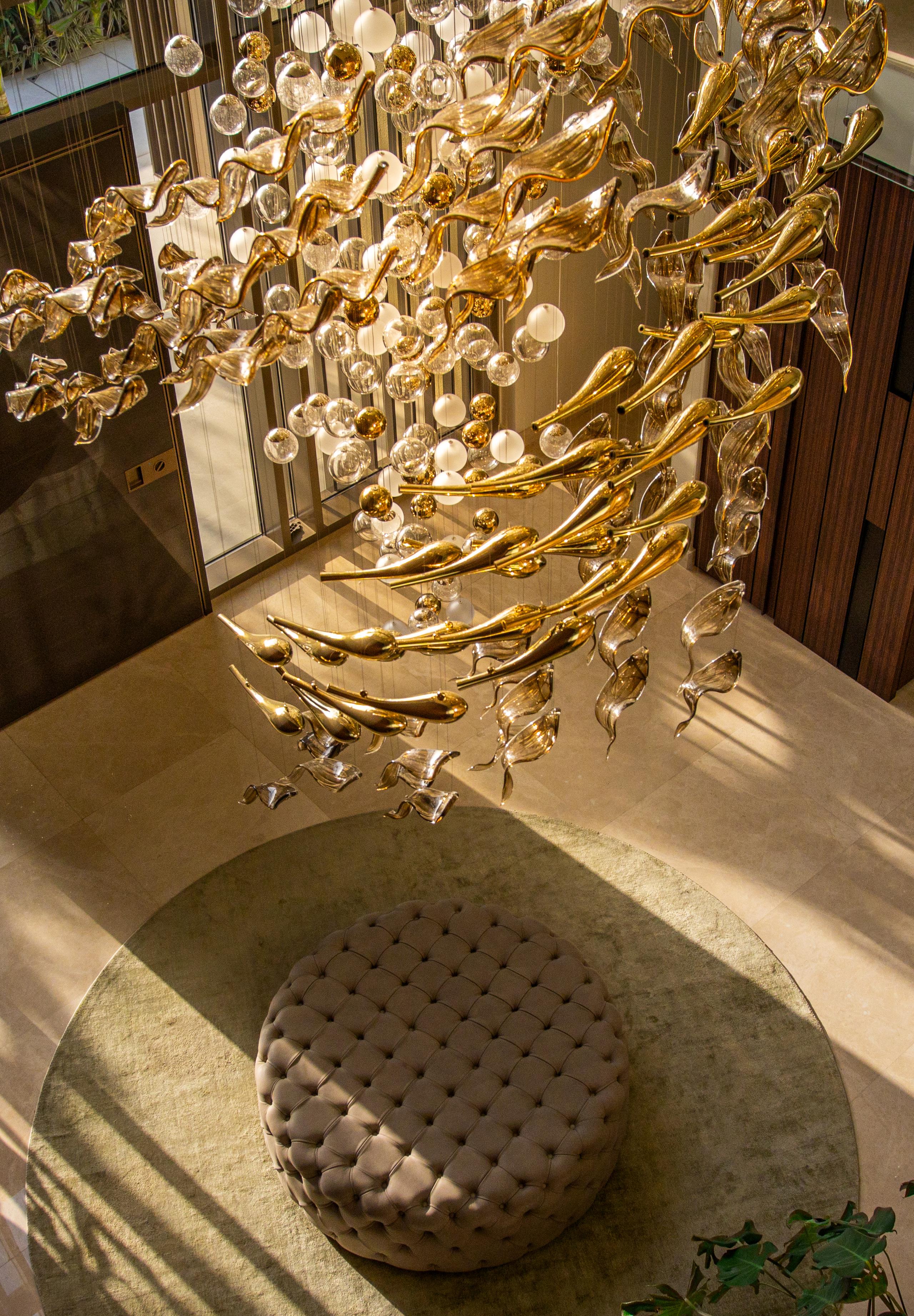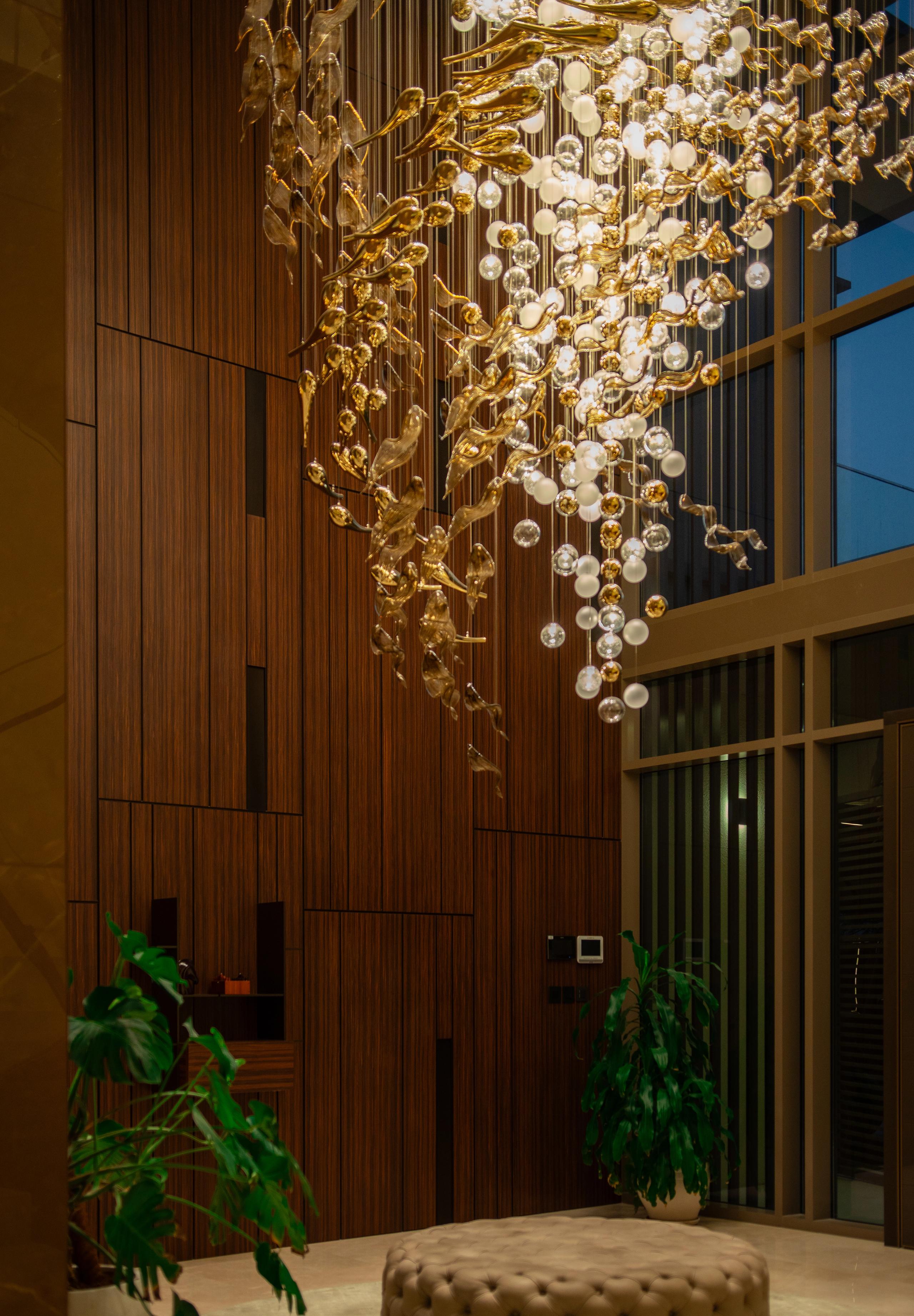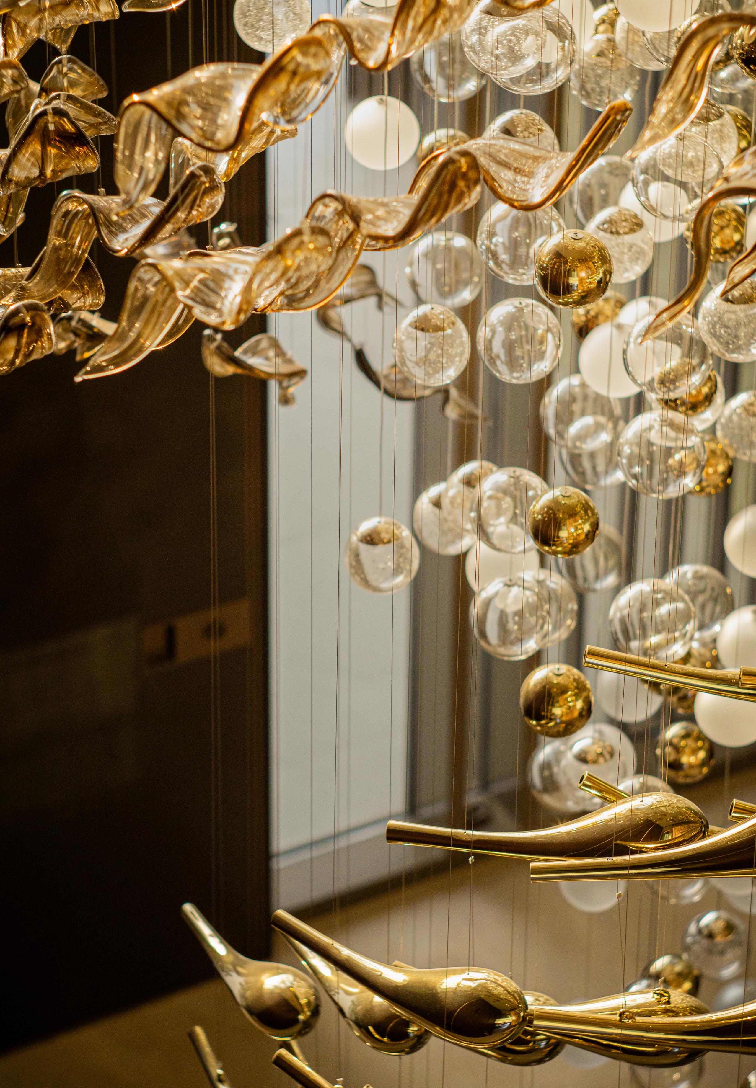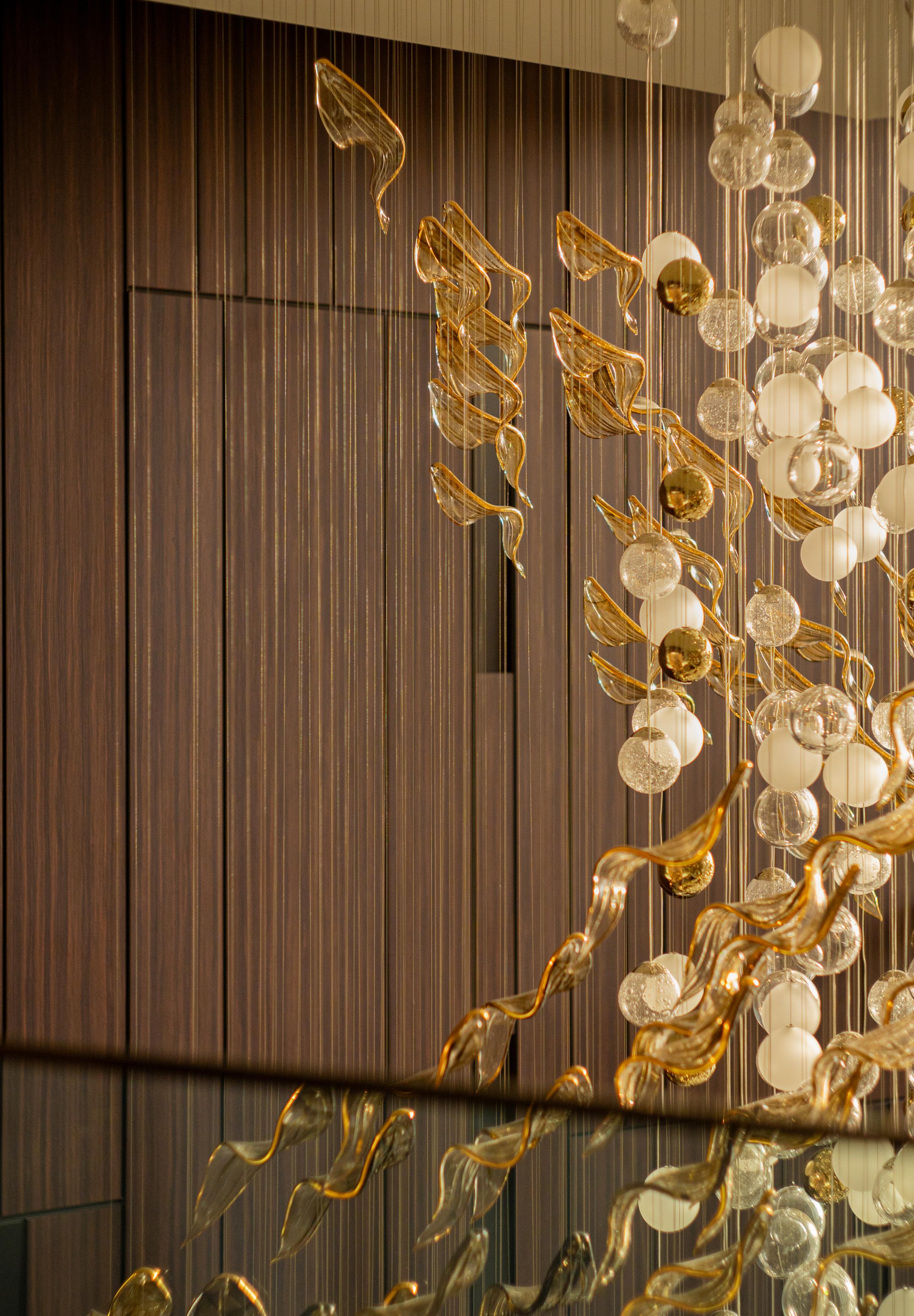 At the heart of the double-height entrance stands a bespoke five-metre Sans Souci installation. Composed of handblown glass in clear, opal, and tobacco-misted finishes, and complemented by components enhanced with golden nanocoating, it forms a dynamic centrepiece that transforms throughout the day. As natural and ambient light shift, the installation reveals subtle changes in tone, depth, and reflection – adding an unmistakable sense of movement and character to the interior.