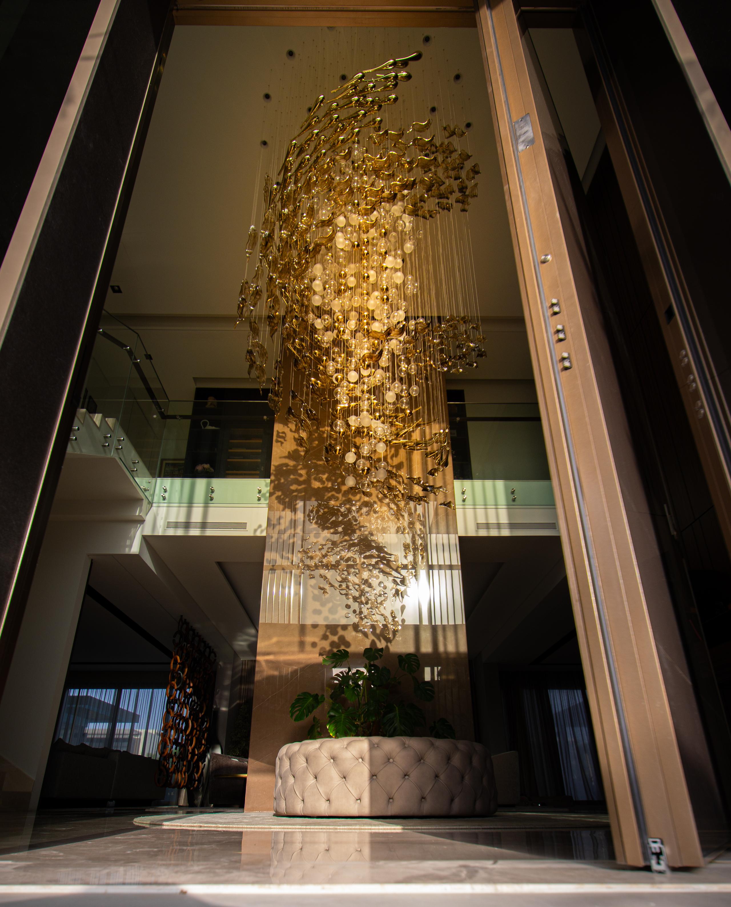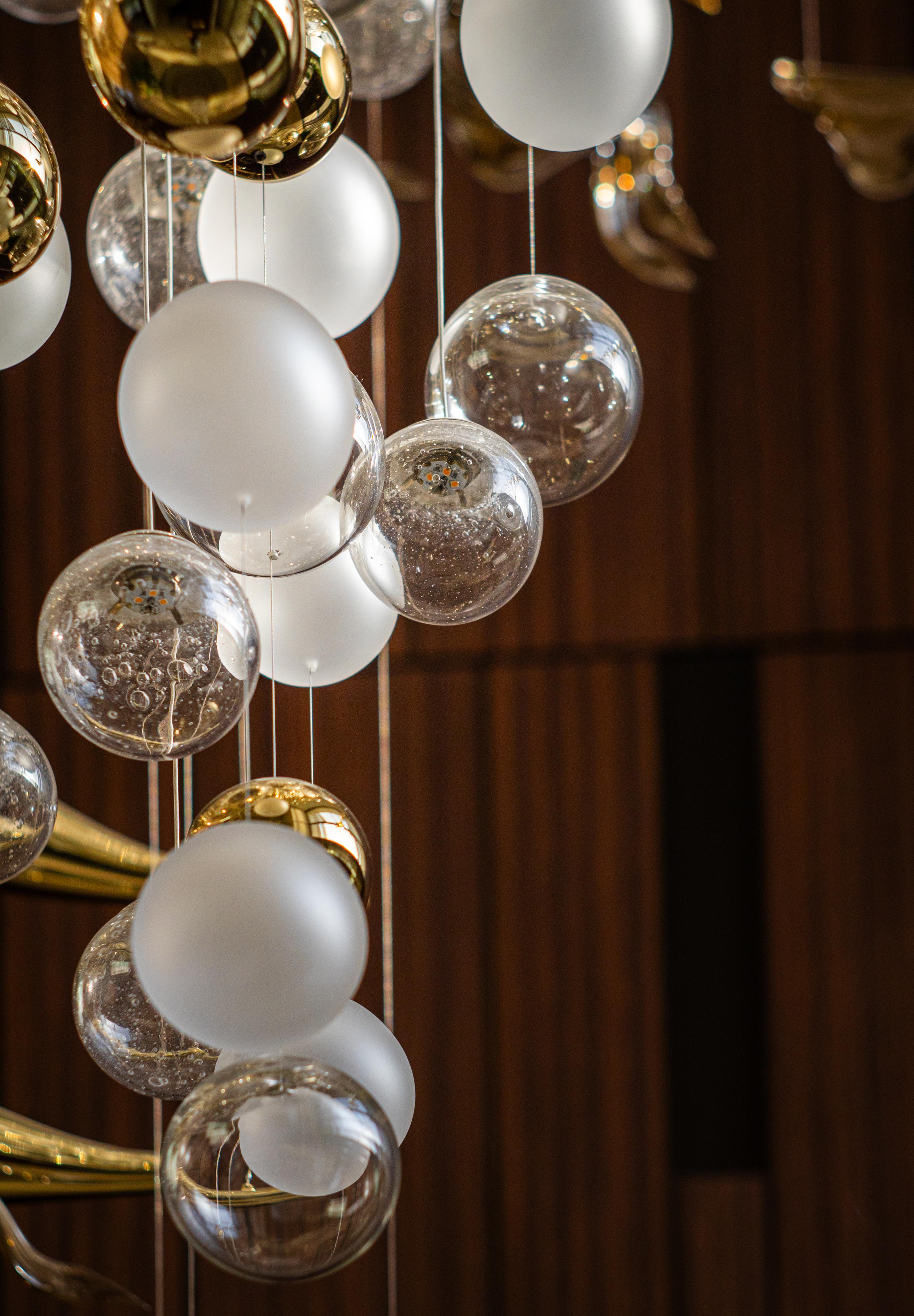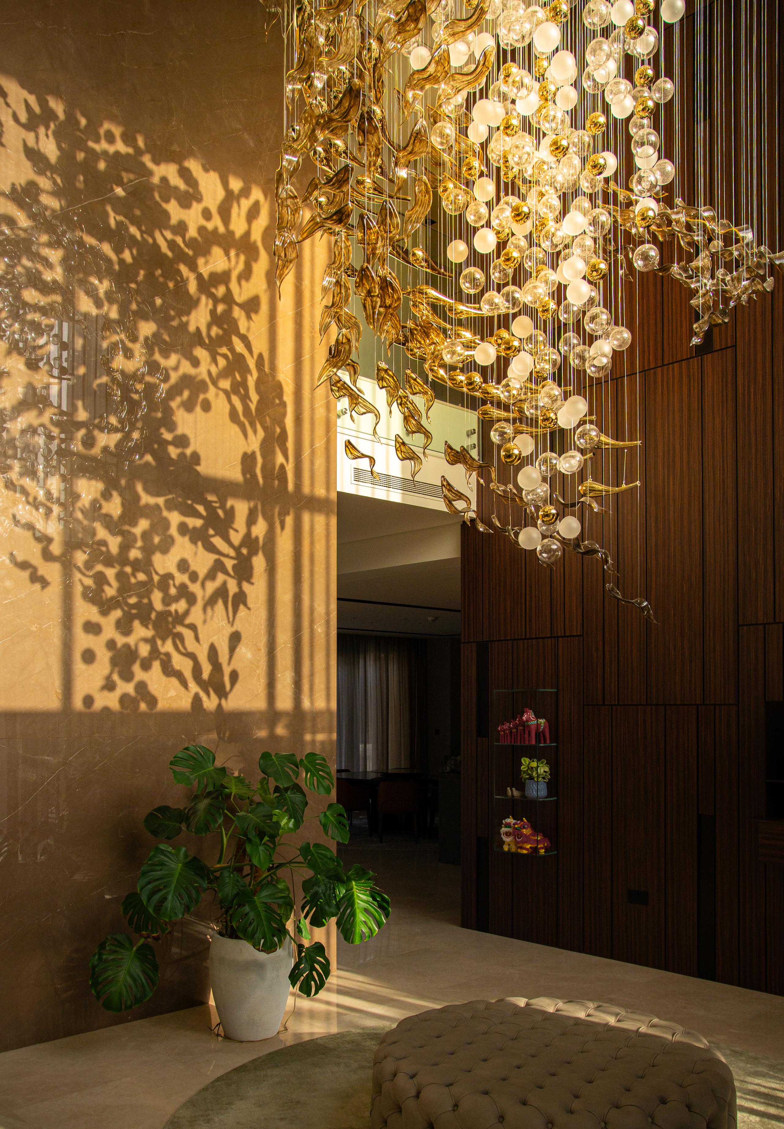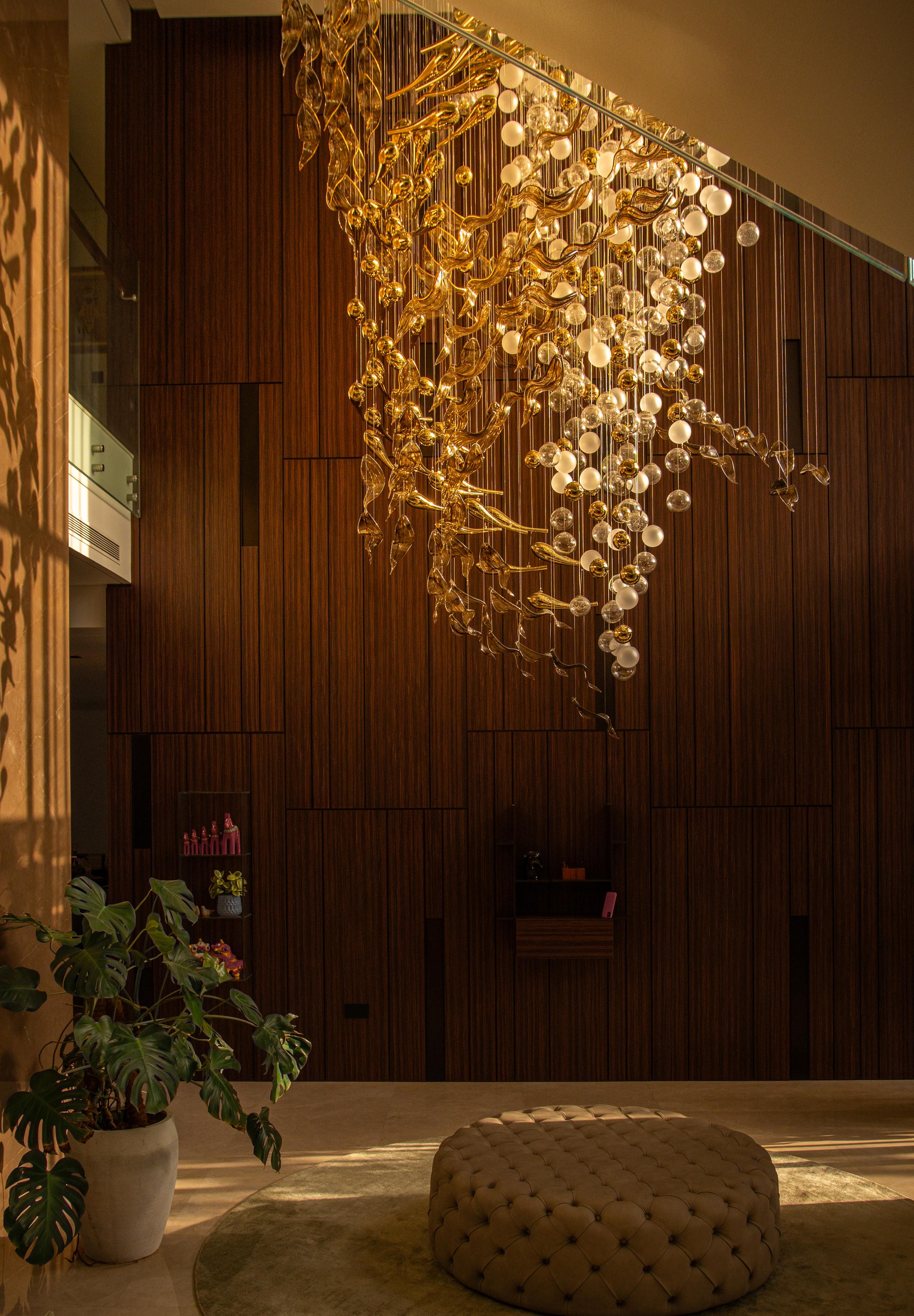 At the heart of the double-height entrance stands a bespoke five-metre Sans Souci installation. Composed of handblown glass in clear, opal, and tobacco-misted finishes, and complemented by components enhanced with golden nanocoating, it forms a dynamic centrepiece that transforms throughout the day. As natural and ambient light shift, the installation reveals subtle changes in tone, depth, and reflection – adding an unmistakable sense of movement and character to the interior.