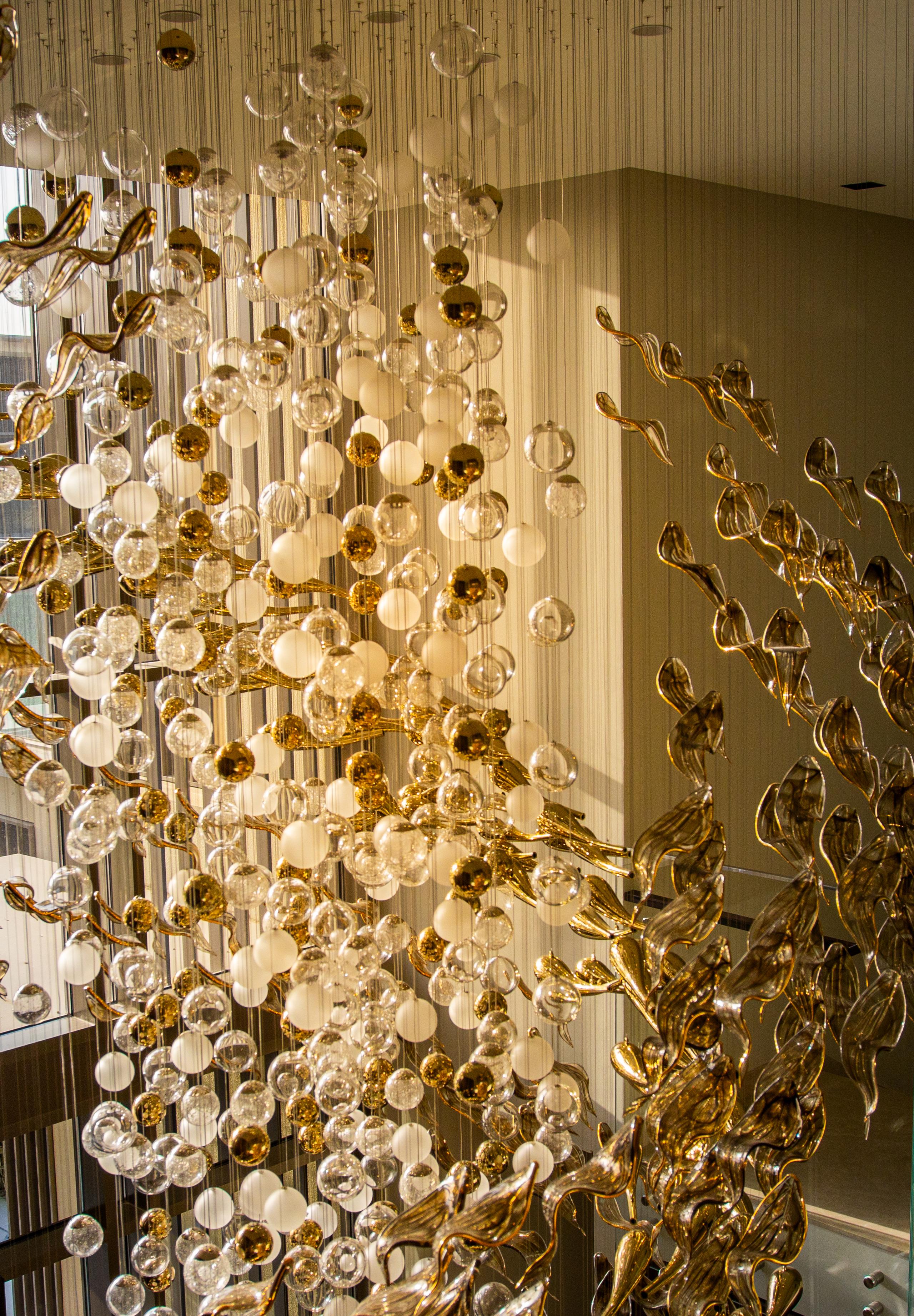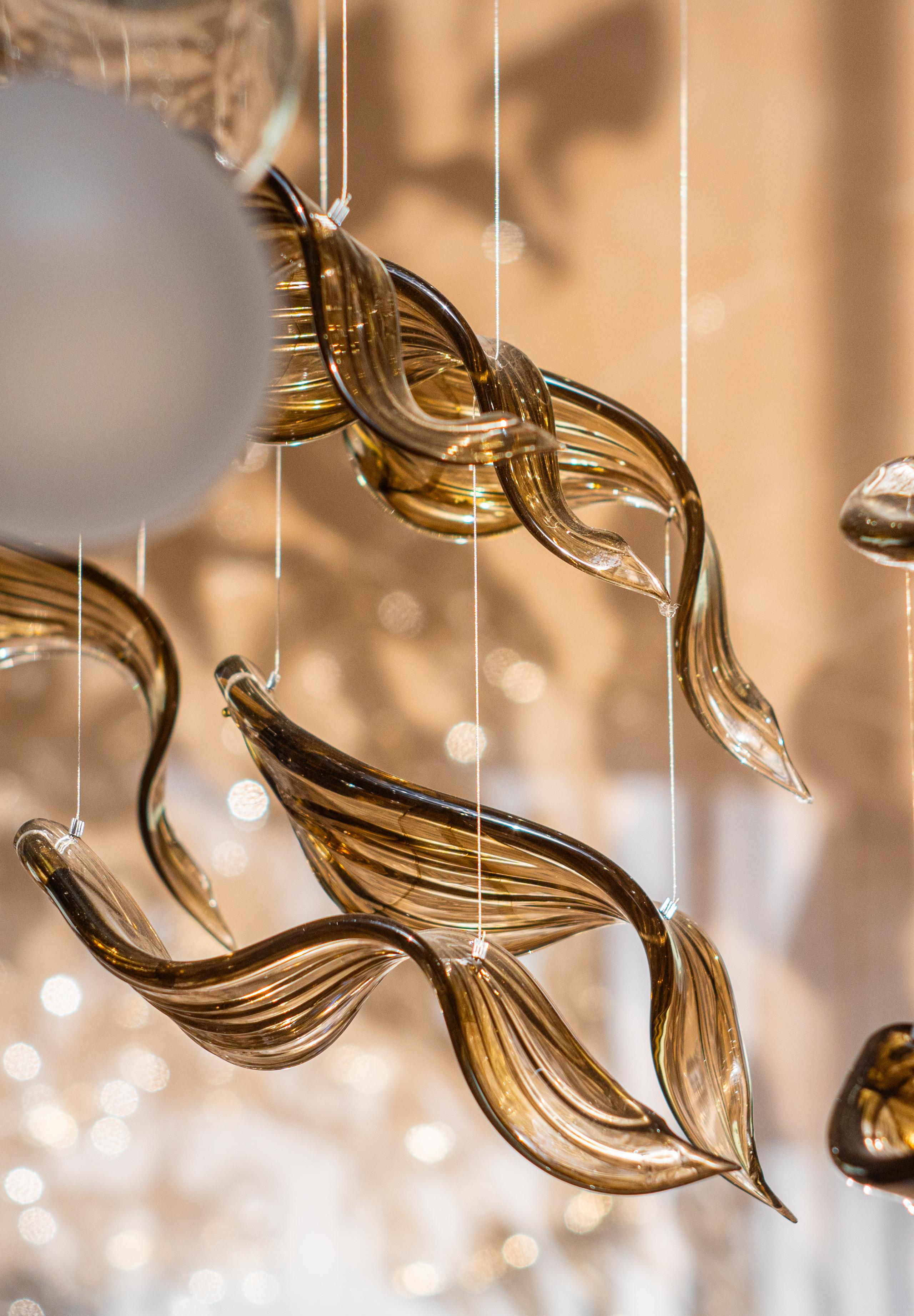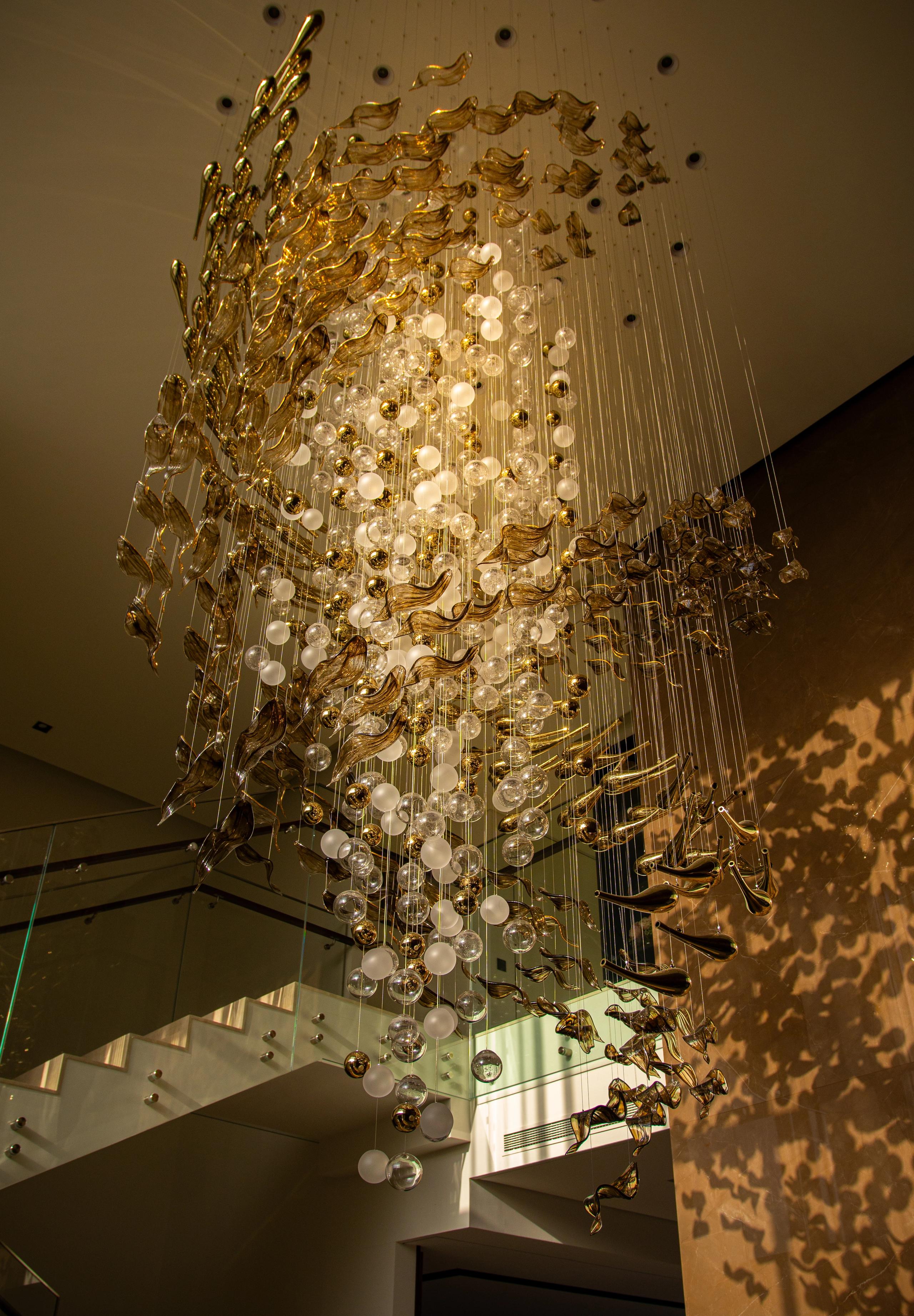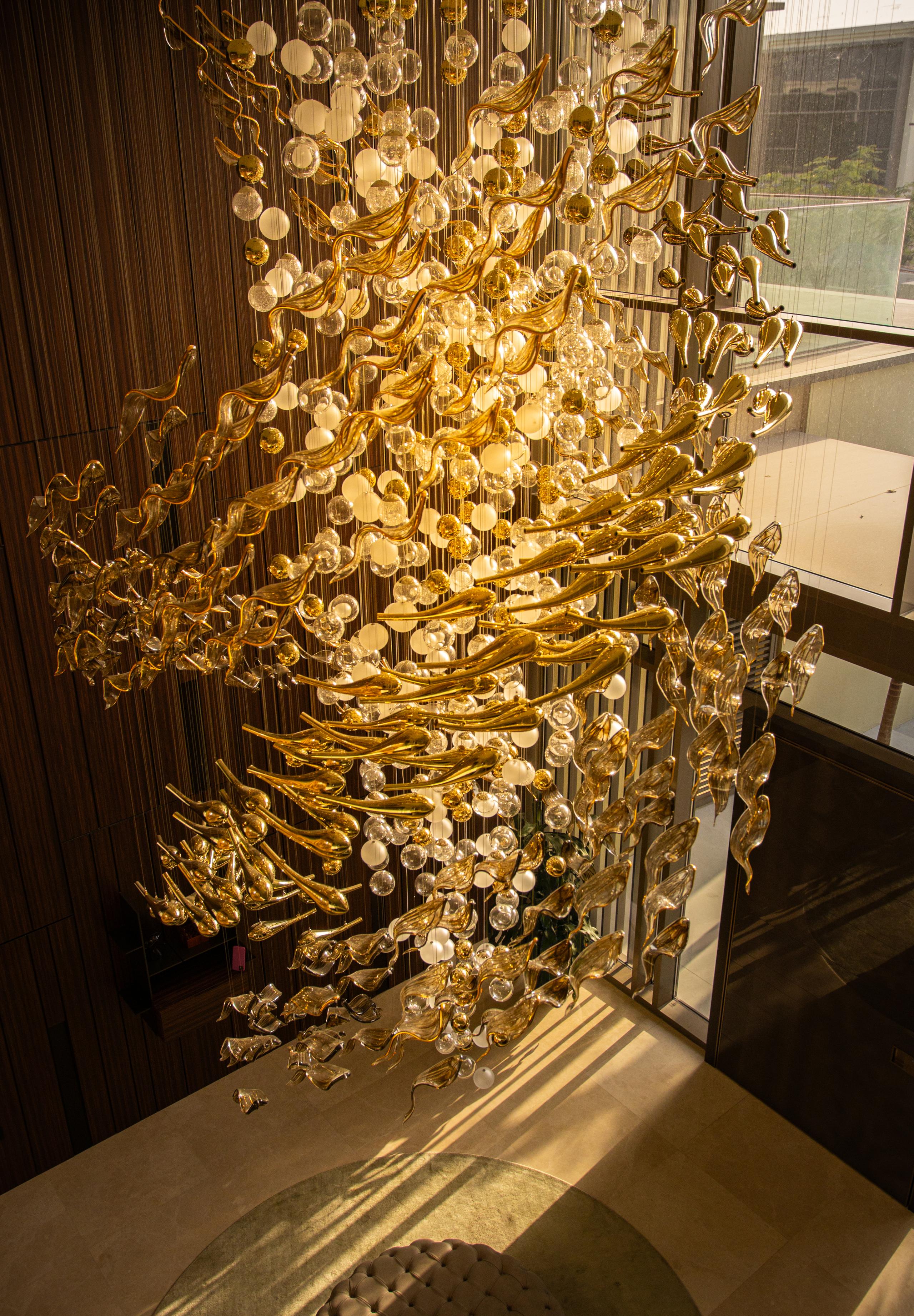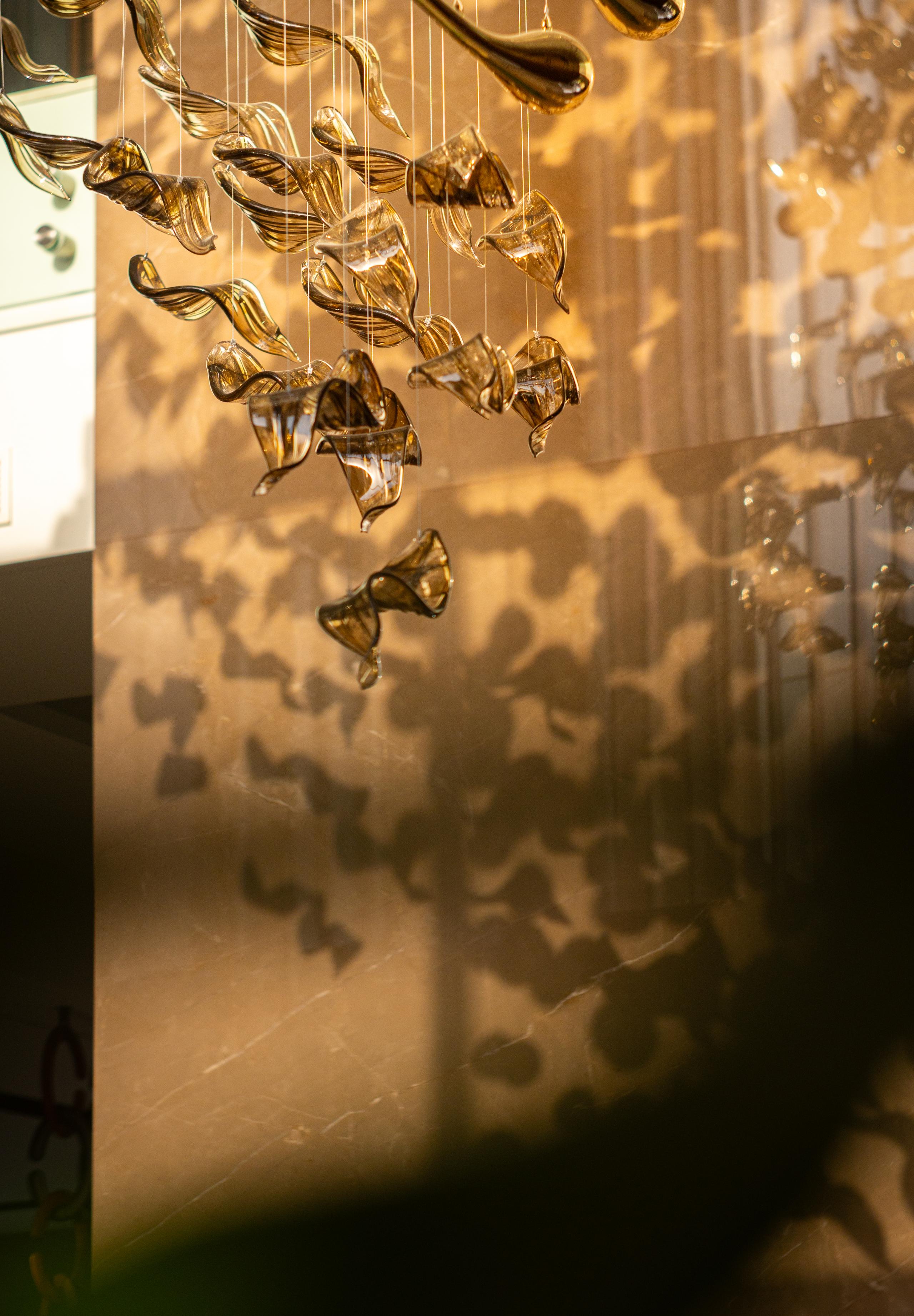 At the heart of the double-height entrance stands a bespoke five-metre Sans Souci installation. Composed of handblown glass in clear, opal, and tobacco-misted finishes, and complemented by components enhanced with golden nanocoating, it forms a dynamic centrepiece that transforms throughout the day. As natural and ambient light shift, the installation reveals subtle changes in tone, depth, and reflection – adding an unmistakable sense of movement and character to the interior.