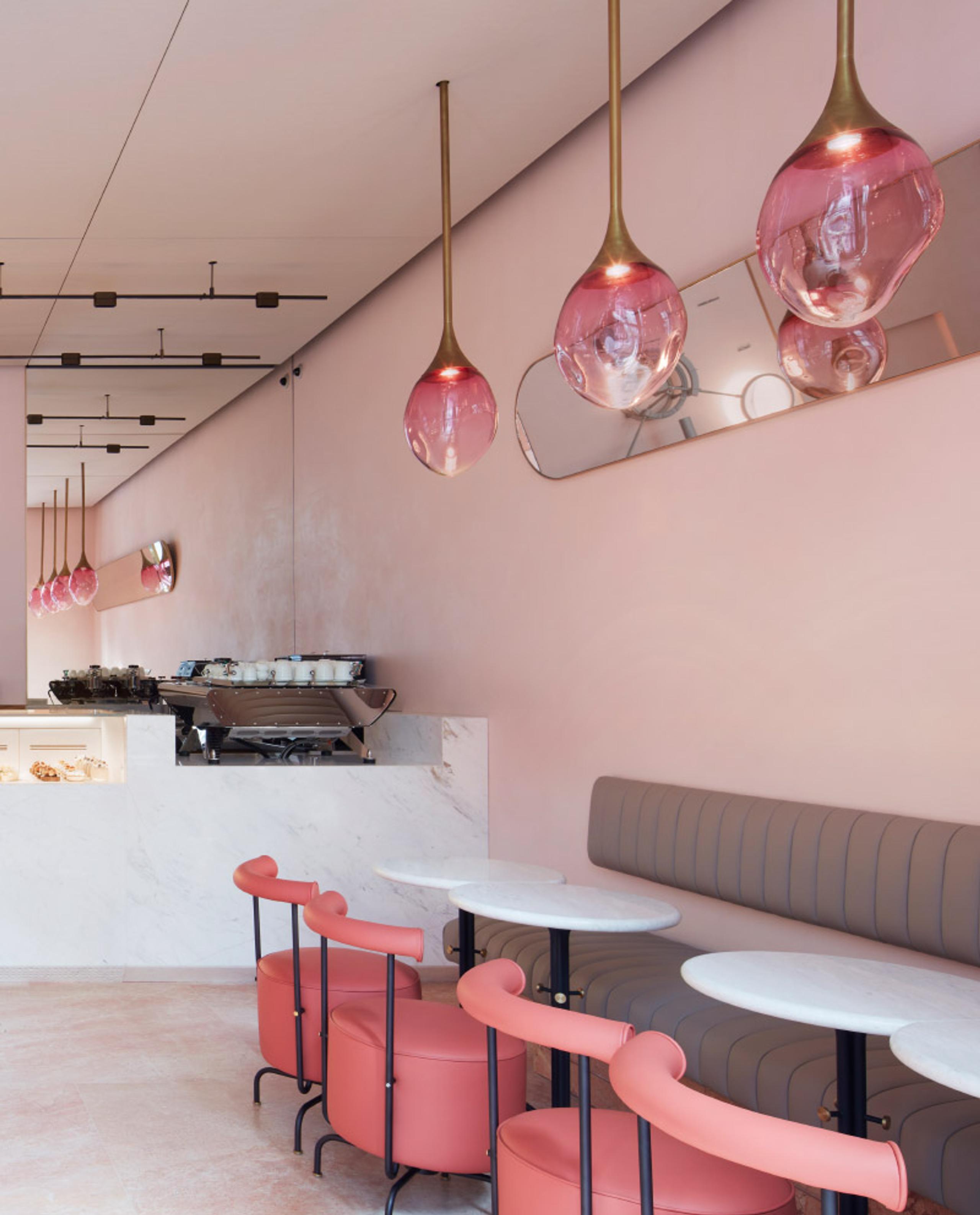 Sans Souci designer Tomas Sakra designed a series of hand-blown and hand-shaped pendants, each coloured pink and fitted to the ceiling using brass fixtures. Like the exquisite hand-finished pastries, each crystal pendant is a true original, highlighting the endless possibilities for glass-making artistry.