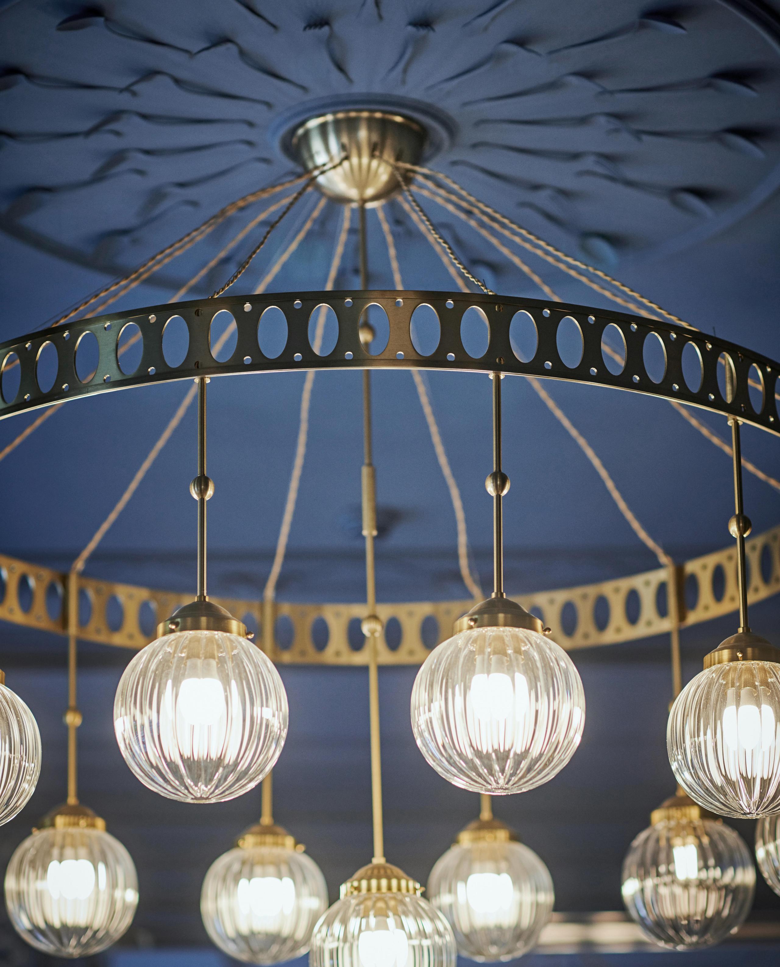 The villa's allure is significantly enhanced by a series of our lighting installations. Grand ceiling chandeliers, showcasing ribbed, sandblasted Bohemian Crystal spheres with a brushed brass frame, transform traditional lighting into symbols of refined luxury. Complementing these are the ribbed clear glass tube chandeliers with brass-coated fringes, alongside matching wall lamps in the Art Deco style. These lighting elements work together to elevate the villa's sophisticated design.