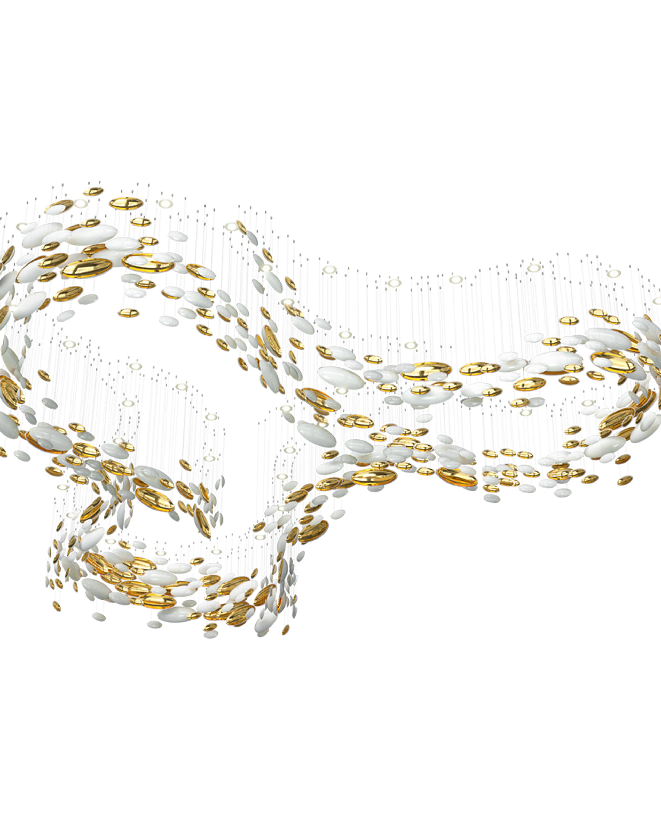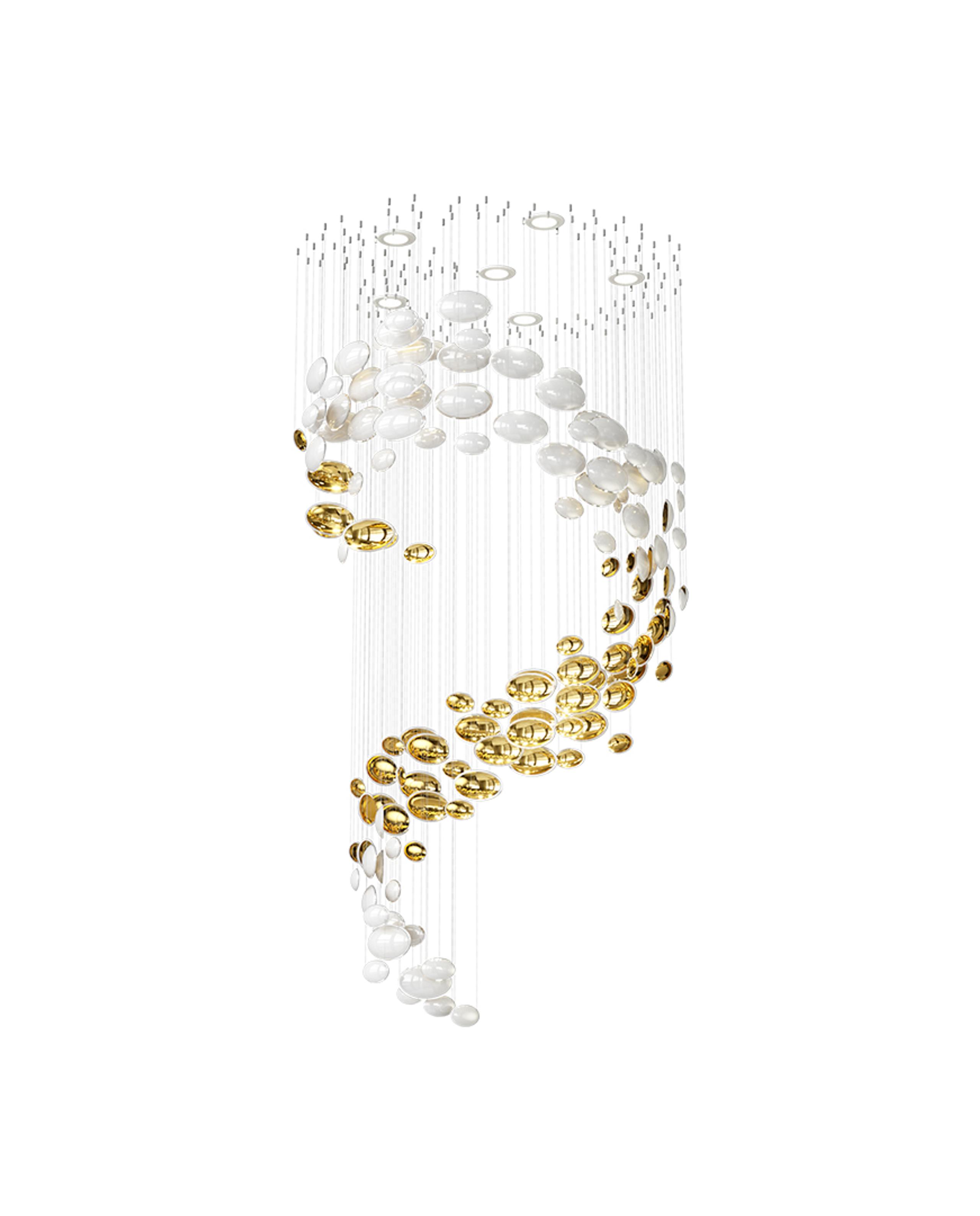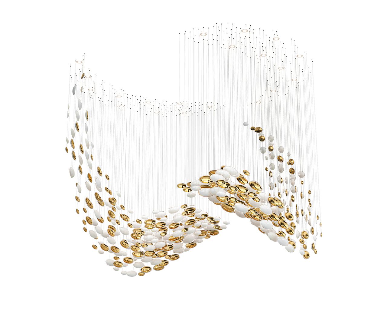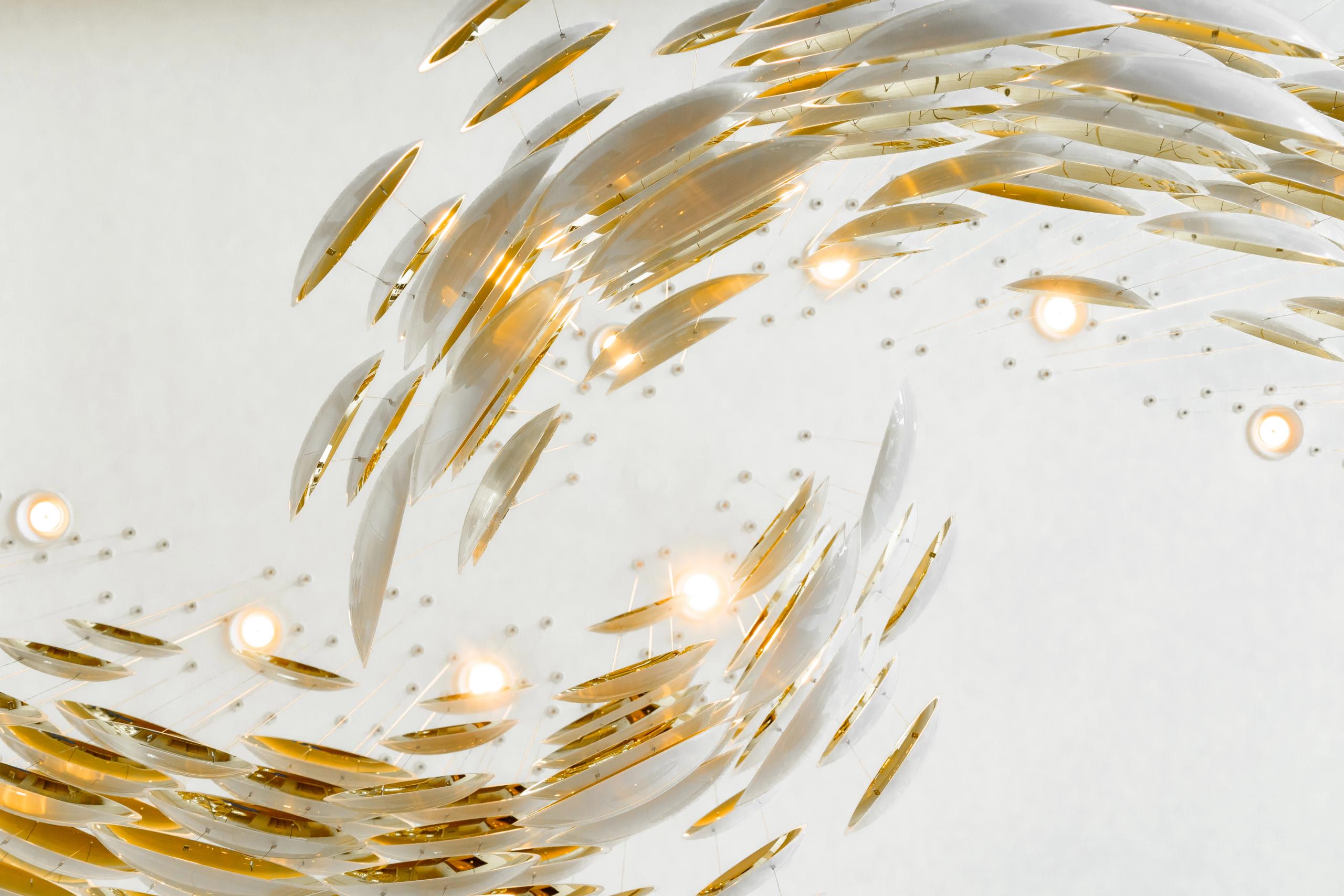 Embodying elegance in its purest form, the Bowls collection showcases a sleek design that creates a fluid wave of light within any interior. Each crystal piece is enhanced by contrasting finishes – one side features a reflective metal nanocoating, while the other is infused with a complementary colour. Suspended in a flowing arrangement, Bowls forms a striking, contemporary statement piece.