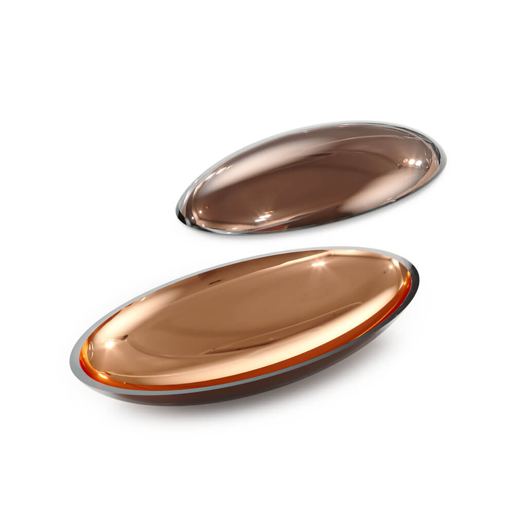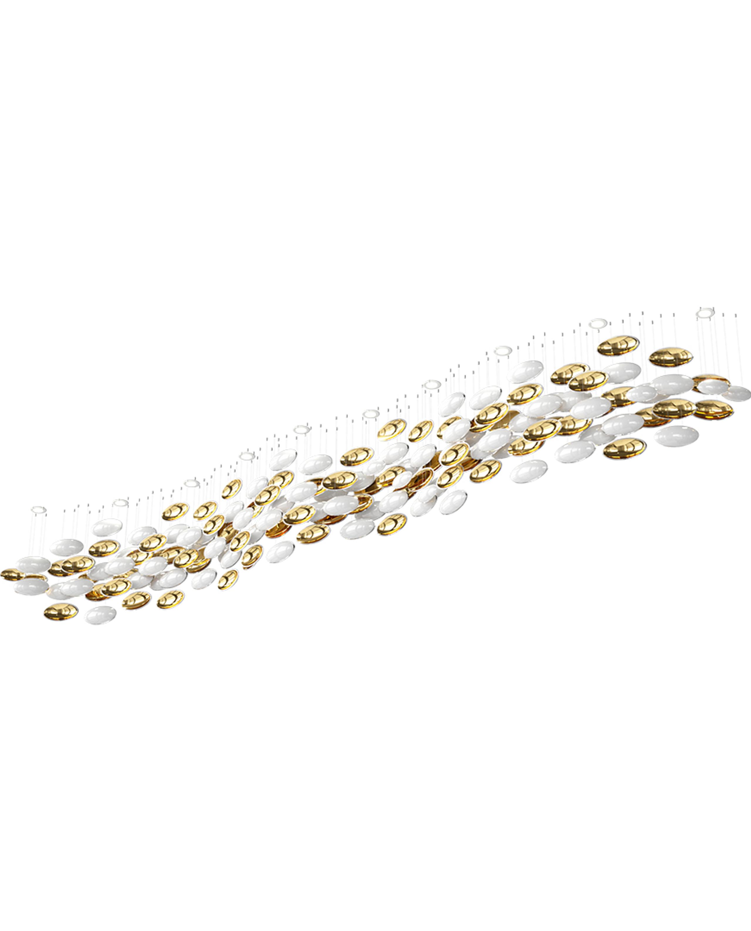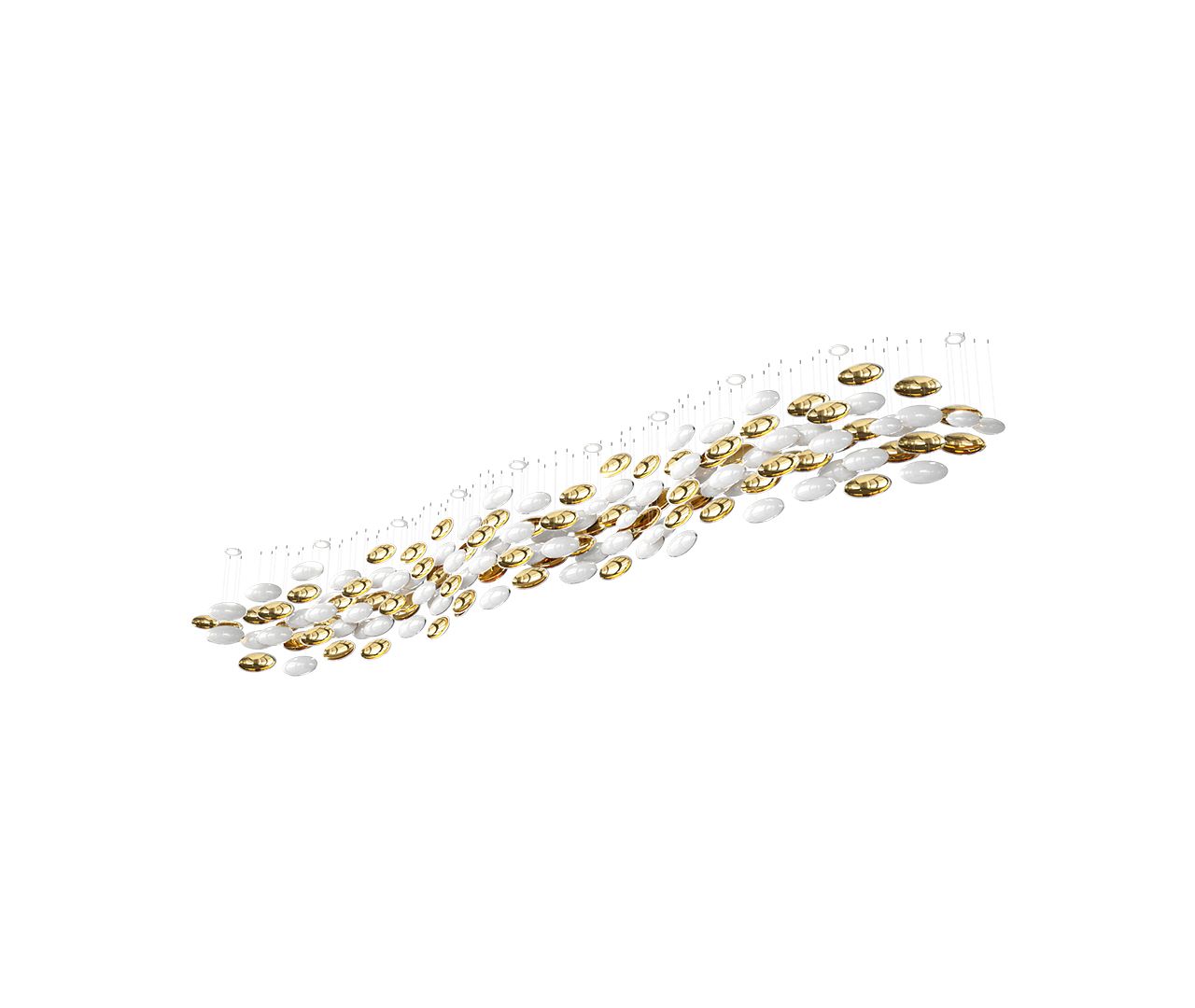 Embodying elegance in its purest form, the Bowls collection showcases a sleek design that creates a fluid wave of light within any interior. Each crystal piece is enhanced by contrasting finishes – one side features a reflective metal nanocoating, while the other is infused with a complementary colour. Suspended in a flowing arrangement, Bowls forms a striking, contemporary statement piece.
