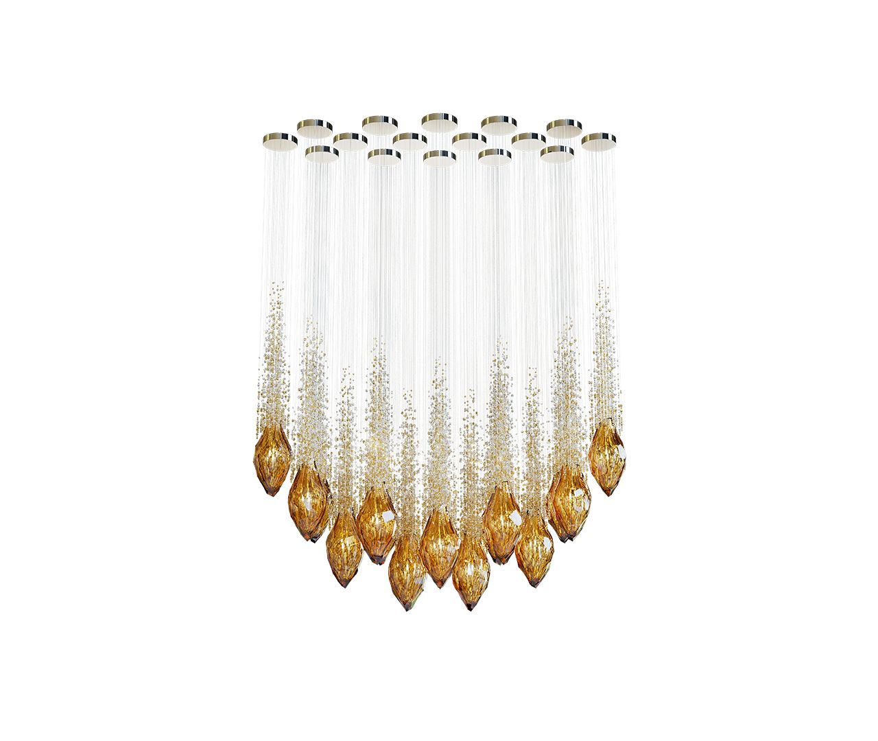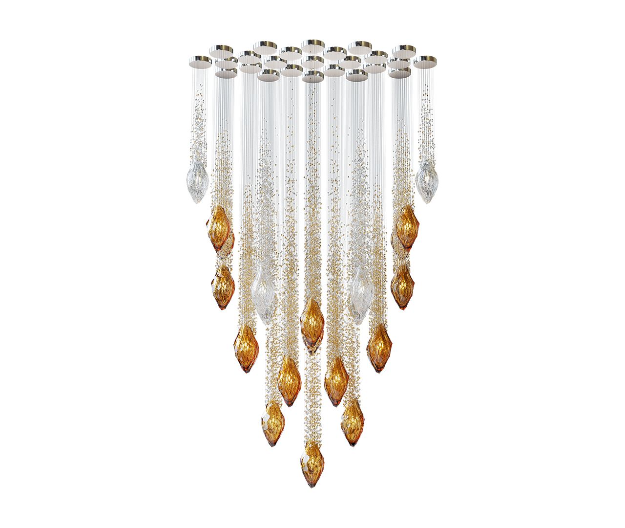 Capturing the beauty of a comet streaking through the night, the Flash collection features handblown crystal gems, each followed by a tail of glittering beads. Cascading downward, they create a bold installation that fills any interior with vibrant light and movement.