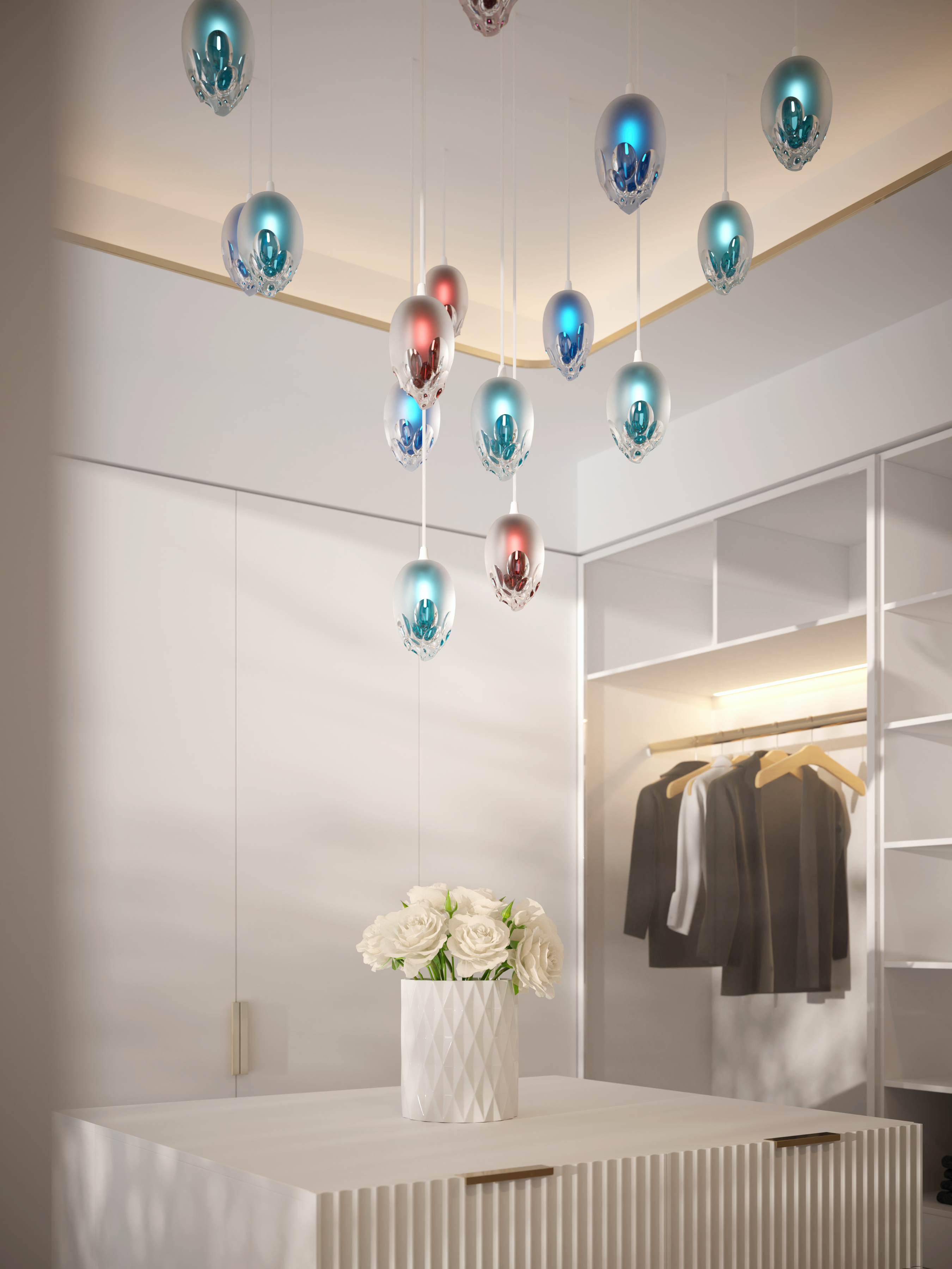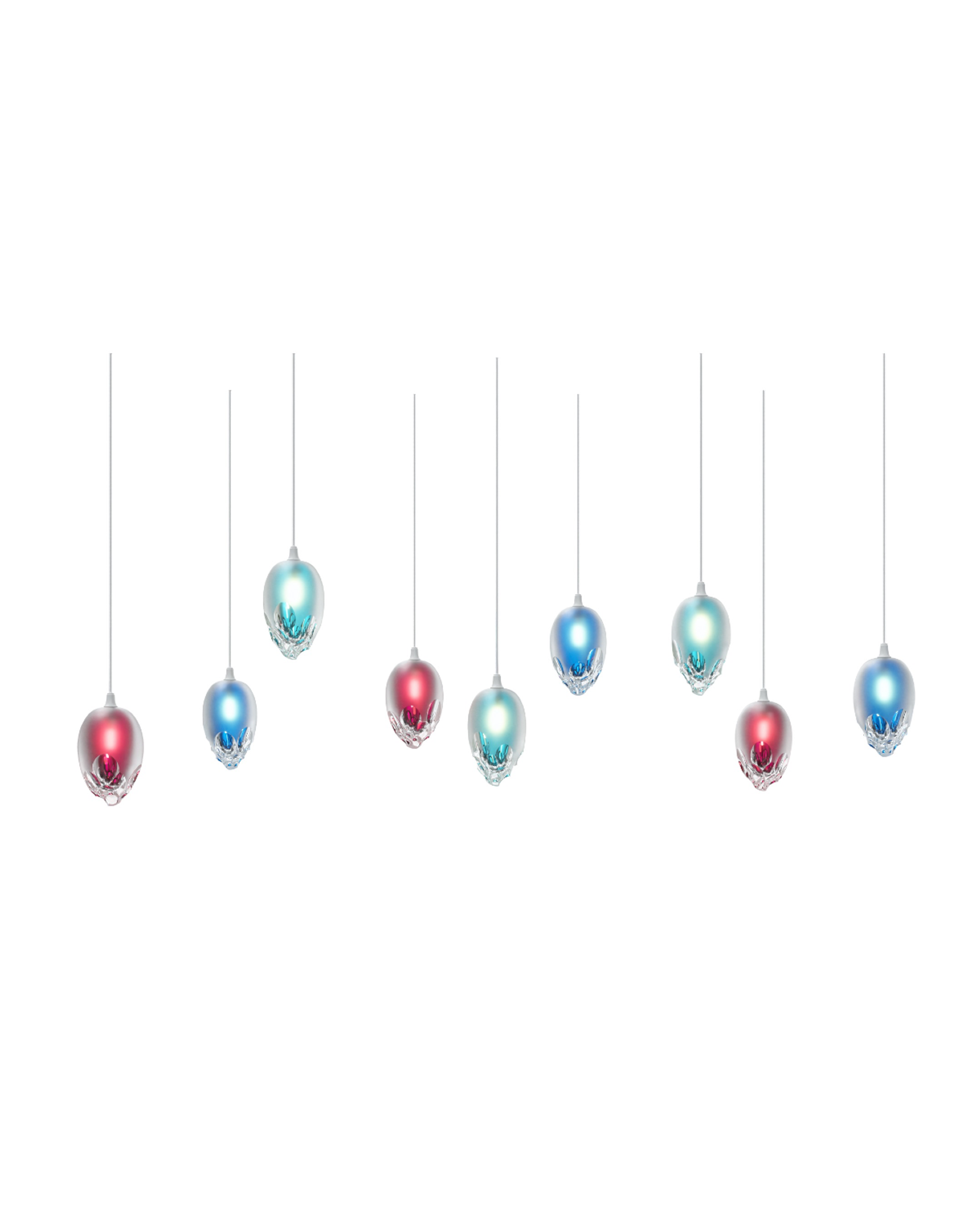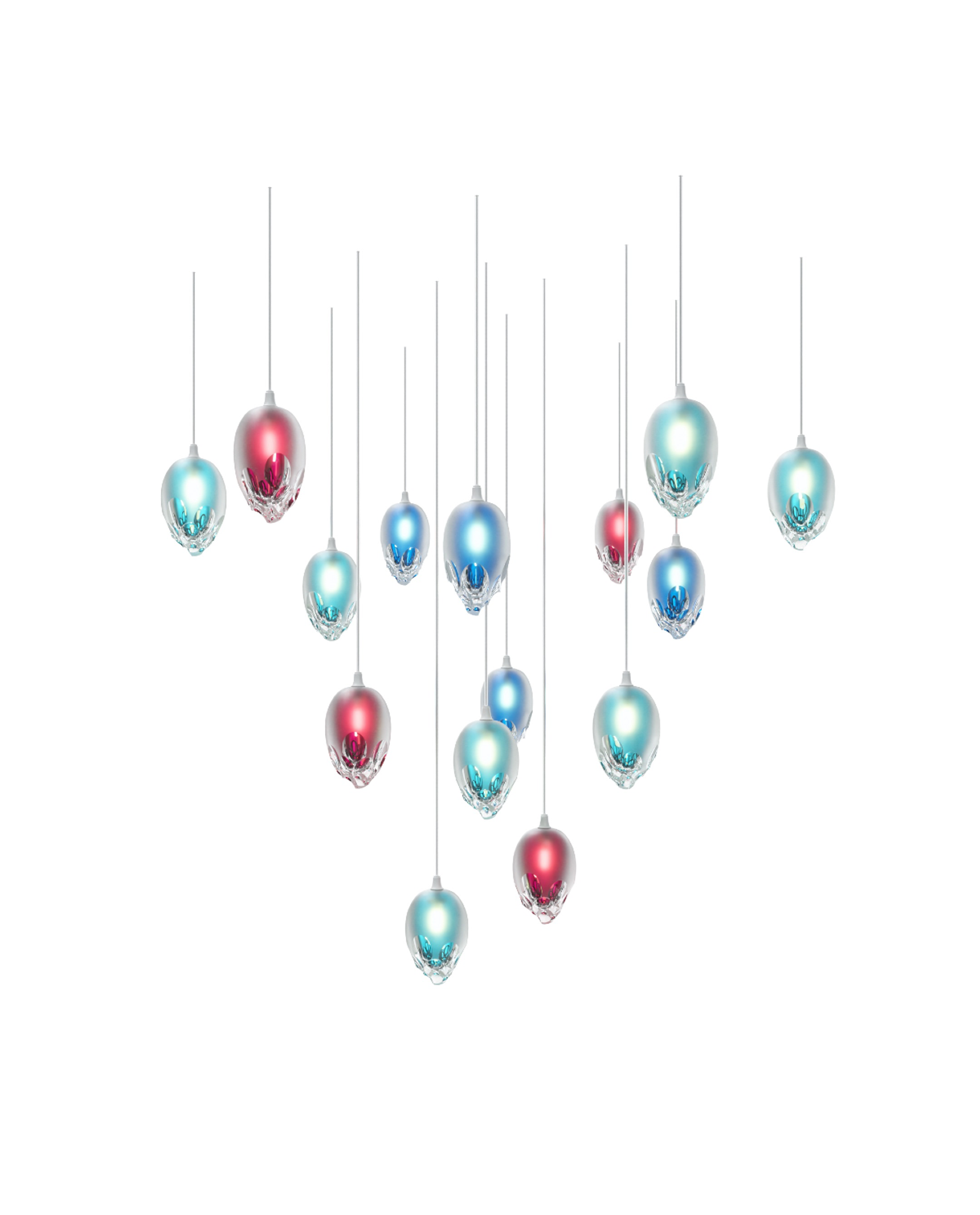 The GEM collection harnesses the latest glass-cutting techniques to create dazzling pendants in deep jewel hues of Aquamarine, Emerald and Dark Heliotrope. Each component is cut and polished to create the ultimate luxury piece for your interior.