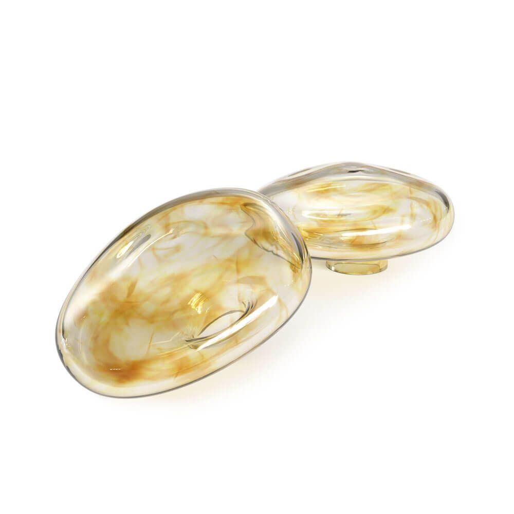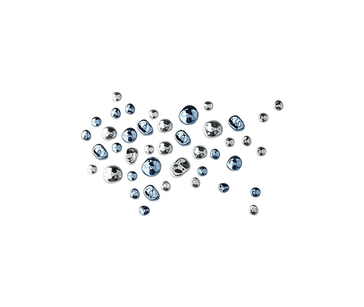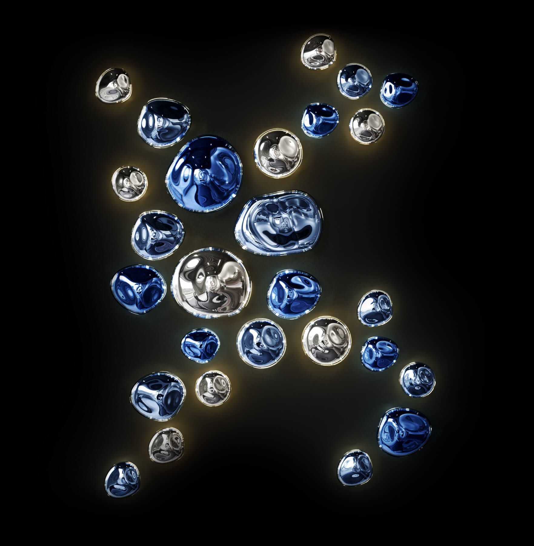 The Nuggets collection draws inspiration from raw, naturally formed lumps of gold and other precious metals found deep within the earth. Each crystal component is individually handblown and uniquely shaped, then finished with a reflective metal nanocoating. Every piece is one of a kind, allowing Nuggets to adorn any wall in captivating patterns.