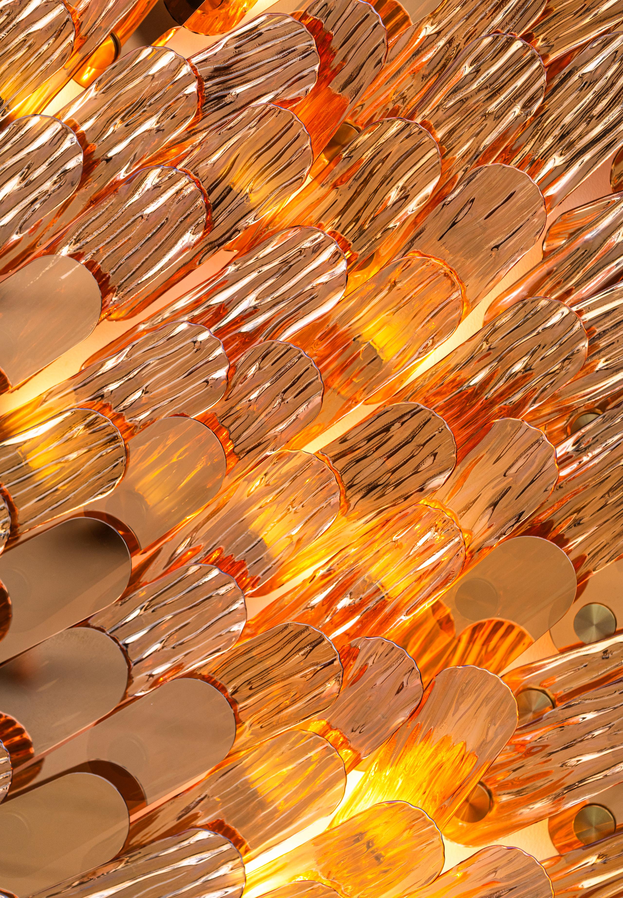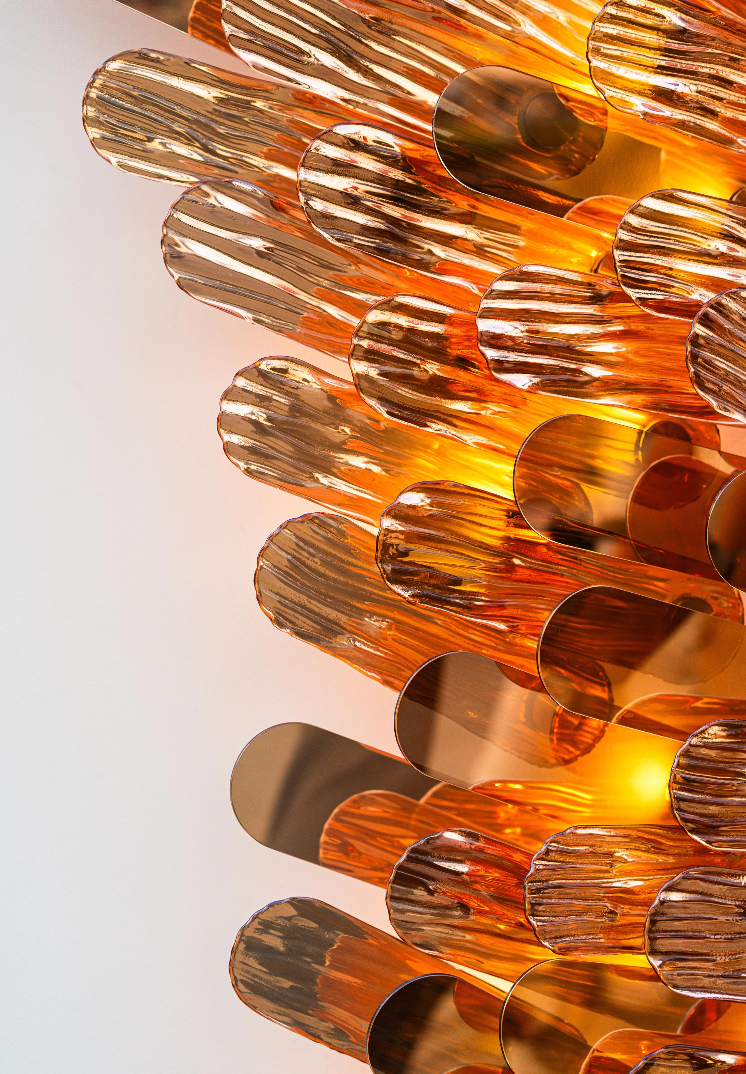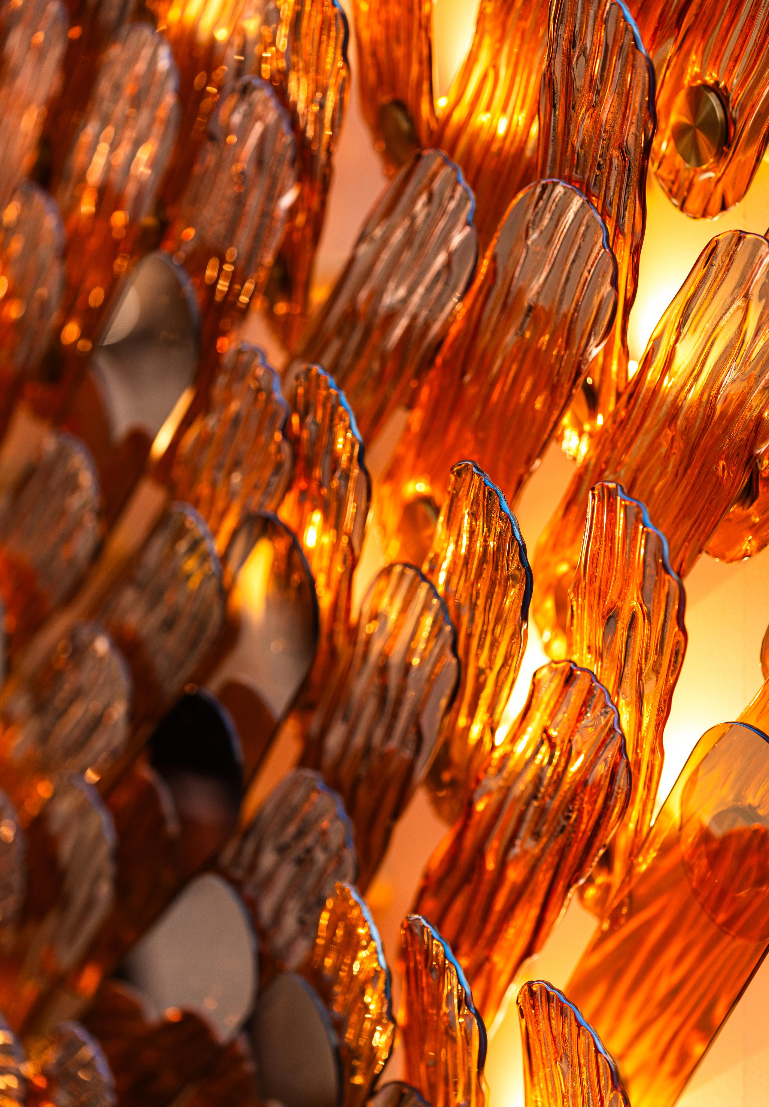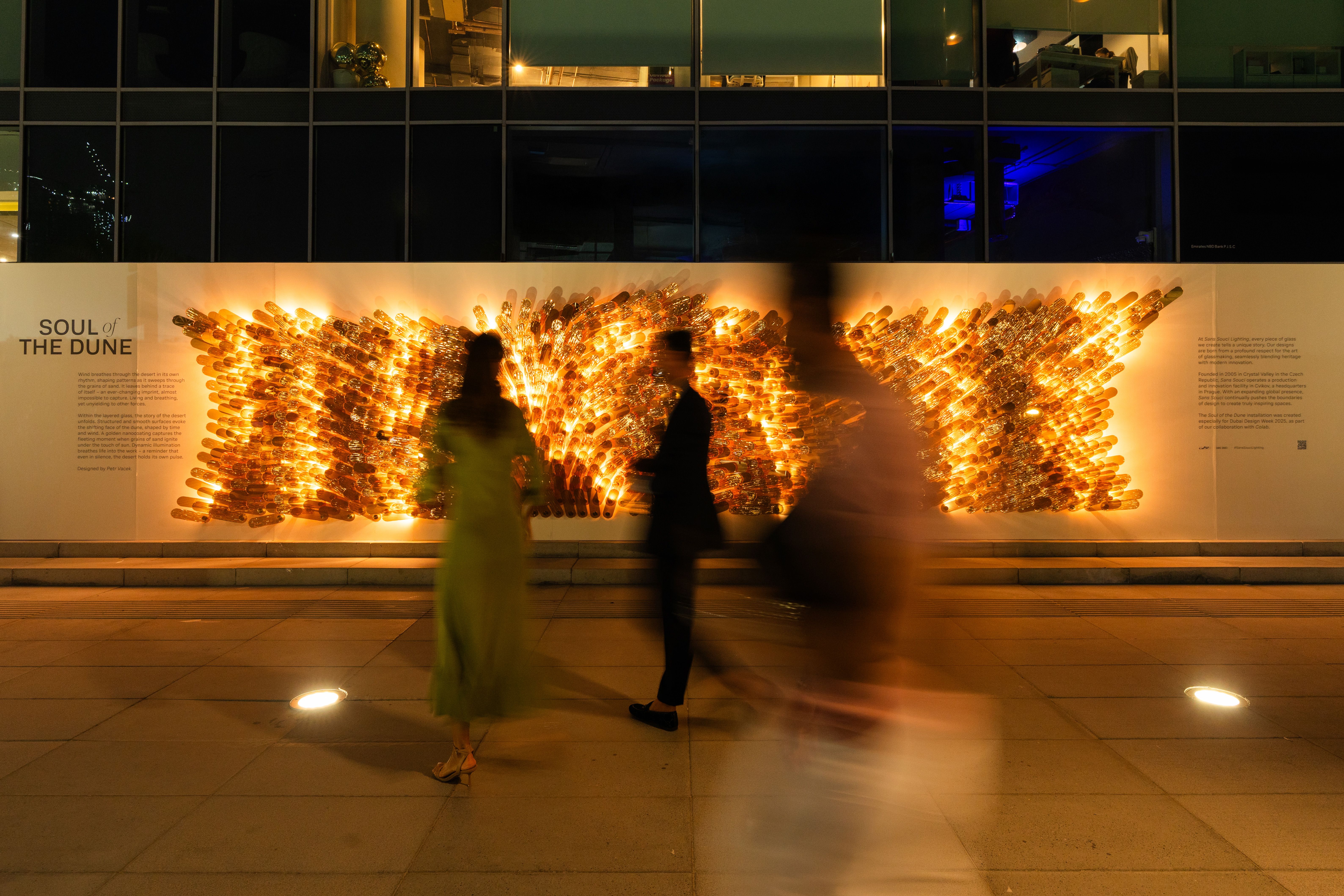 The piece is crafted from slumped flat glass, enhanced with aurum nanocoating – Sans Souci’s signature ultra-thin, reflective, semi-transparent layer of metal that transforms glass into a living canvas of light. Dynamic lighting completes the composition, bringing it to life, much like sunlight gliding across the dunes