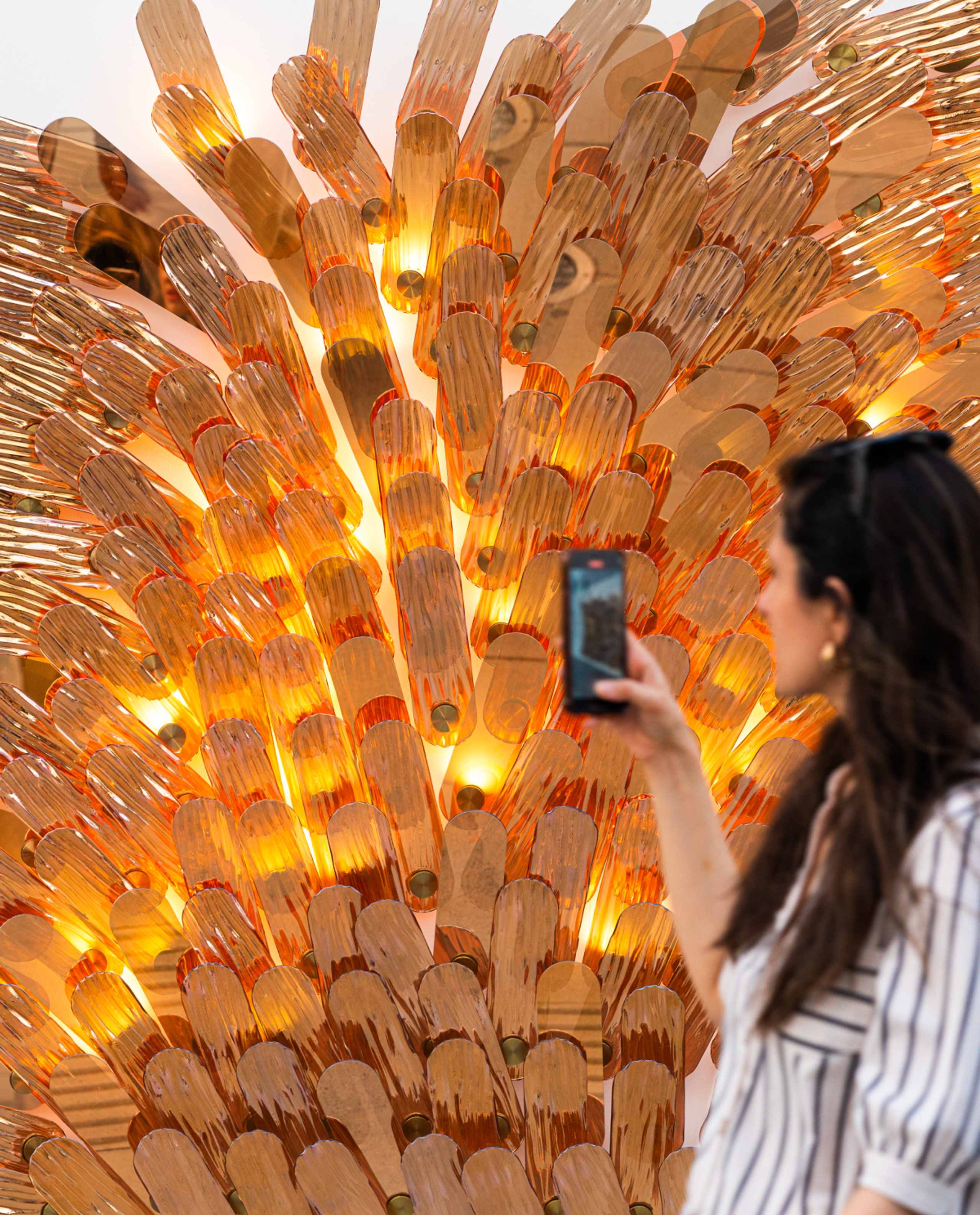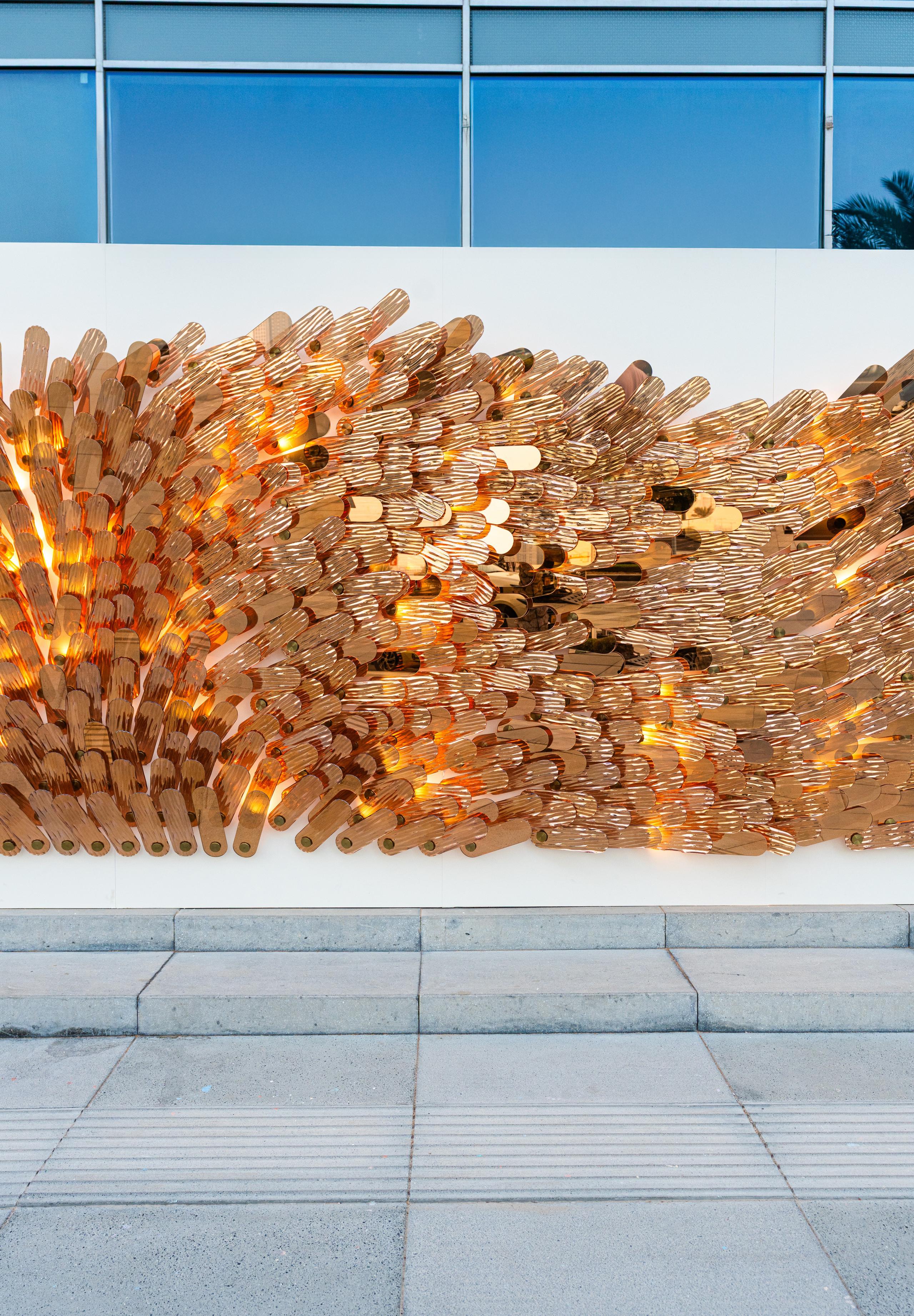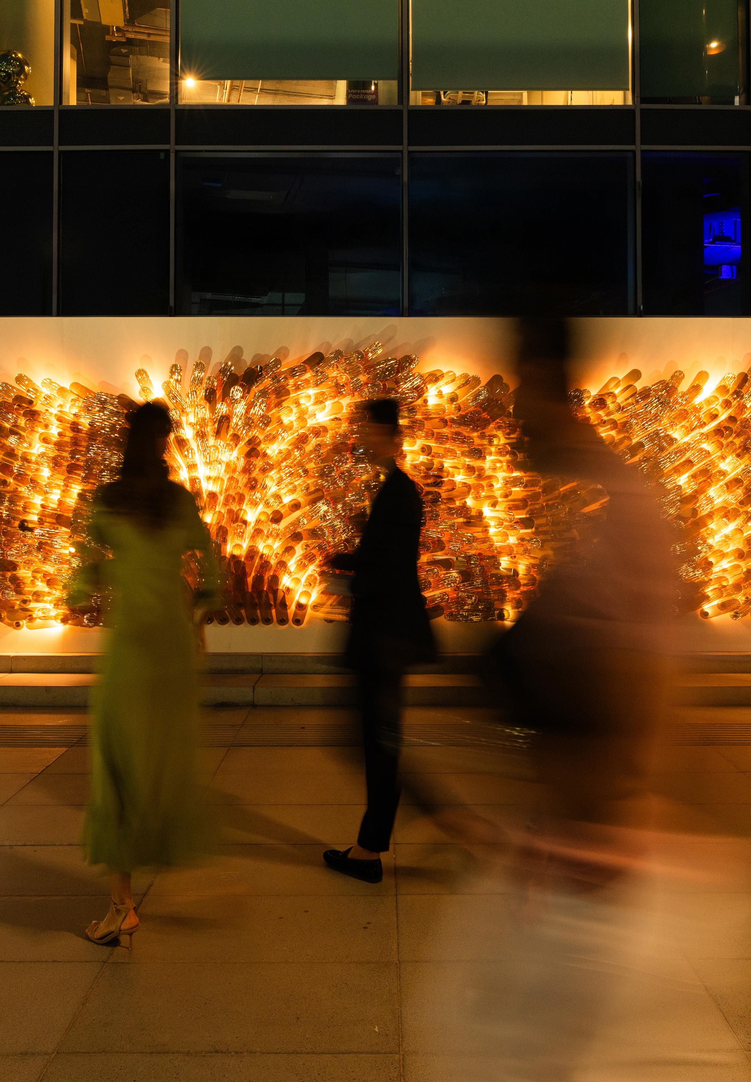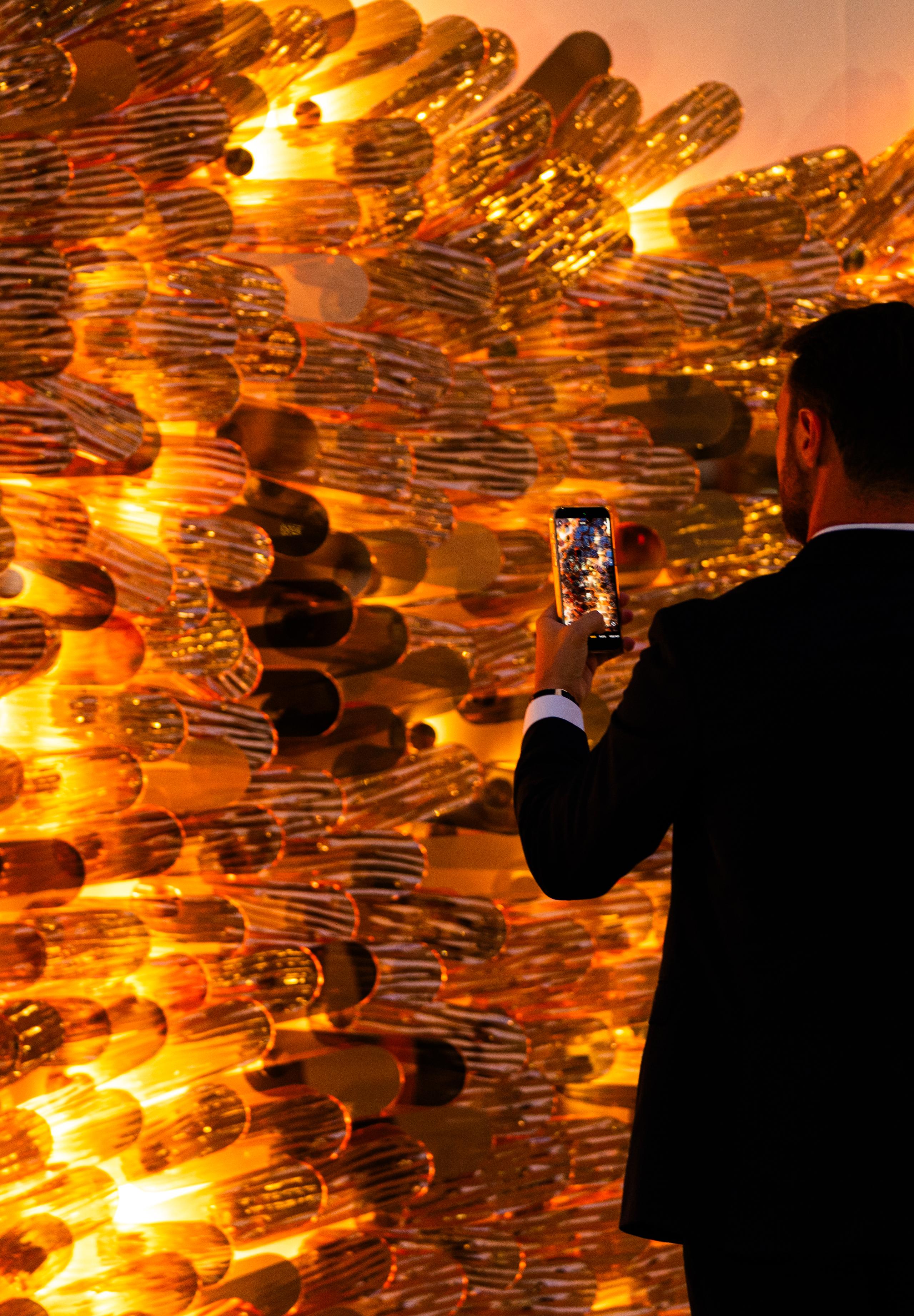 The piece is crafted from slumped flat glass, enhanced with aurum nanocoating – Sans Souci’s signature ultra-thin, reflective, semi-transparent layer of metal that transforms glass into a living canvas of light. Dynamic lighting completes the composition, bringing it to life, much like sunlight gliding across the dunes