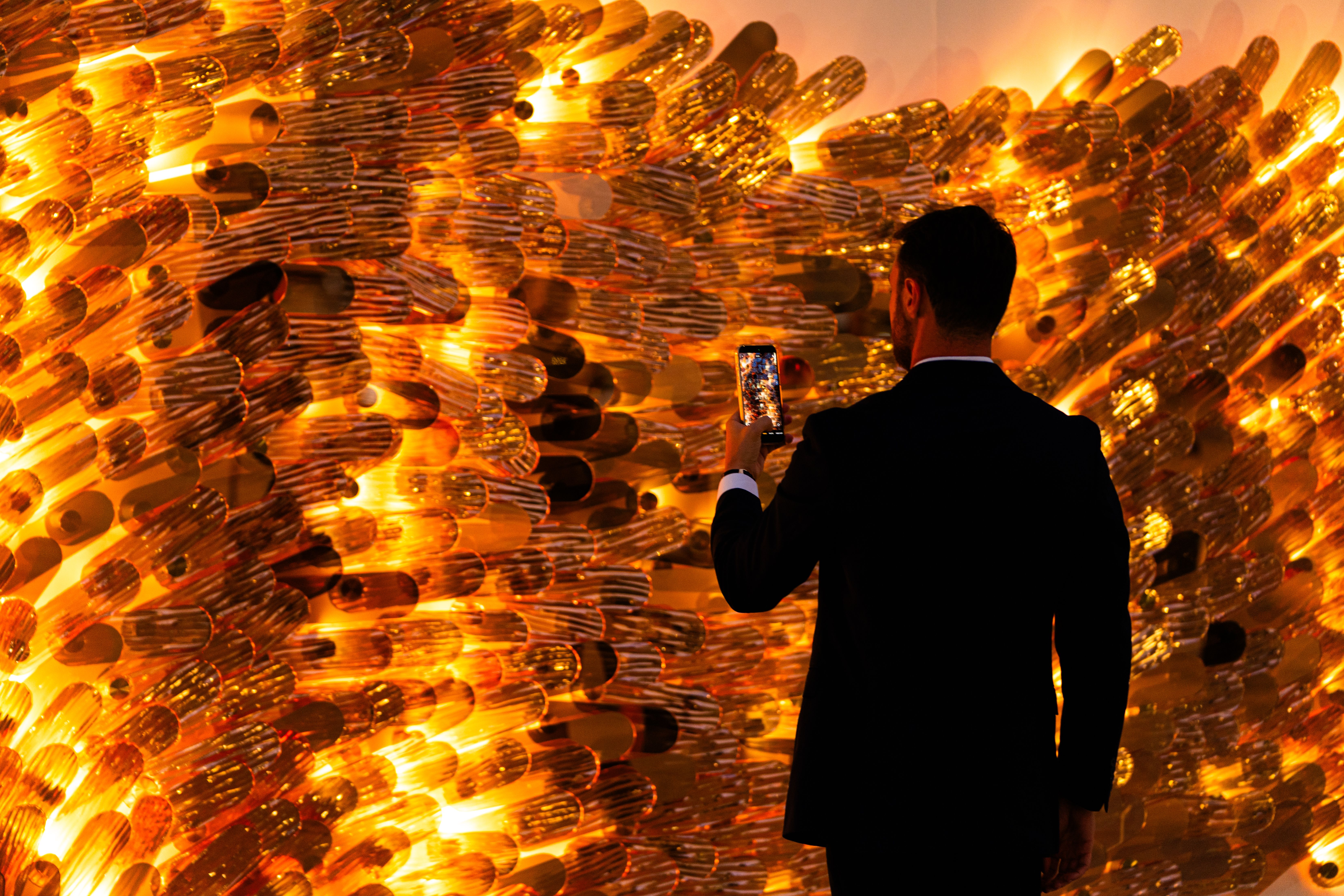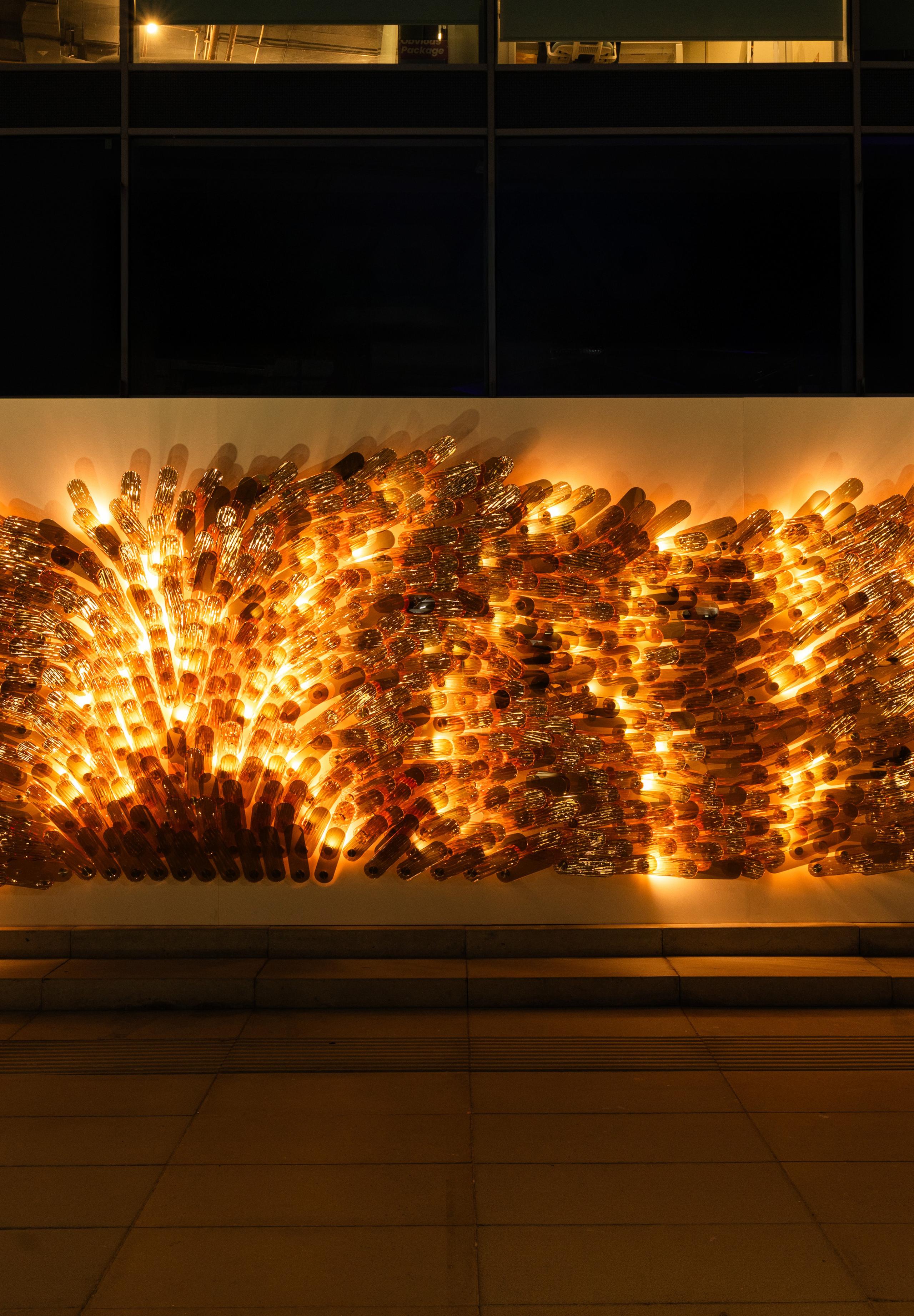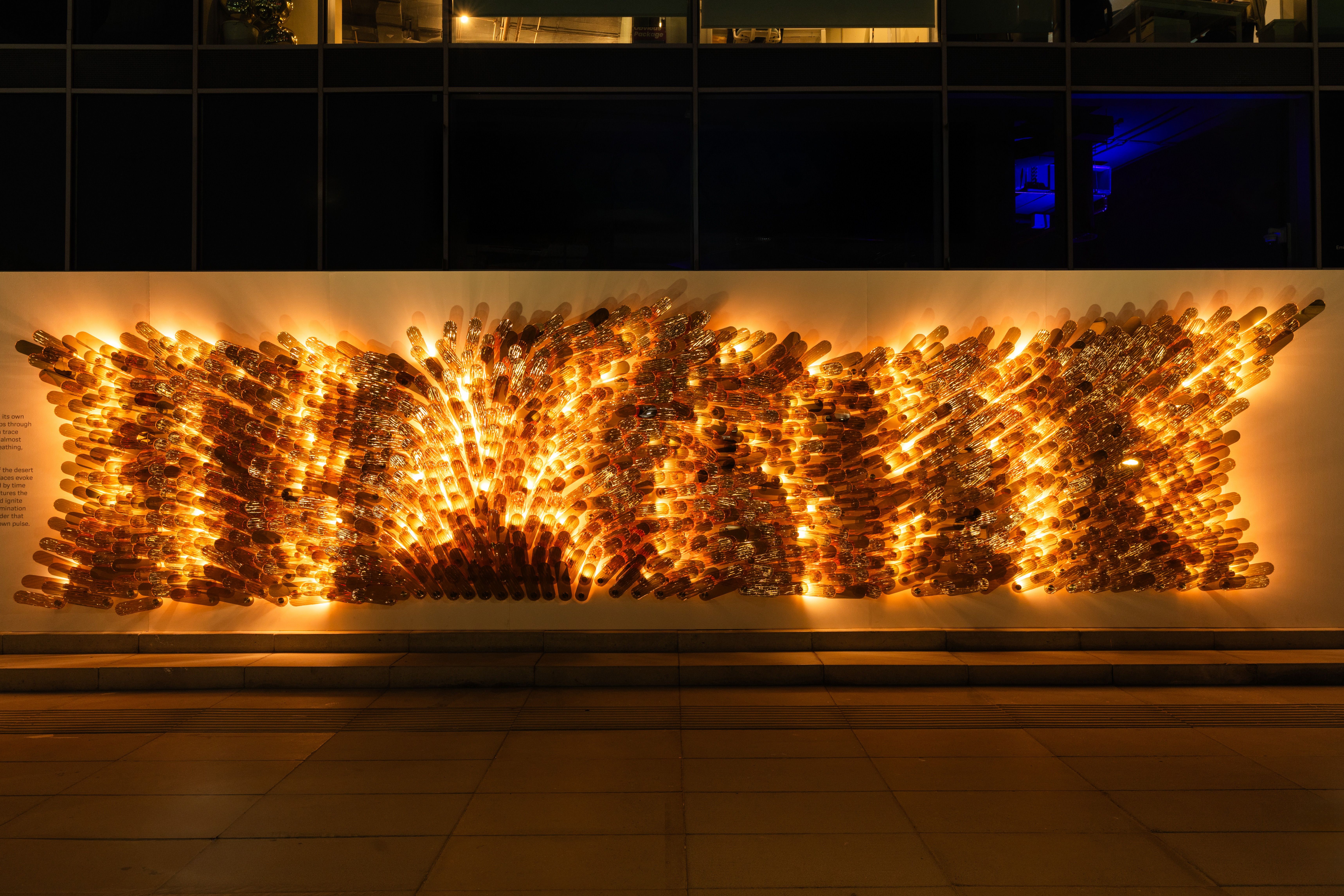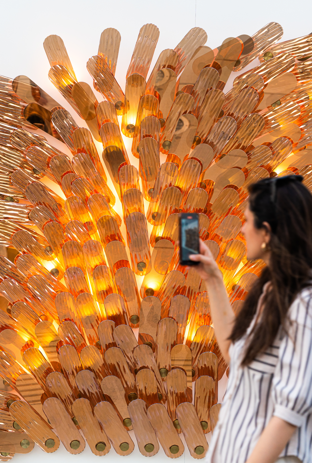 The piece is crafted from slumped flat glass, enhanced with aurum nanocoating – Sans Souci’s signature ultra-thin, reflective, semi-transparent layer of metal that transforms glass into a living canvas of light. Dynamic lighting completes the composition, bringing it to life, much like sunlight gliding across the dunes