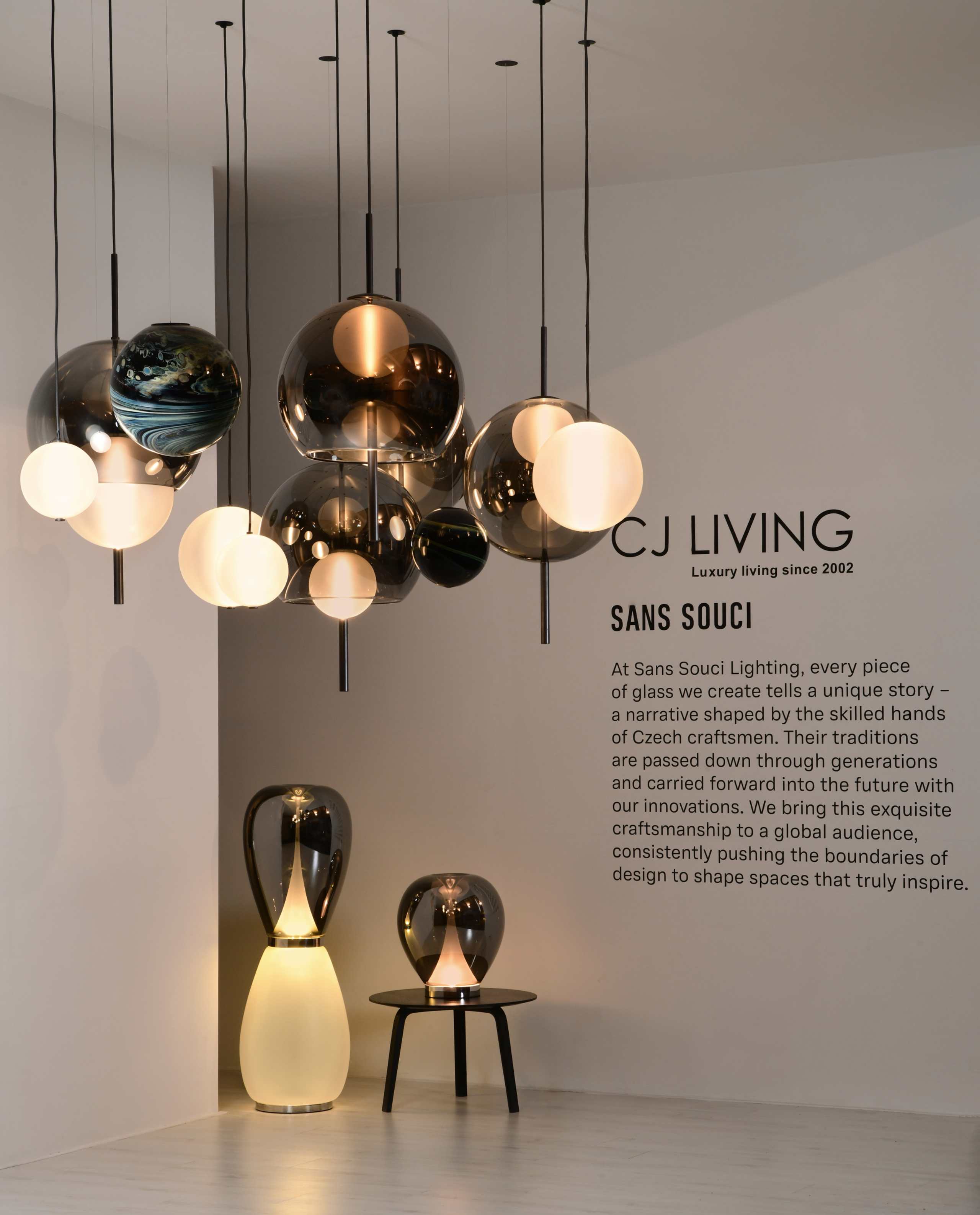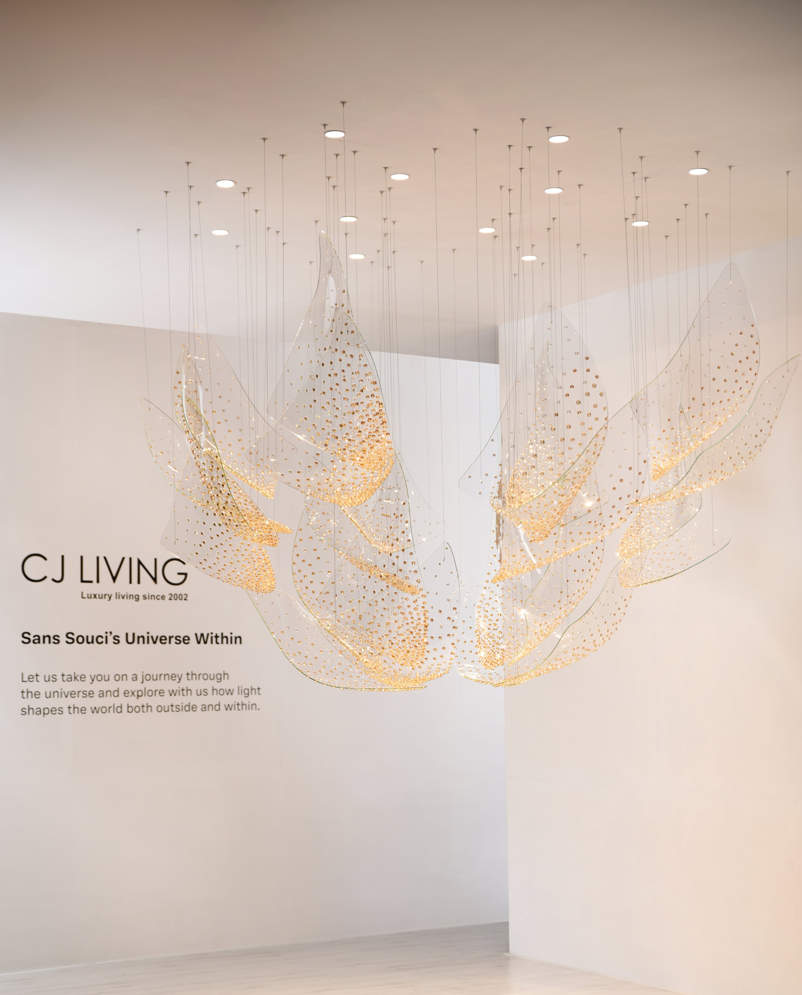 Inspired by the perpetual balance between light and darkness, the Eternal Orbit installation evokes the infinite beauty of the cosmos. At its core, Galileo pendants radiate pure light, piercing through shadows to symbolize the creation of space, depth, and life.
