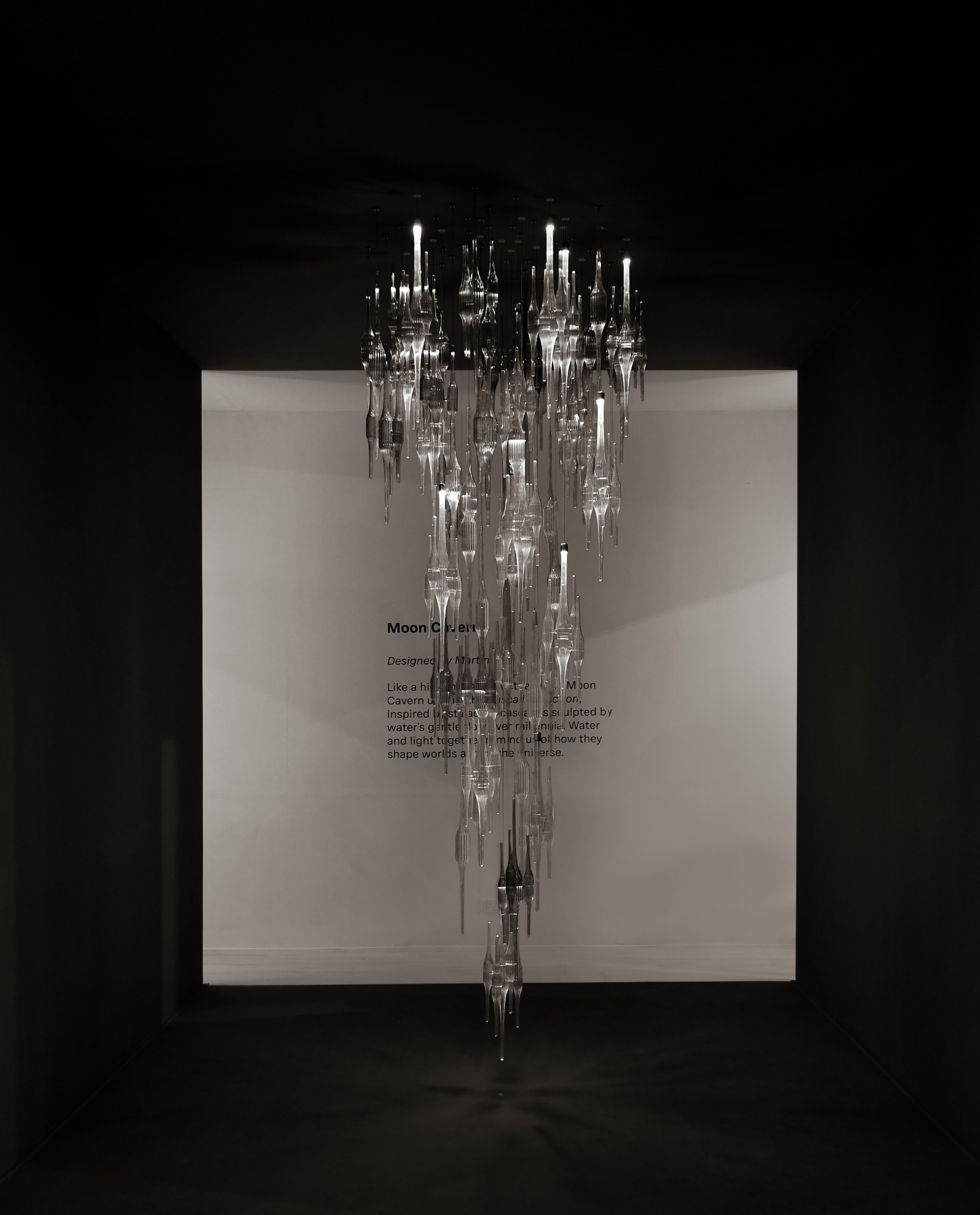 Like a hidden lunar sanctuary, the Moon Cavern unveils the Cascali collection, inspired by stalactite cascades sculpted by water’s gentle flow over millennia. Water and light together remind us of how they shape worlds across the universe.