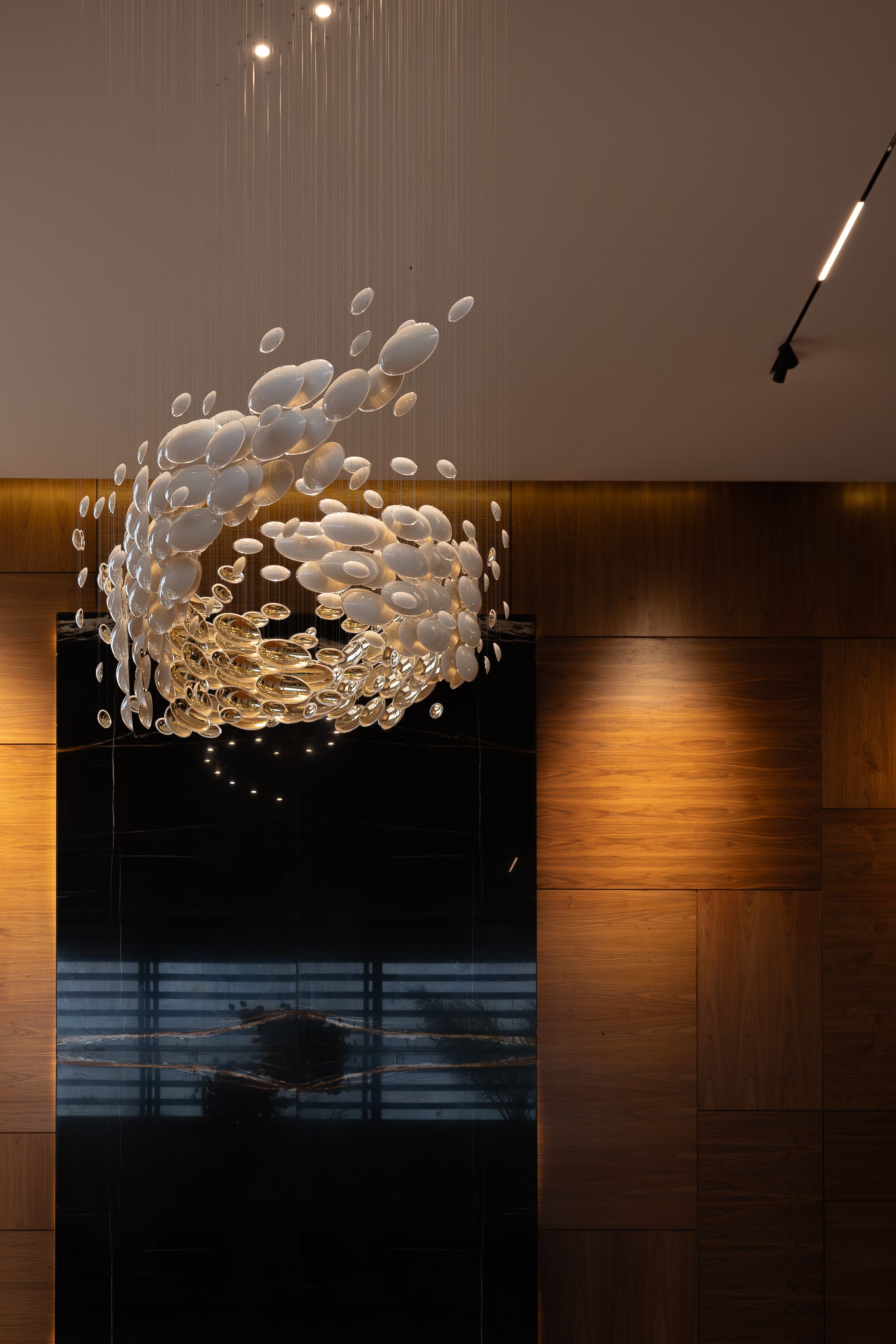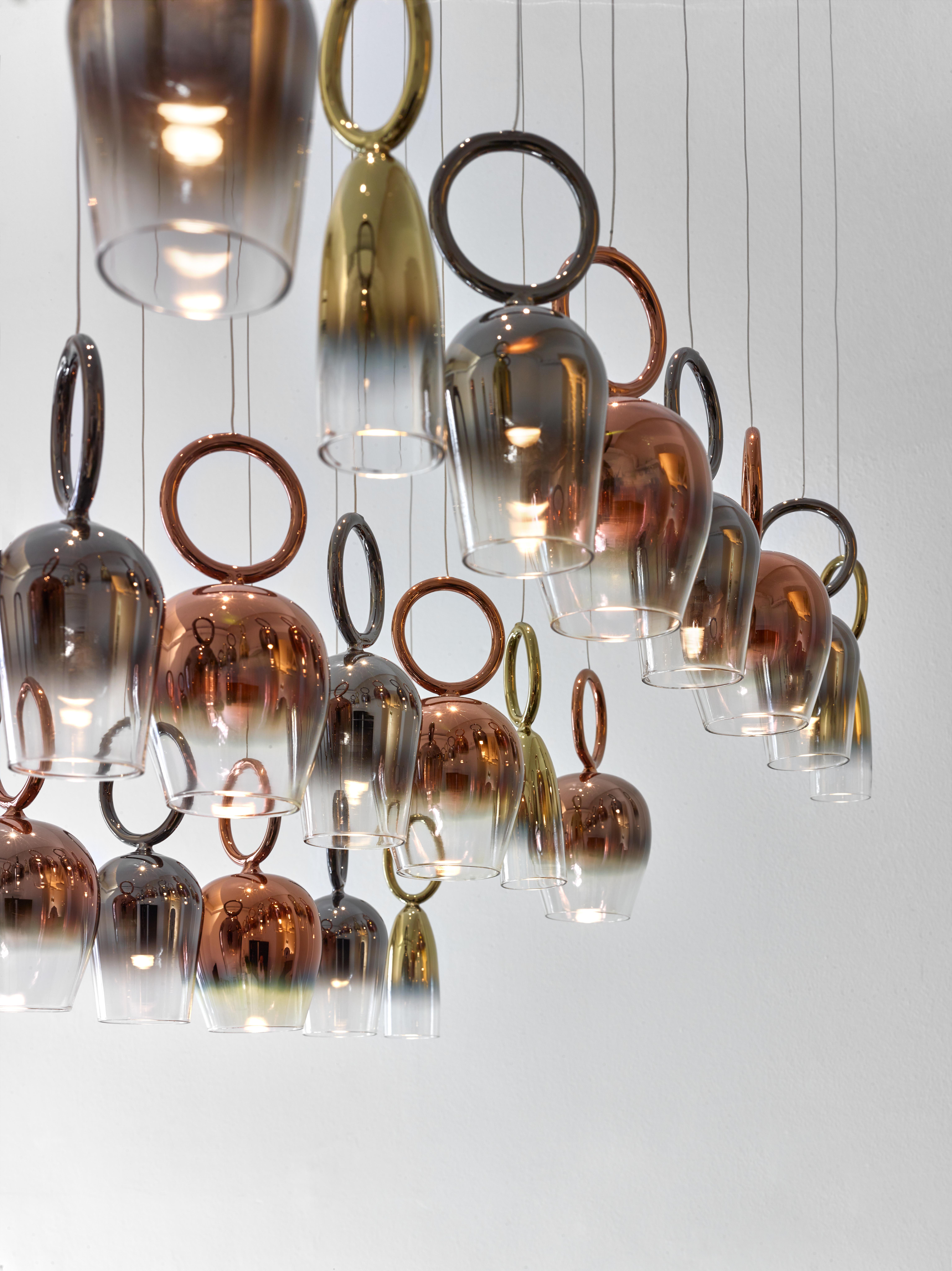 Light radiates through the darkness to create space and depth. The infinite beauty and depth of the universe are reflected in the Galileo product. An expertly crafted glass orb radiates pure light and is positioned in different configurations with a flawless pendant finished in translucent argent or aurum nanocoating.