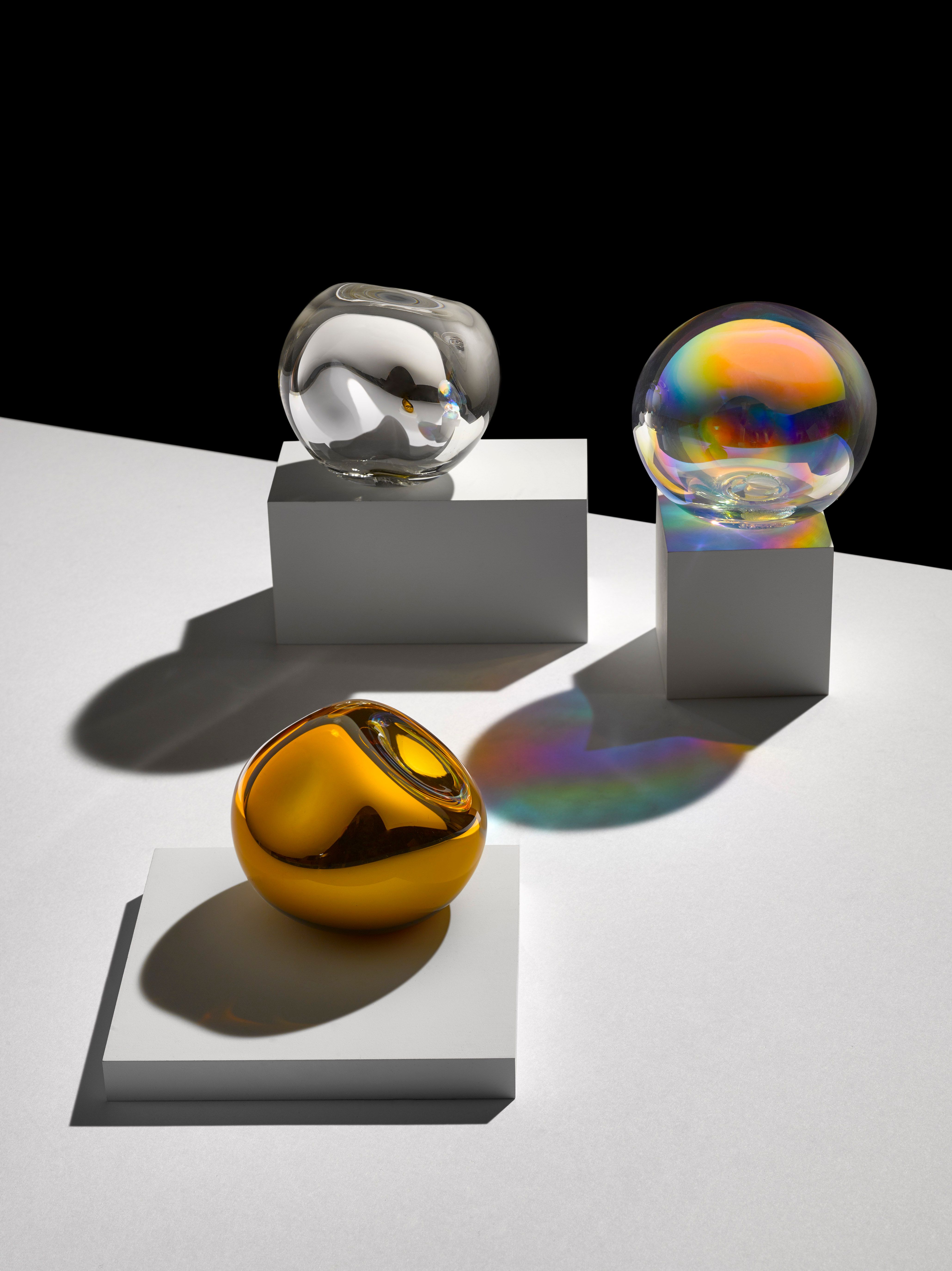 The combination of elegant, clean geometric shapes and simple details is truly magical. The Charm collection is made up of glass spheres that look simple at first glance, but hide a secret. This sculptural object, reminiscent of a reflective jewel, hides a second, glowing sphere.