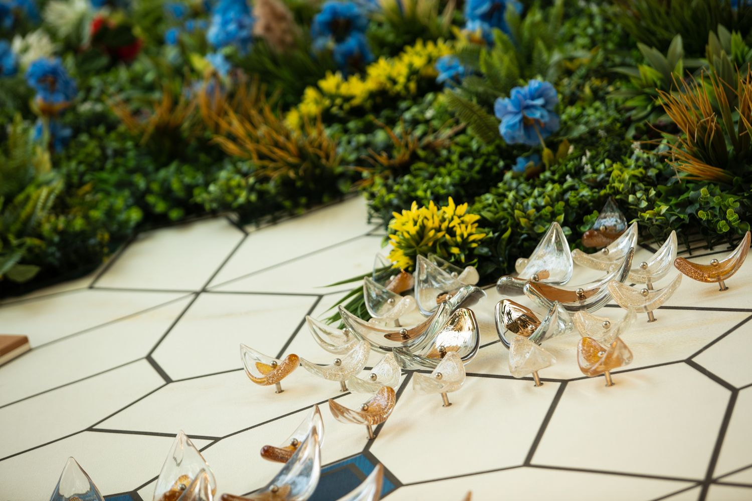 Collaboration with visionary artist and designer Arik Levy for Milano Design Week 2024 featured irregular glass shapes coated with a flawless metallic nano-surface to enhance reflection and light.