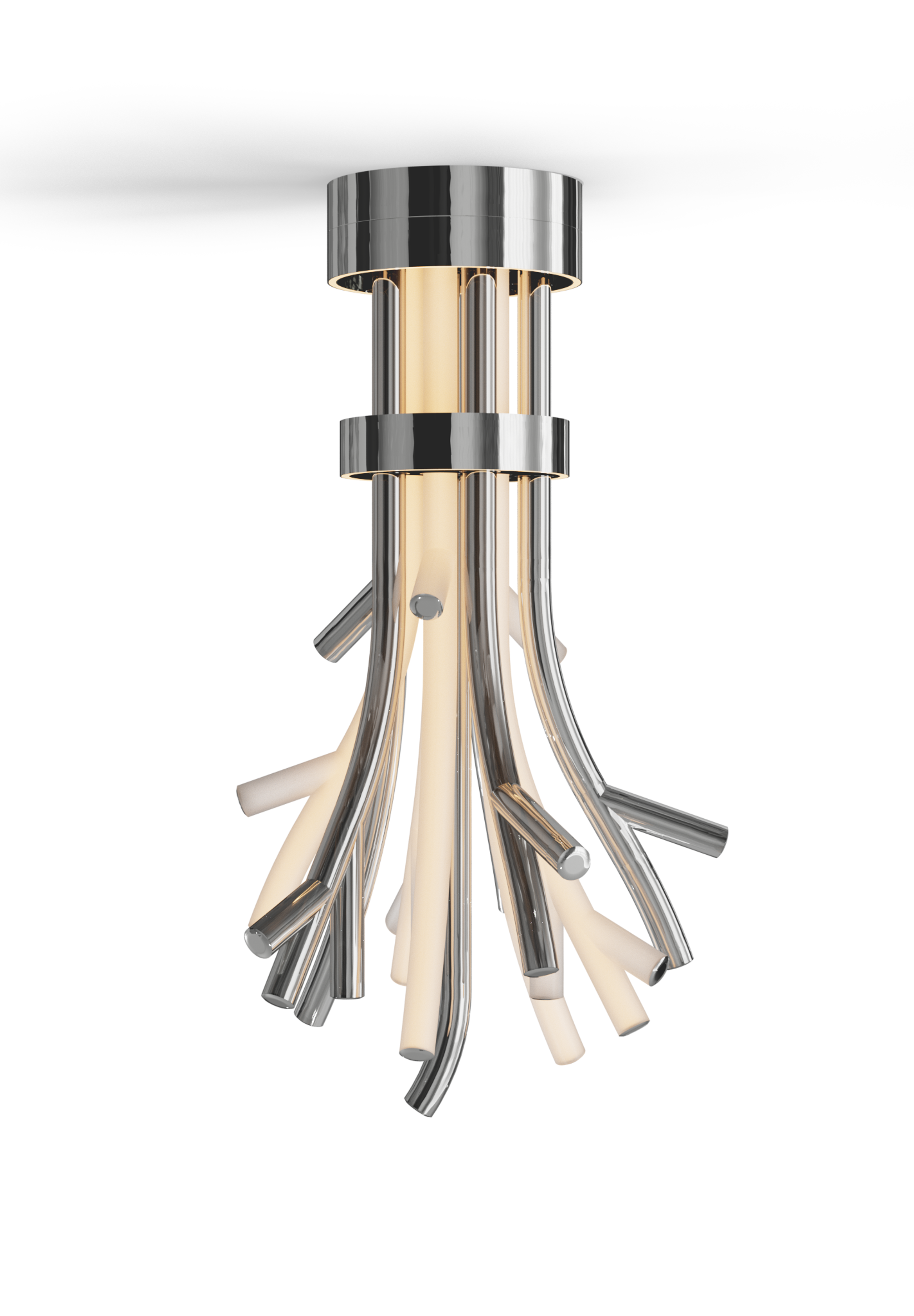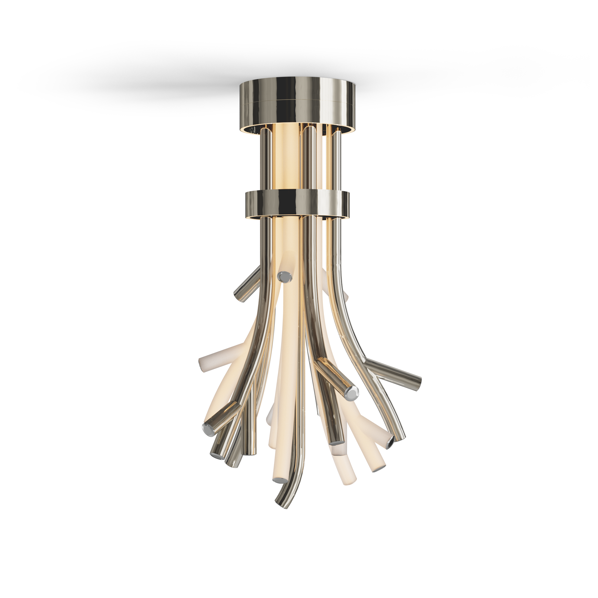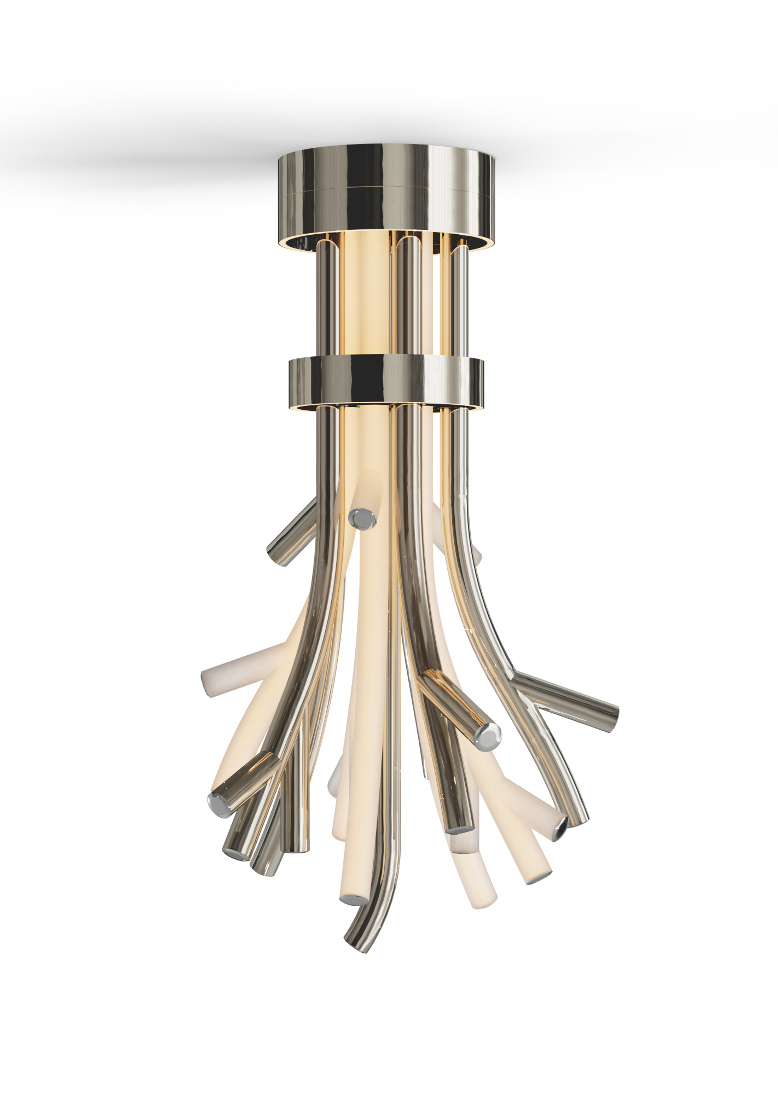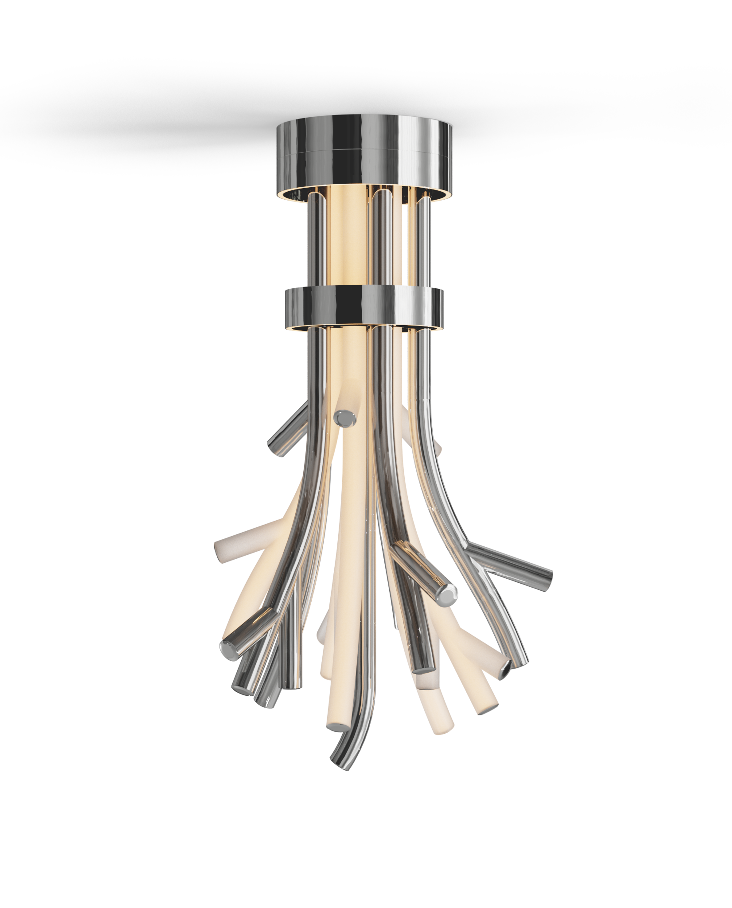Branchy tells the story of the first lightning strike – the primal moment when fire met wood, igniting a light that endured even after night fell. This product line transforms raw, untamed energy into a refined interplay of crystal and metal, where nature and design converge. Sleek, elongated tubes stretch like branches reaching skyward, their polished surfaces catching and reflecting light. Soft, diffused glows emerge from sandblasted elements, evoking the gentle flicker of flames. A tribute to elemental forces, Branchy captures the delicate balance between destruction and creation, energy and elegance.