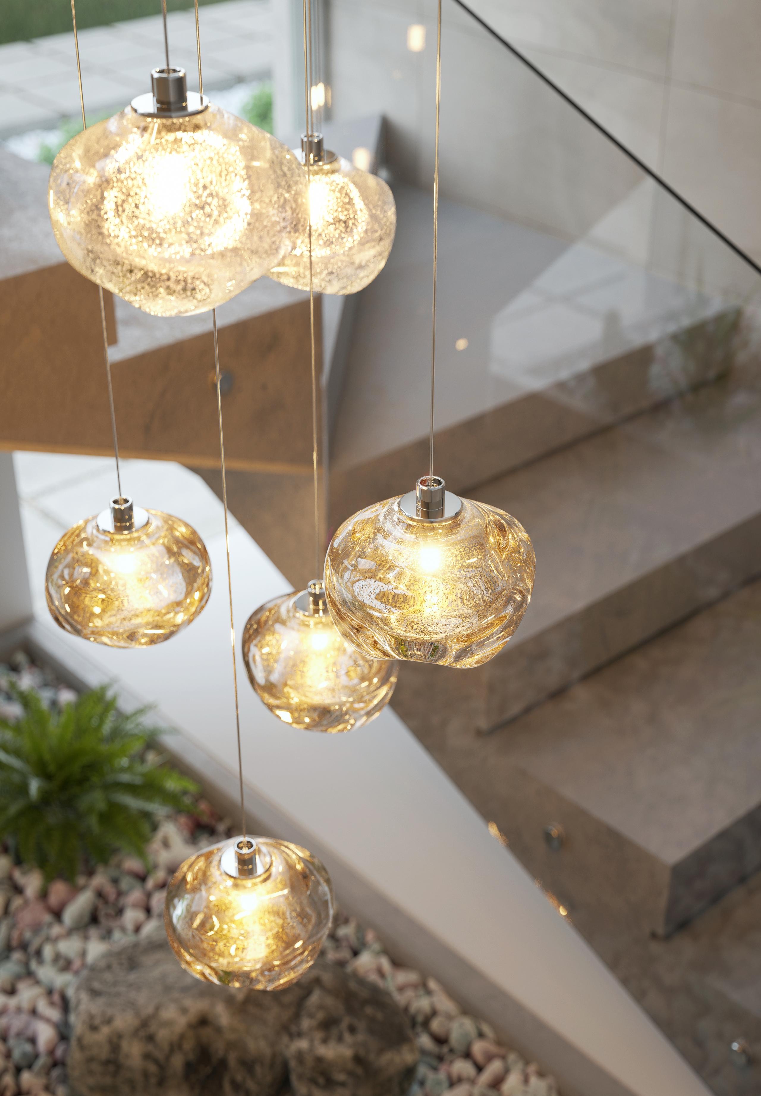 Light radiates through the darkness to create space and depth. The infinite beauty and depth of the universe are reflected in the Galileo product. An expertly crafted glass orb radiates pure light and is positioned in different configurations with a flawless pendant finished in translucent argent or aurum nanocoating.