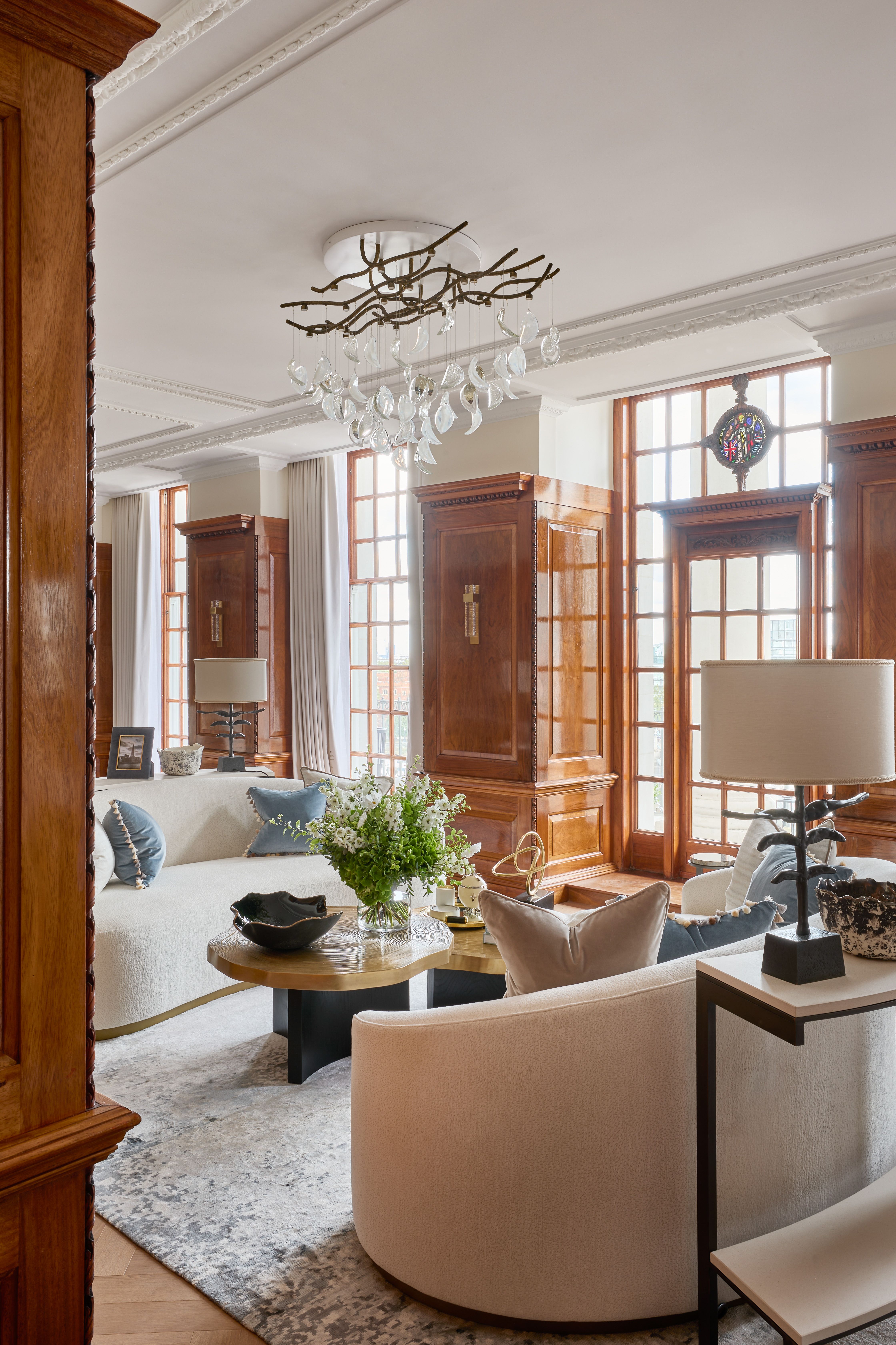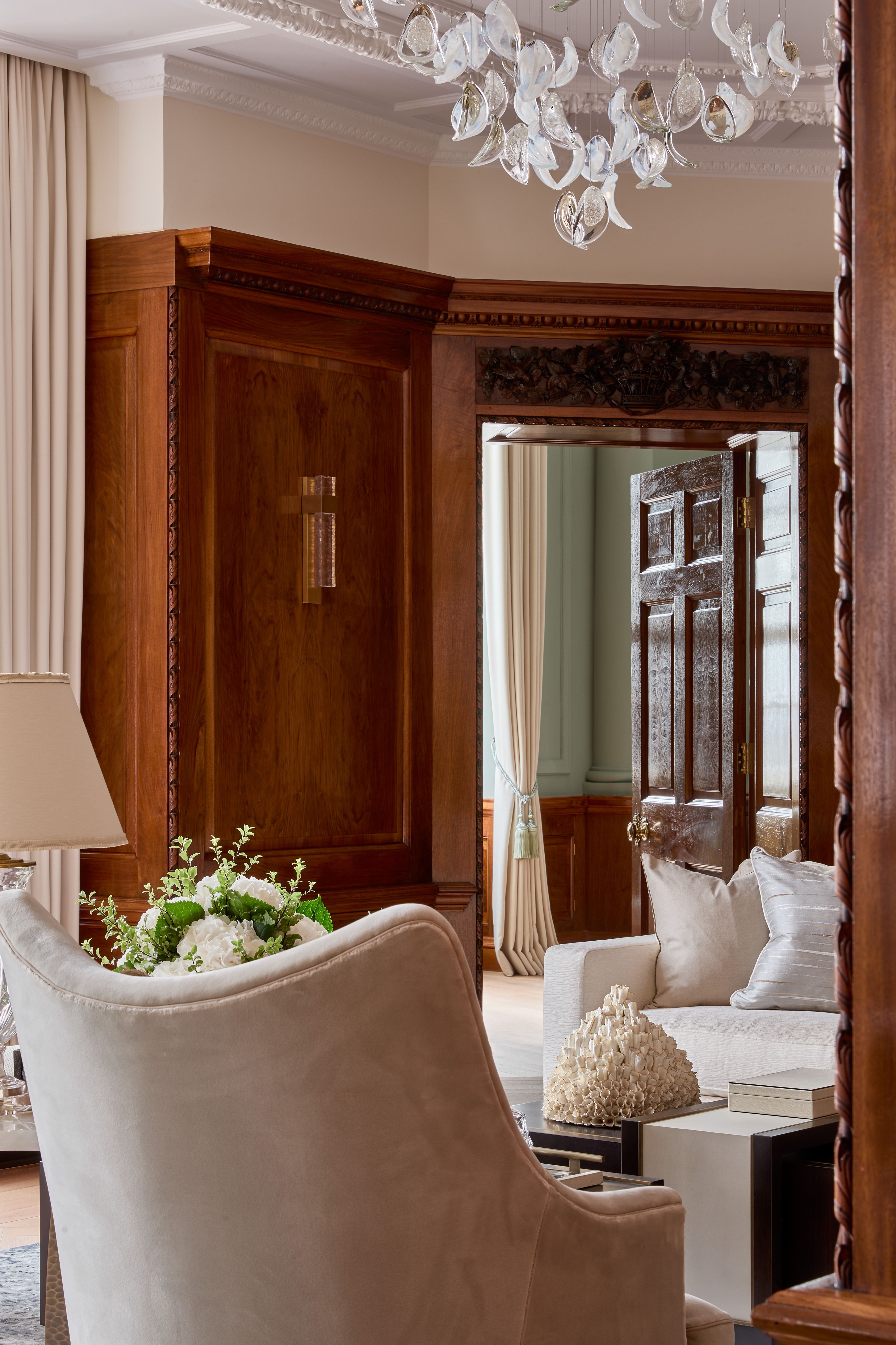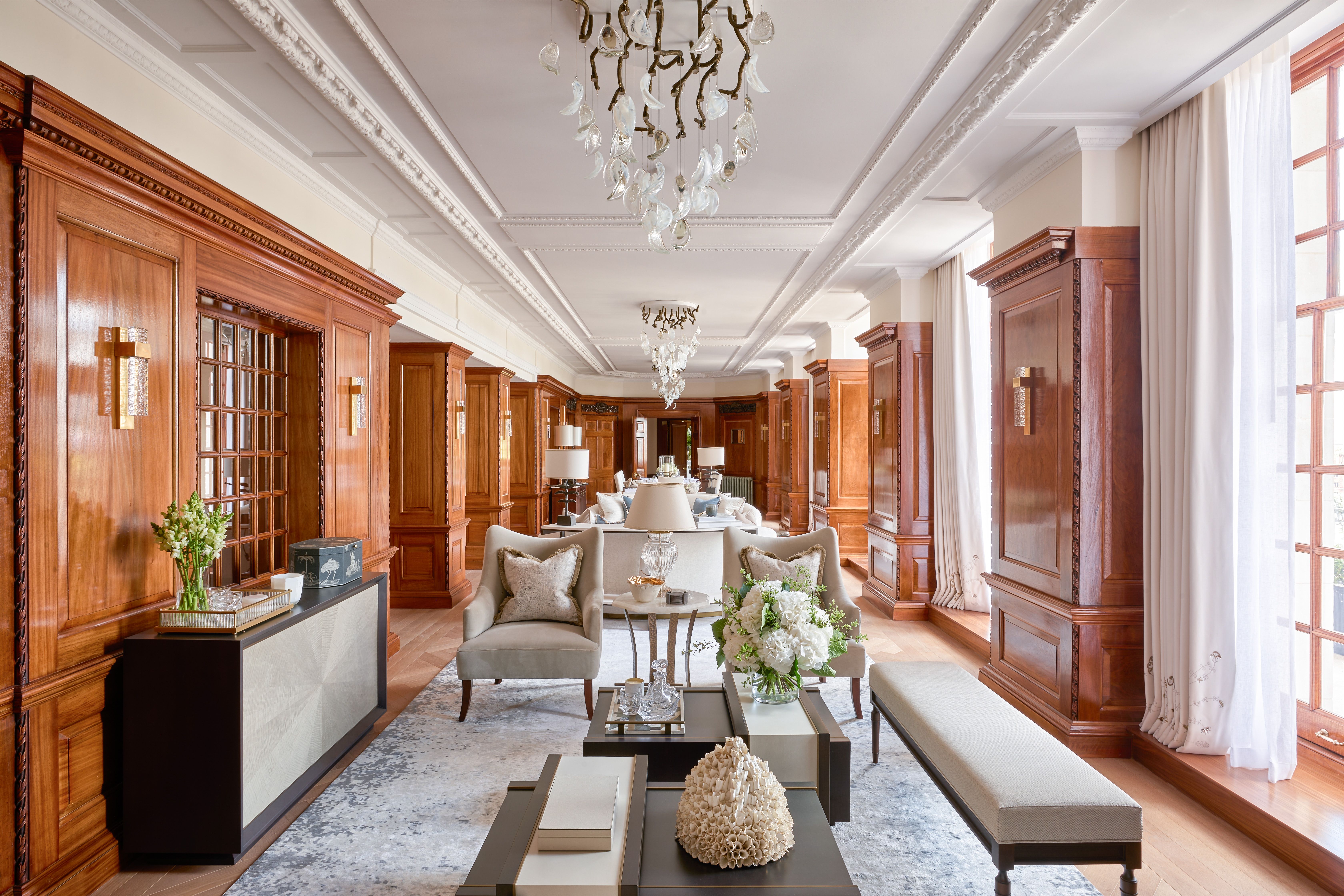 Pooley’s vision combines flawless design with historic detailing. We specially created a series of bespoke lighting installations for the living and dining areas, inspired by our Primavera collection. These striking pieces feature handblown crystal petals with metallic finish, artfully arranged to hang from branch-like lighting.
