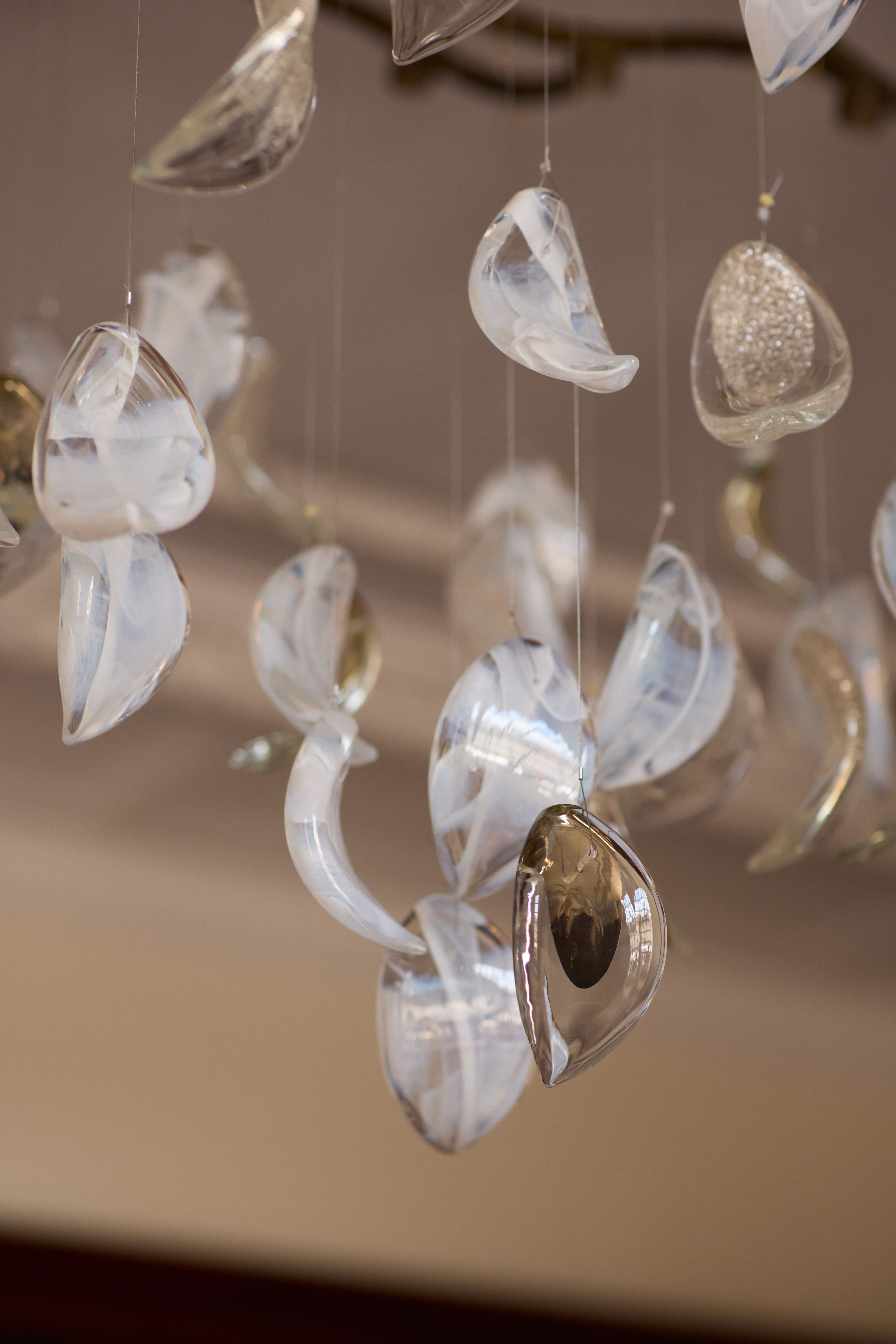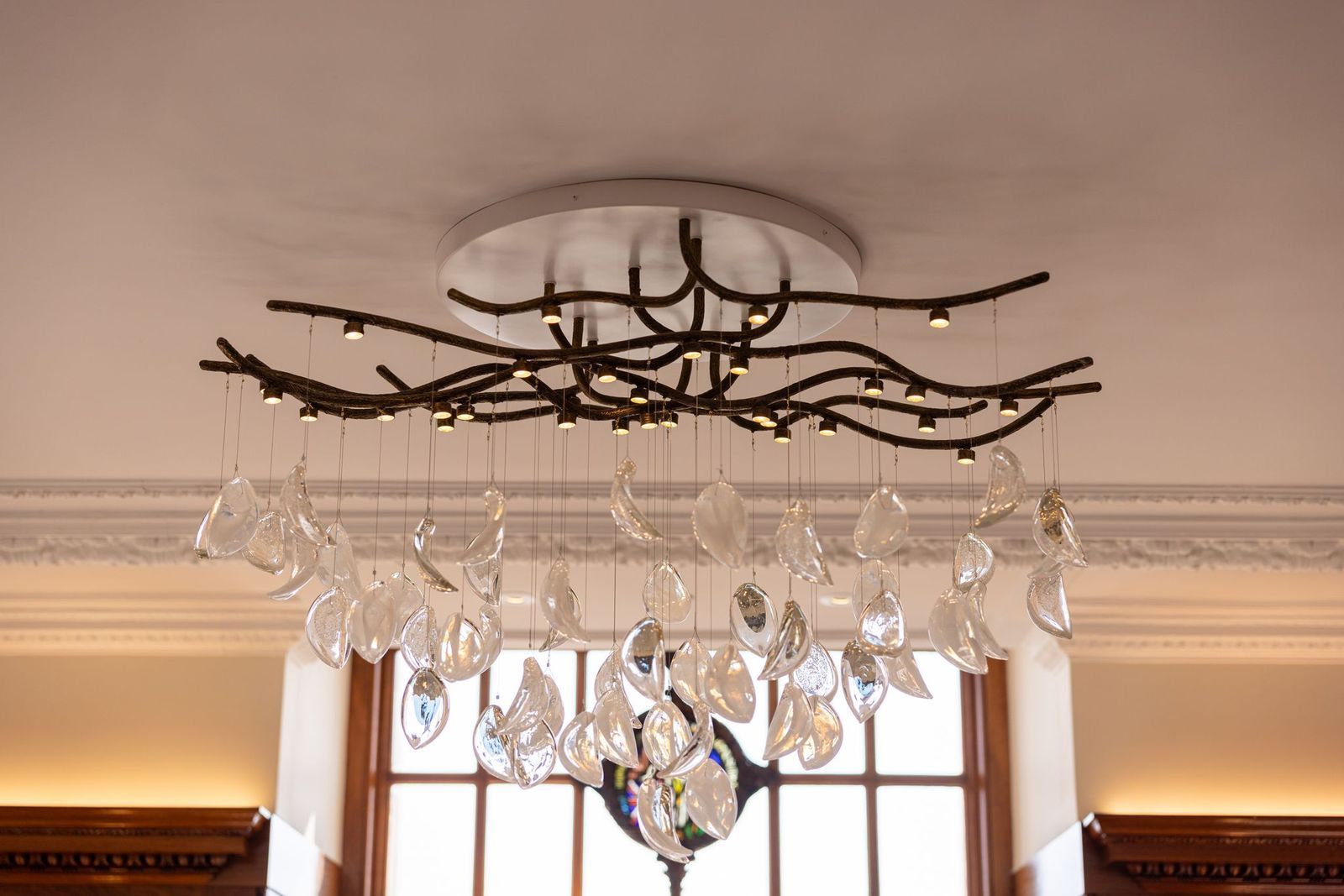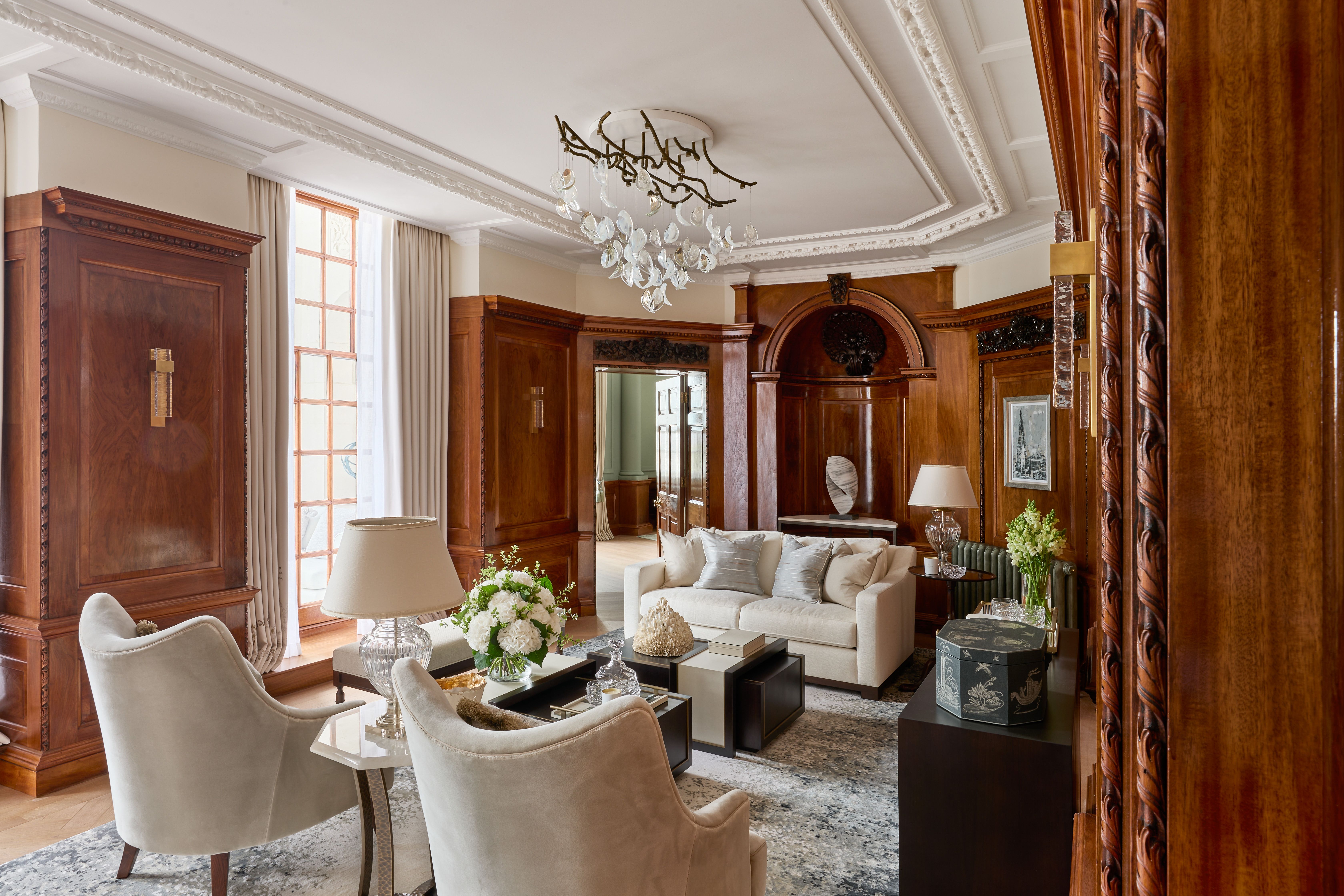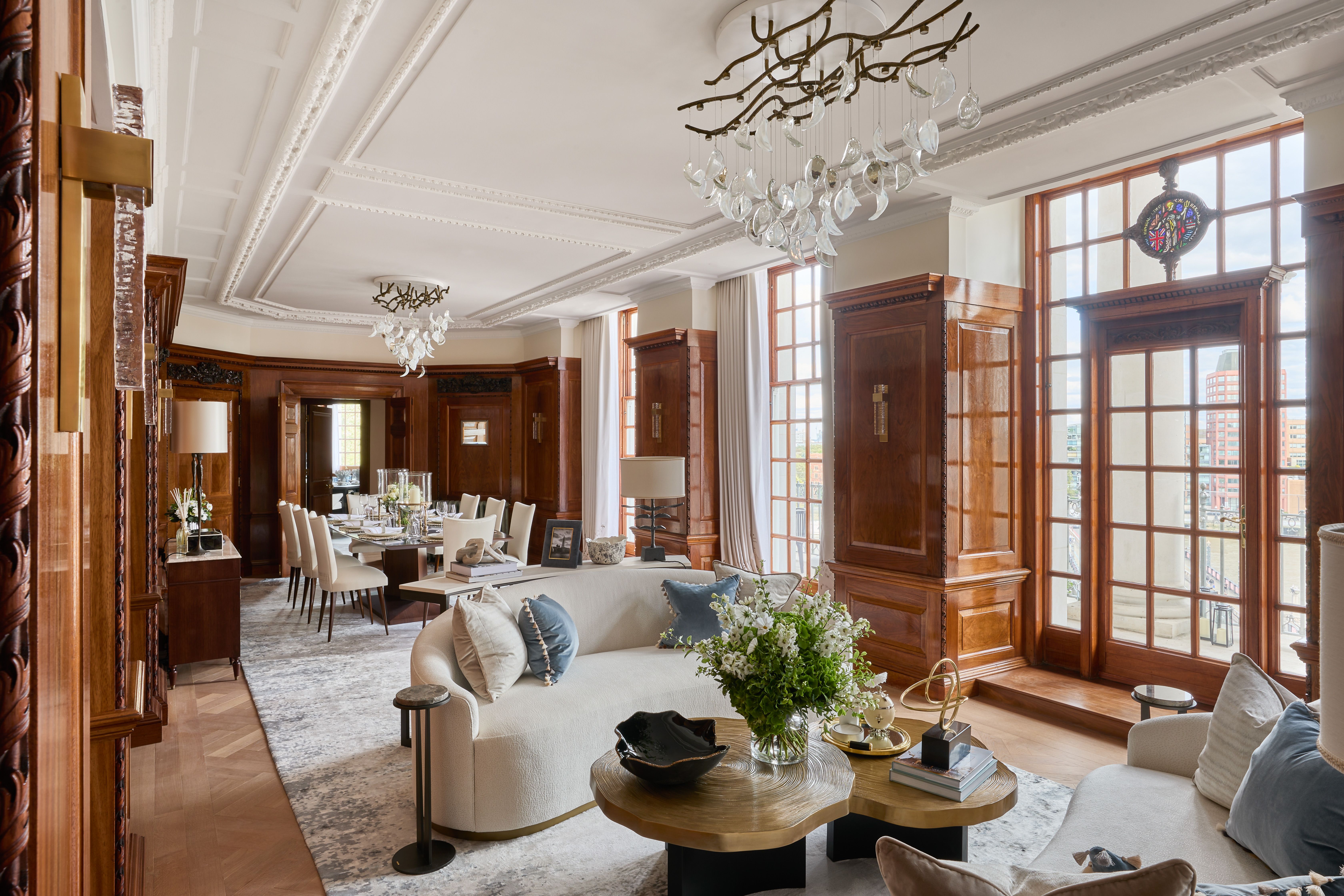 Pooley’s vision combines flawless design with historic detailing. We specially created a series of bespoke lighting installations for the living and dining areas, inspired by our Primavera collection. These striking pieces feature handblown crystal petals with metallic finish, artfully arranged to hang from branch-like lighting.