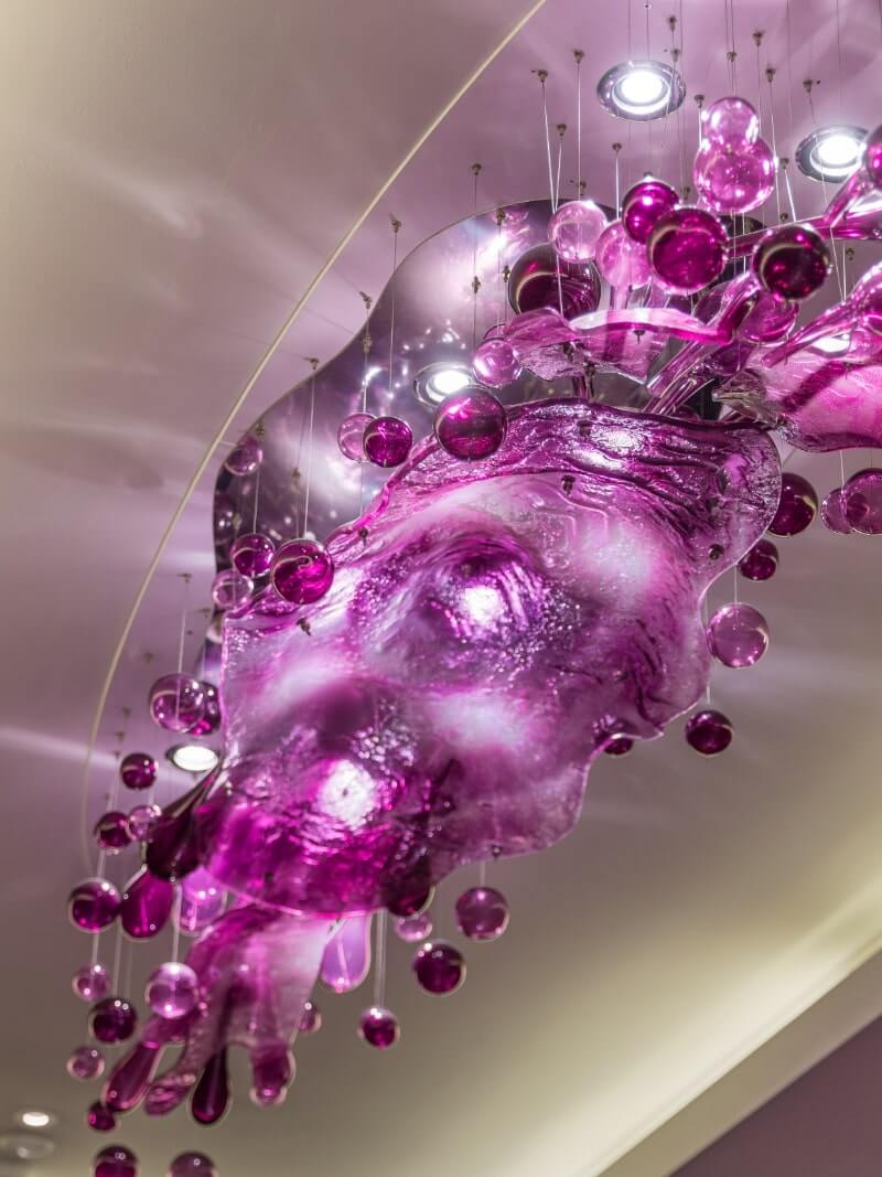 Bold colours and abstract style combine to create our splash installation in the hotel’s lobby. This piece is formed from the unconventional yet captivating combination of slumped and hand-blown glass, finished in purples and pinks.