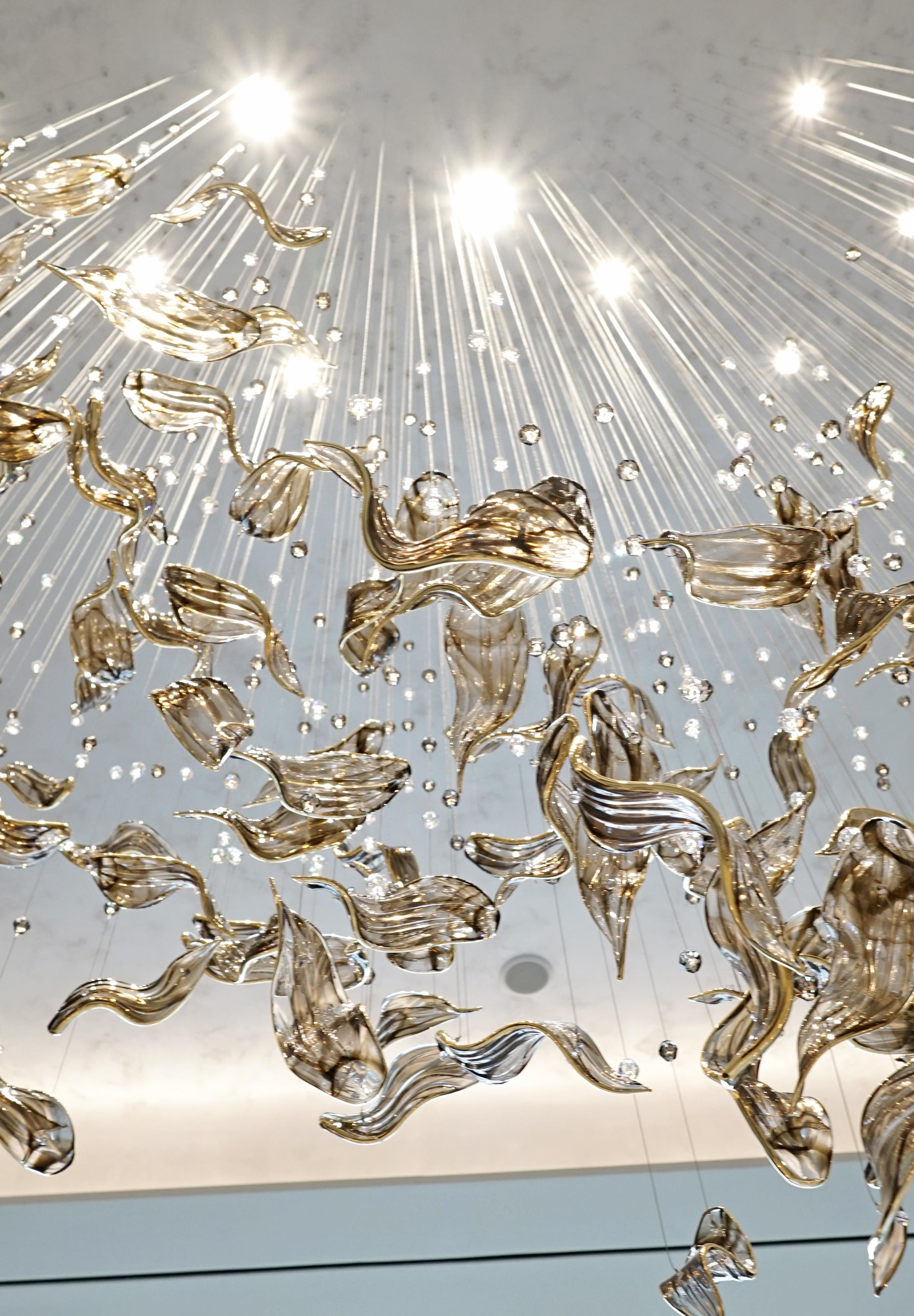 The Contour collection is defined by its graceful glass leaves, each shaped to capture the interplay of light and shadow. The gilded edge enhances the form with a gentle glow, creating refined highlights that emphasise the component’s organic silhouette.