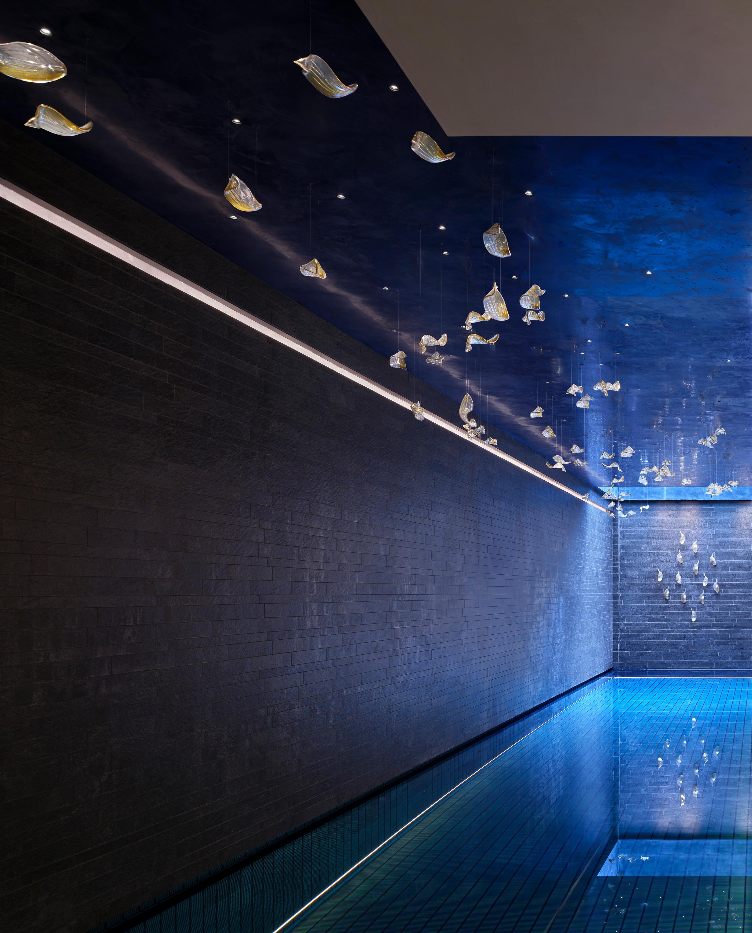 Drawing inspiration from the fluidity of water, our bespoke installation enhances the serene atmosphere of the swimming pool area, beautifully complemented by Venetian plaster. The glass elements on the ceiling reflect the water below, seamlessly connecting the two surfaces. The design extends onto a wall, where cascading water flows through the installation, creating a dynamic interplay of light and motion. It mimics the organic movement of waves, further amplifying the tranquillity of the space.