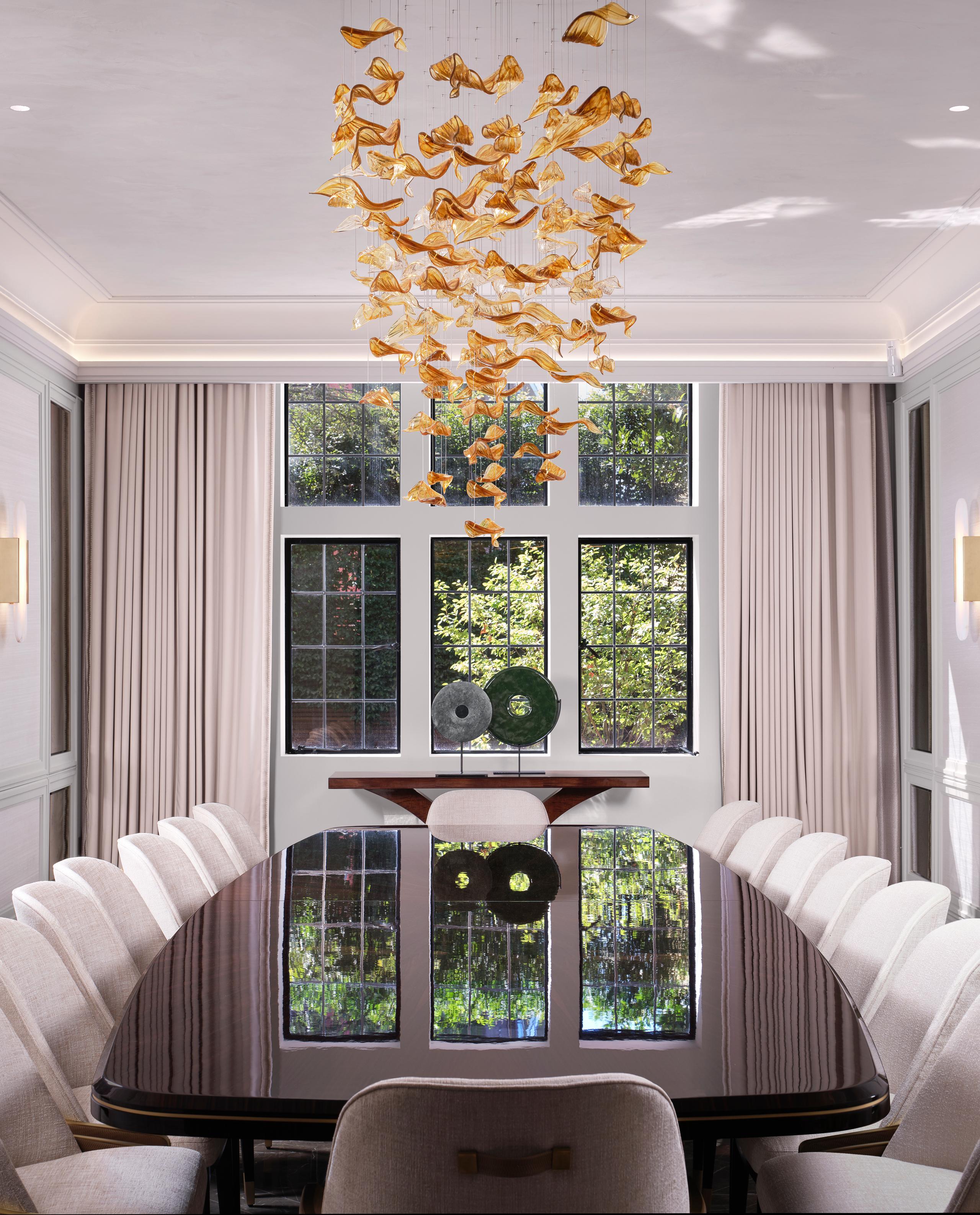 The Contour chandelier graces the dining room, embodying a perfect interplay of natural and artificial light. Strategically placed near a large window, it mirrors the natural light streaming in, enhanced by an elegant ombre effect. Its recessed fixings ensure a seamless integration with the room’s modern yet sophisticated aesthetic. Designed by Katka Lenikusová, the piece invites both warmth and elegance to the dining experience