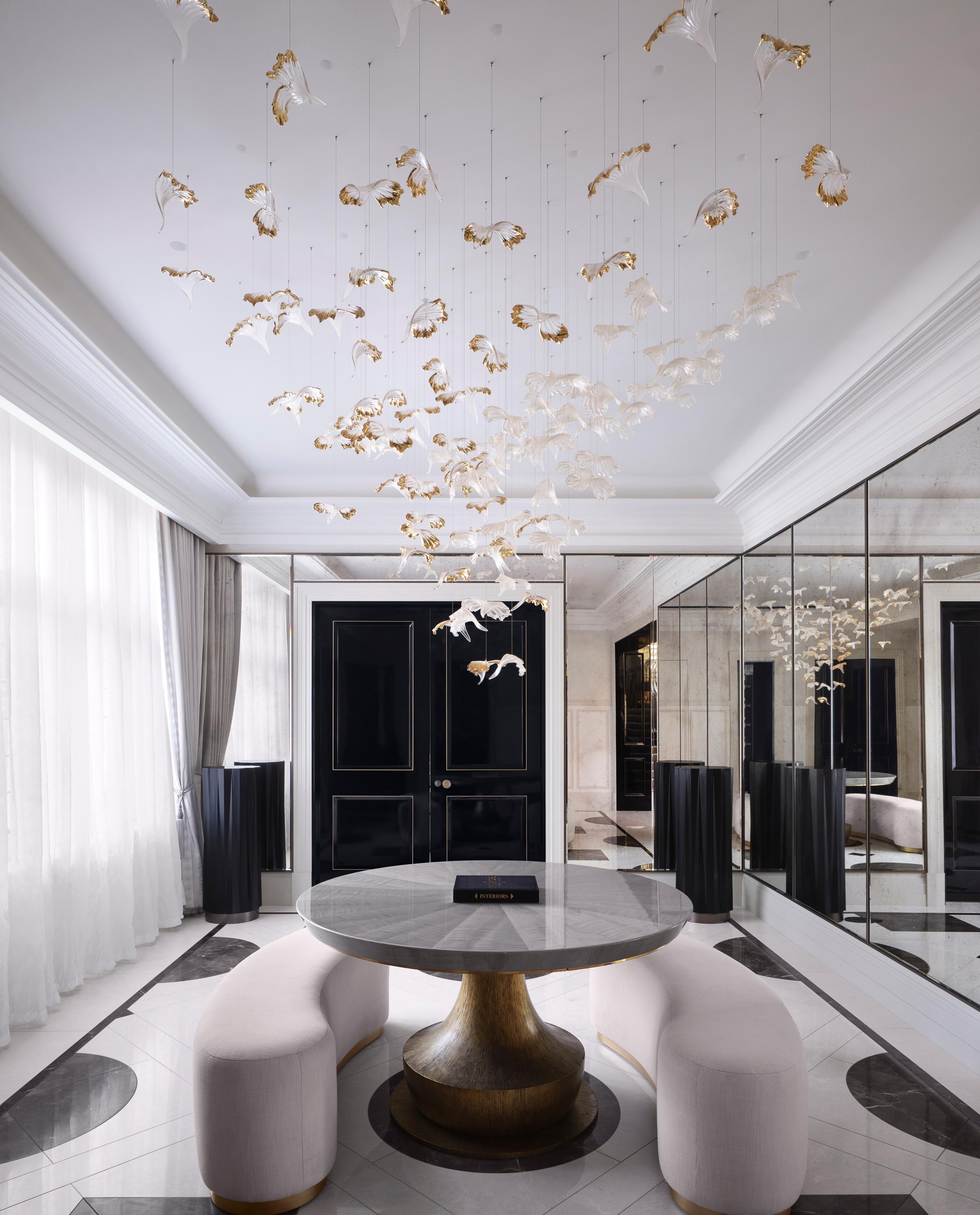 The residence’s entrance is adorned with a chandelier from the Frozen Collection, blending crystal and gold with delicate gilding. The design’s ombre effect subtly transitions the golden hues. With gilding applied only to one side of the crystal components, this unique feature offers a breathtaking welcome to the residence.
