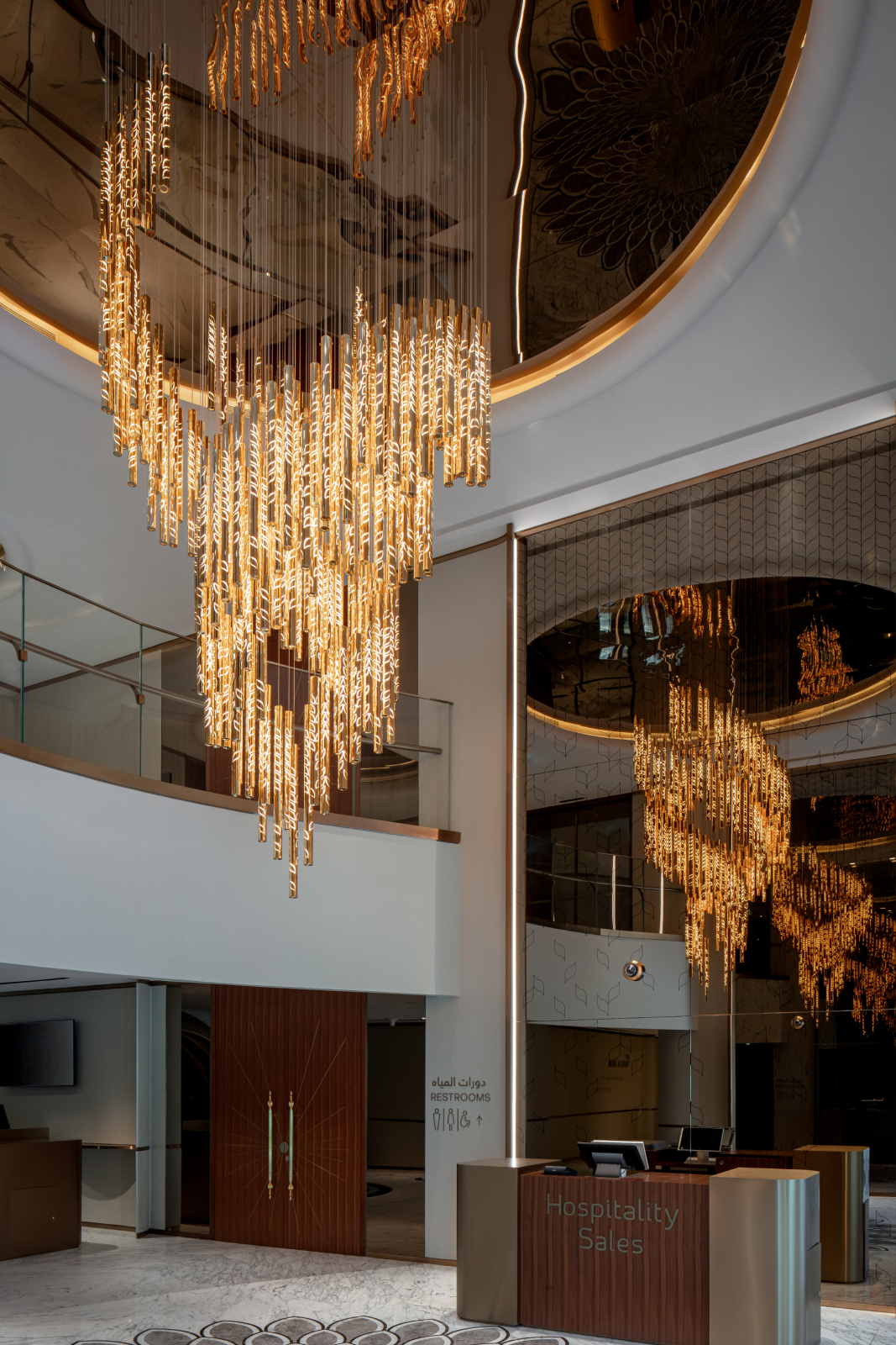 Immense lighting installation in the centre of Burj Al Arab’s exit lobby in Dubai. The ultimate centrepiece for this luxury destination.