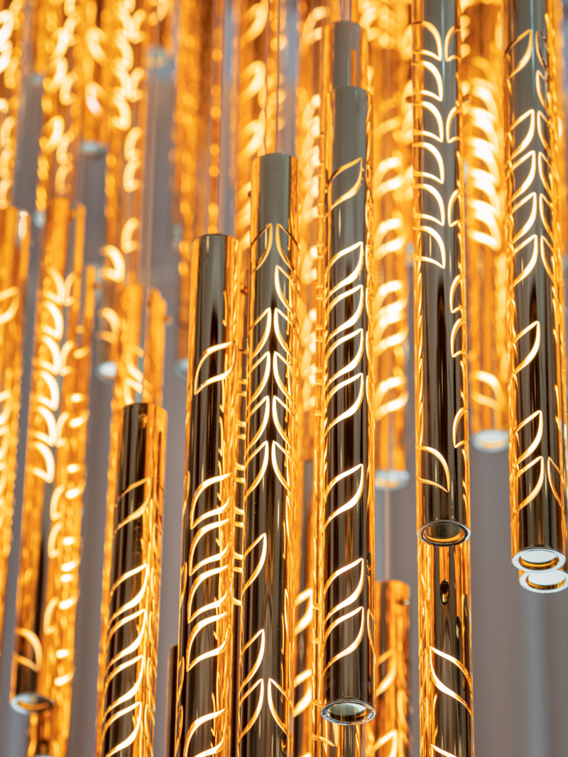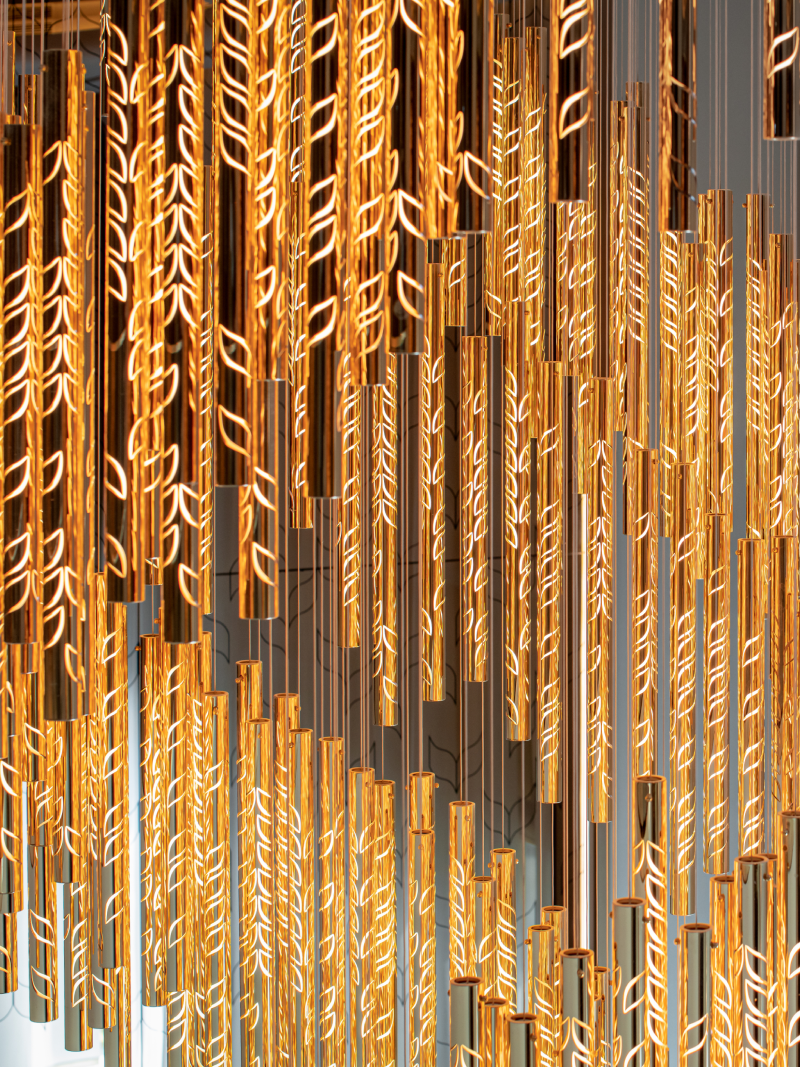 The installation seamlessly integrates heritage craftsmanship with the cuttng-edge technologies. Each of the 210 glass tubes is fitted with an LED strip, coated in gold, and then engraved with a unique leaf motif taken from the luxury hotel’s wallpaper.