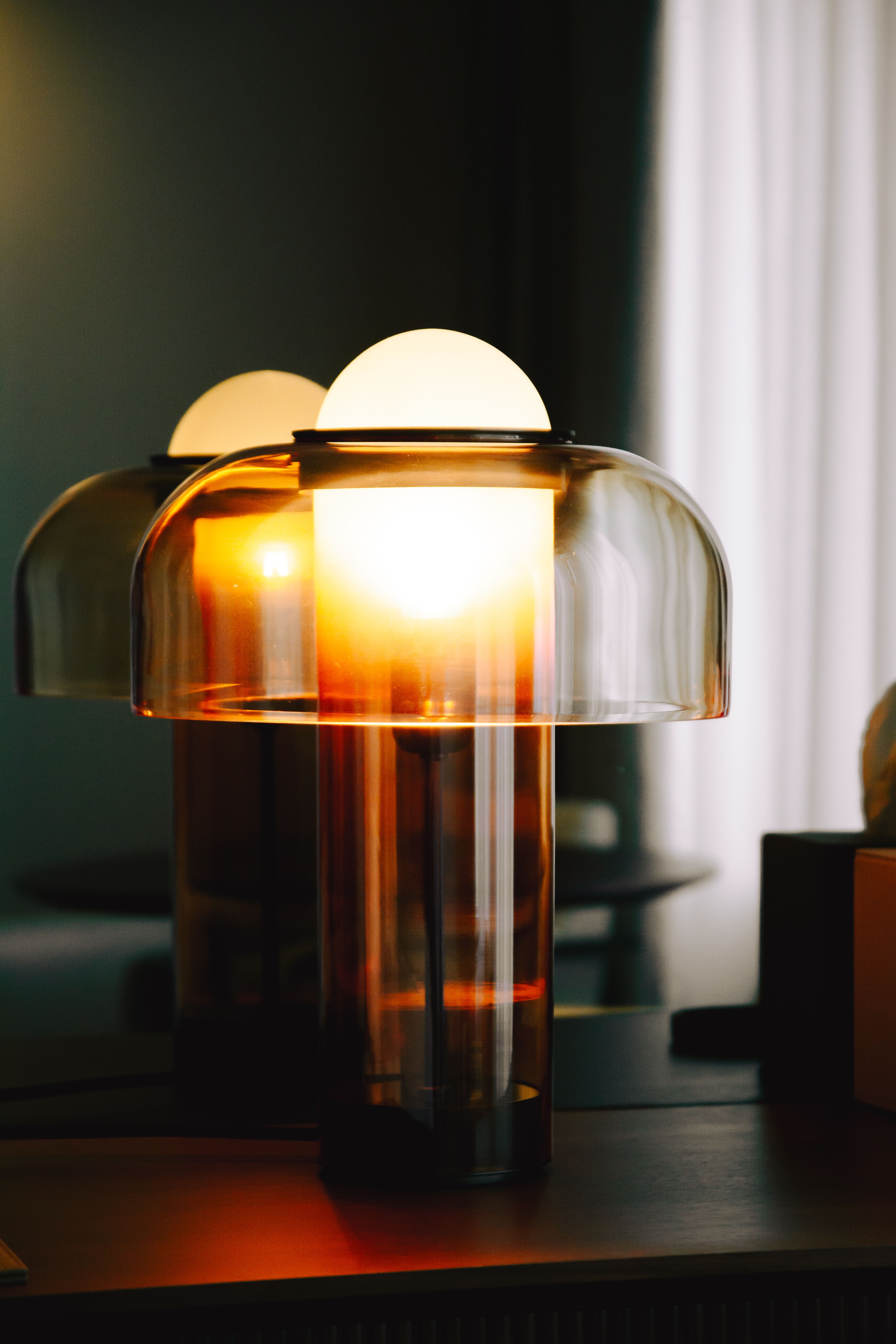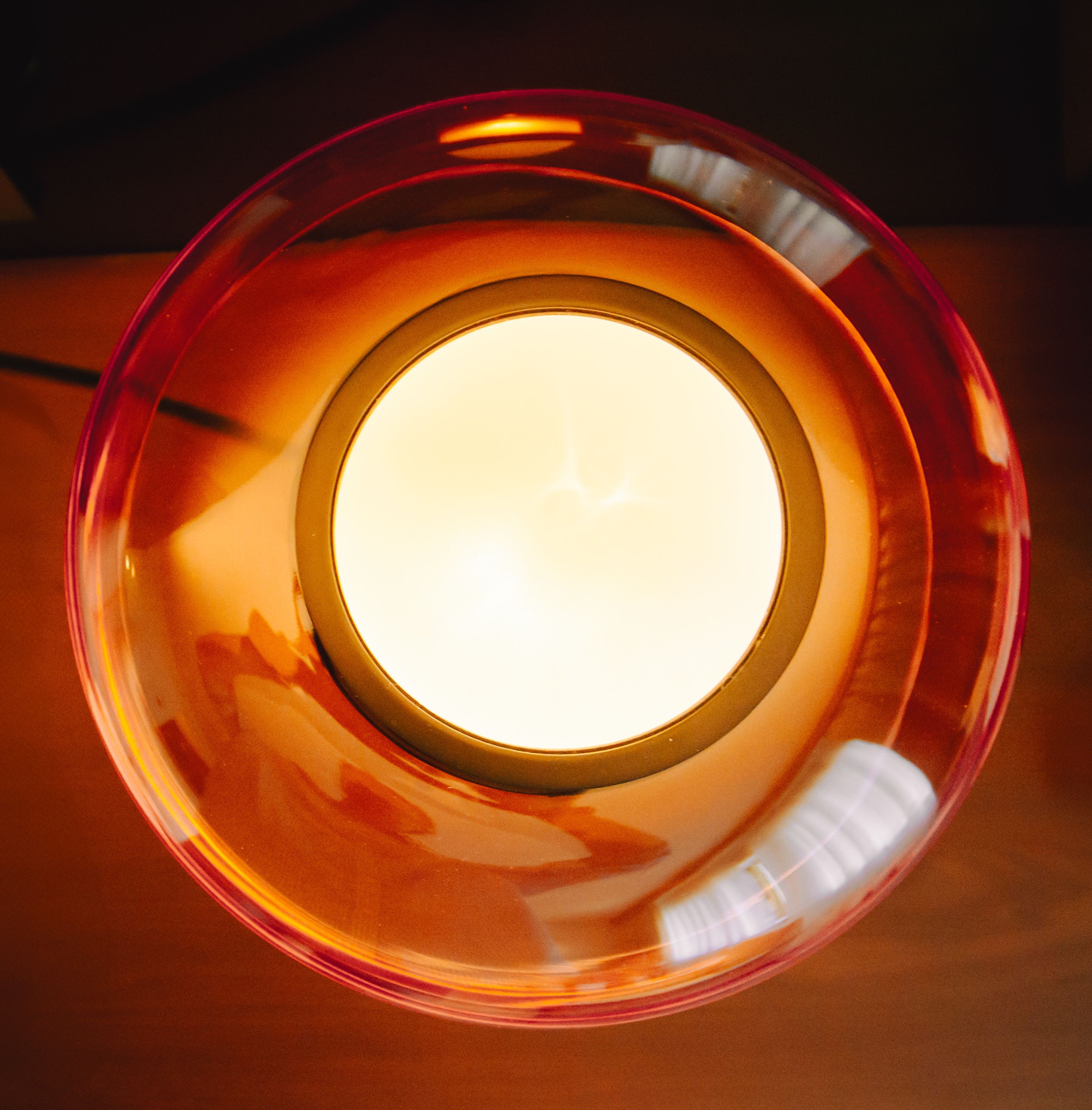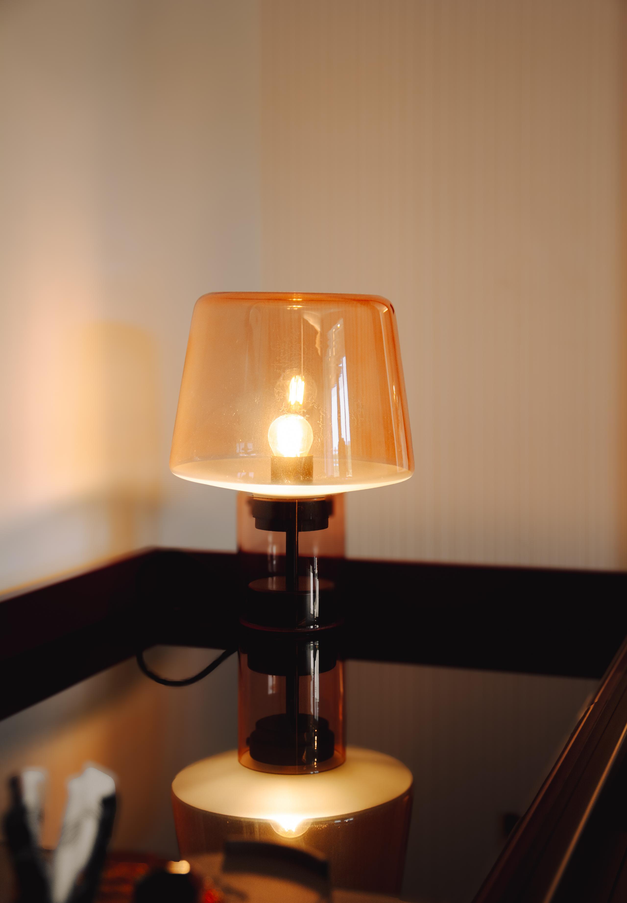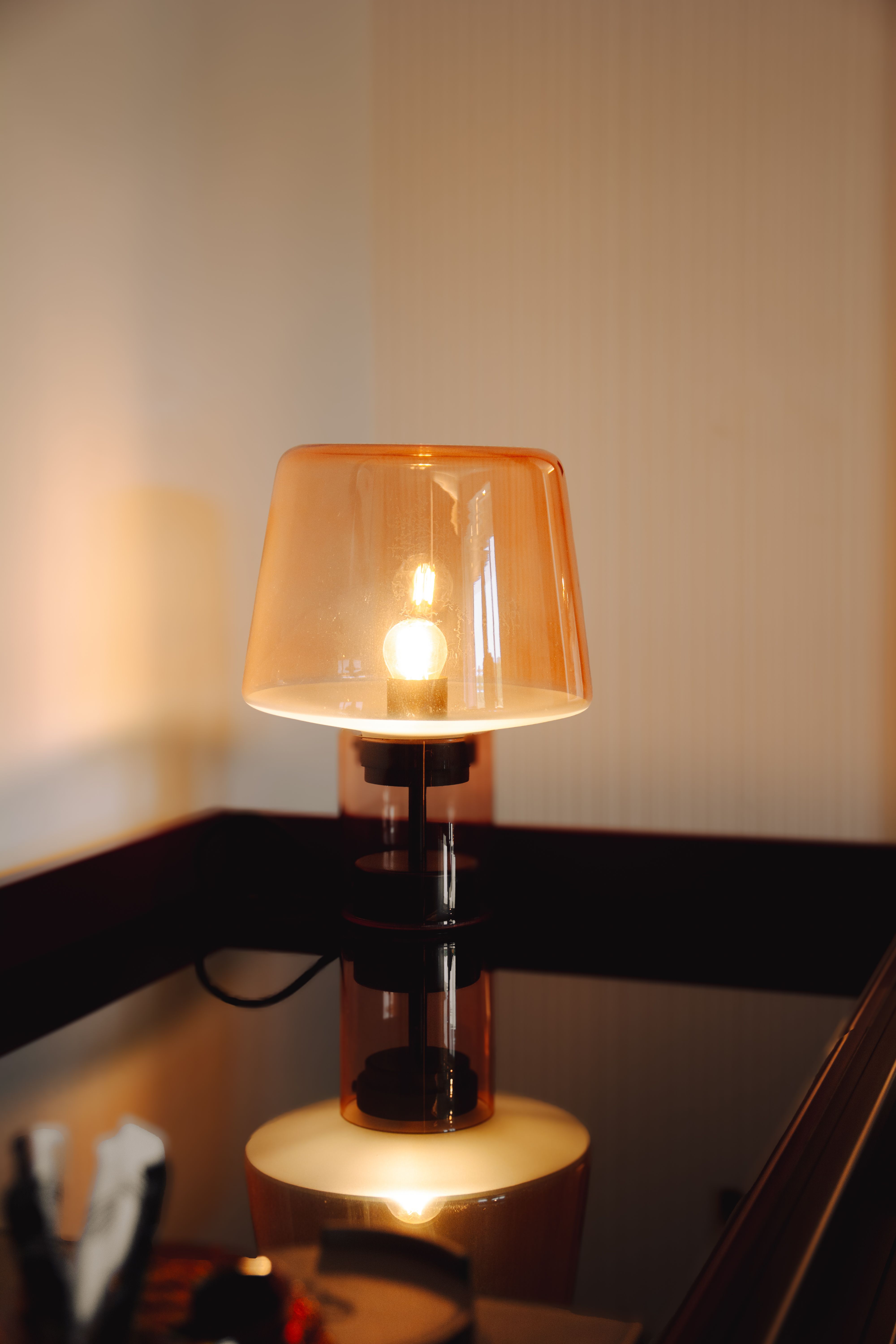 Similarly, our custom bedside table lamps combine orange-tinted glass with sandblasted detailing, carefully layered to create a unique lighting effect when illuminated. The clever construction allows the individual elements to connect seamlessly, glowing from within and casting a warm, inviting hue.
