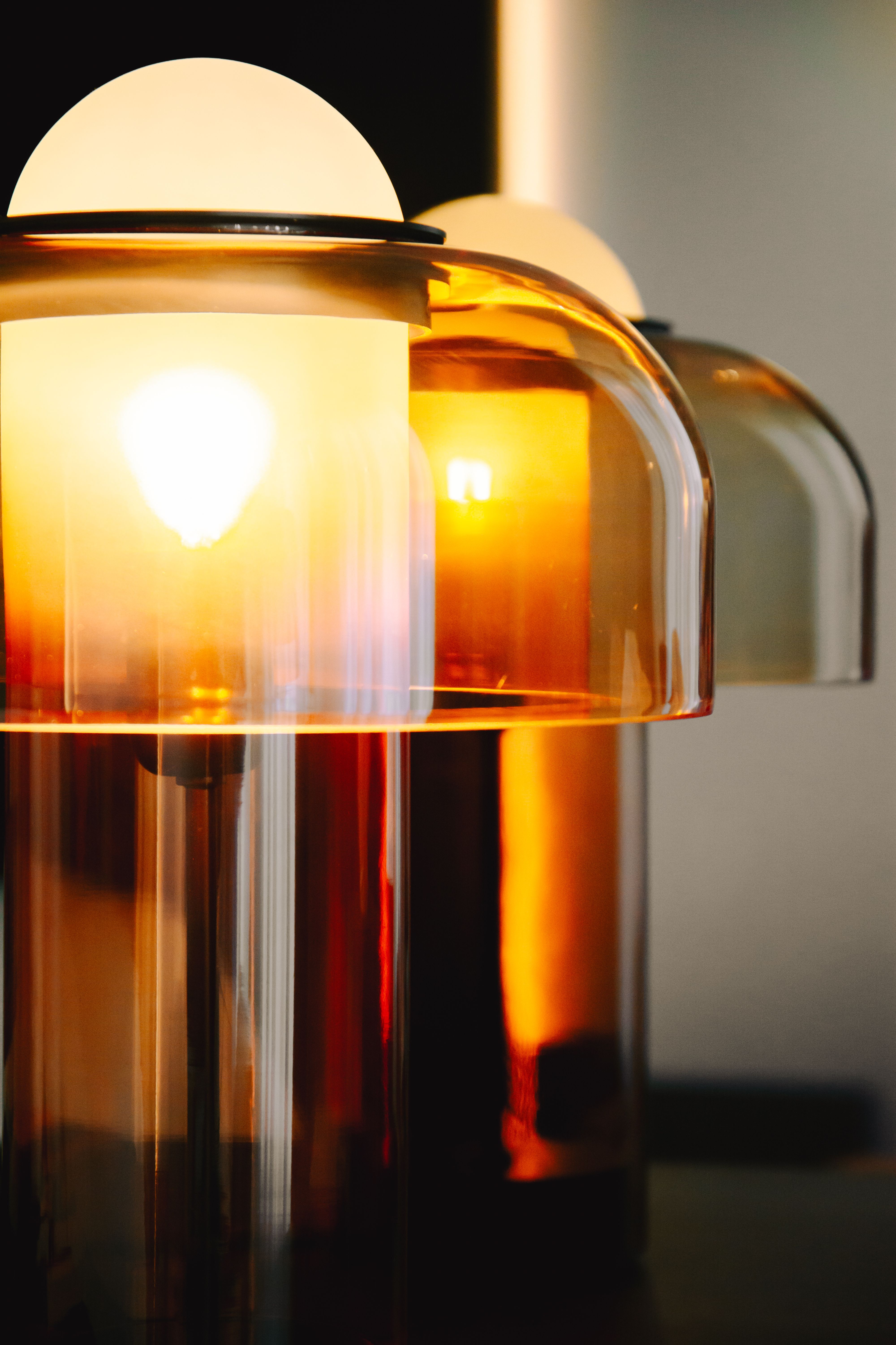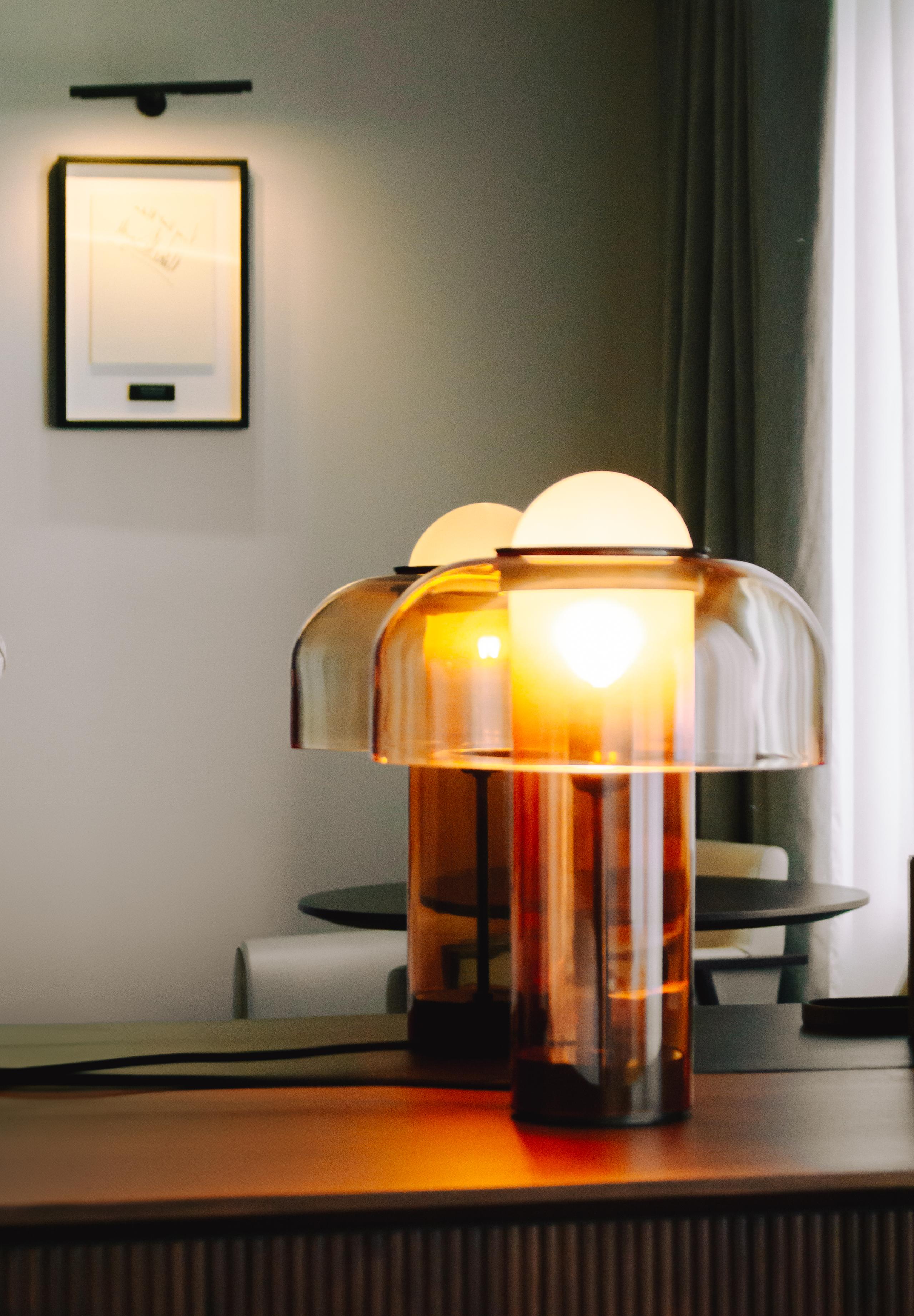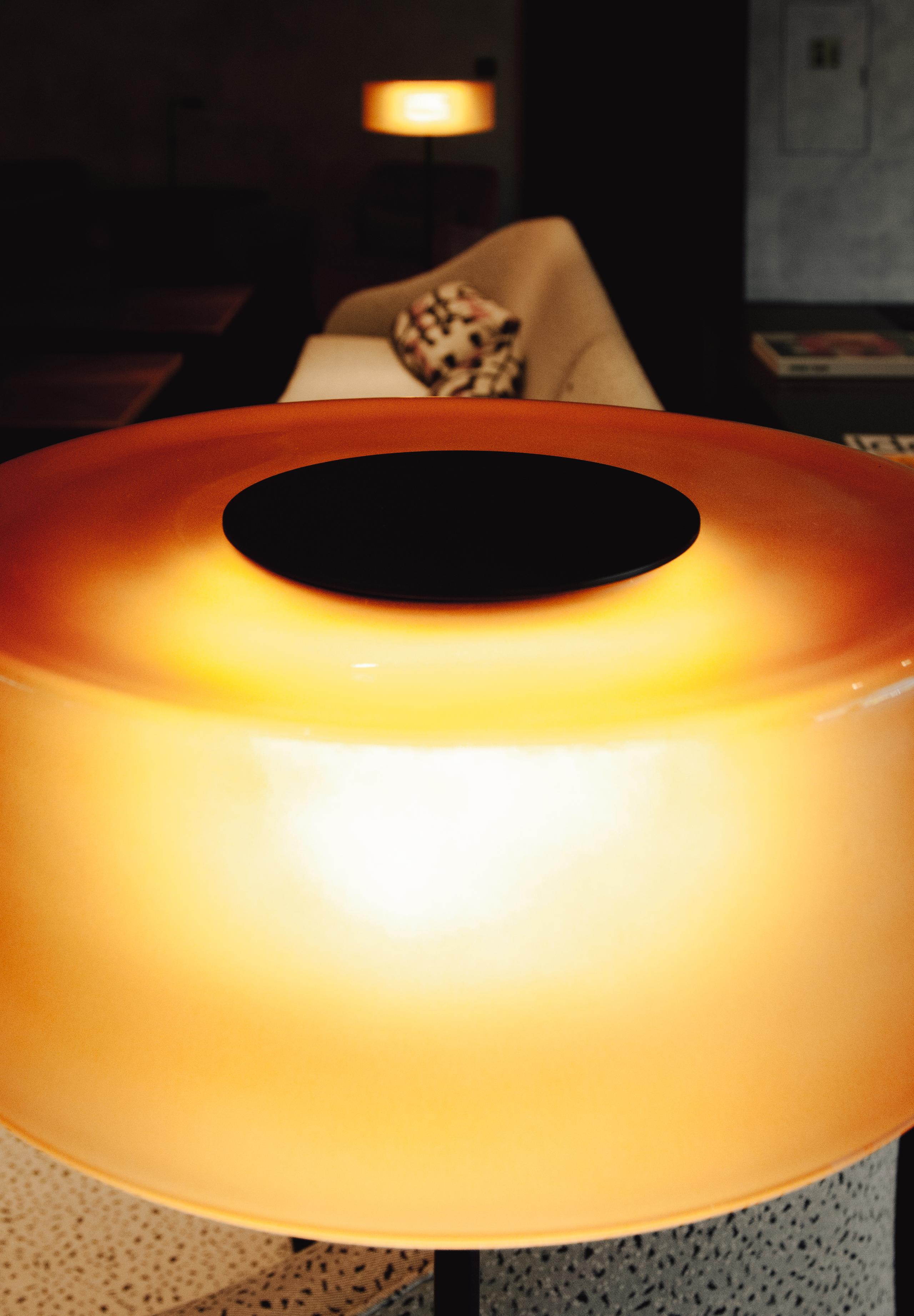 Similarly, our custom bedside table lamps combine orange-tinted glass with sandblasted detailing, carefully layered to create a unique lighting effect when illuminated. The clever construction allows the individual elements to connect seamlessly, glowing from within and casting a warm, inviting hue.