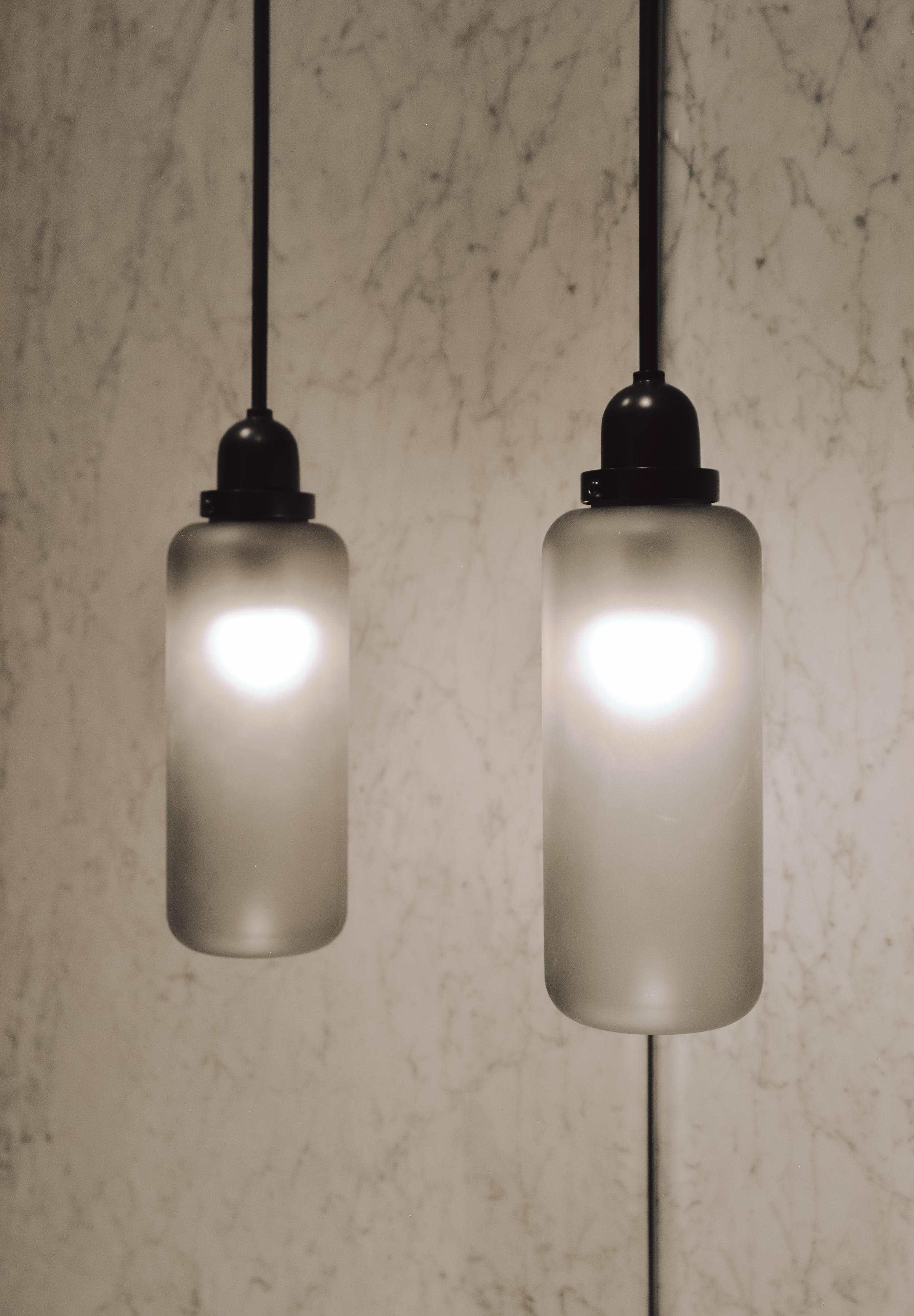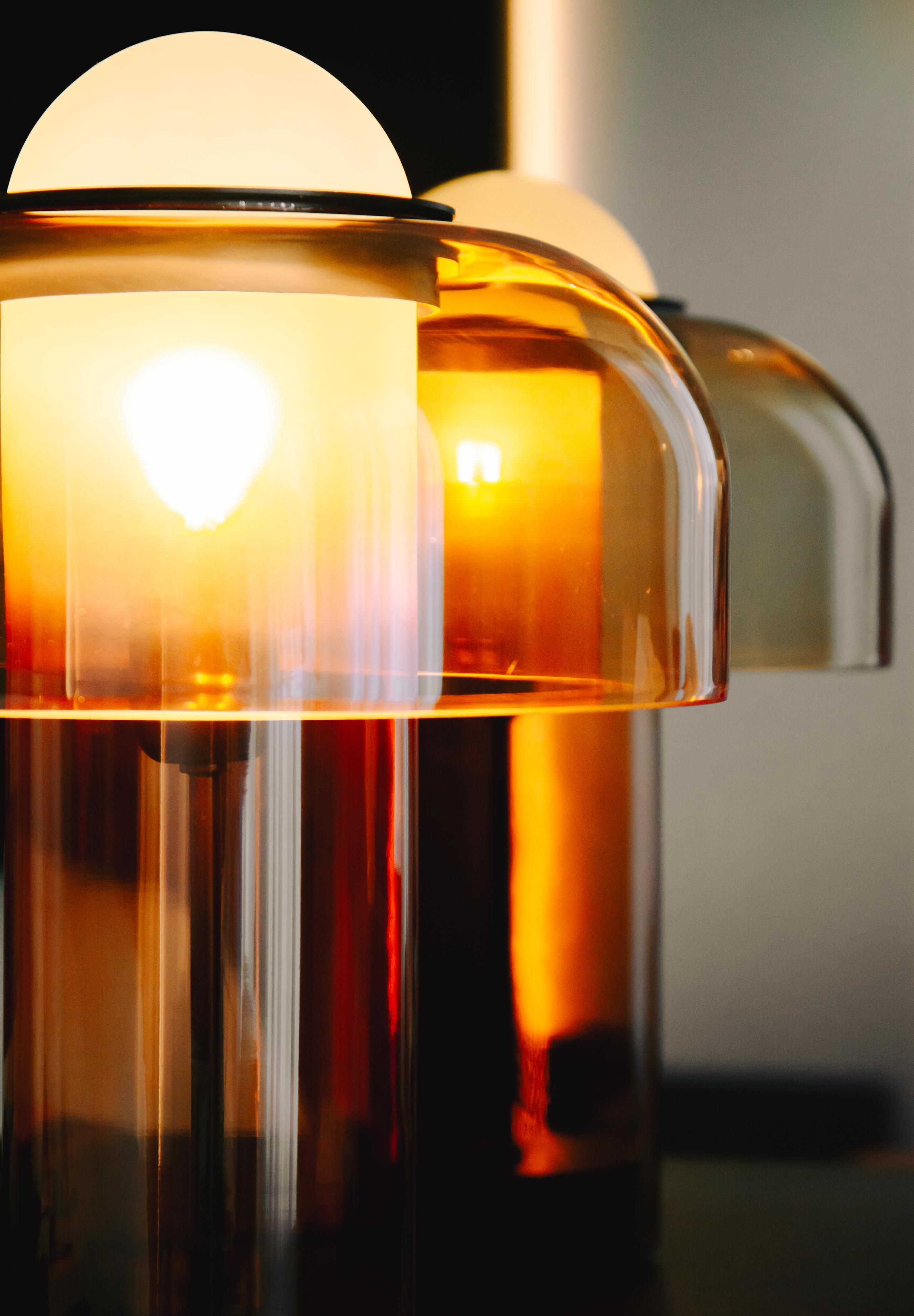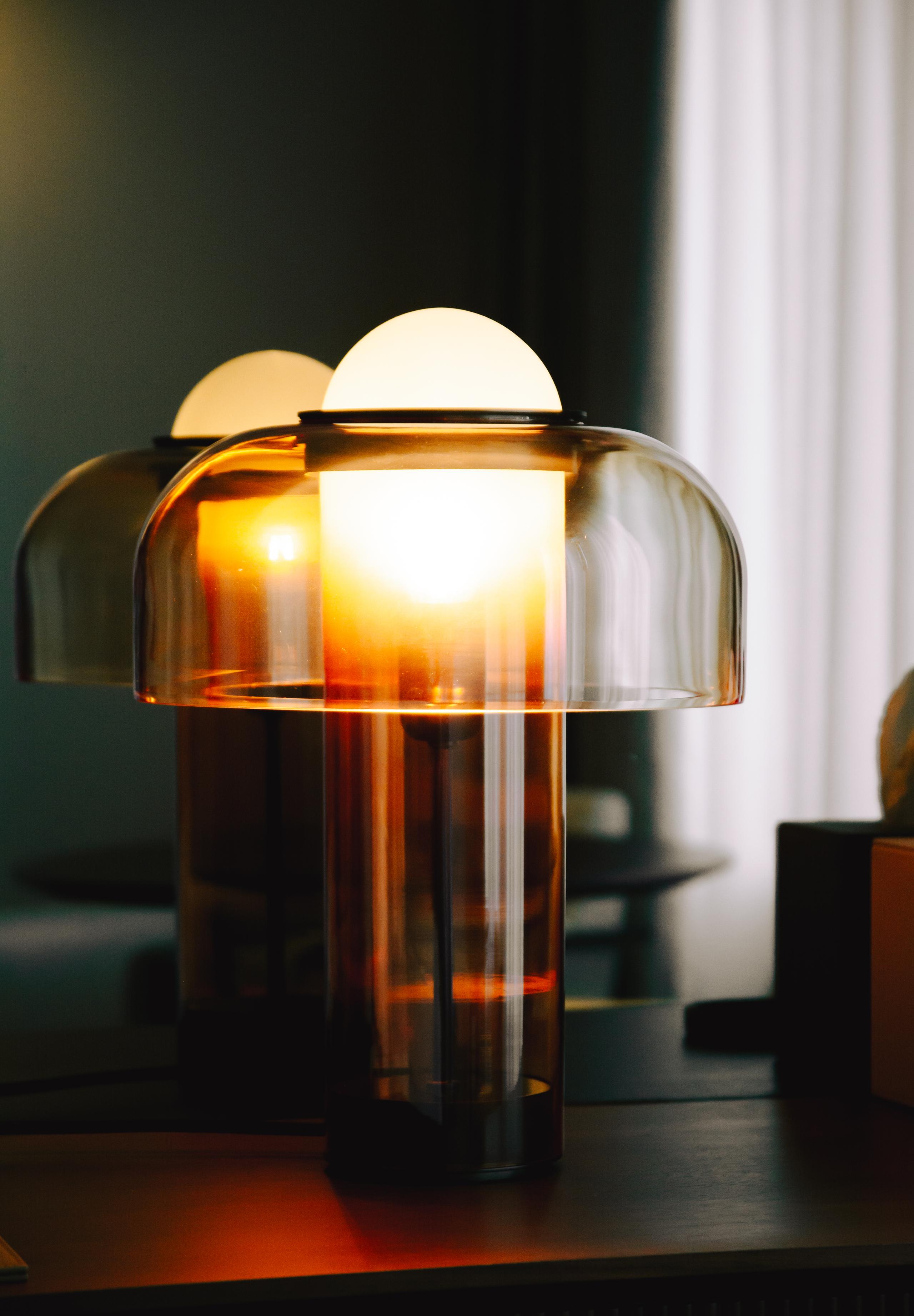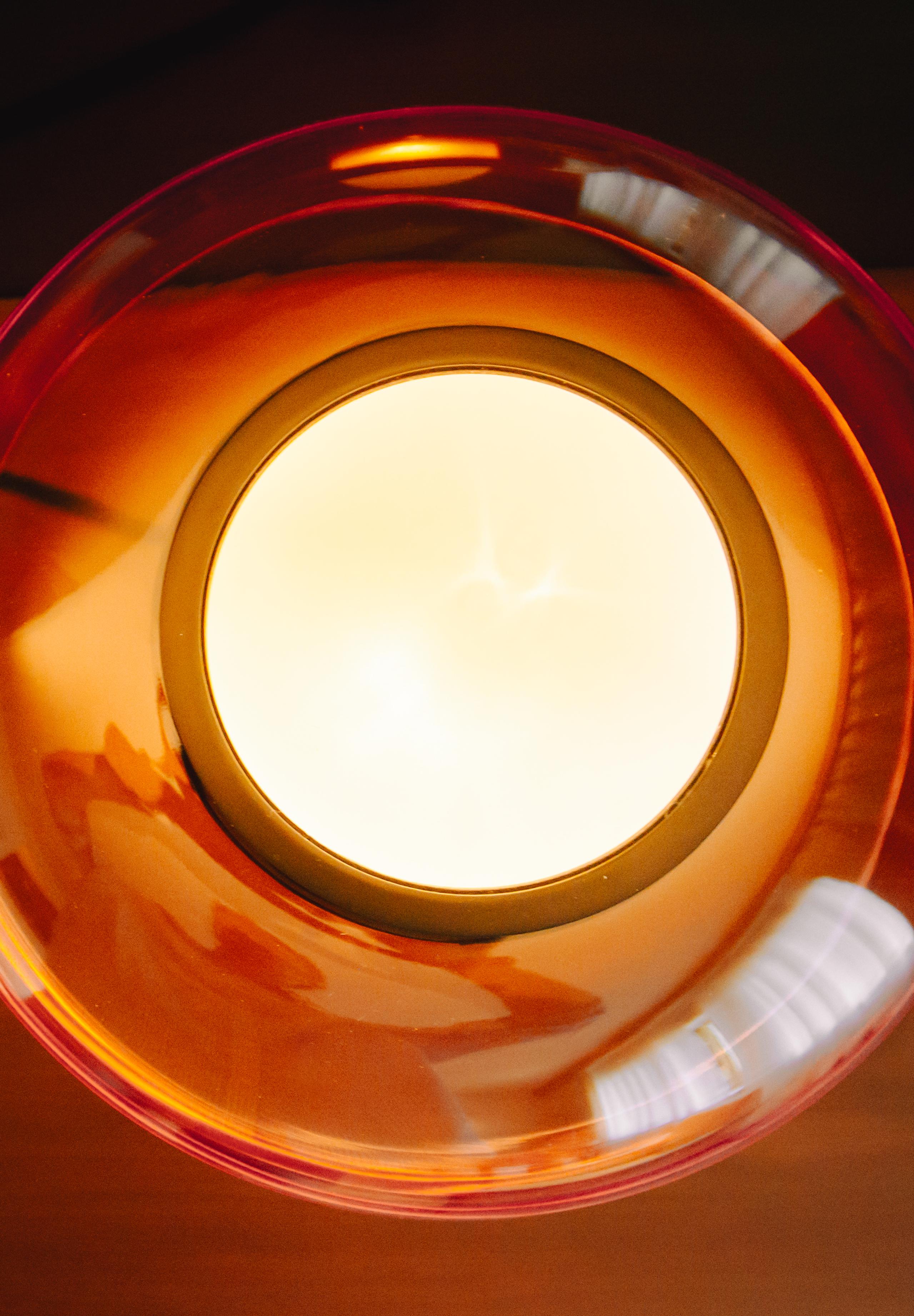 Similarly, our custom bedside table lamps combine orange-tinted glass with sandblasted detailing, carefully layered to create a unique lighting effect when illuminated. The clever construction allows the individual elements to connect seamlessly, glowing from within and casting a warm, inviting hue.