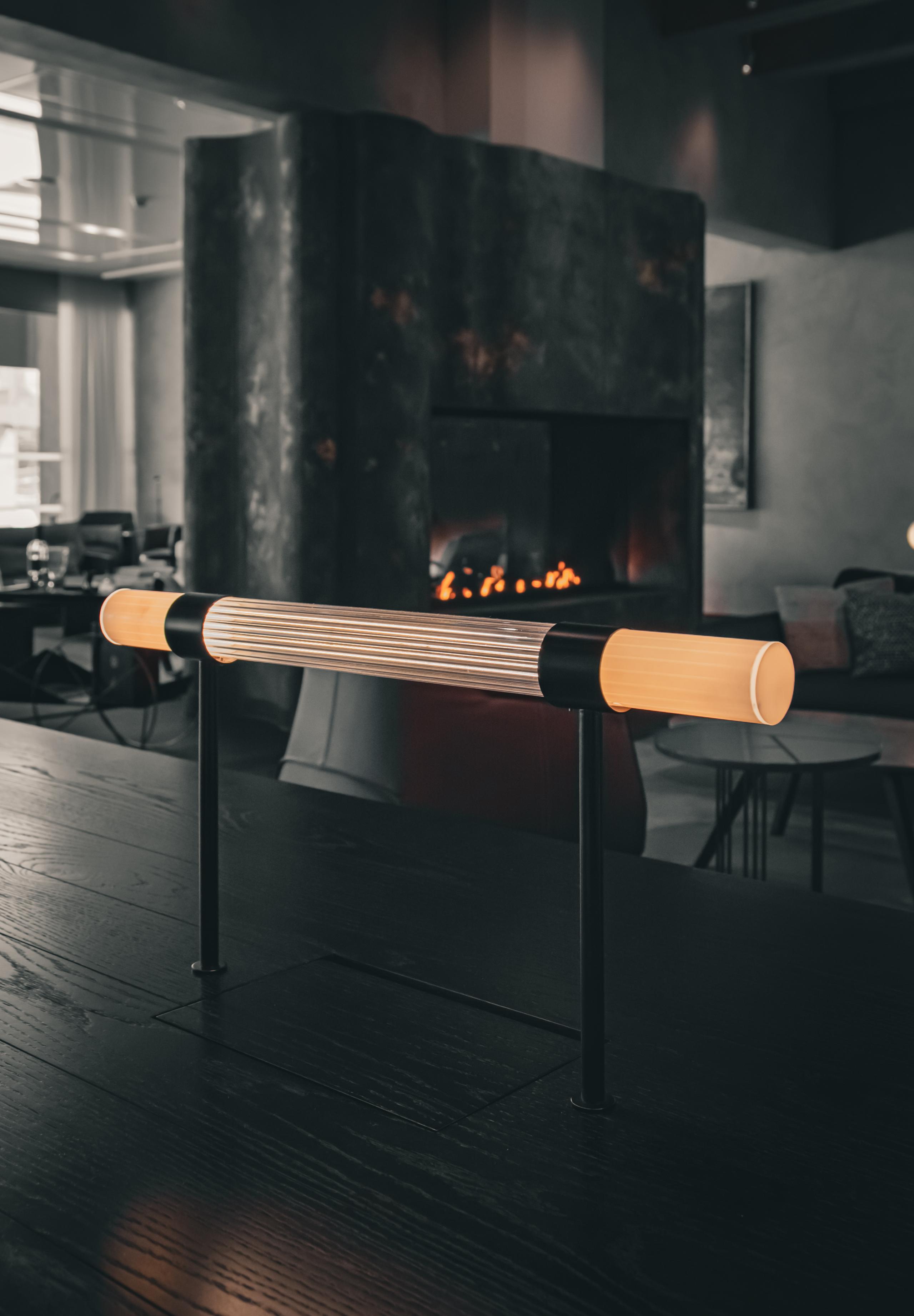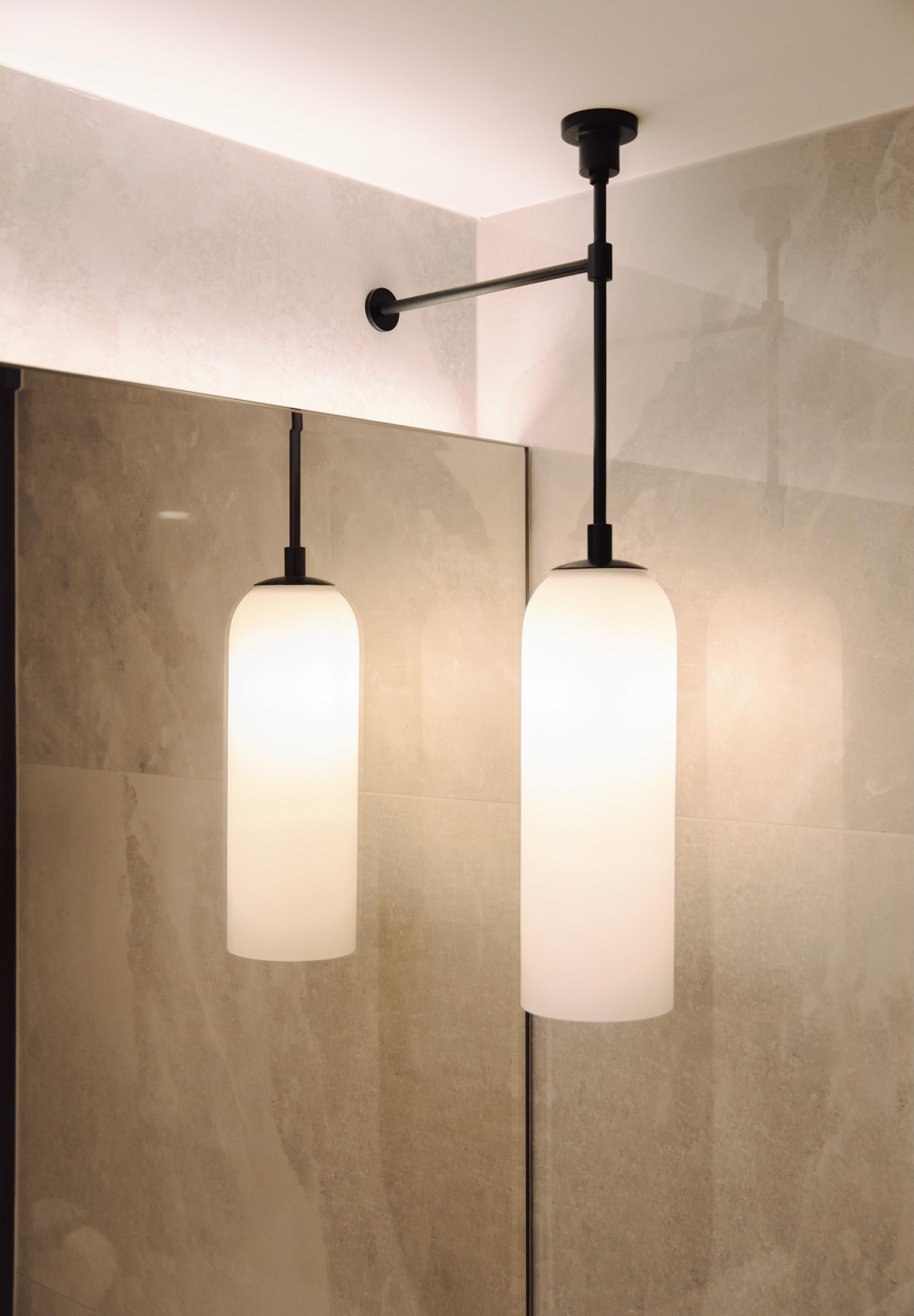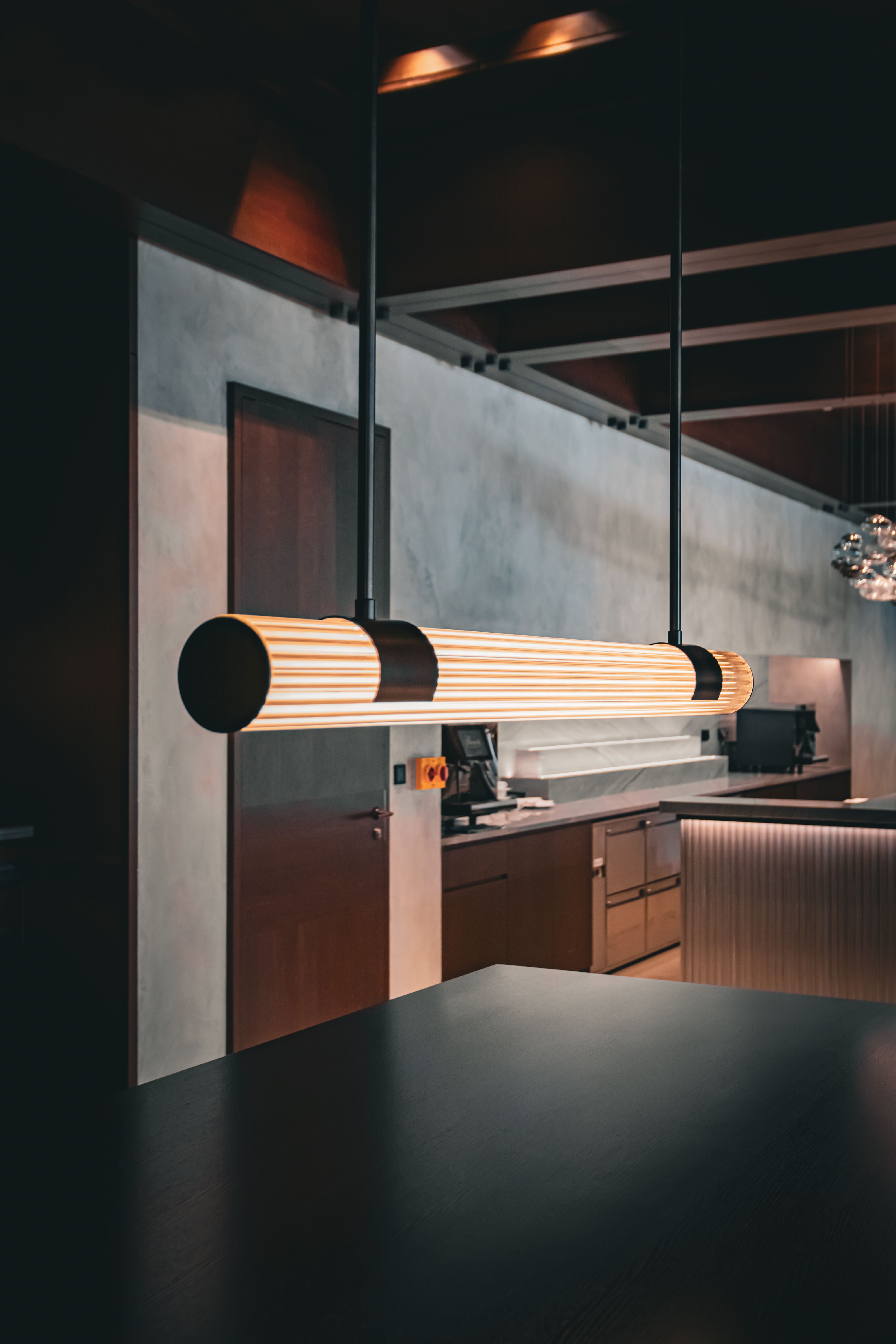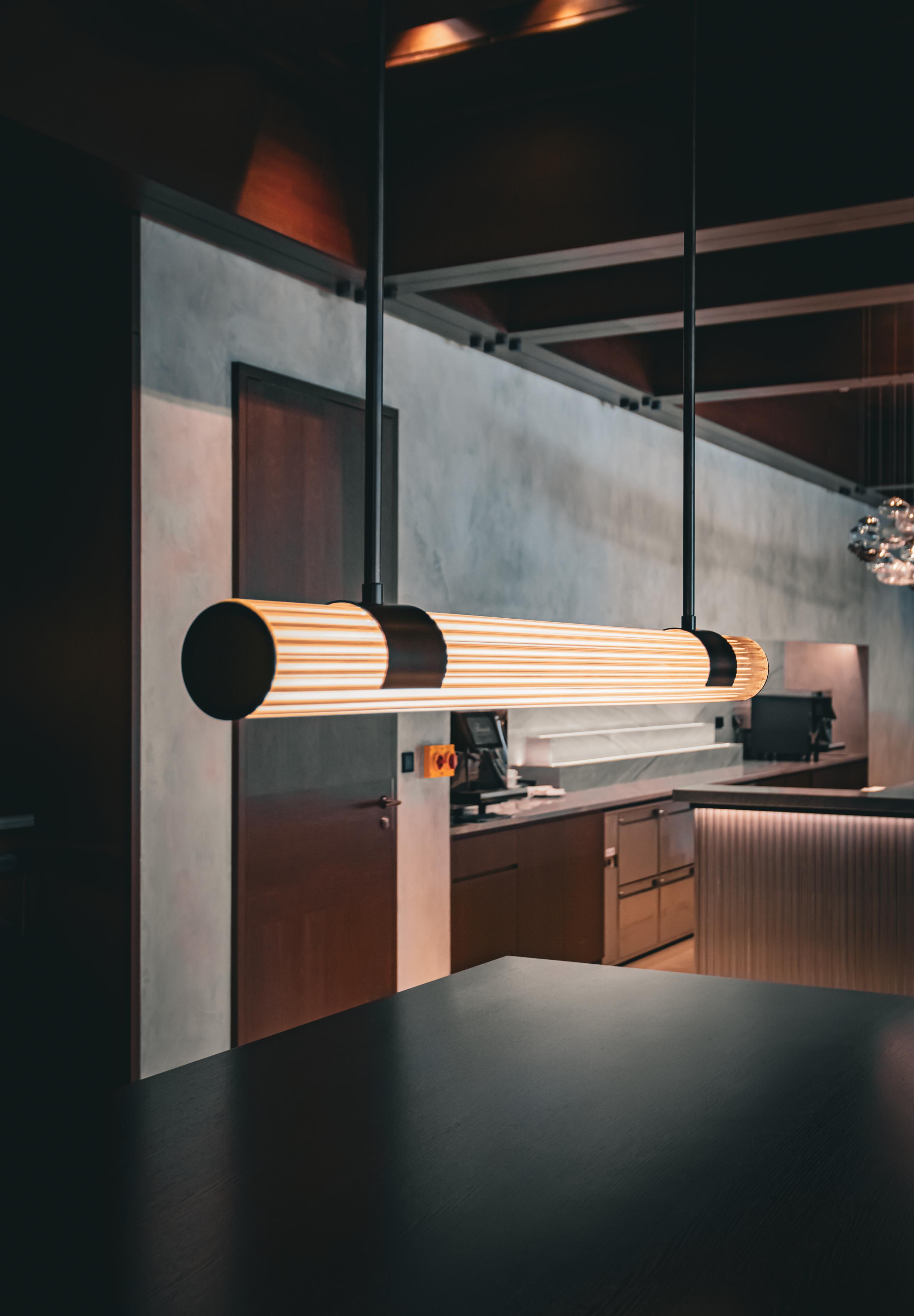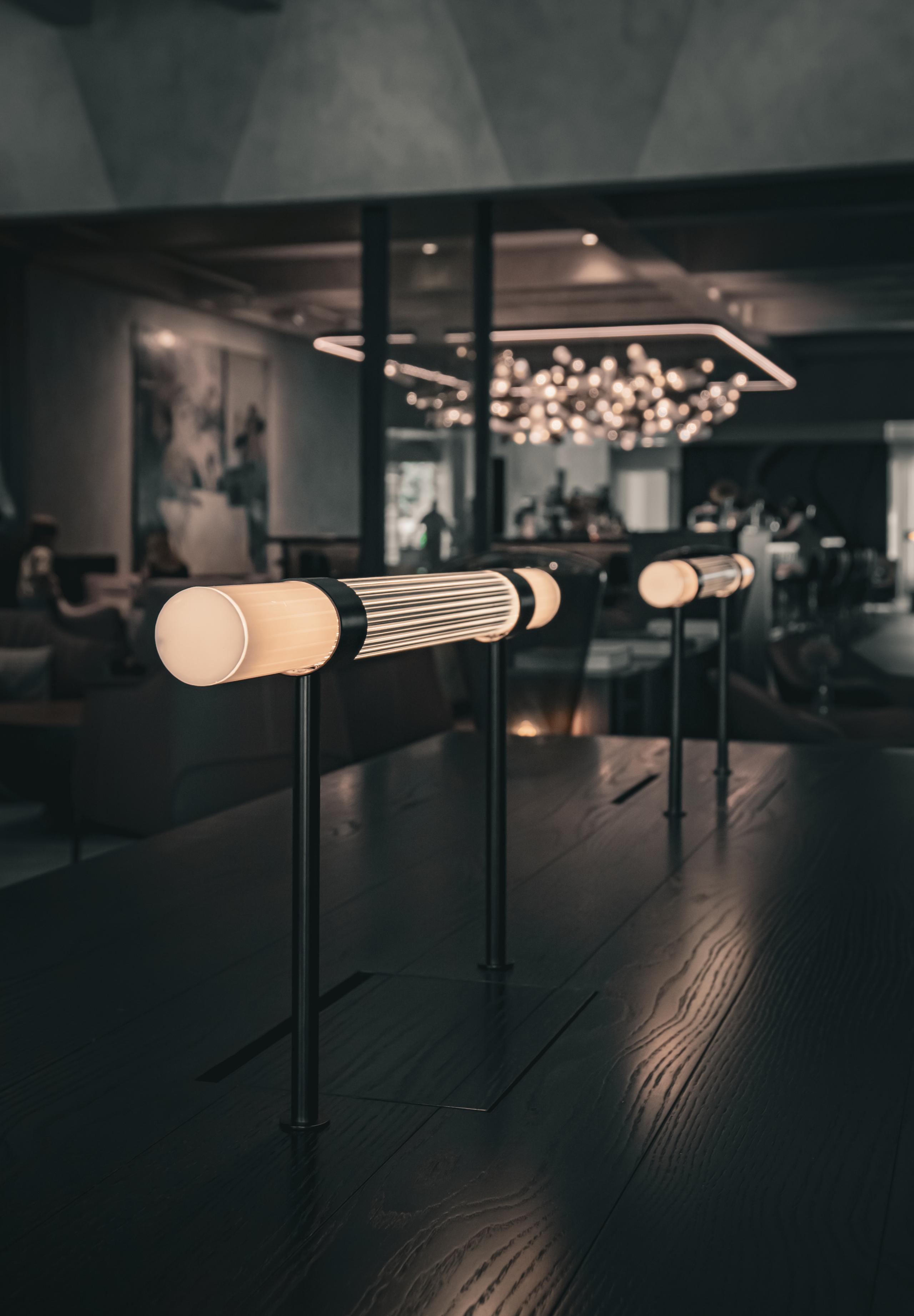 In the Crystal Room Bar, a 2-metre-long pendant commands attention. Made from ribbed crystal glass with a glowing opal tube core and dark satin bronze details, it blends clean lines with subtle texture, forming a striking centrepiece above the bar.