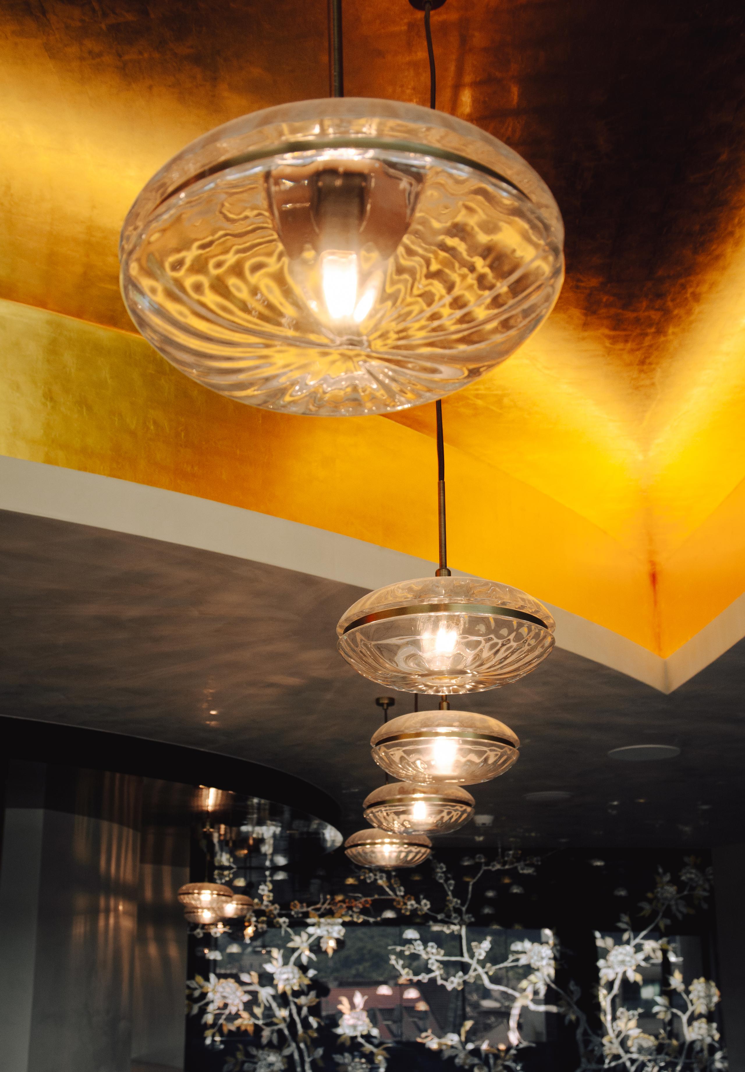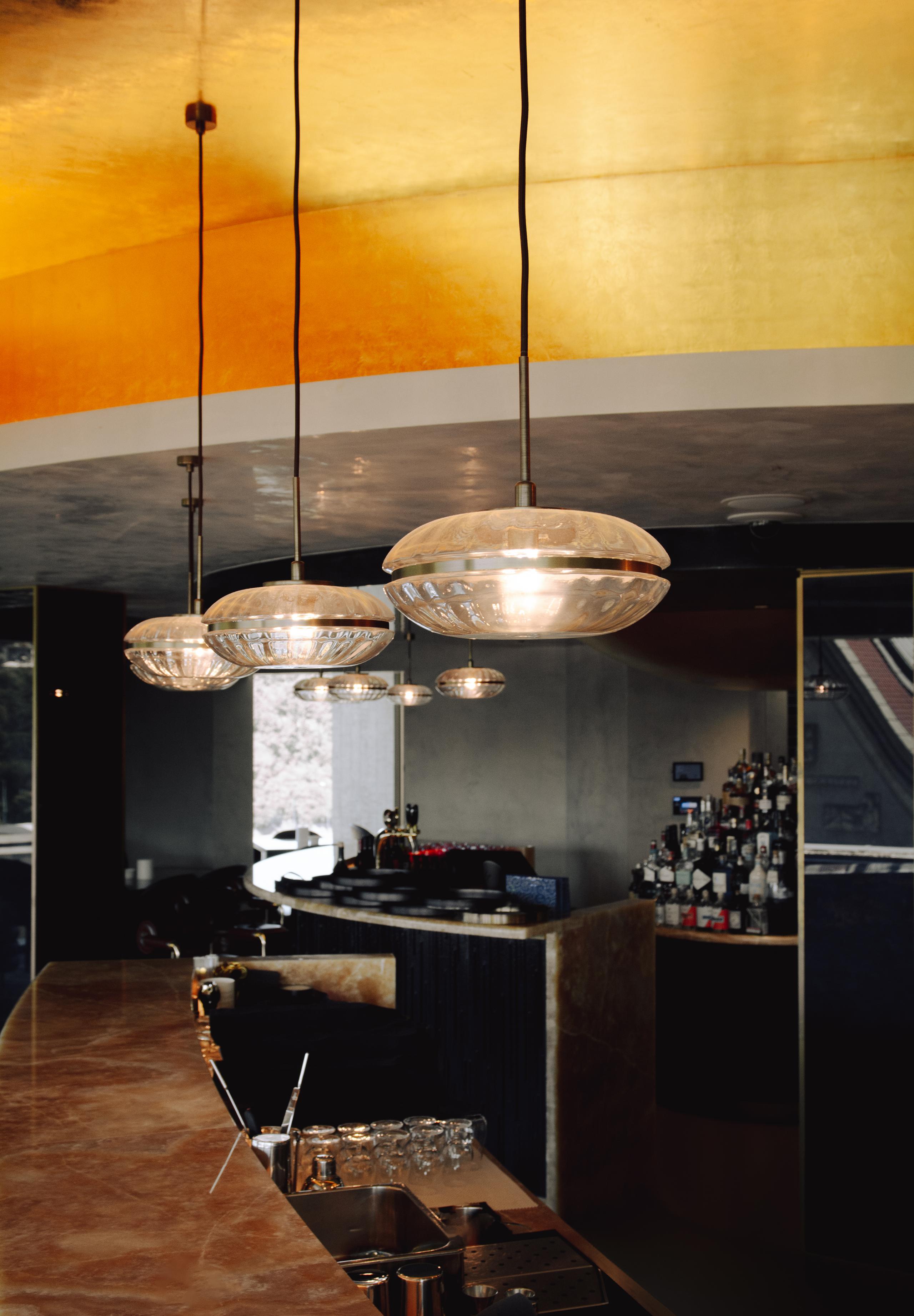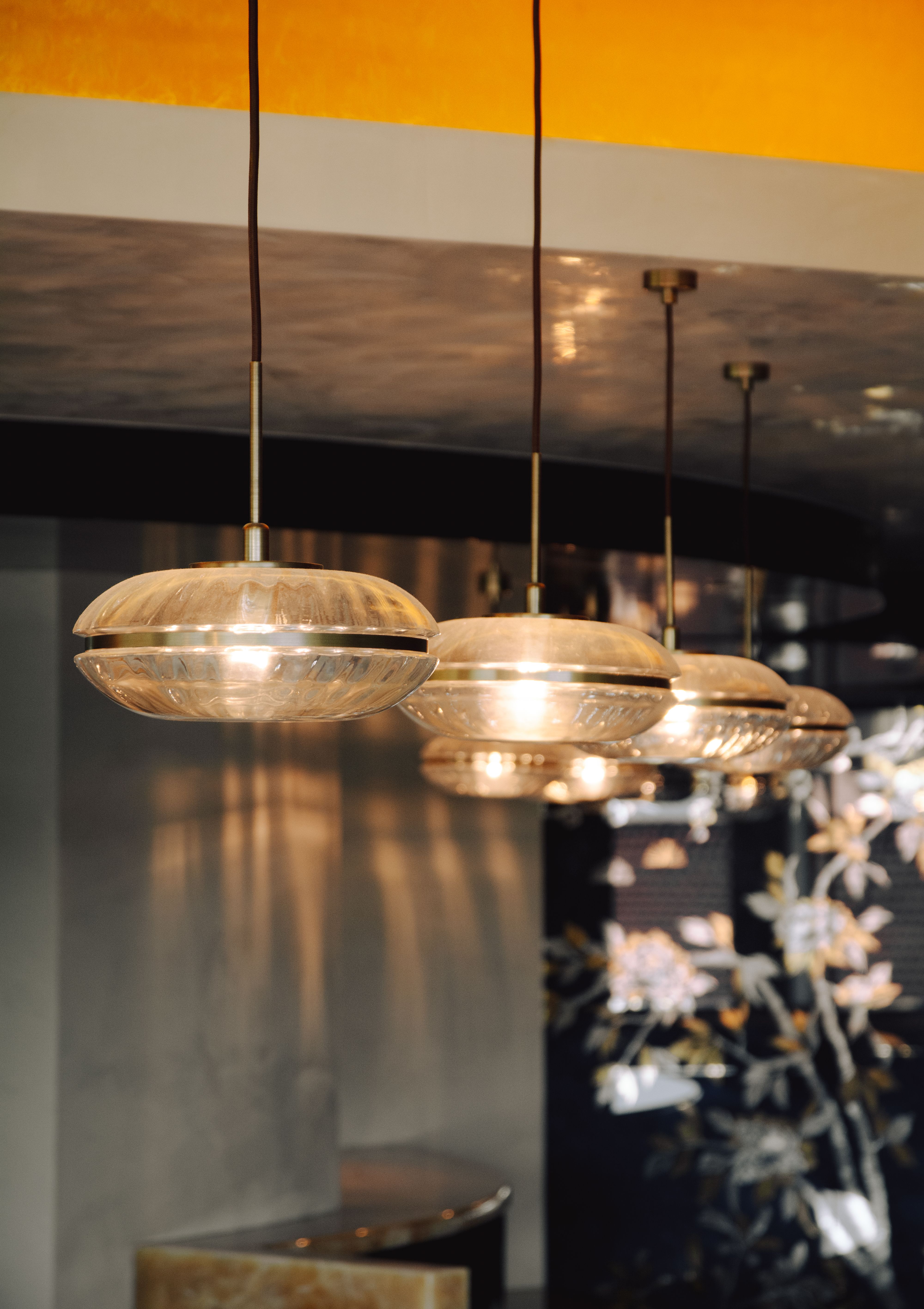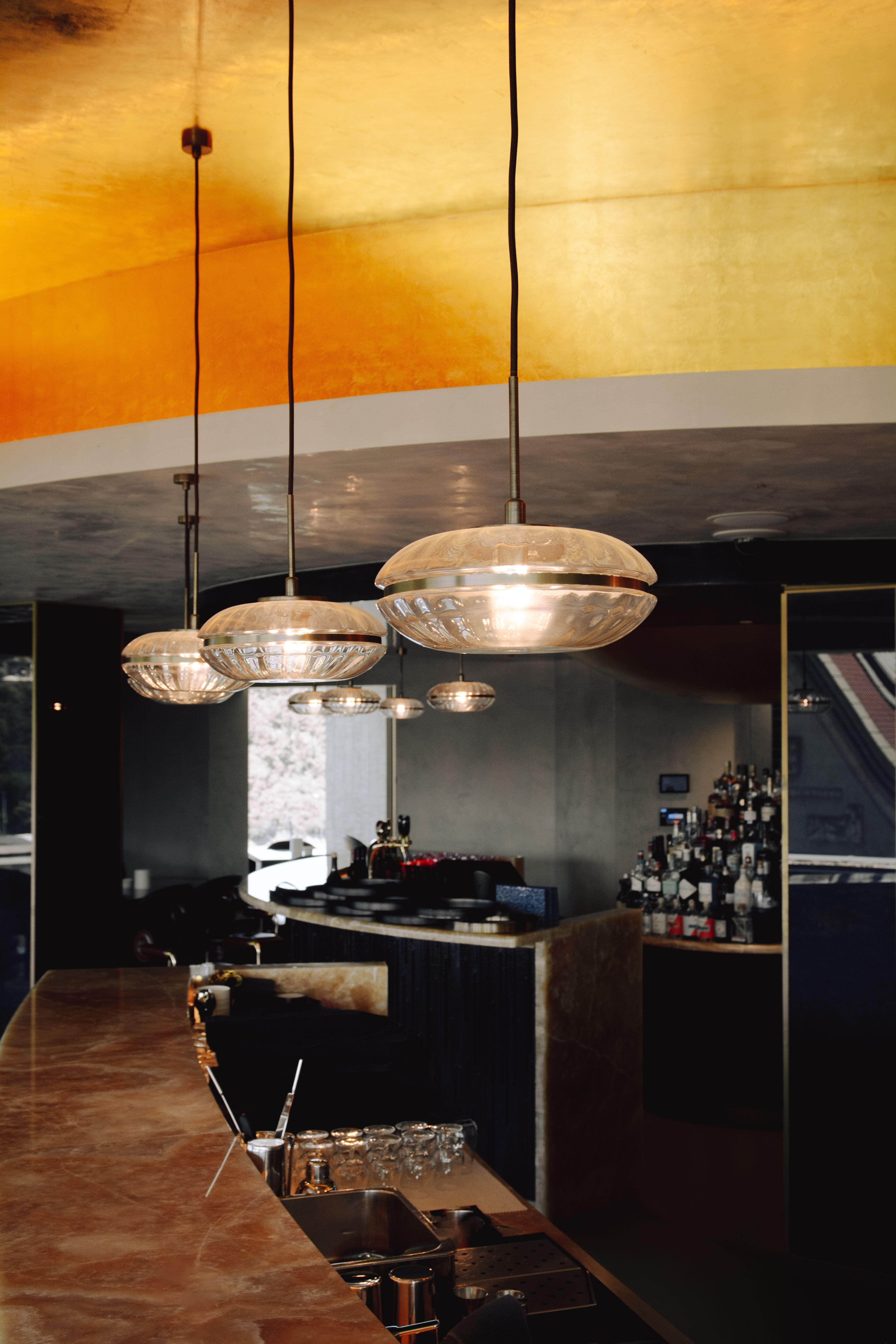 Crowning the hotel, the Golden Eye Bar offers panoramic city views, Southeast Asian flavours, and an unmistakable 1970s flair. To capture its glamorous, cosmopolitan energy, we designed a bespoke crystal pendant featuring handcrafted glass and warm gold details. The pendant’s soft curves and textured surface interact beautifully with light, offering a modern interpretation of retro luxury.