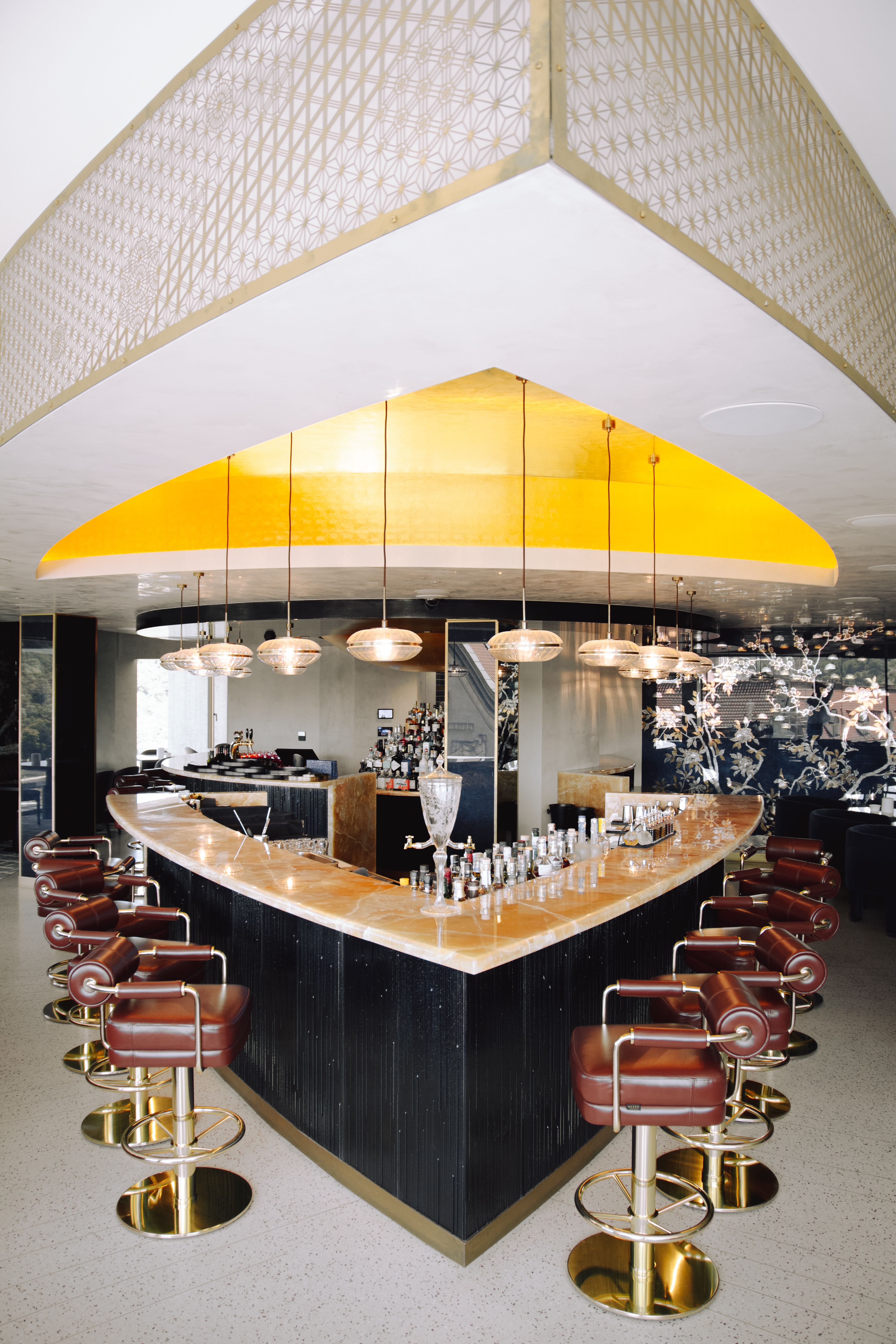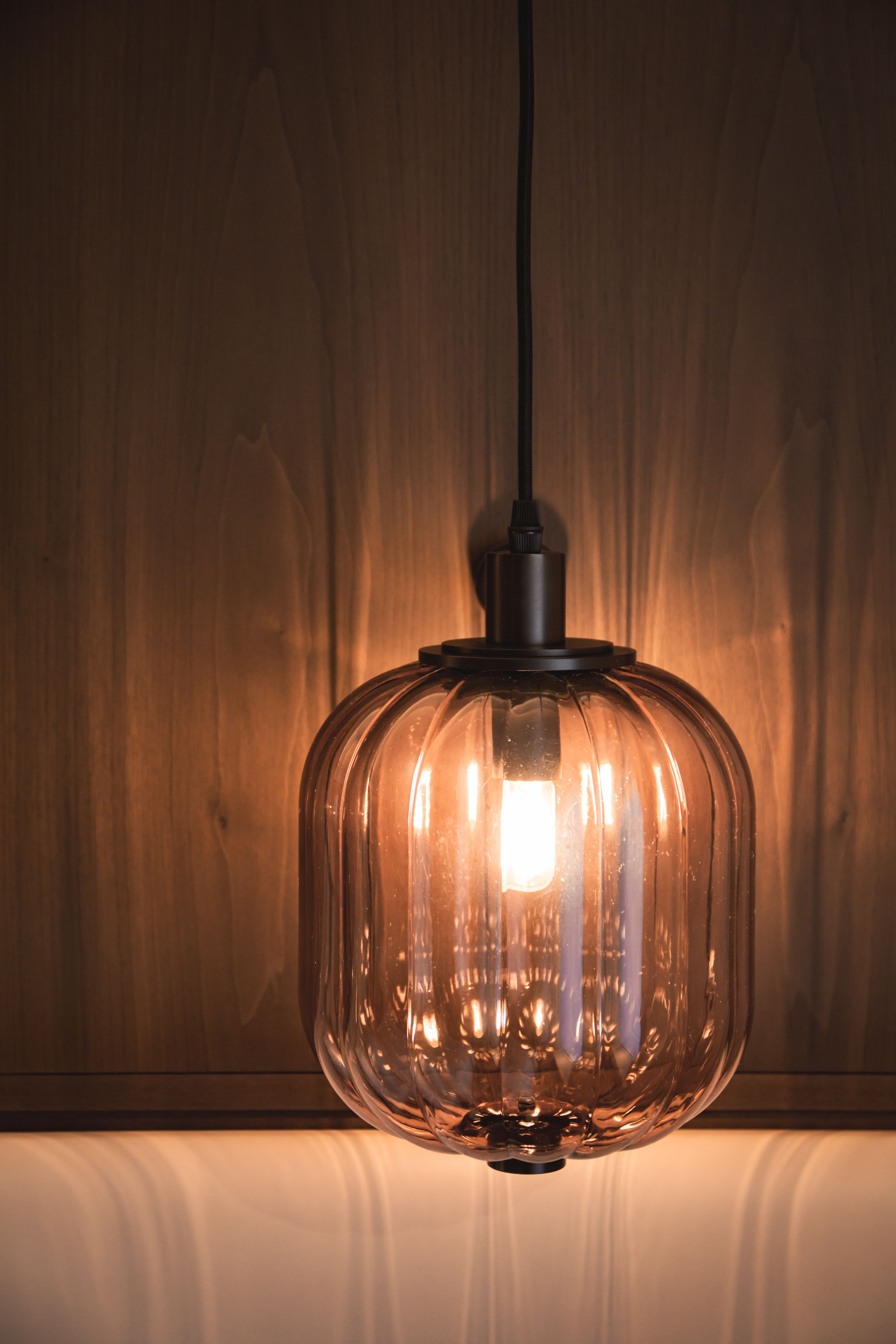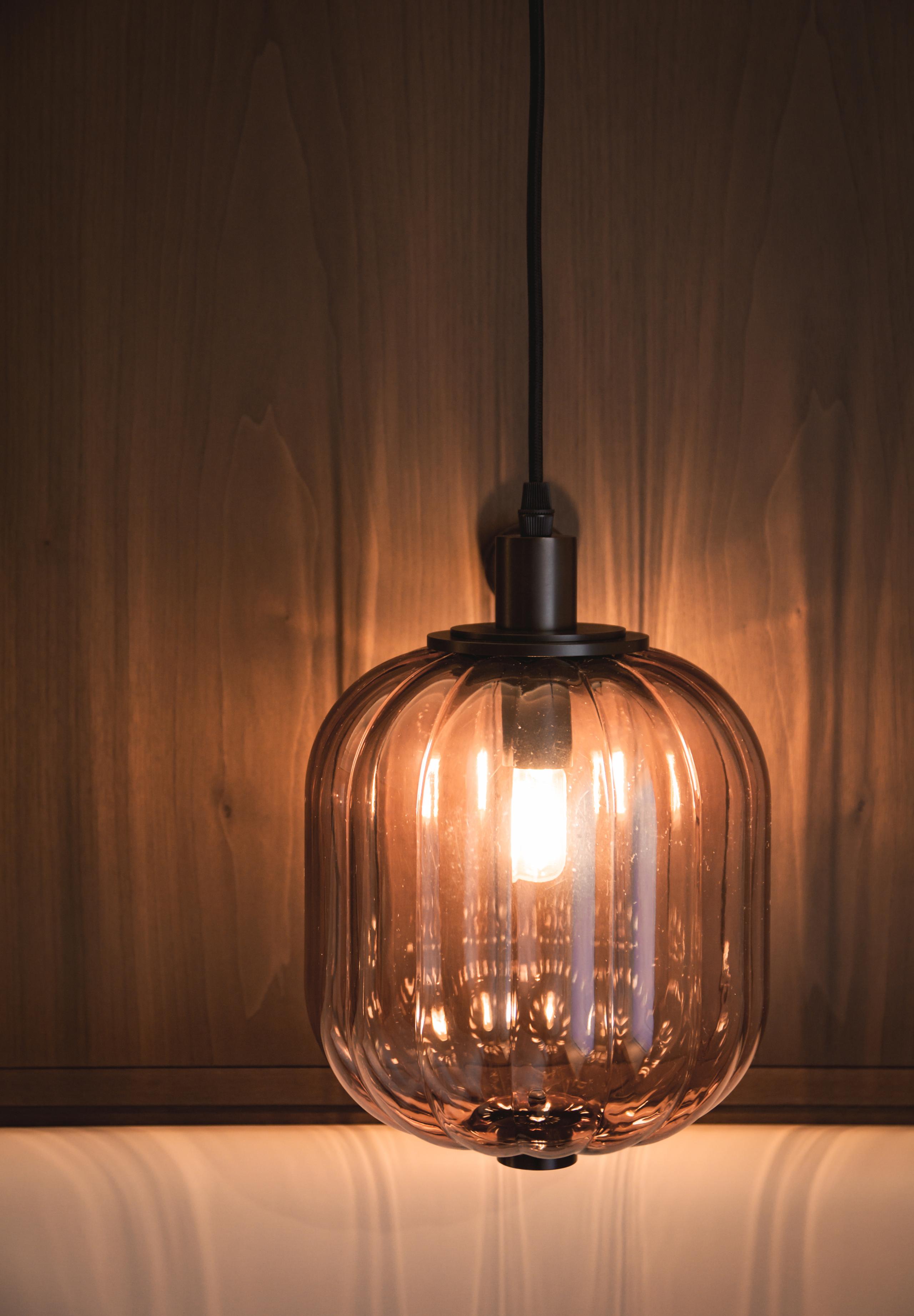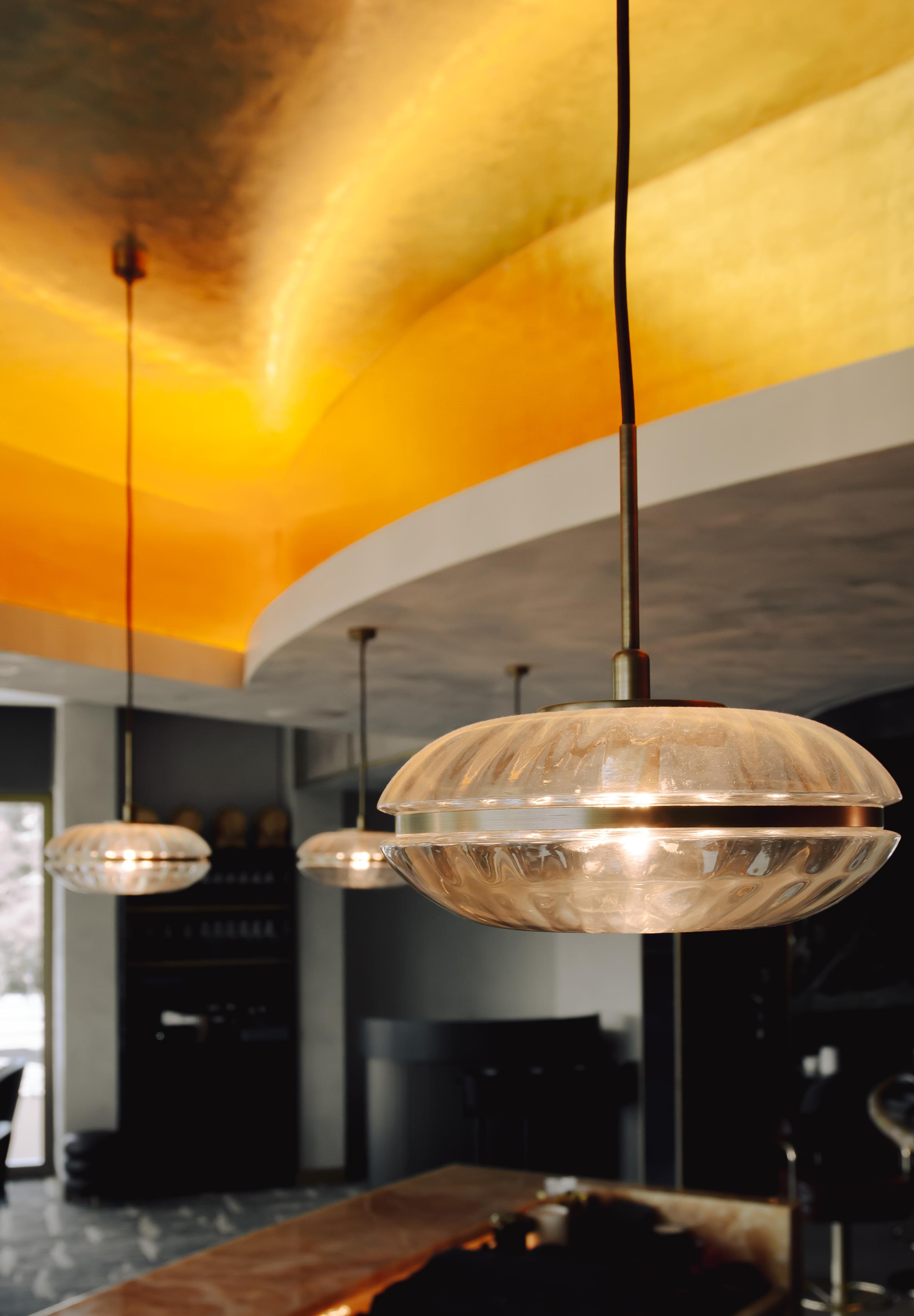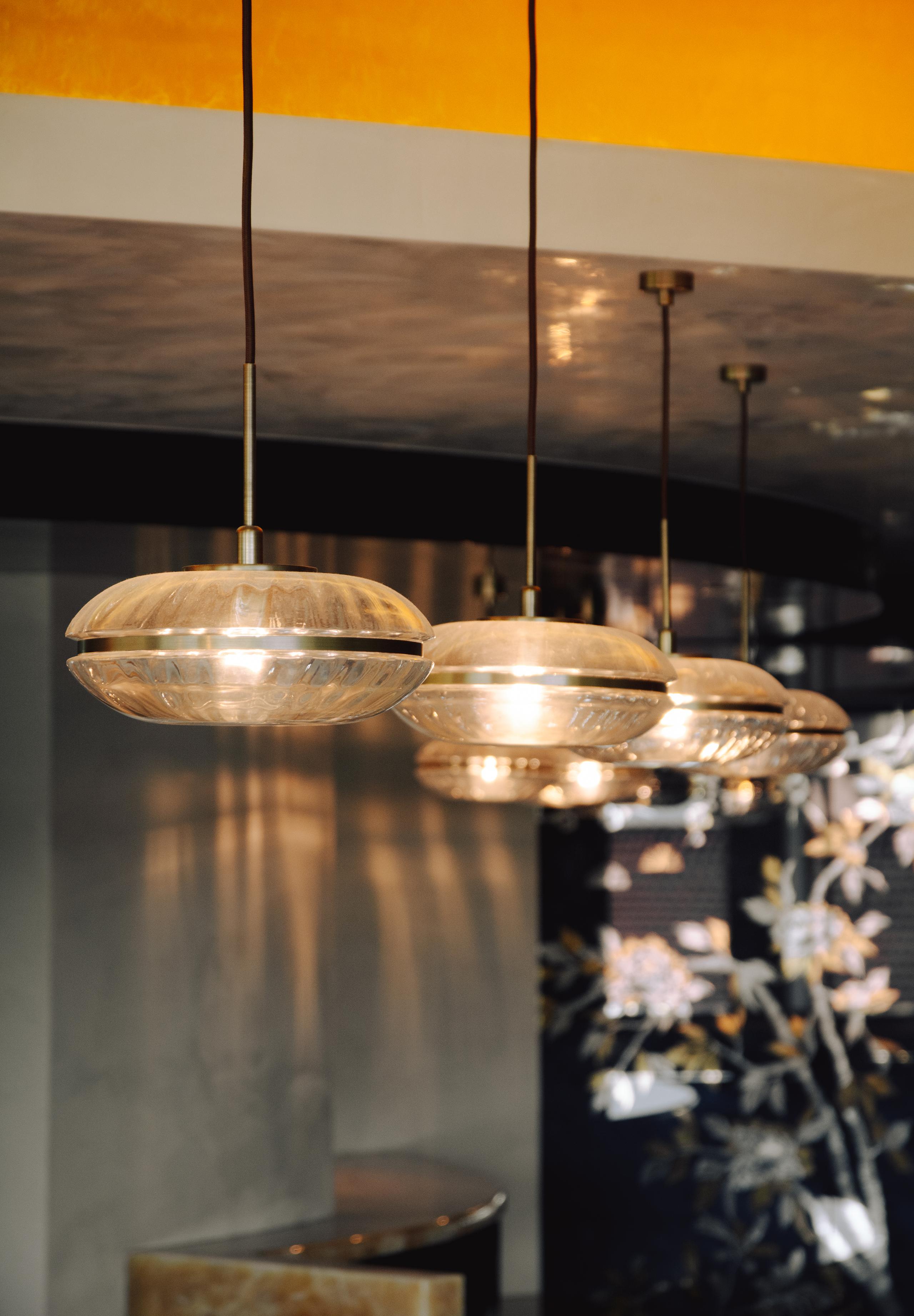 Crowning the hotel, the Golden Eye Bar offers panoramic city views, Southeast Asian flavours, and an unmistakable 1970s flair. To capture its glamorous, cosmopolitan energy, we designed a bespoke crystal pendant featuring handcrafted glass and warm gold details. The pendant’s soft curves and textured surface interact beautifully with light, offering a modern interpretation of retro luxury.