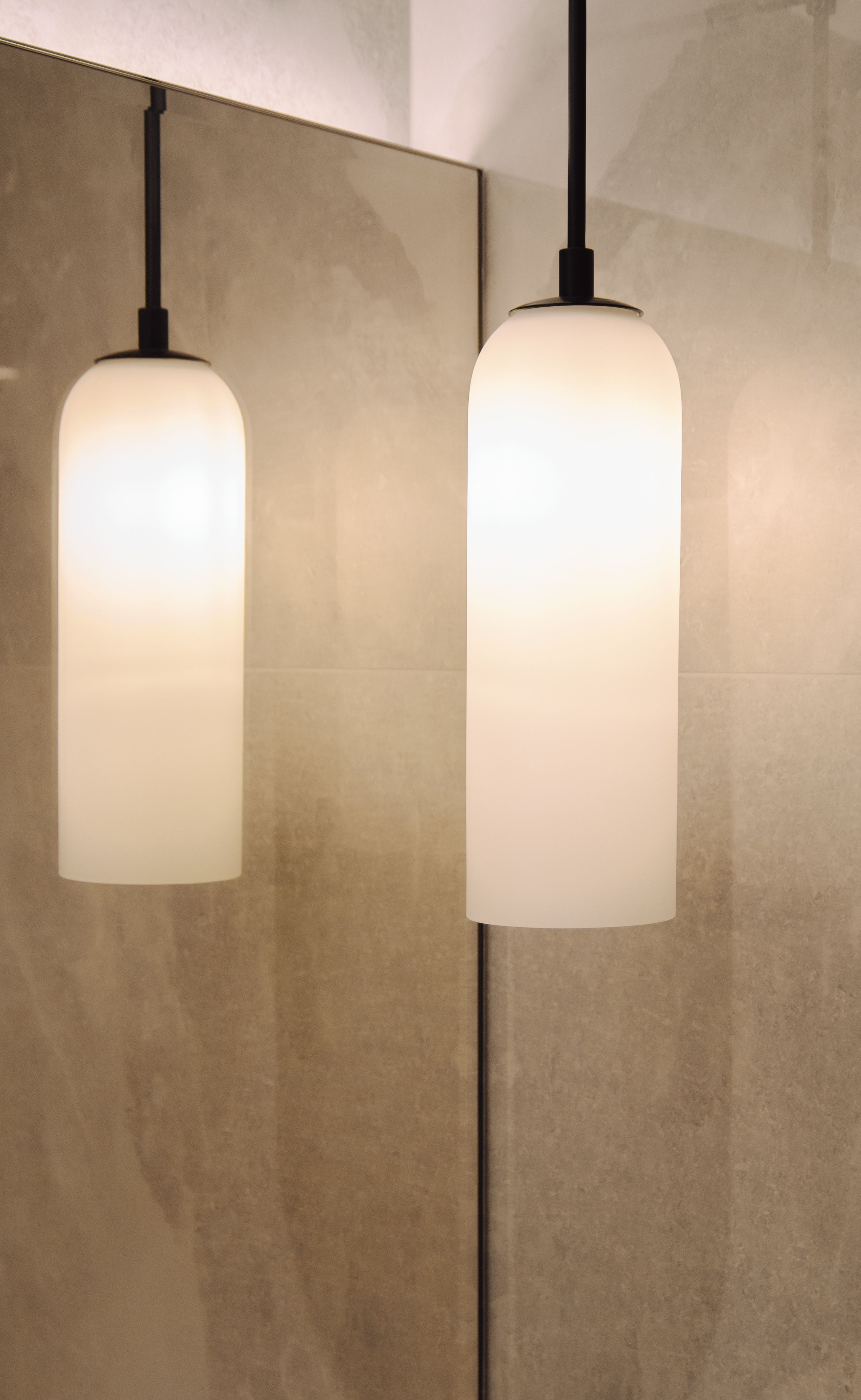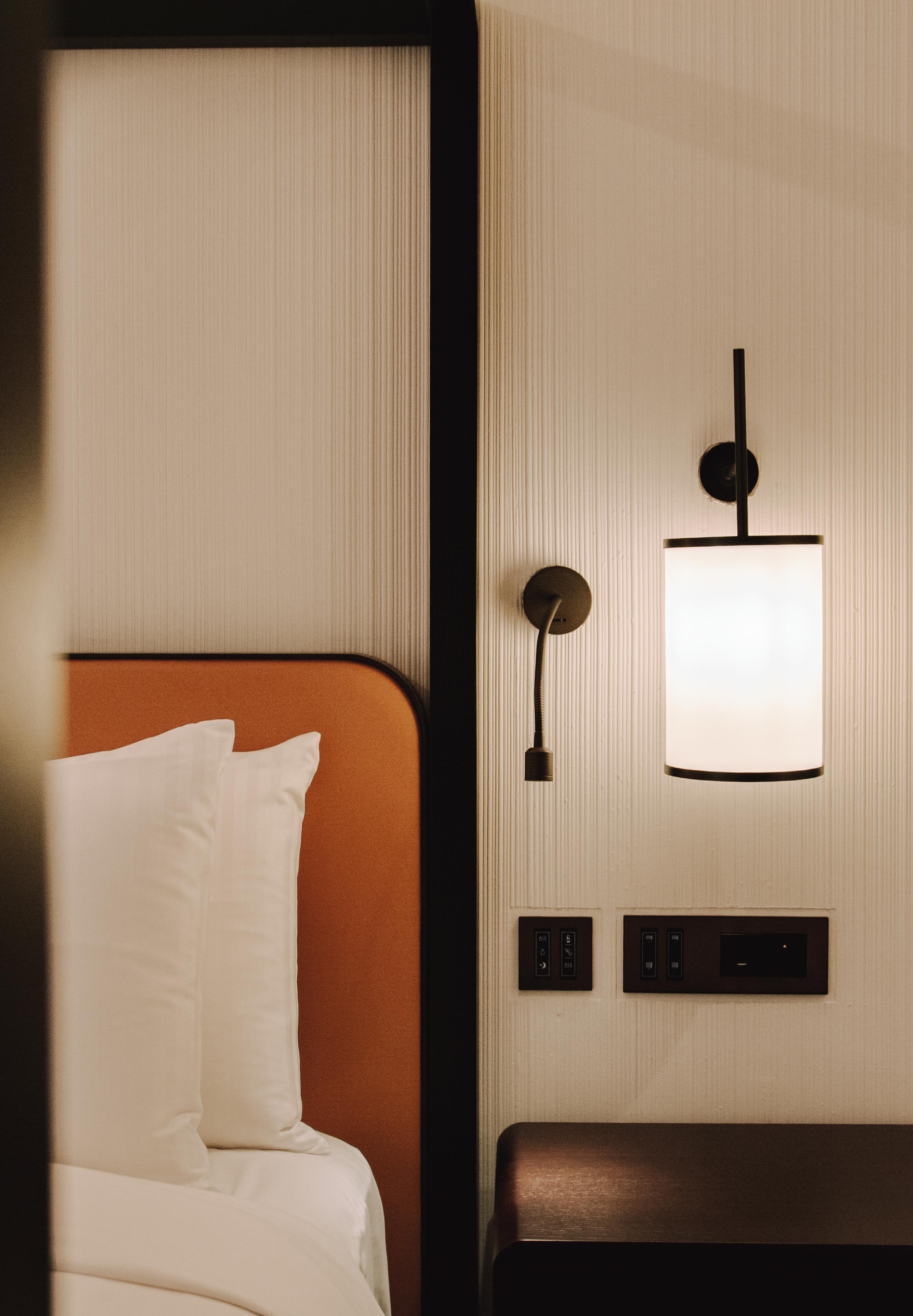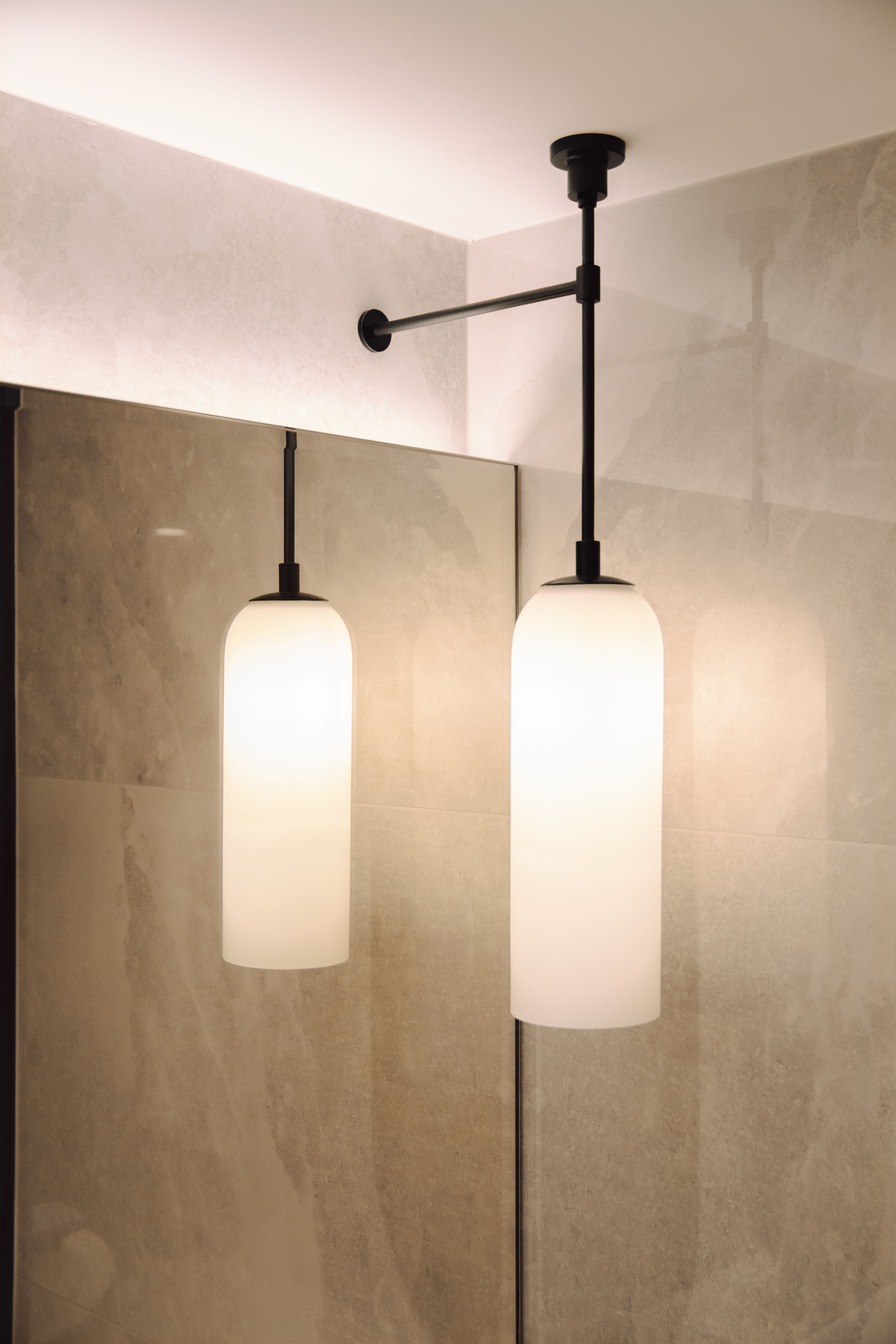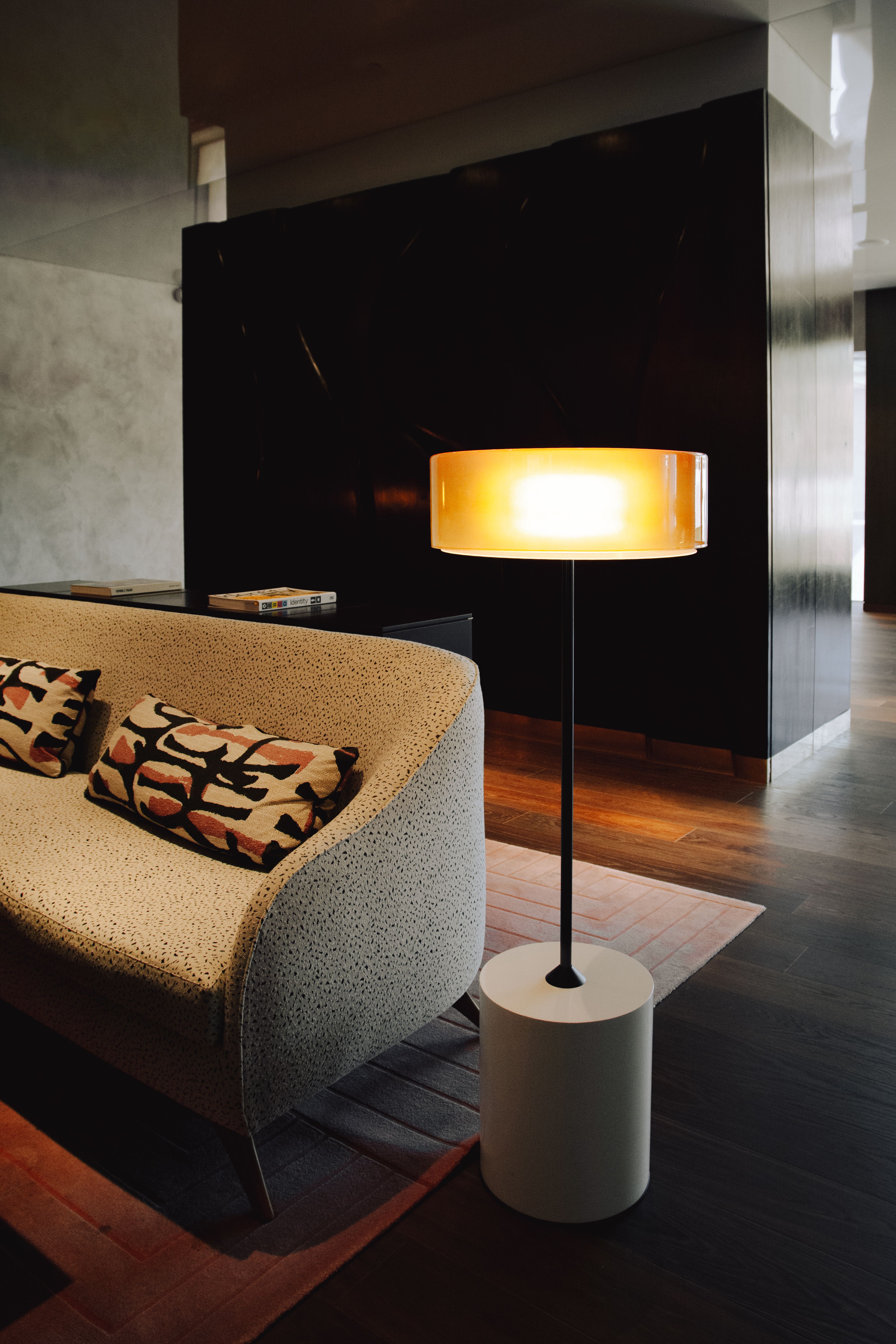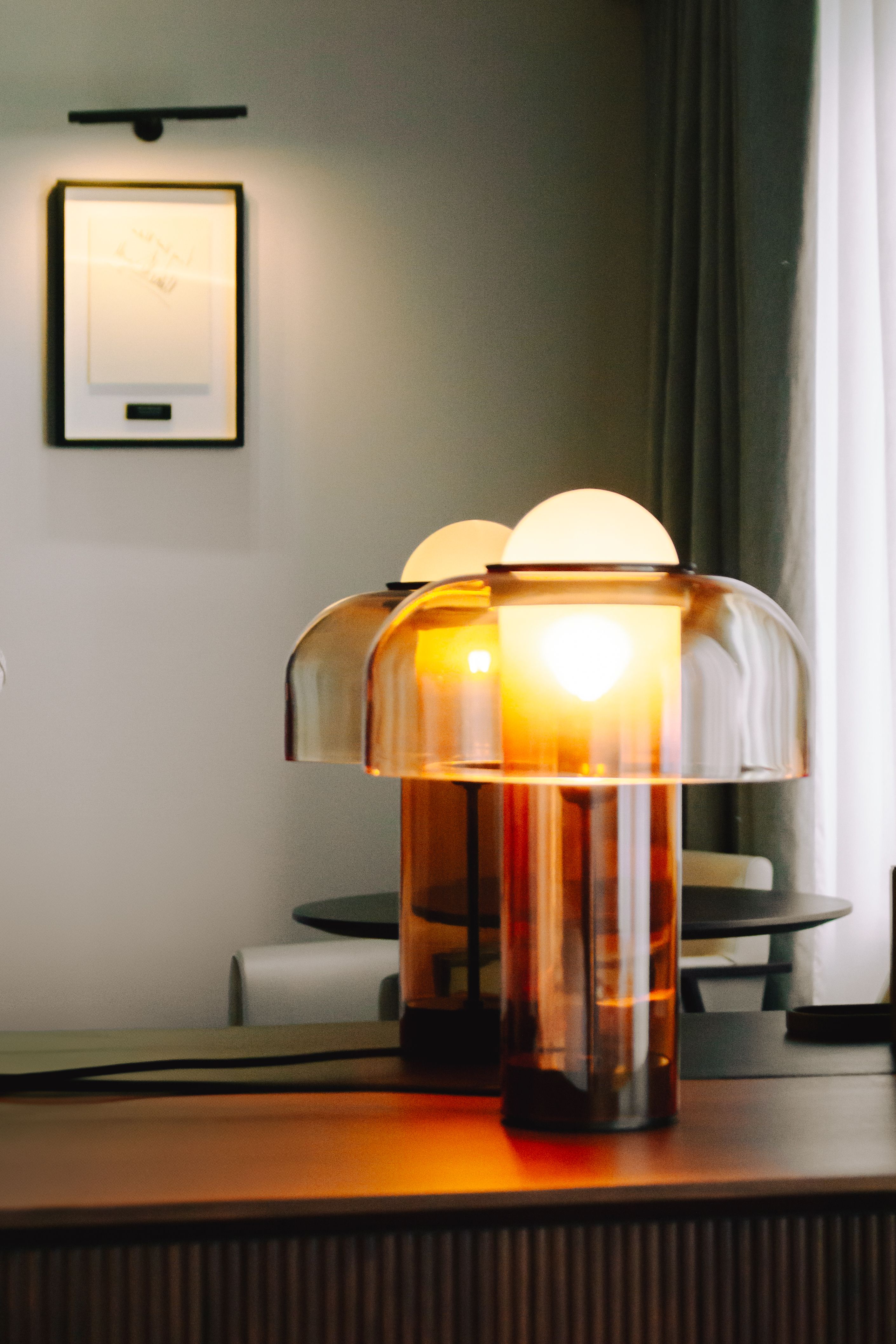 This visual language extends into the Lobby, where matching table lamps echo the same materials and proportions. Together, they establish a cohesive lighting story that connects spaces with quiet elegance and intention.