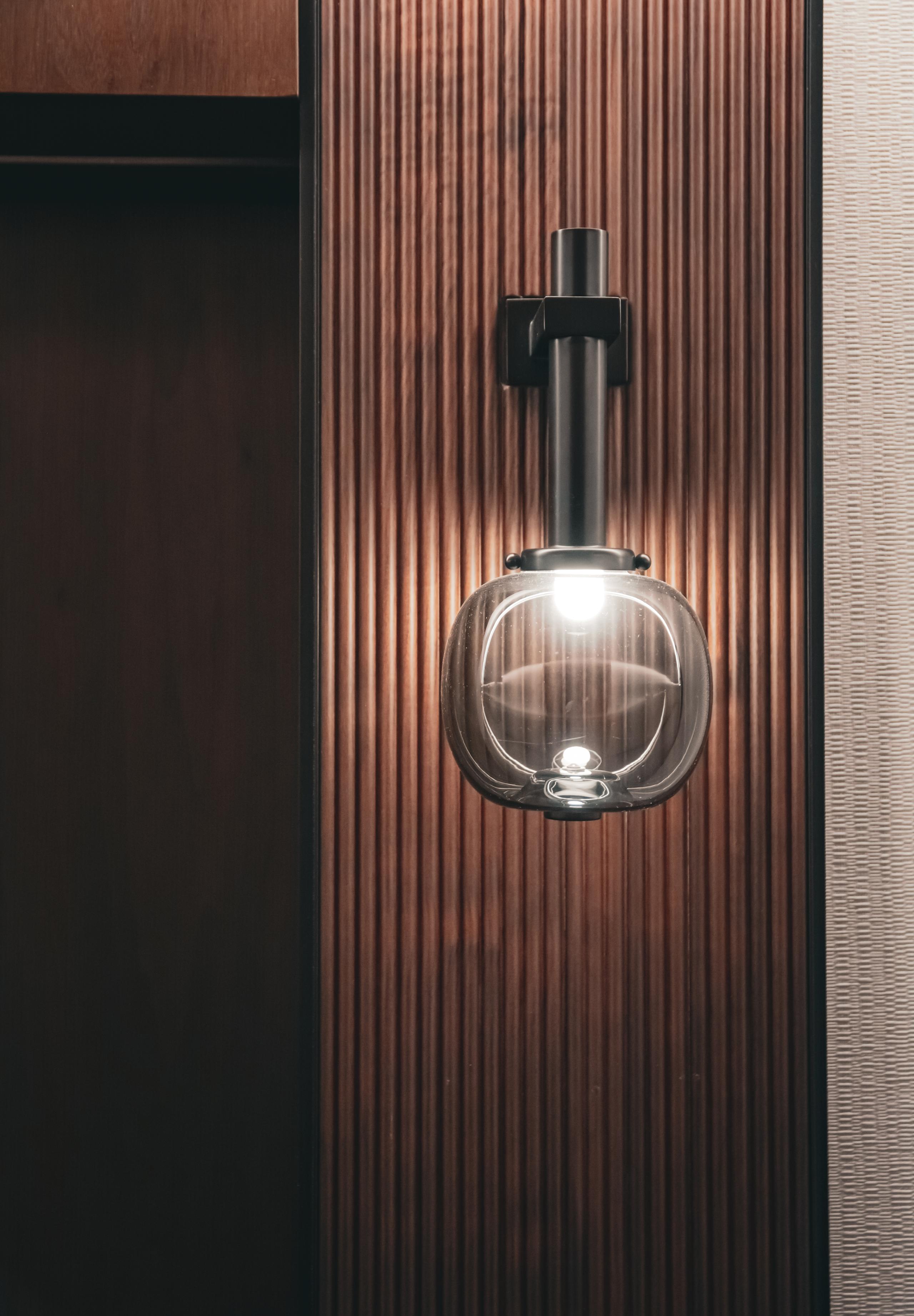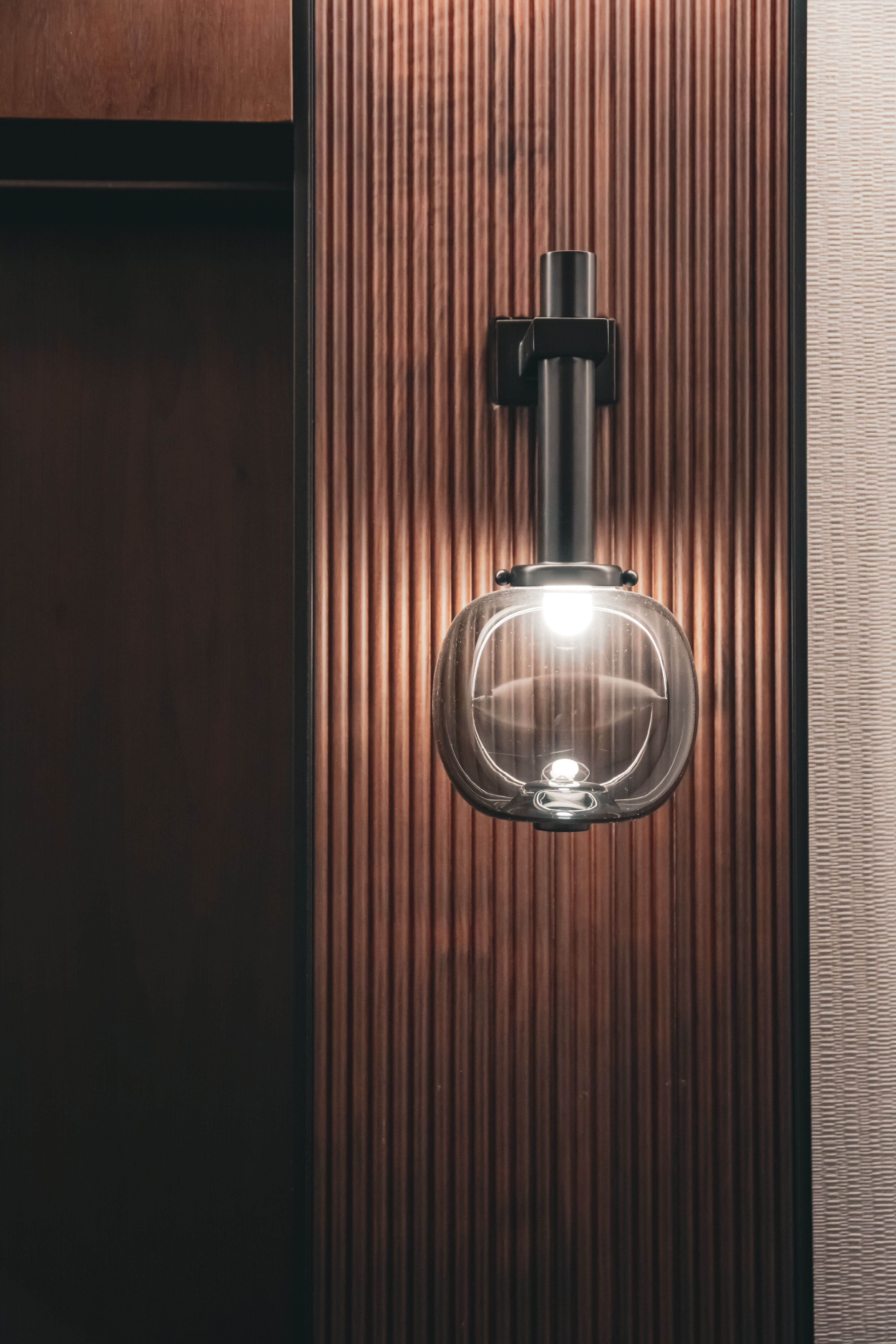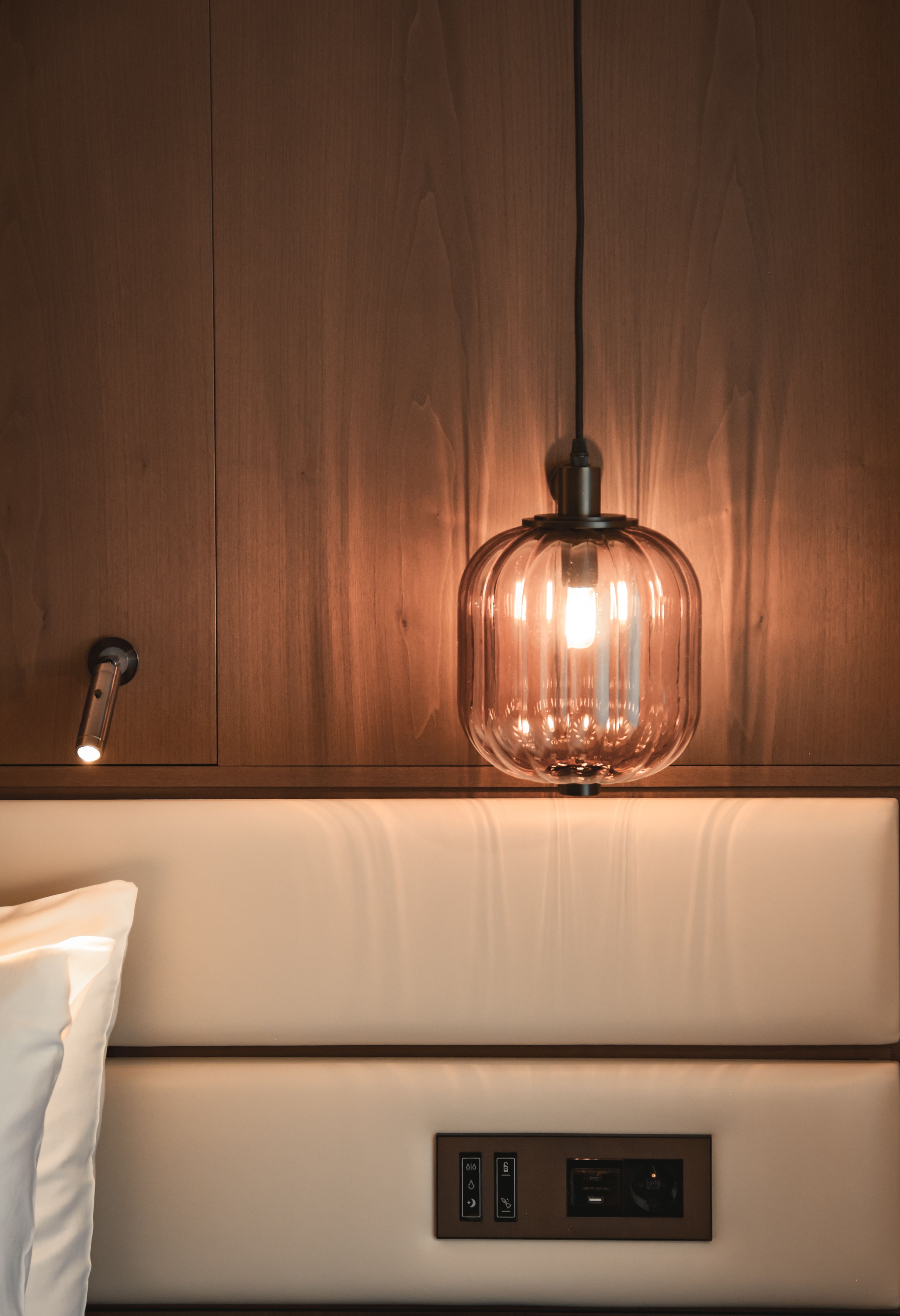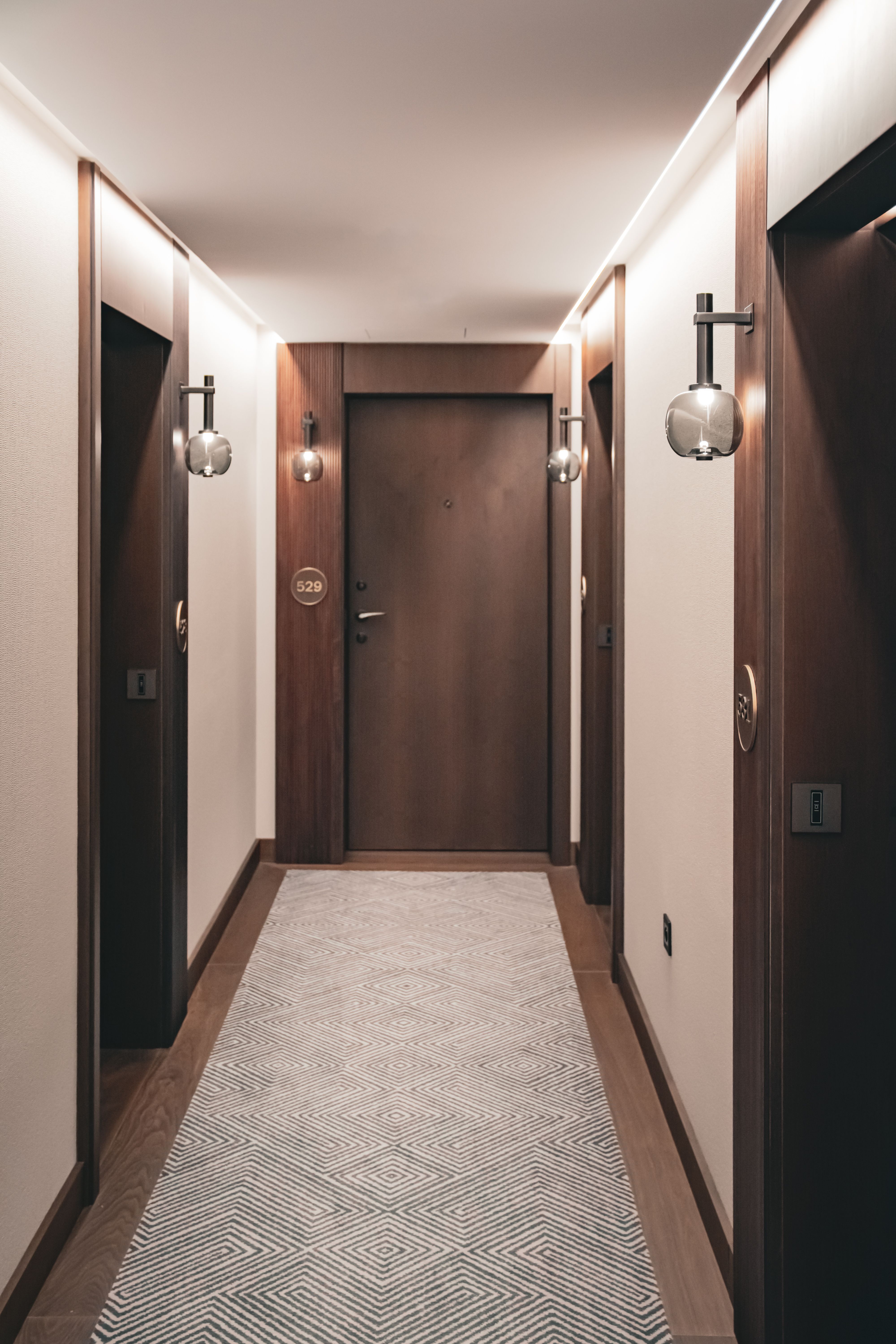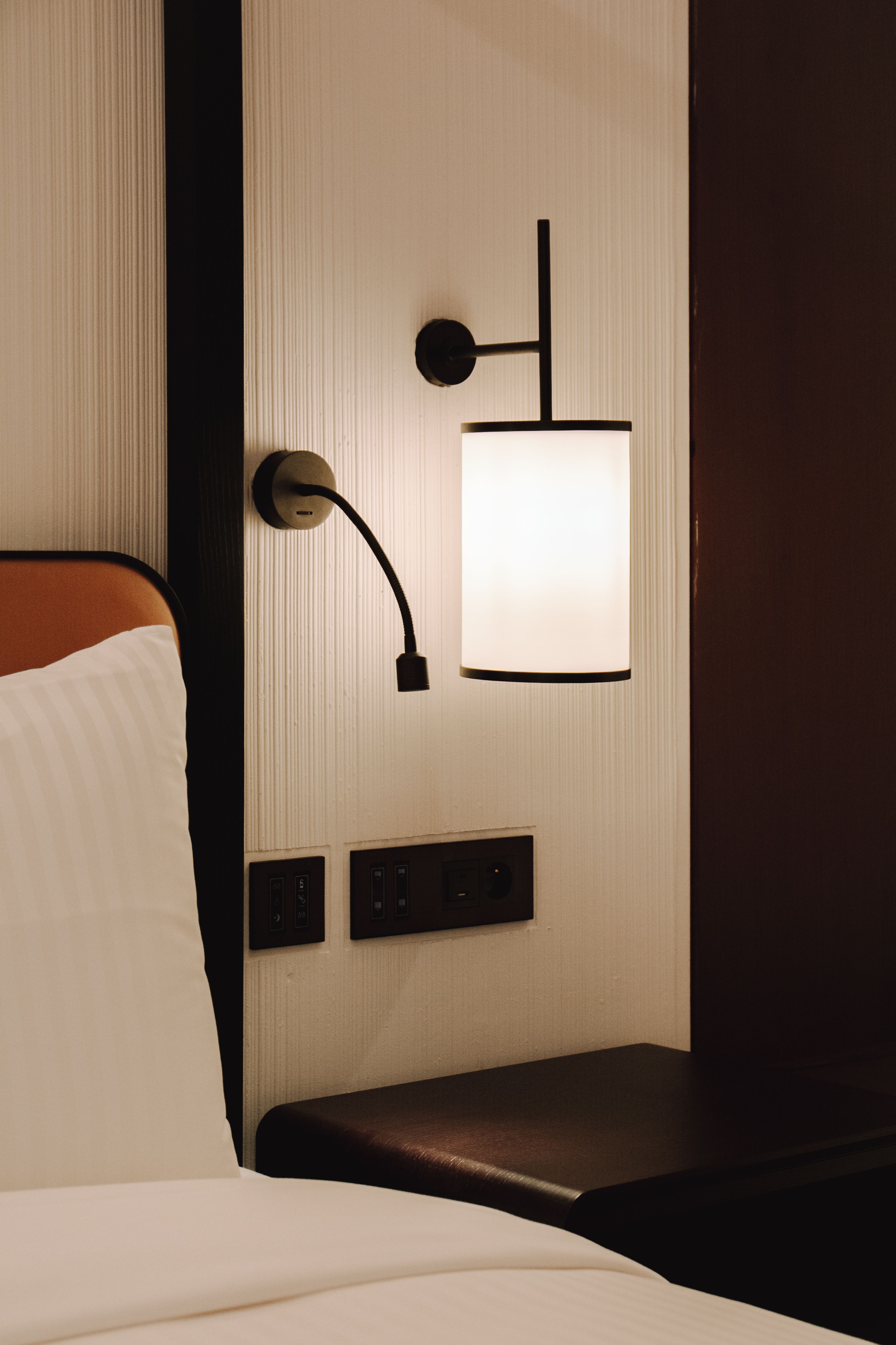 In the suites, wall sconces feature warm-tinted glass with a ripple effect, casting light that soothes and softens. In contrast, the corridors are lined with black-tinted glass sconces and robust metal elements – bolder, more architectural forms that echo the geometry of the building while guiding guests with purpose.