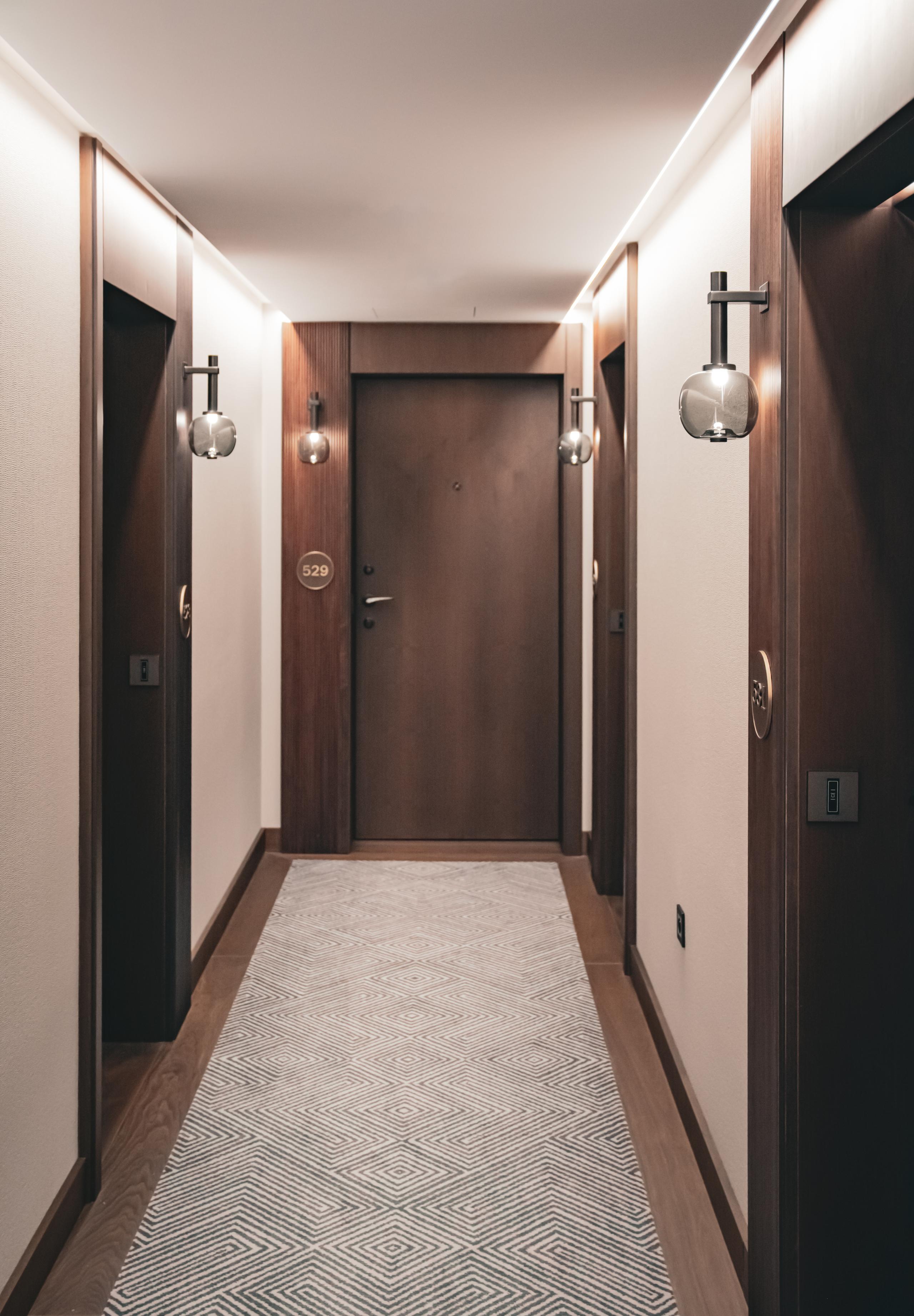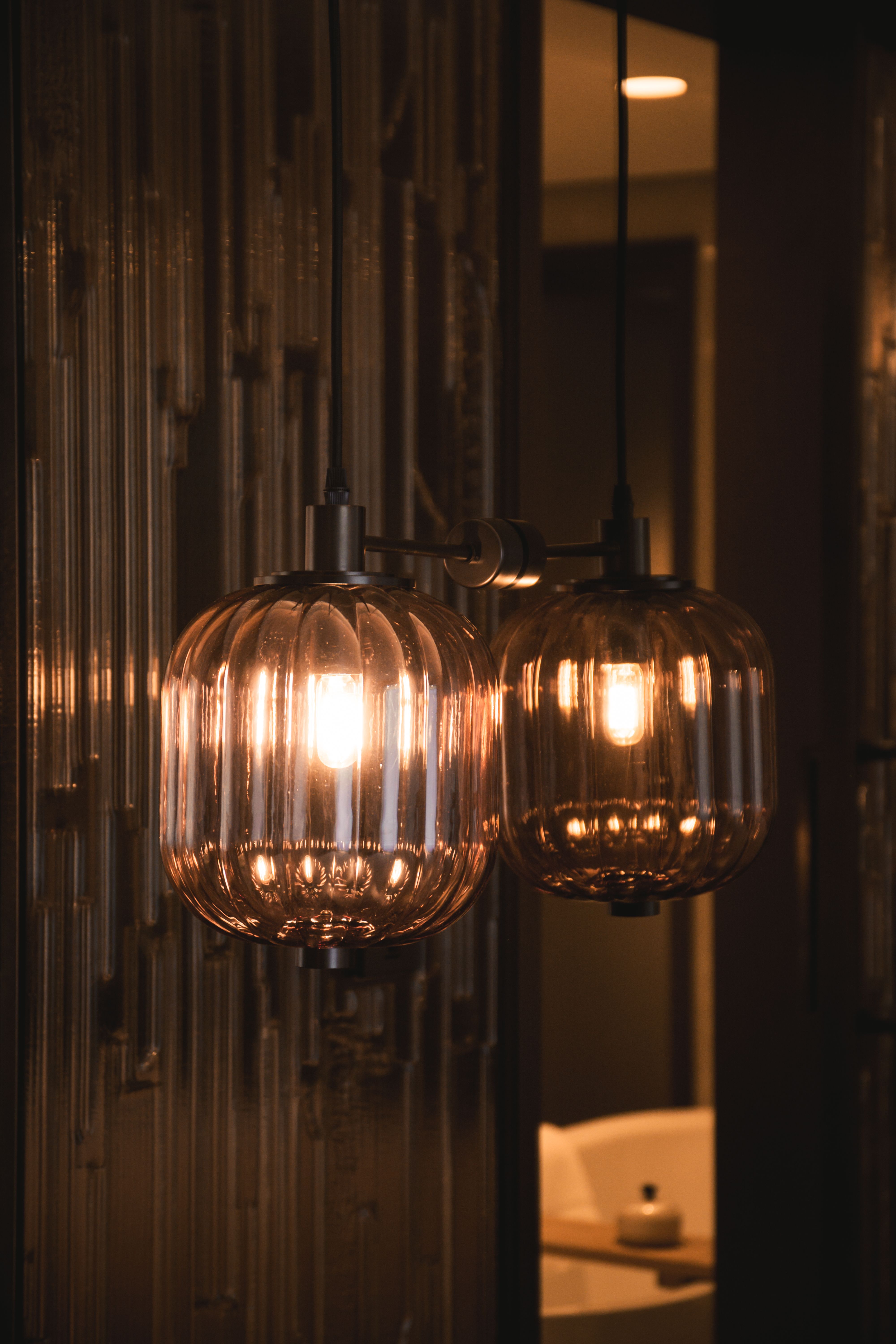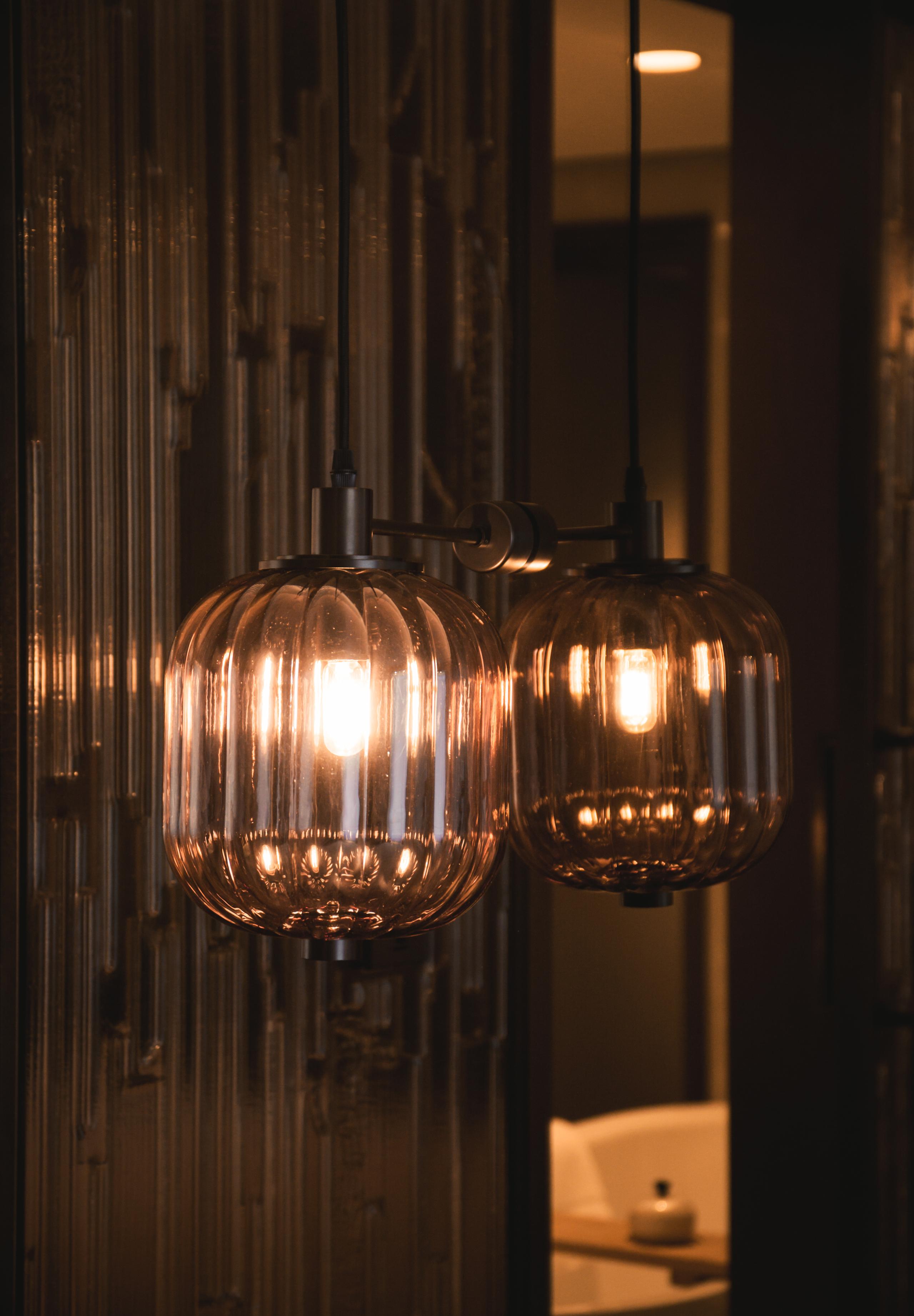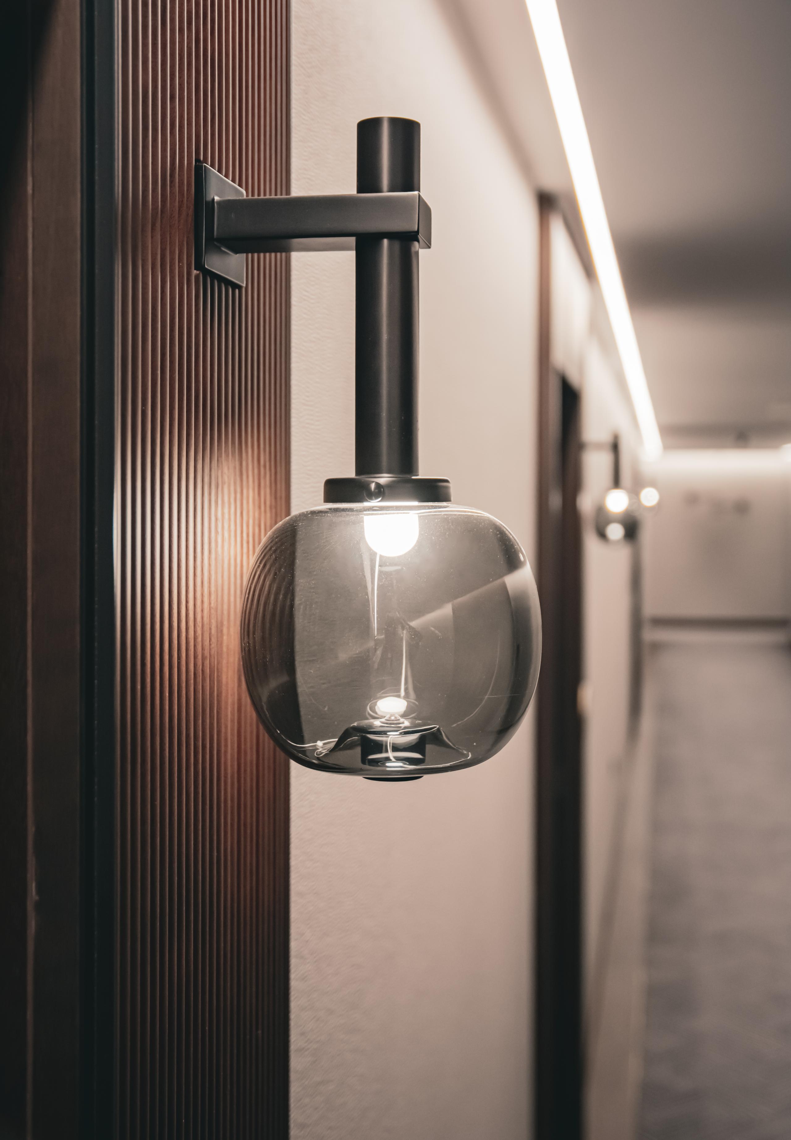 In the suites, wall sconces feature warm-tinted glass with a ripple effect, casting light that soothes and softens. In contrast, the corridors are lined with black-tinted glass sconces and robust metal elements – bolder, more architectural forms that echo the geometry of the building while guiding guests with purpose.