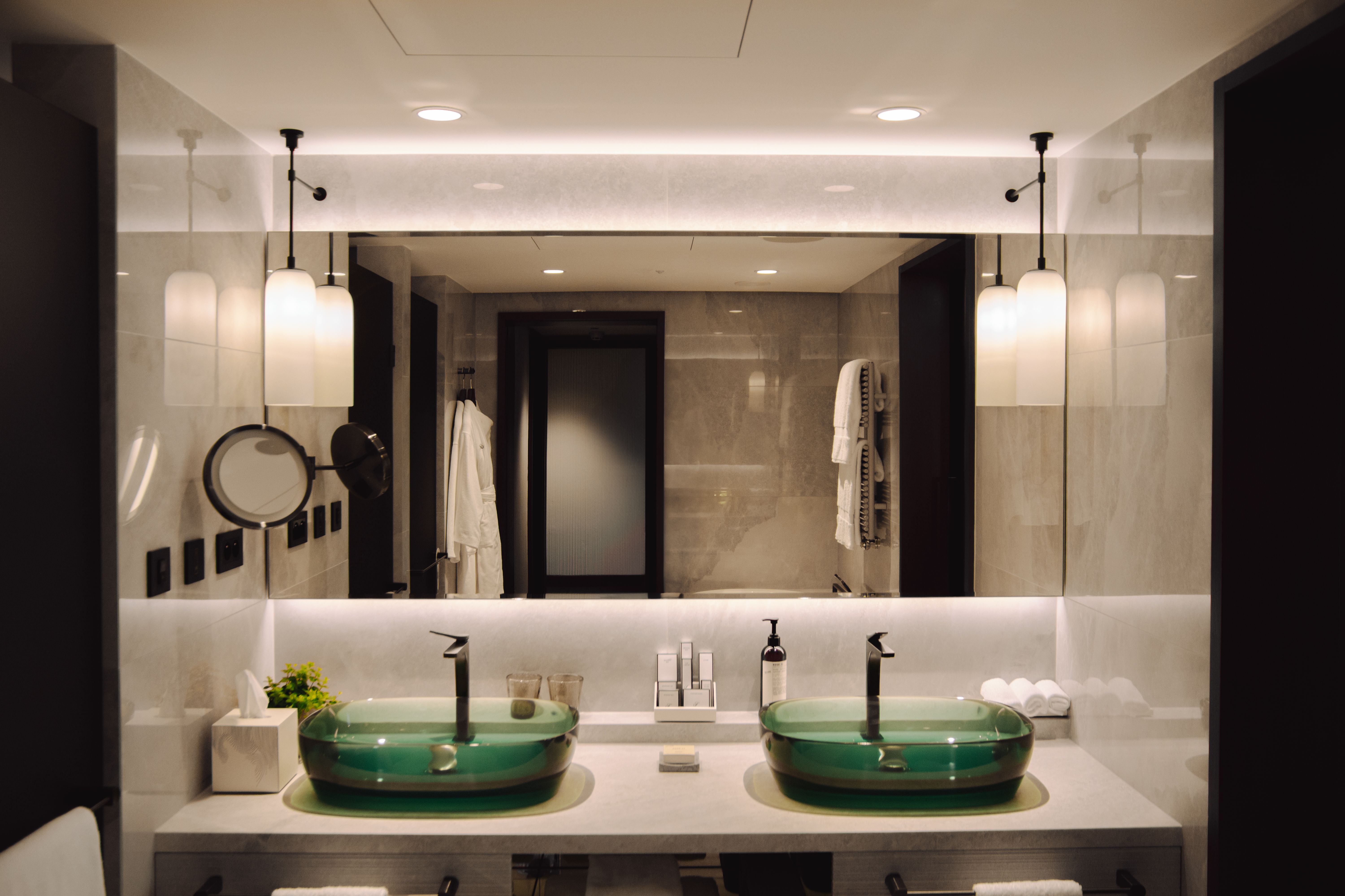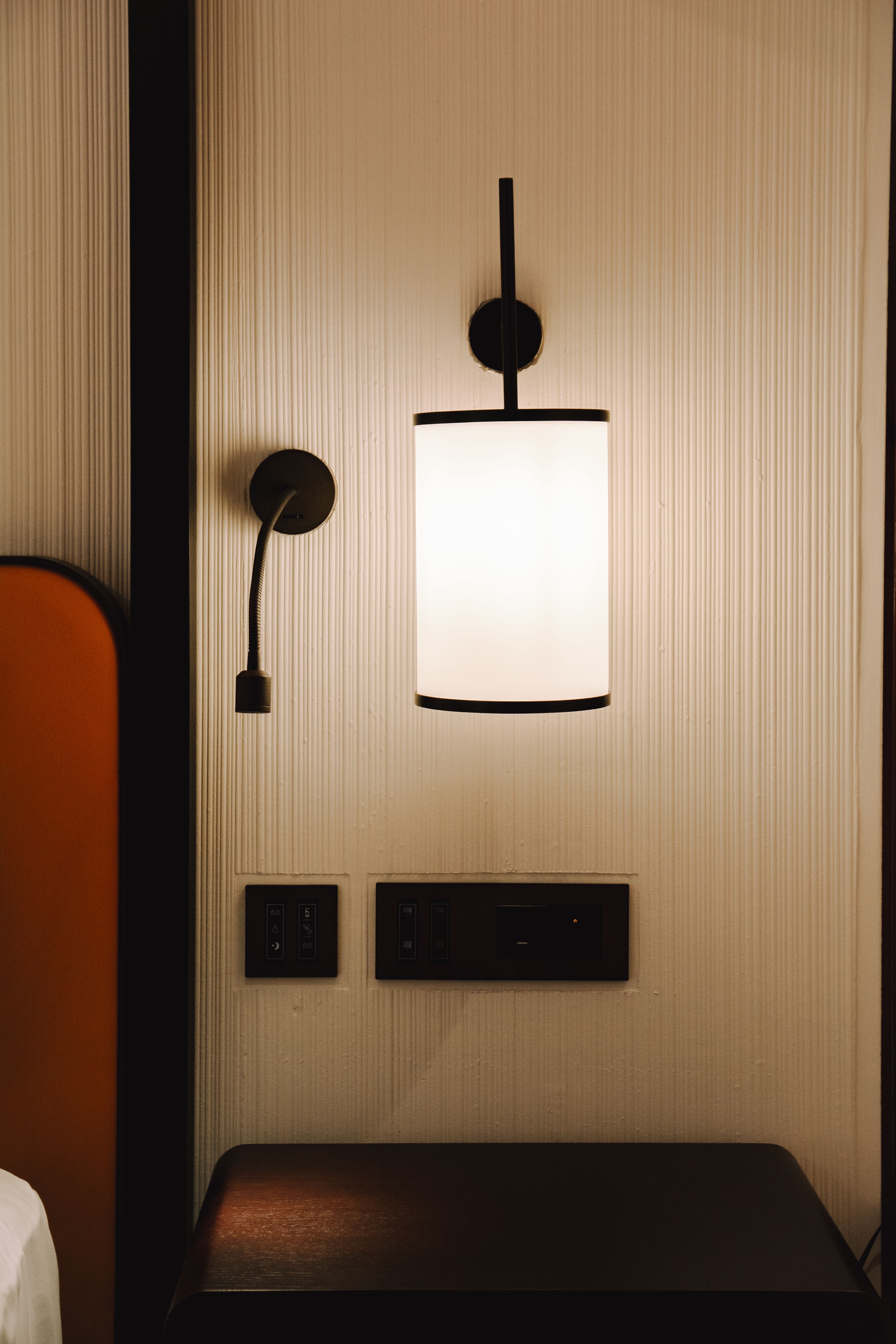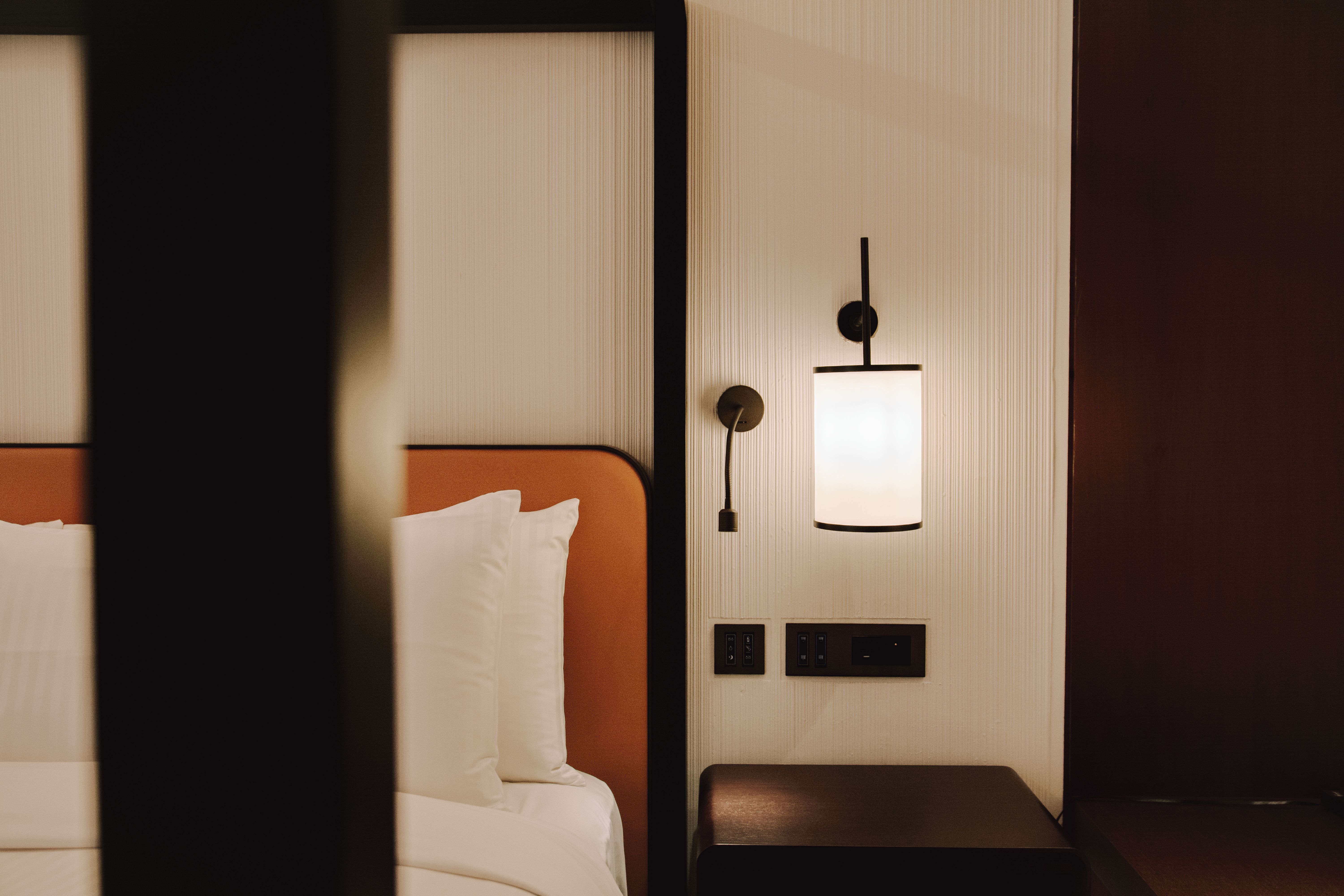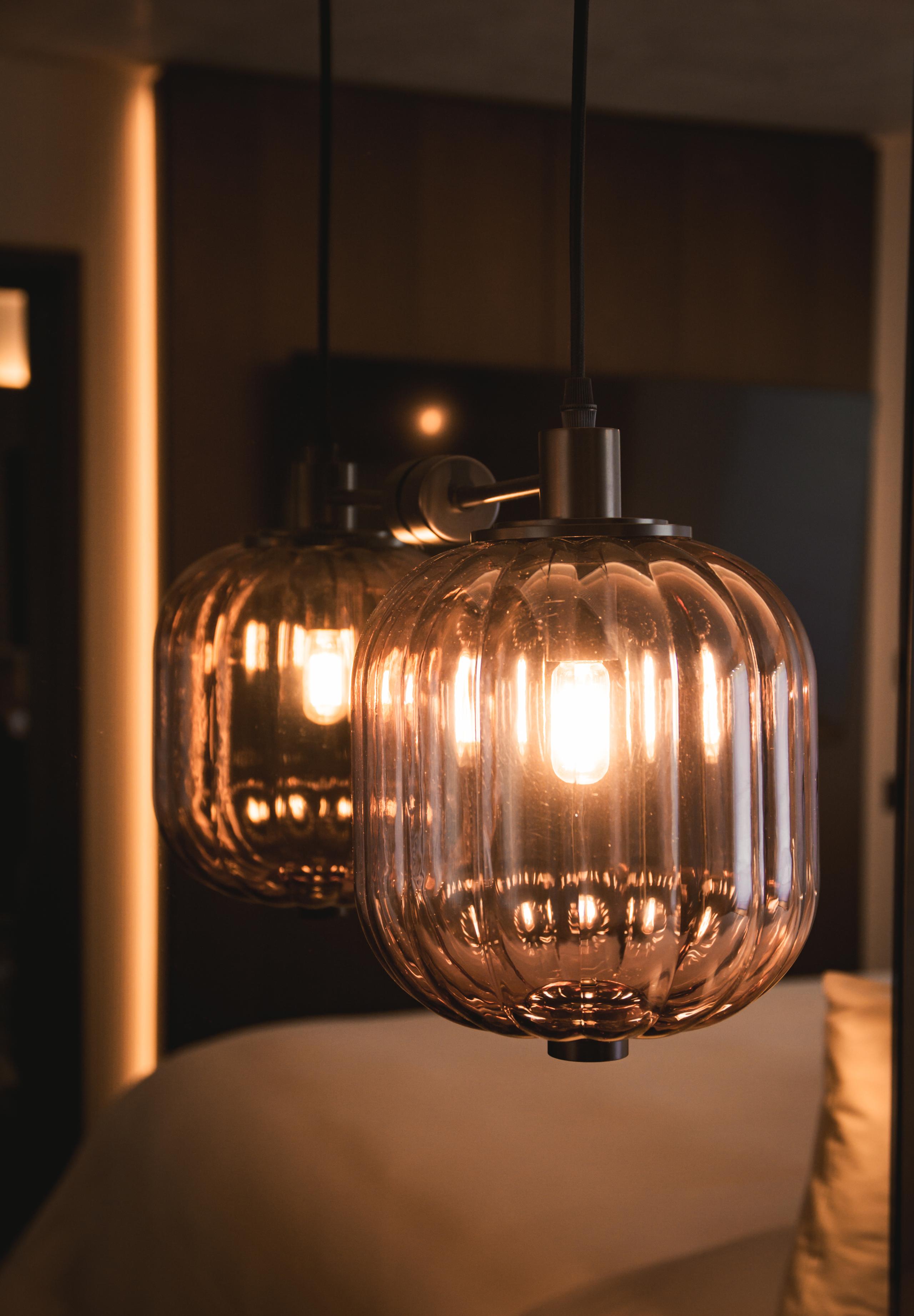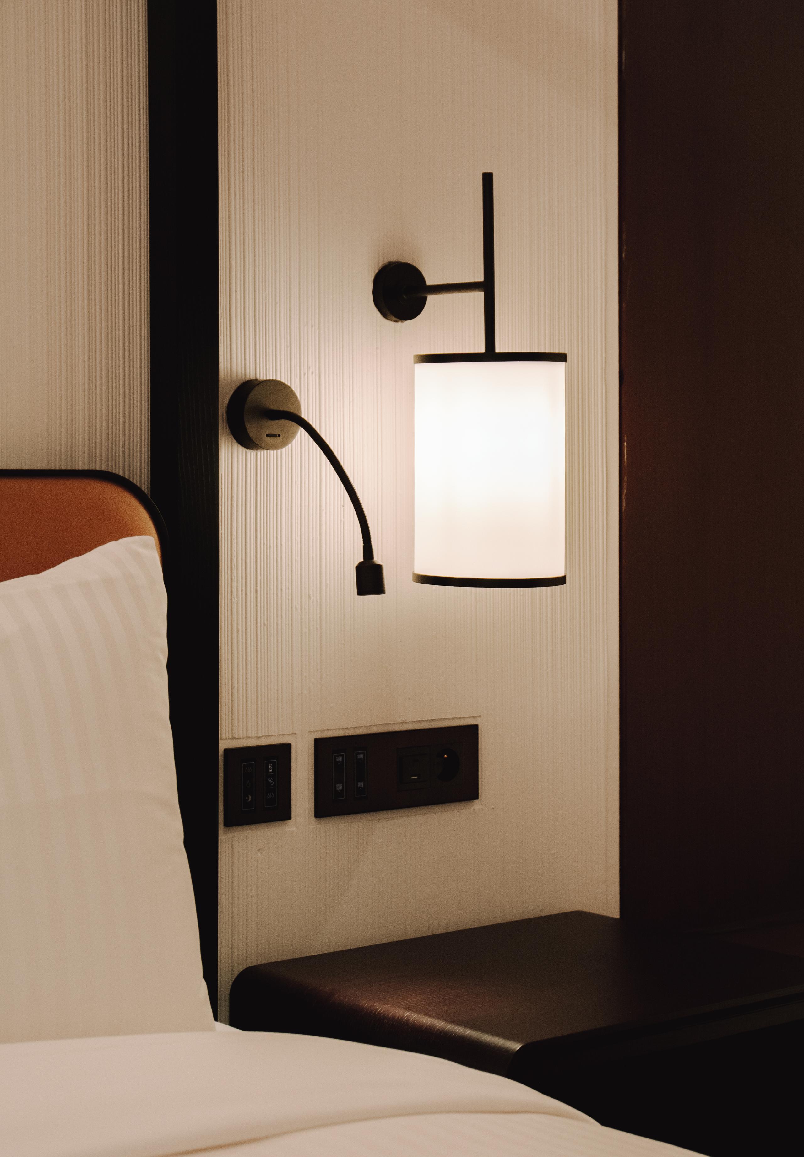 In the suites, wall sconces feature warm-tinted glass with a ripple effect, casting light that soothes and softens. In contrast, the corridors are lined with black-tinted glass sconces and robust metal elements – bolder, more architectural forms that echo the geometry of the building while guiding guests with purpose.