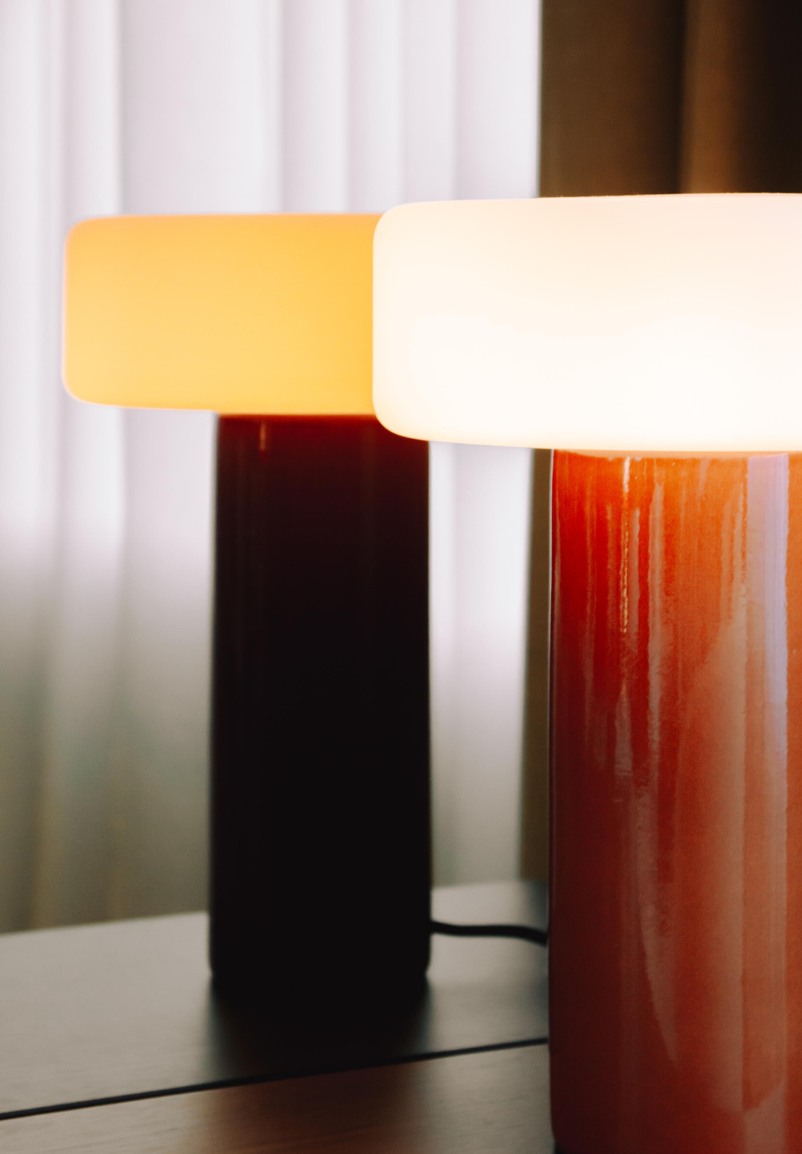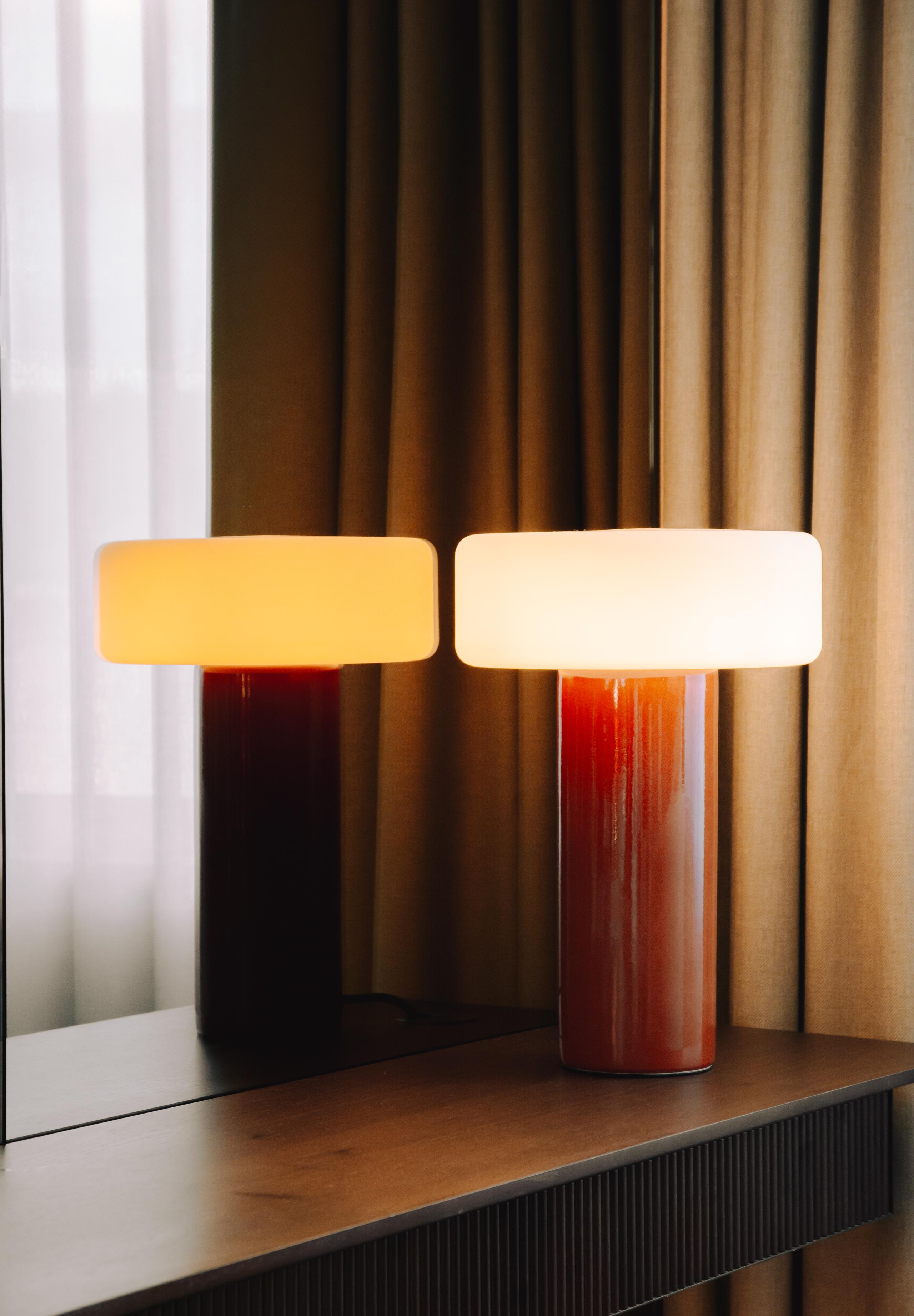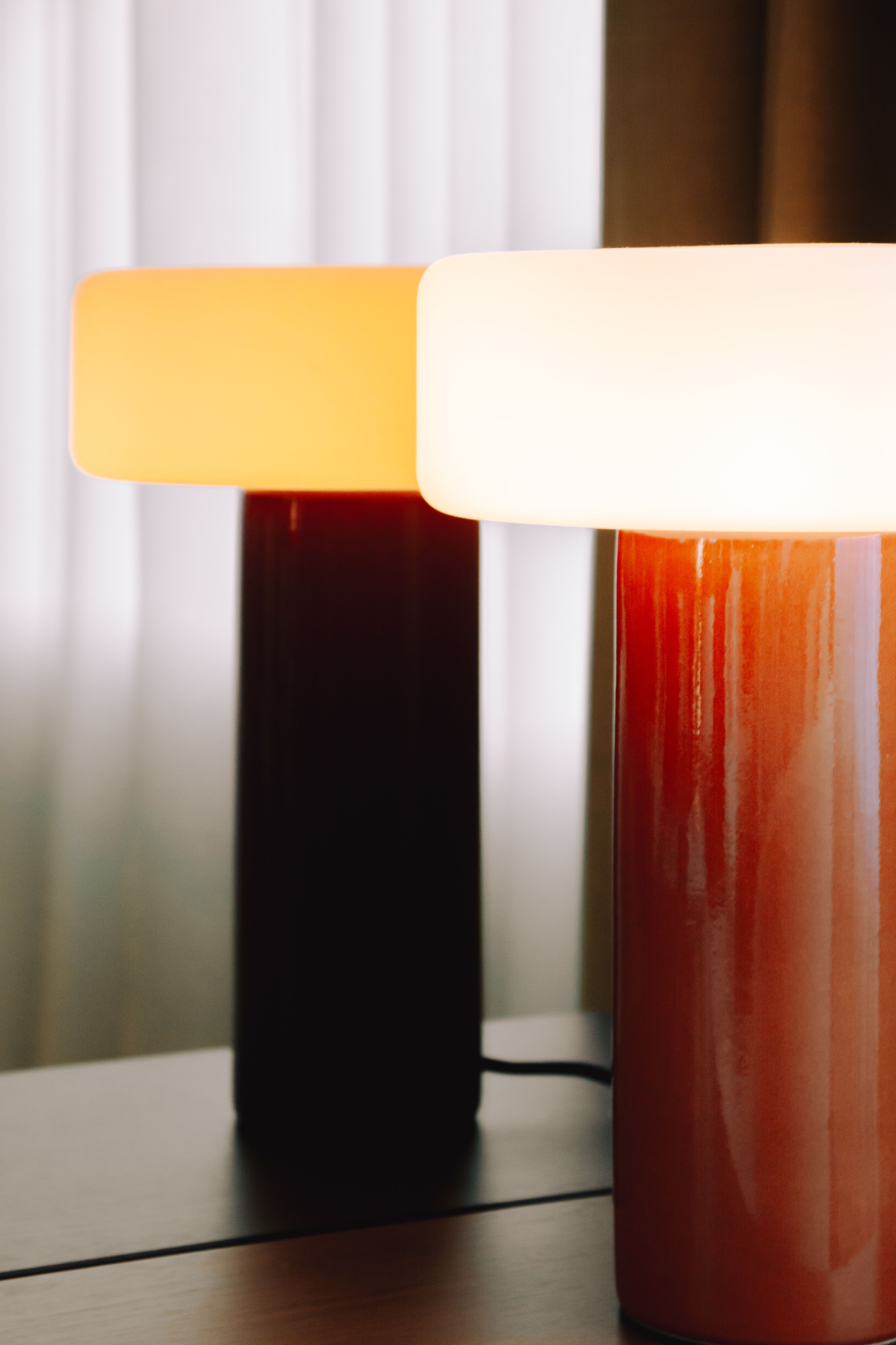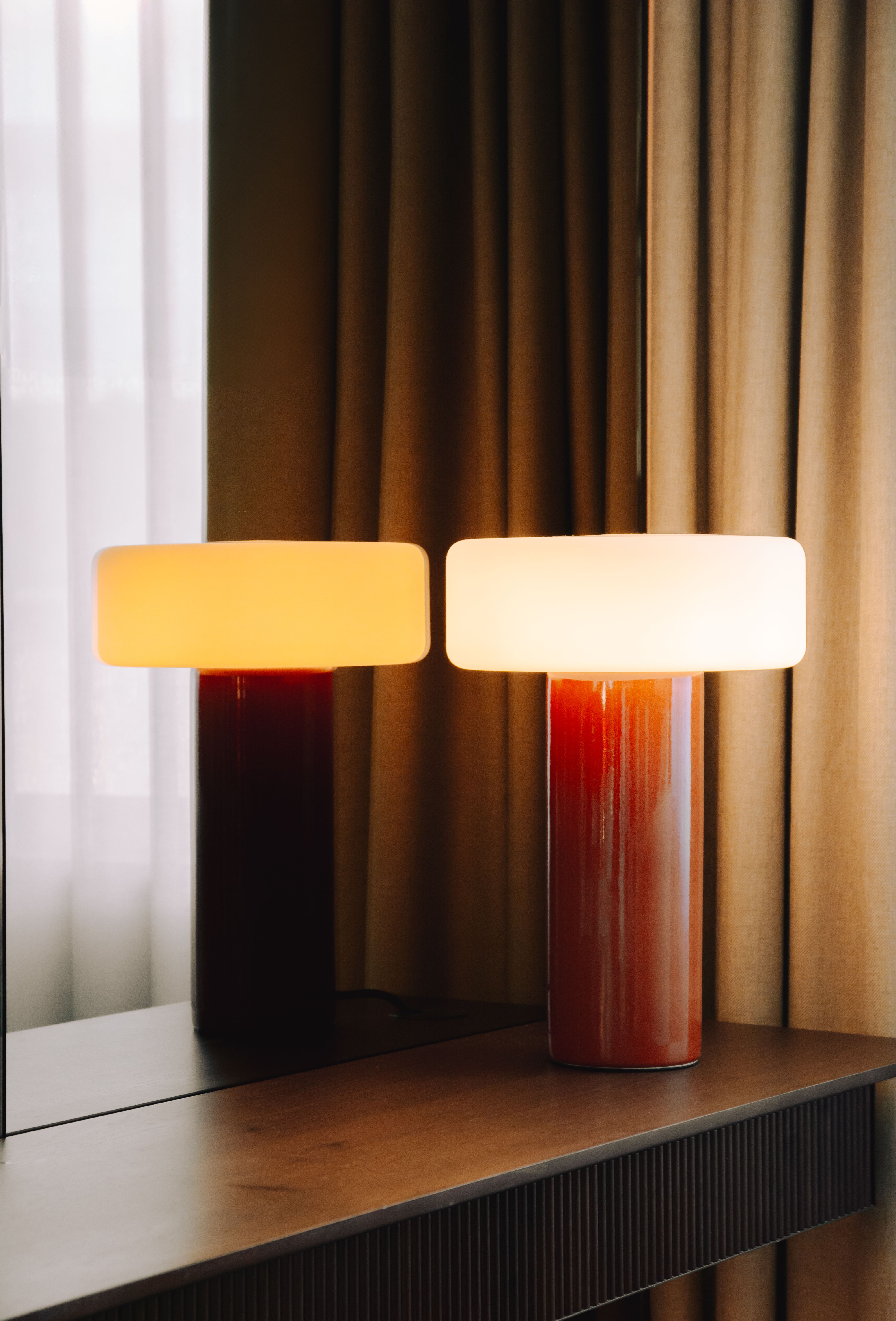 Throughout the hotel’s public and private spaces, lighting serves as a vibrant counterpoint to its sculptural Brutalist core. Each of our sleek lamps plays differently with vibrant orange, paying tribute to mid-century Czech lighting design. Their warm hues cast a soft glow that contrasts beautifully with the sharp, sculptural lines of the hotel’s architecture.