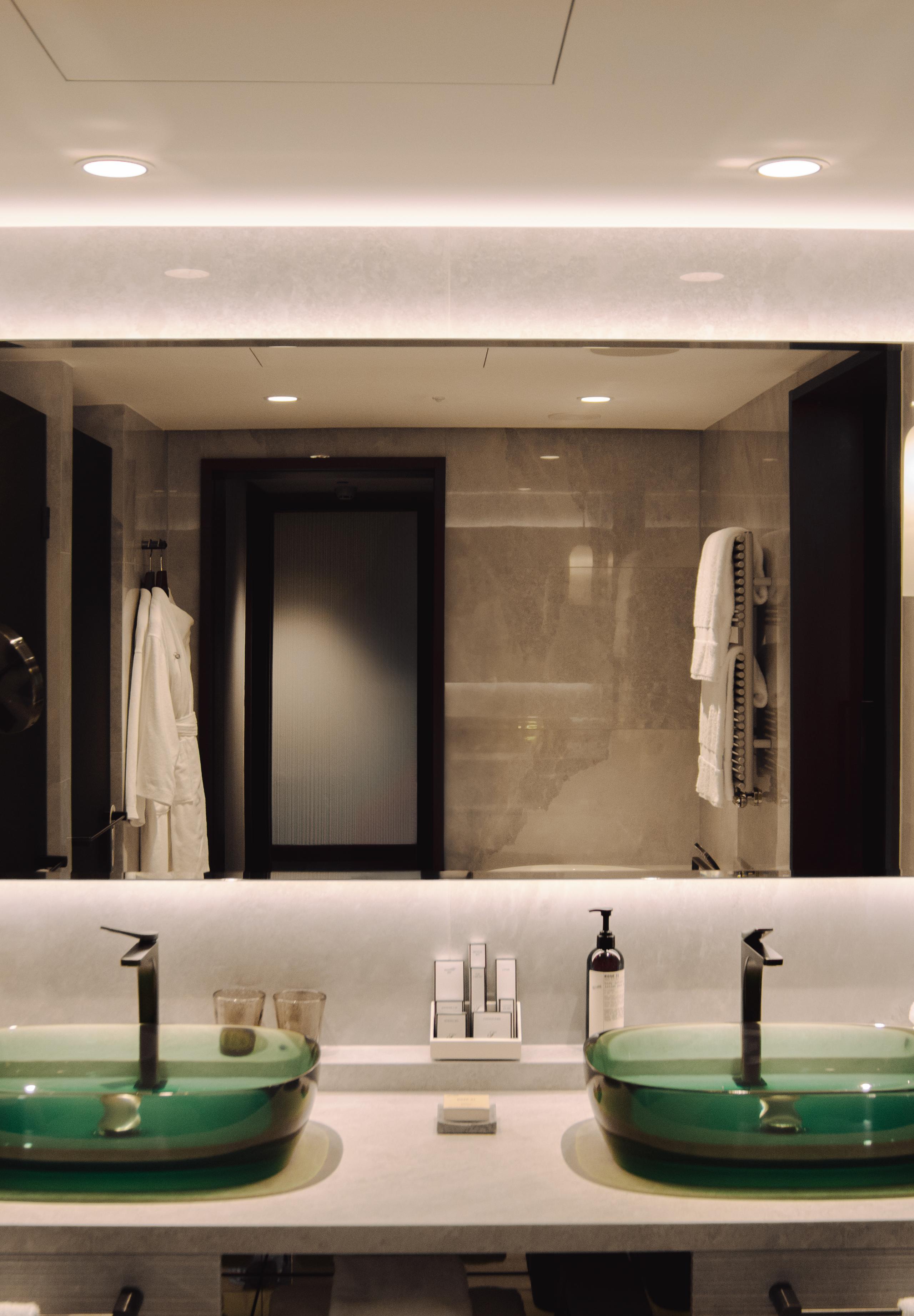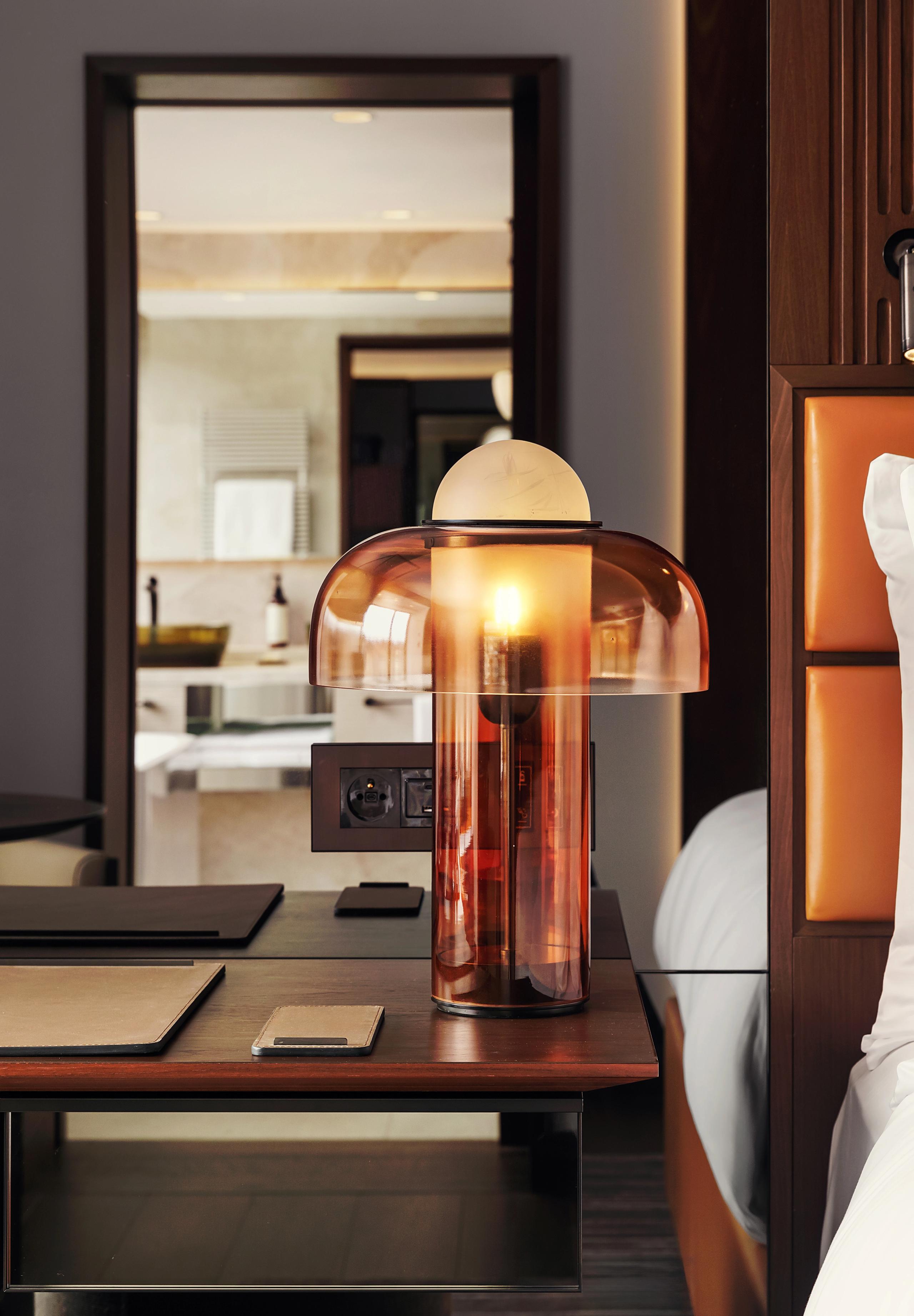 For the Presidential Apartment, we designed custom wall sconces for both bedroom and bathroom areas. Crafted from sandblasted crystal glass and black metal accents, the sconces lend the space a quiet elegance. Their gentle, ambient light enhances the refined materials and modern aesthetic, creating a calm, elevated atmosphere for the most prestigious guests.
