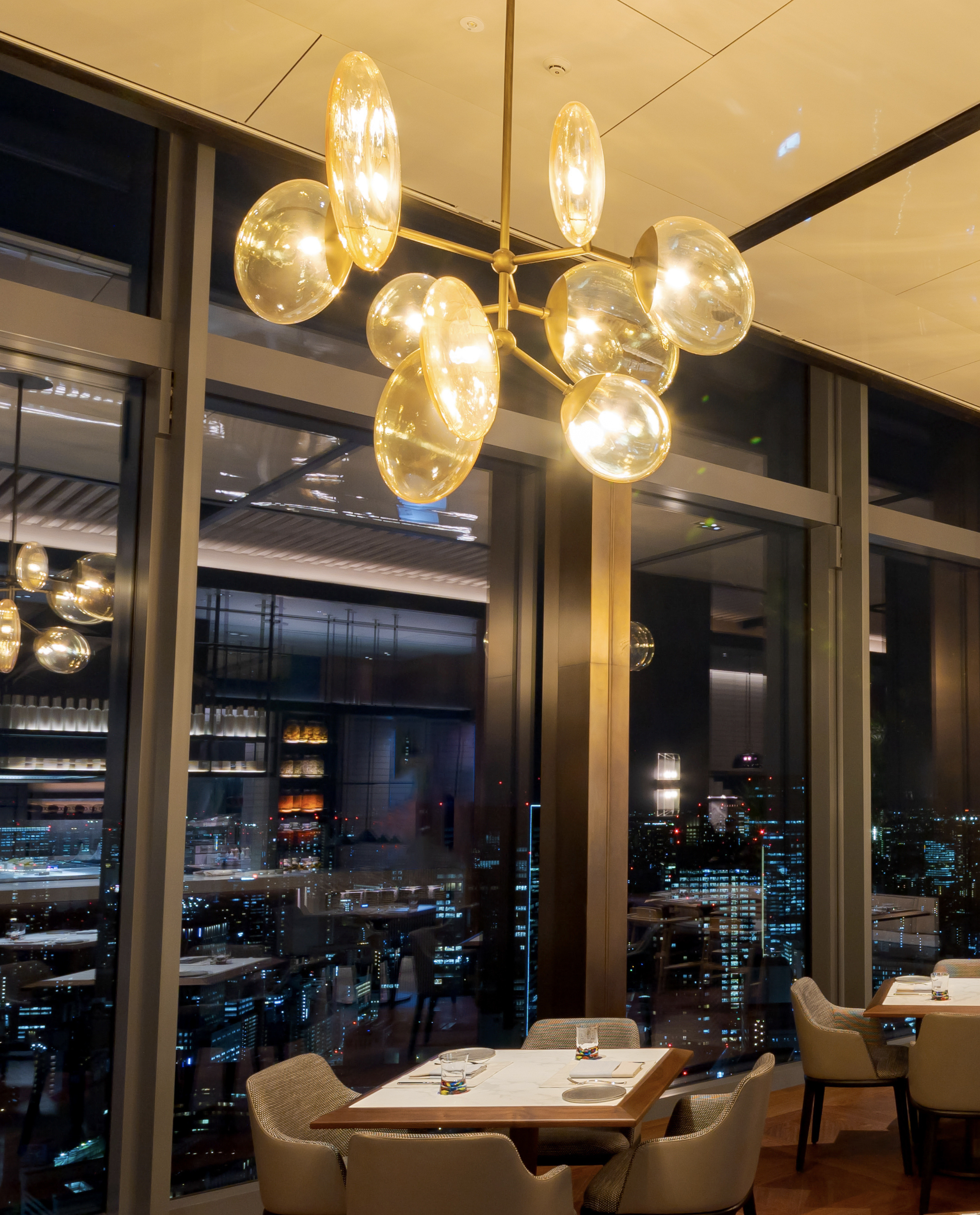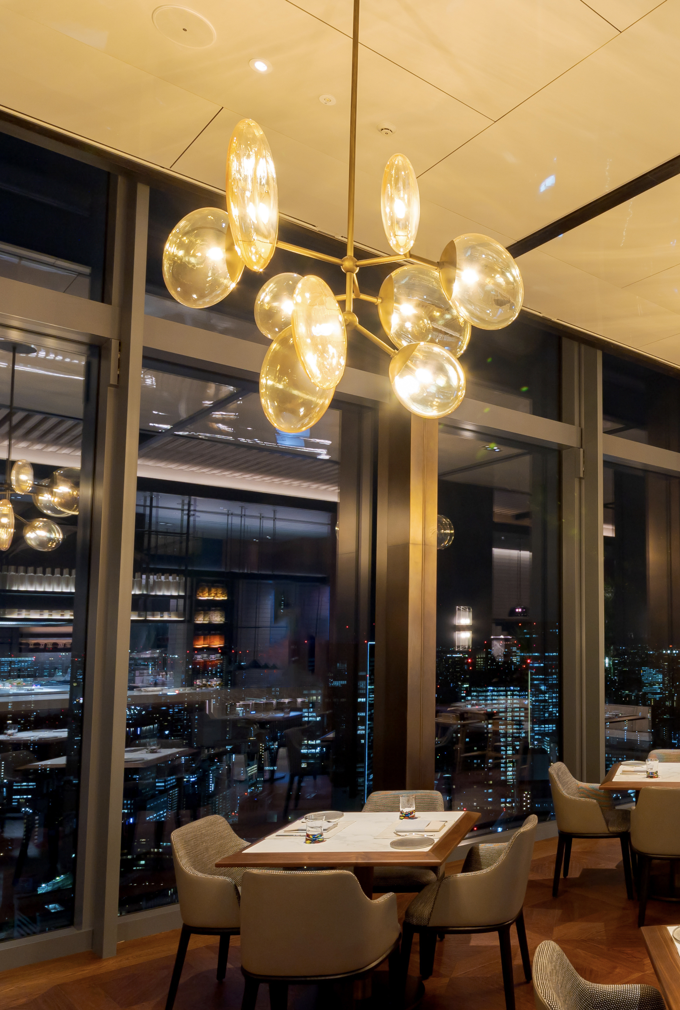 On the 35th floor, within the Kiln & Tonic restaurant, our bespoke chandeliers composed of handblown light amber glass and refined metal elements create a warm, soft ambience that enhances the inviting atmosphere of this Mediterranean brasserie.
