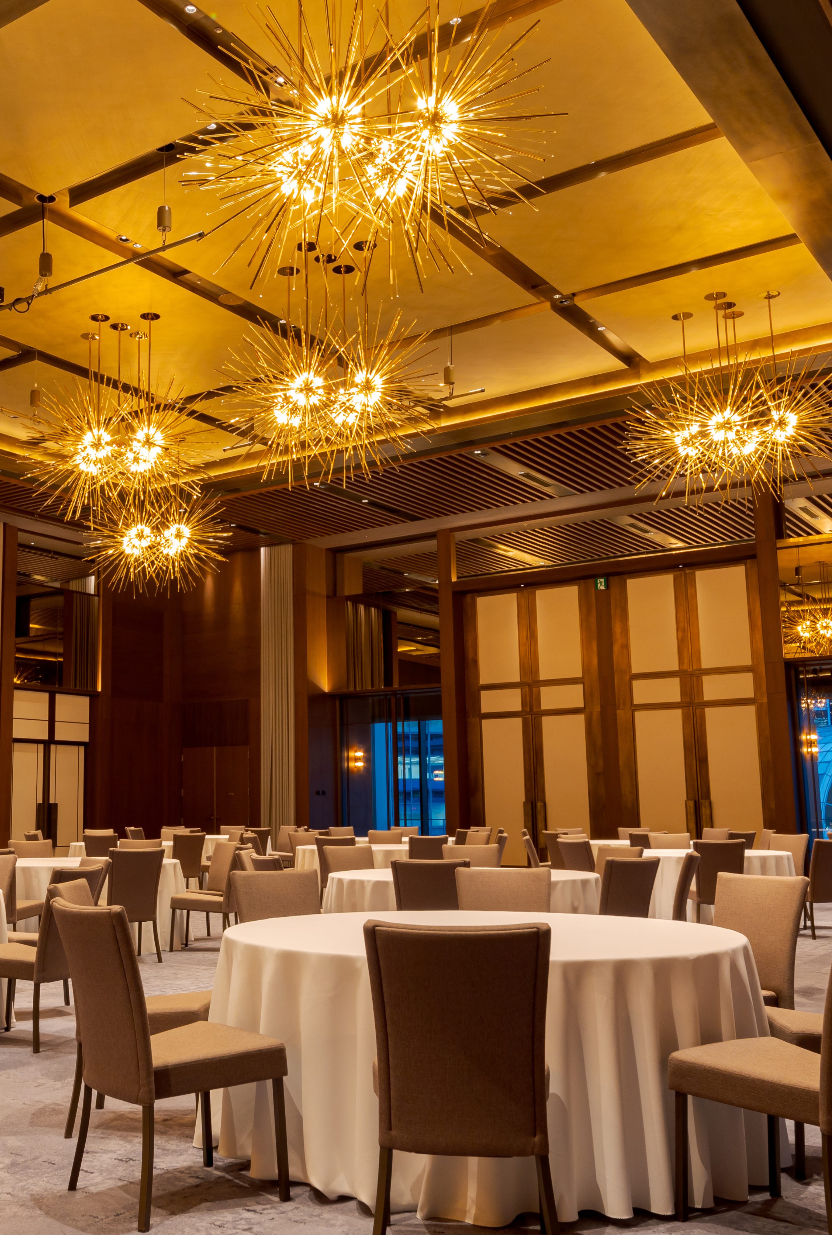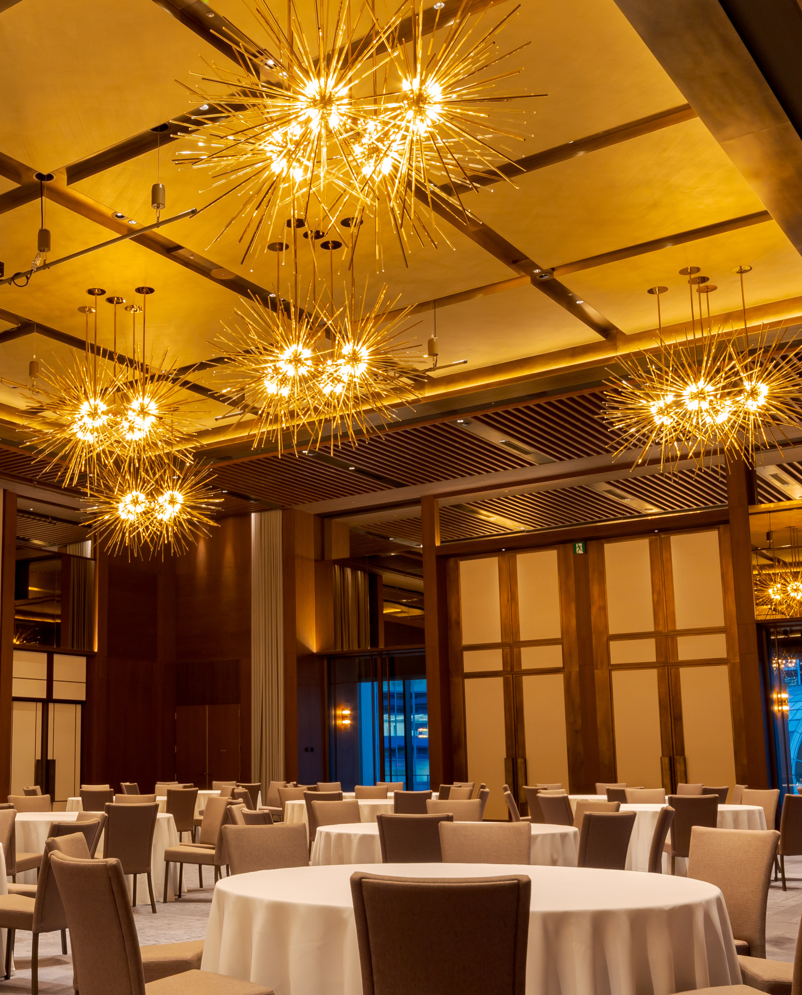 In the Grand Ballroom, our striking pendants draw inspiration from the sea, transforming the space into a radiant seascape of light. Crafted from glass rods finished with aurum nanocoating and polished metal, these sculptural pieces shimmer like reflections on the ocean’s surface, elevating every event.