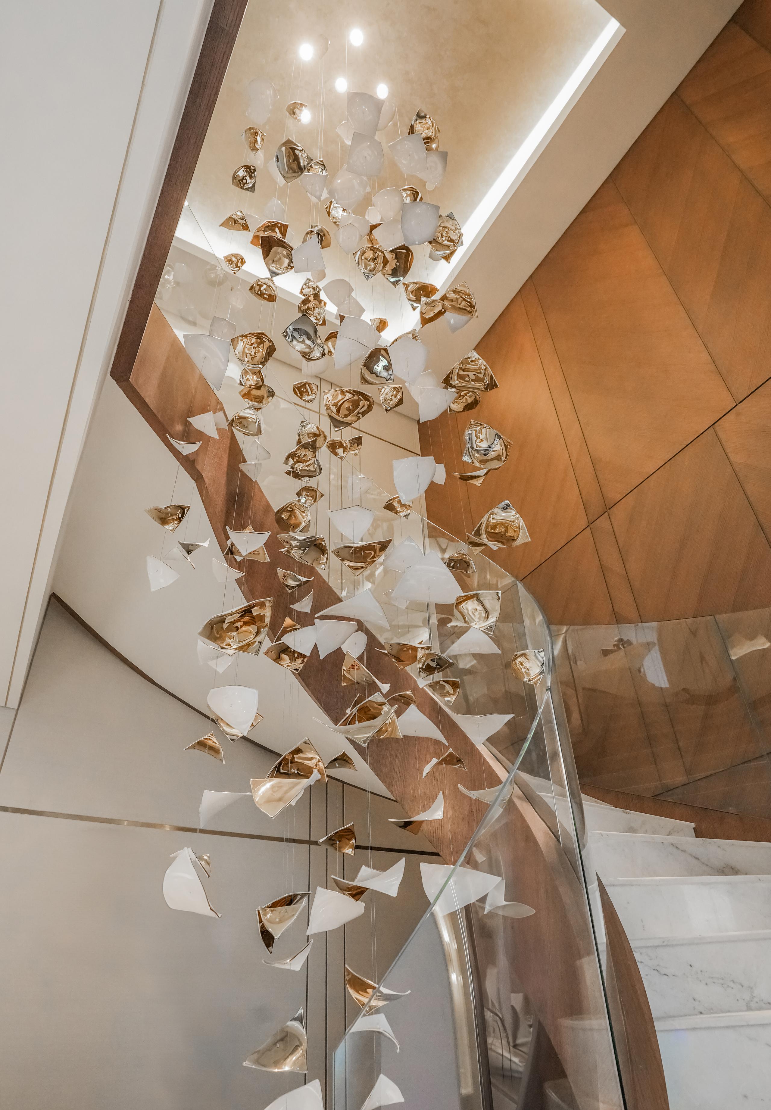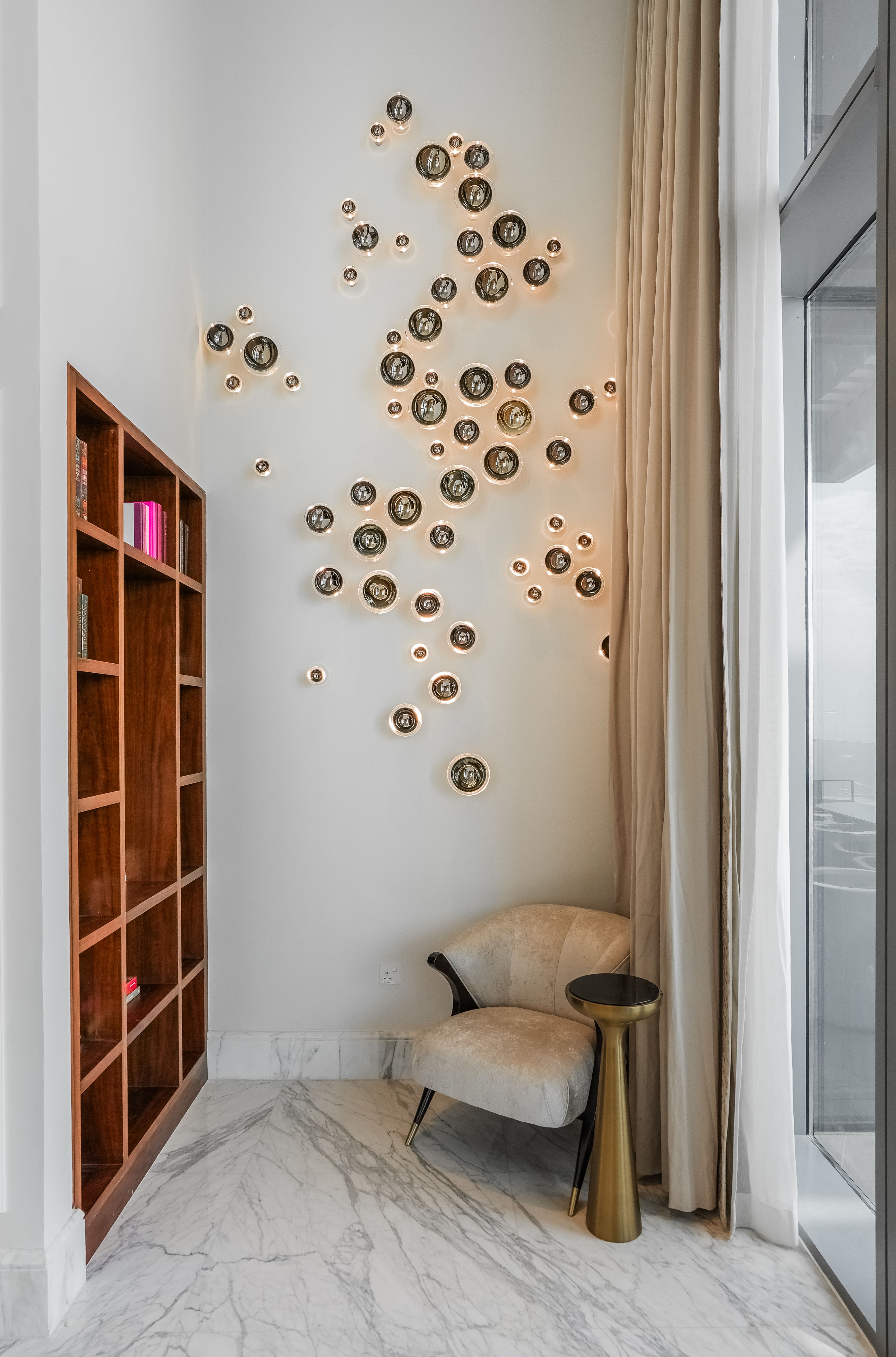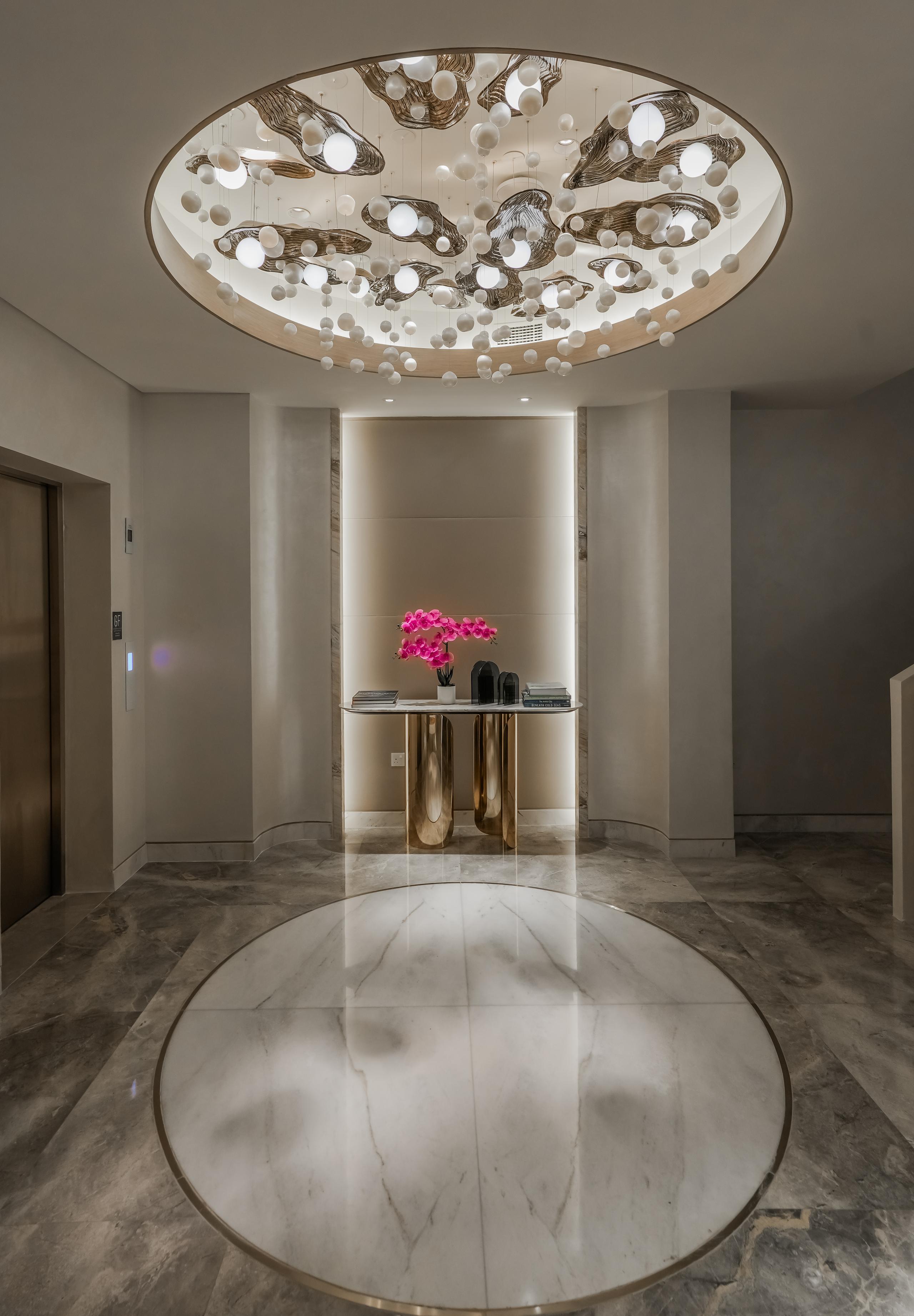 Sans Souci’s in-house design team created eighteen lighting installations for FIVE LUXE. From the twelve-meter chandelier and a glass wall composition in the lobby to specific lighting in individual apartments. Each one features its unique theme, thus, all the lighting needed to match the atmosphere and design of the rooms. Sans Souci created a comprehensive selection of custom chandeliers and installations designed to underline the visual style of the hotel perfectly.