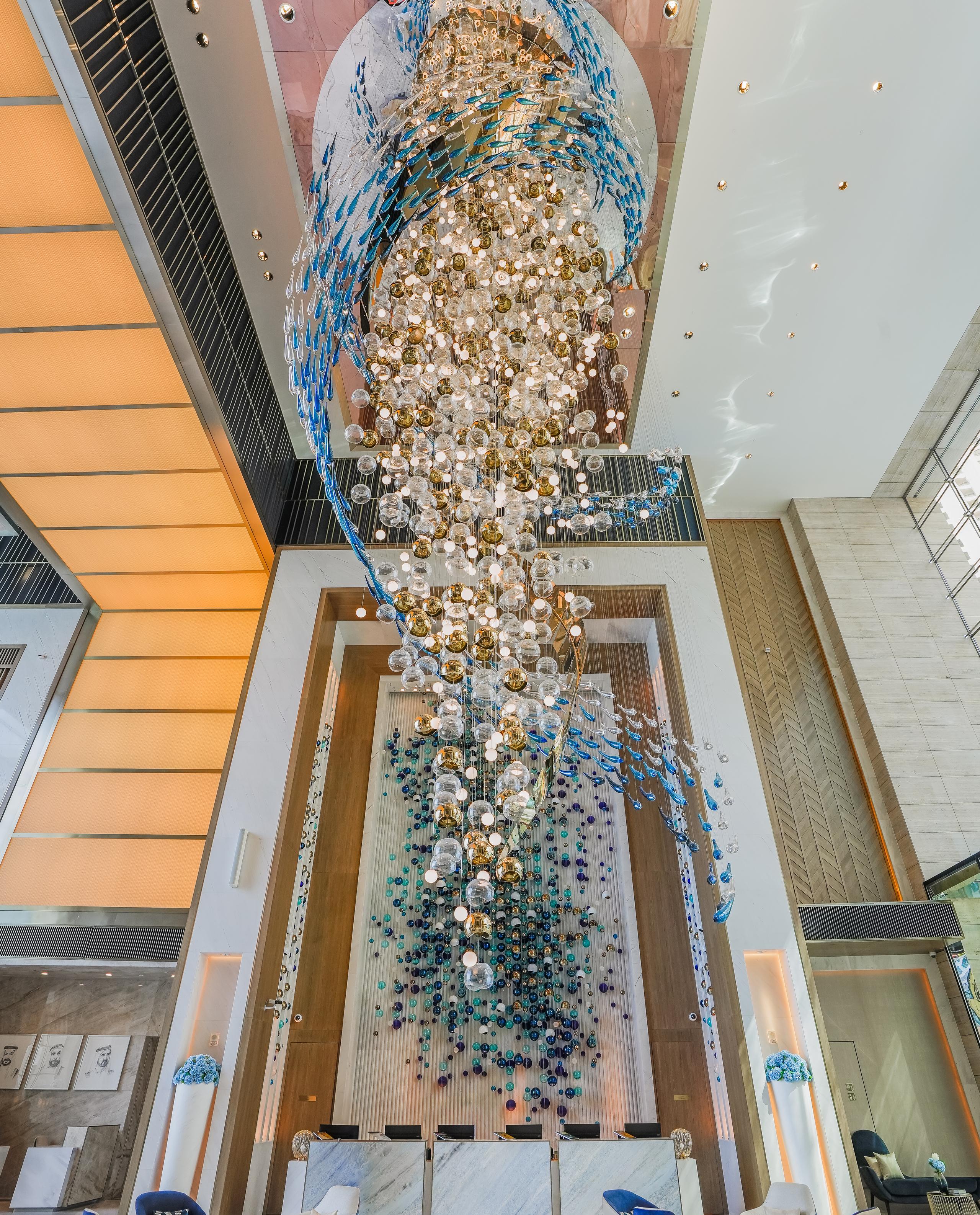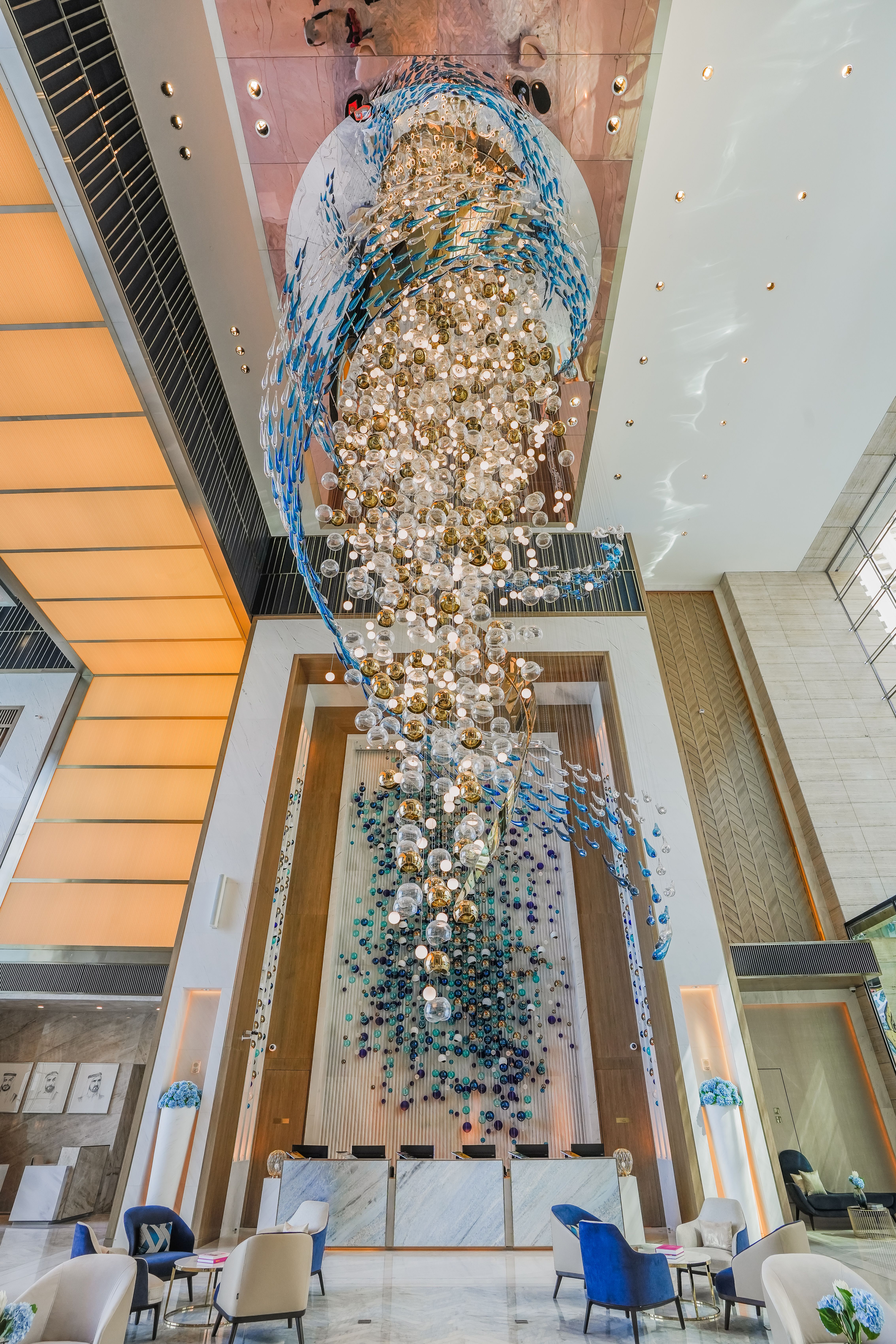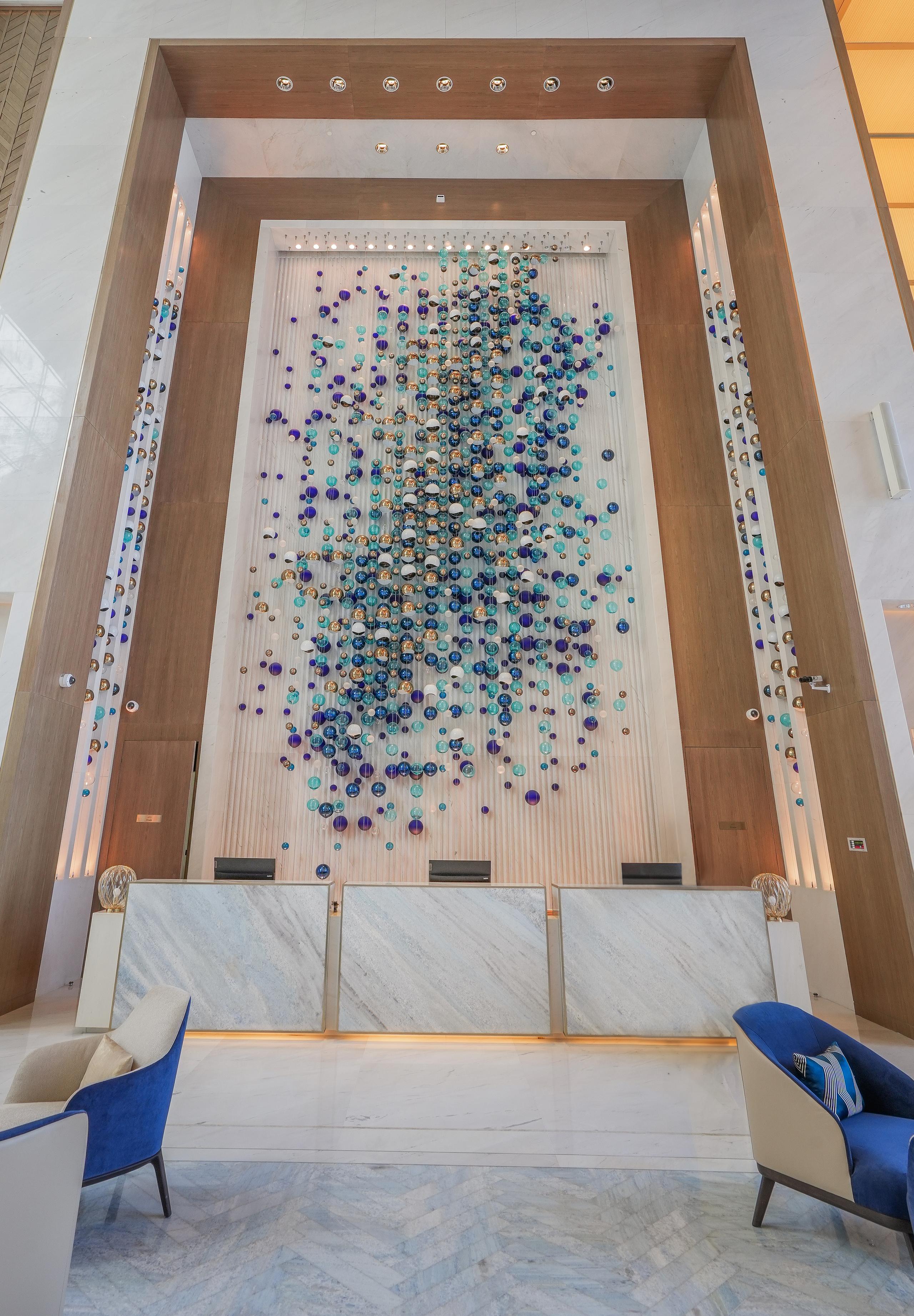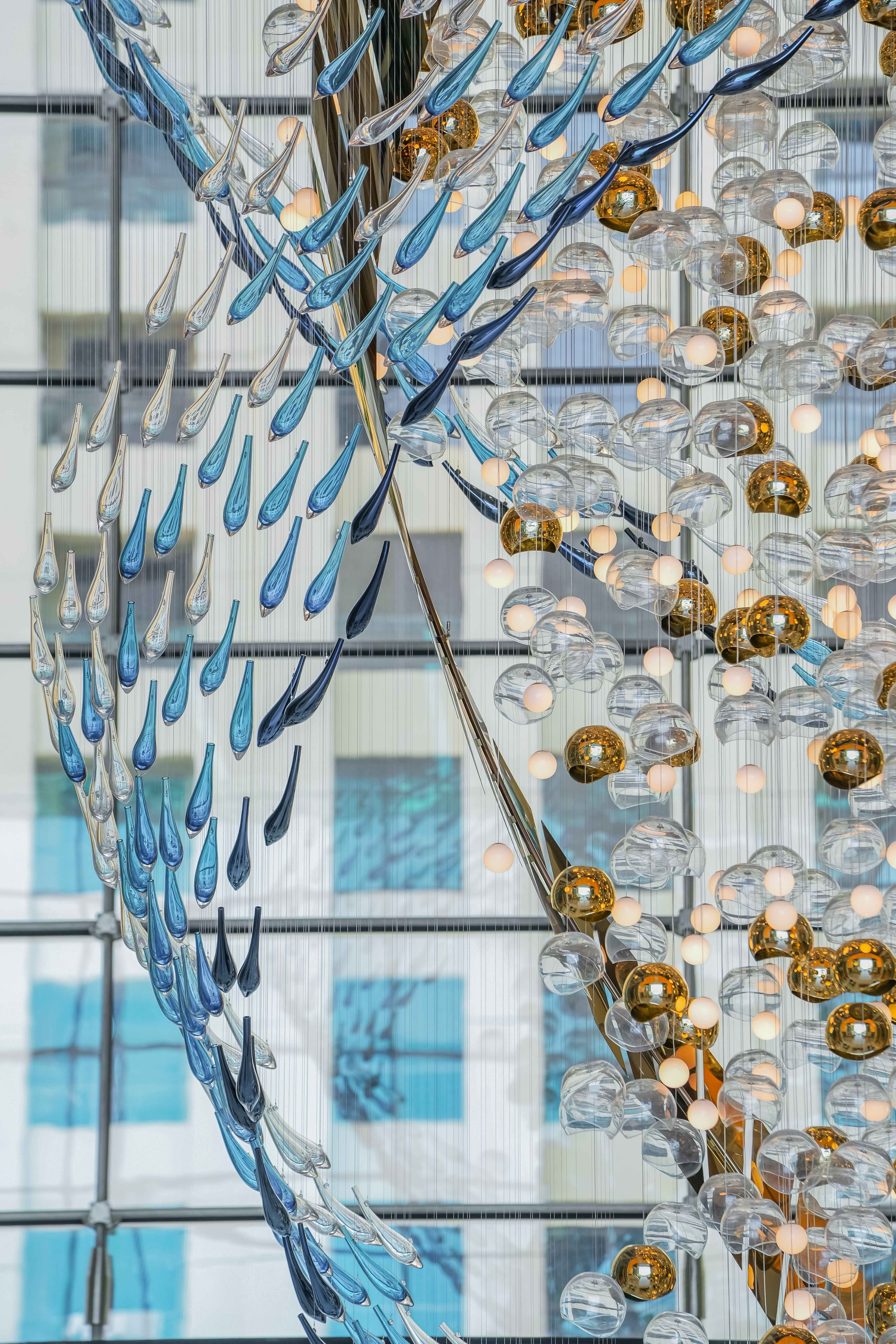 The breathtaking twelve-metre chandelier, visible from all sides of the glass-enclosed lobby, is inspired by the fascinating, diverse and colourful world beneath the sea that surrounds the hotel resort and the whole of Dubai. The design is composed of crystal balls with sandblasted spheres and stylized droplets resembling fish.