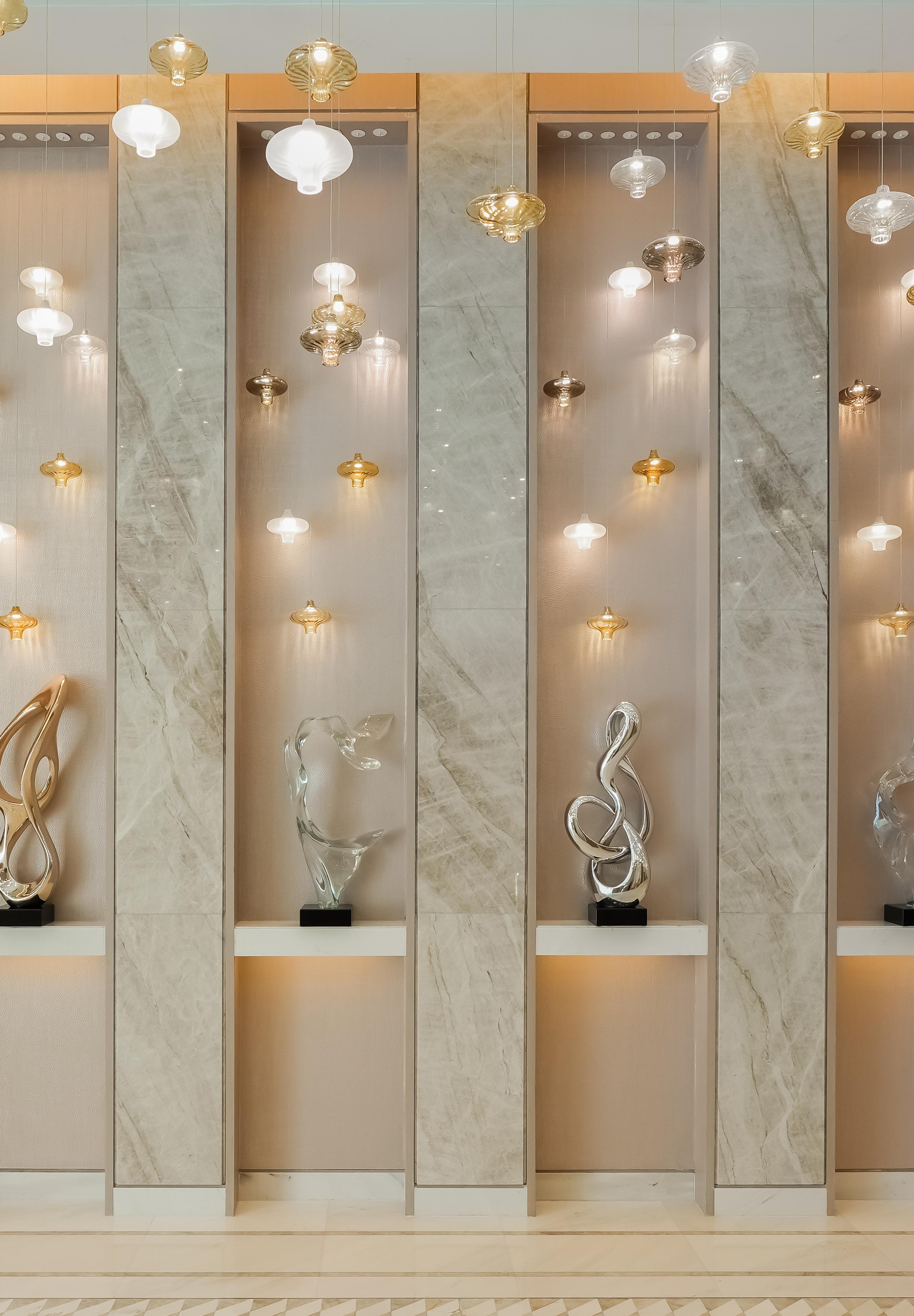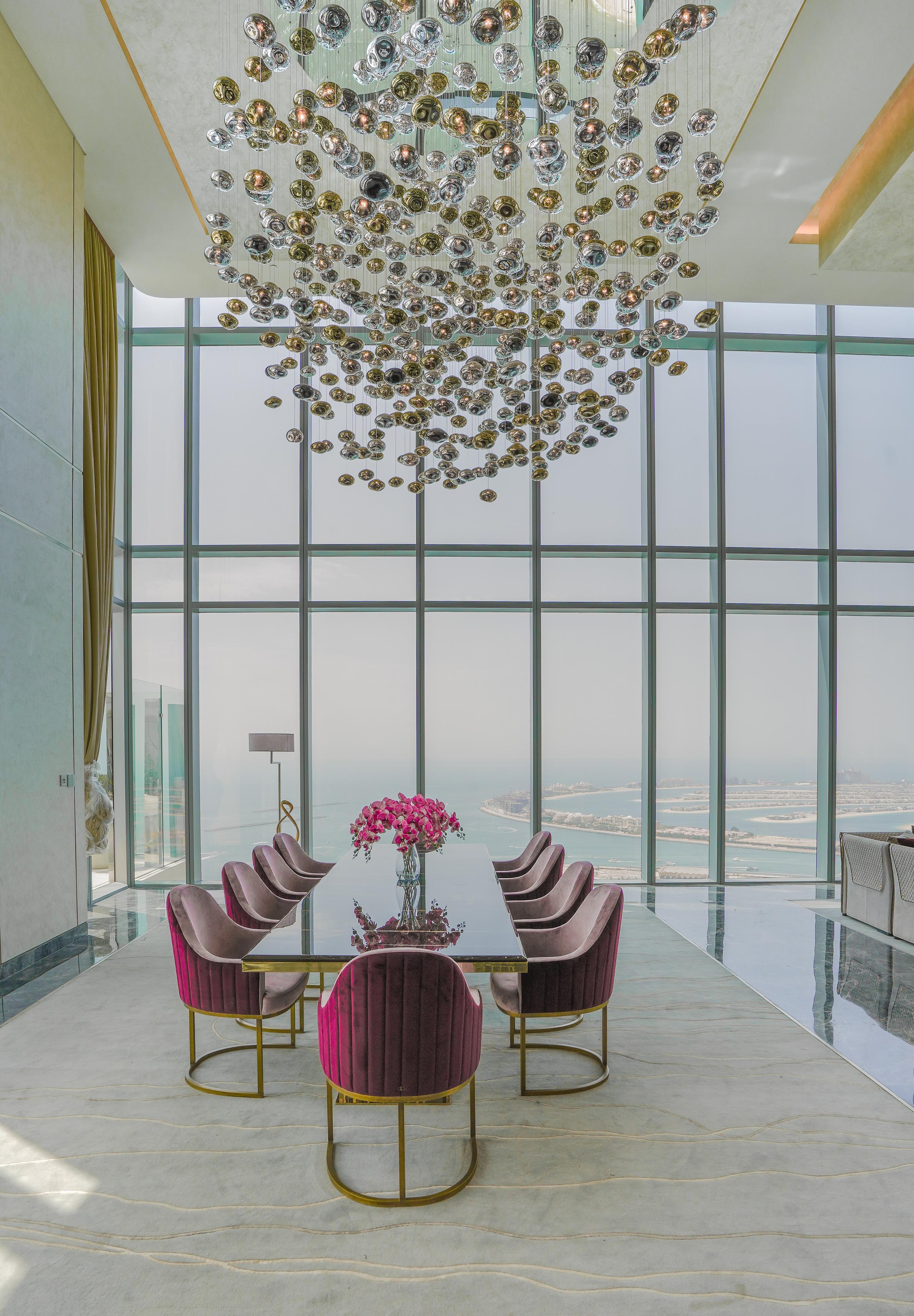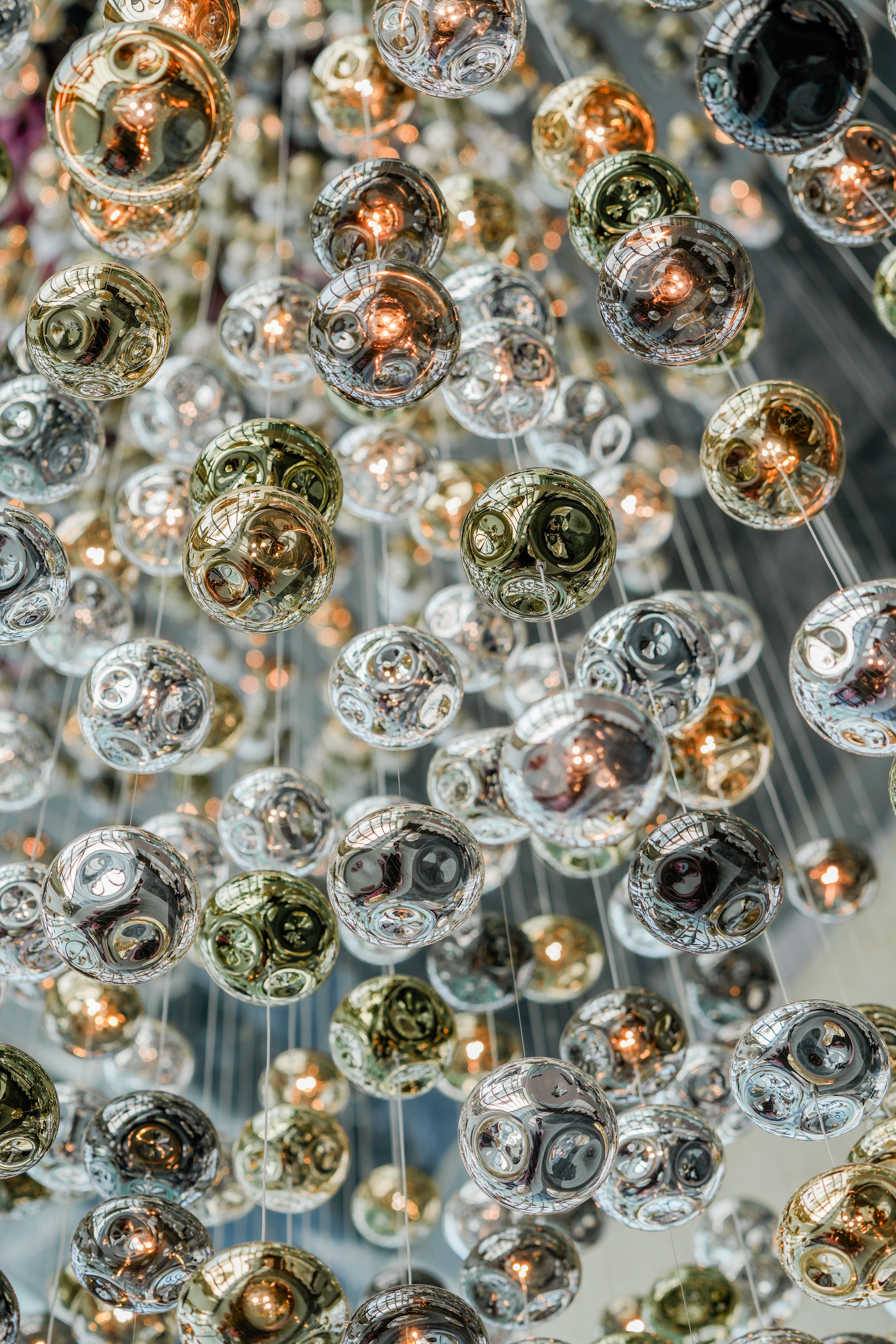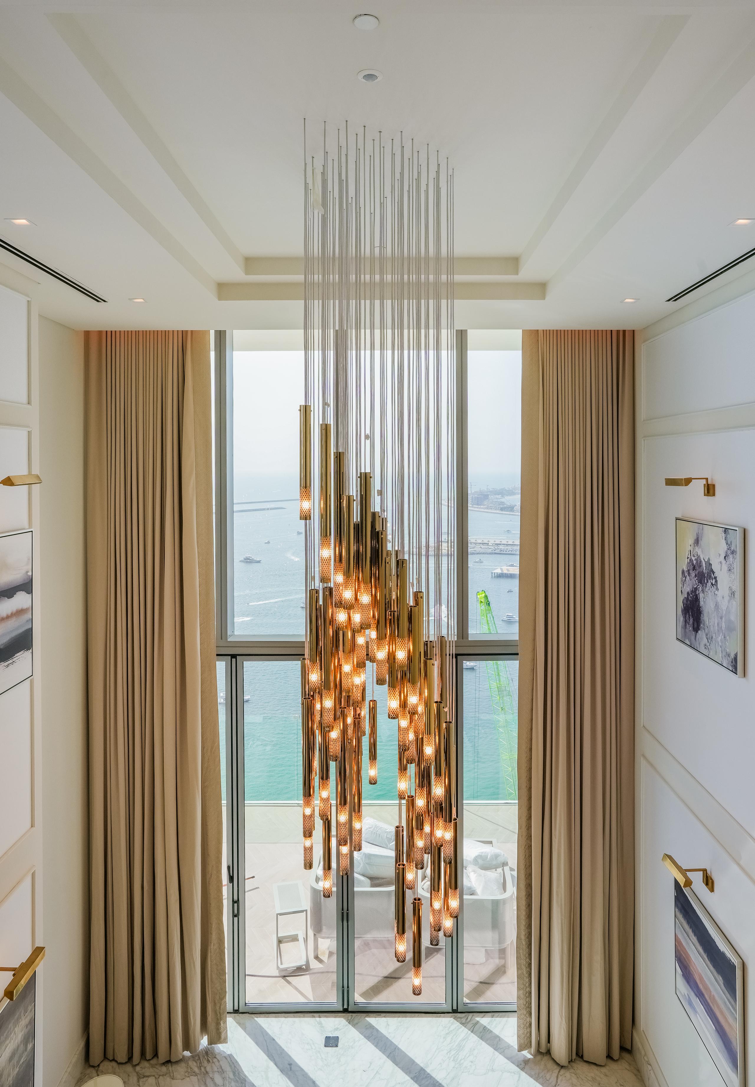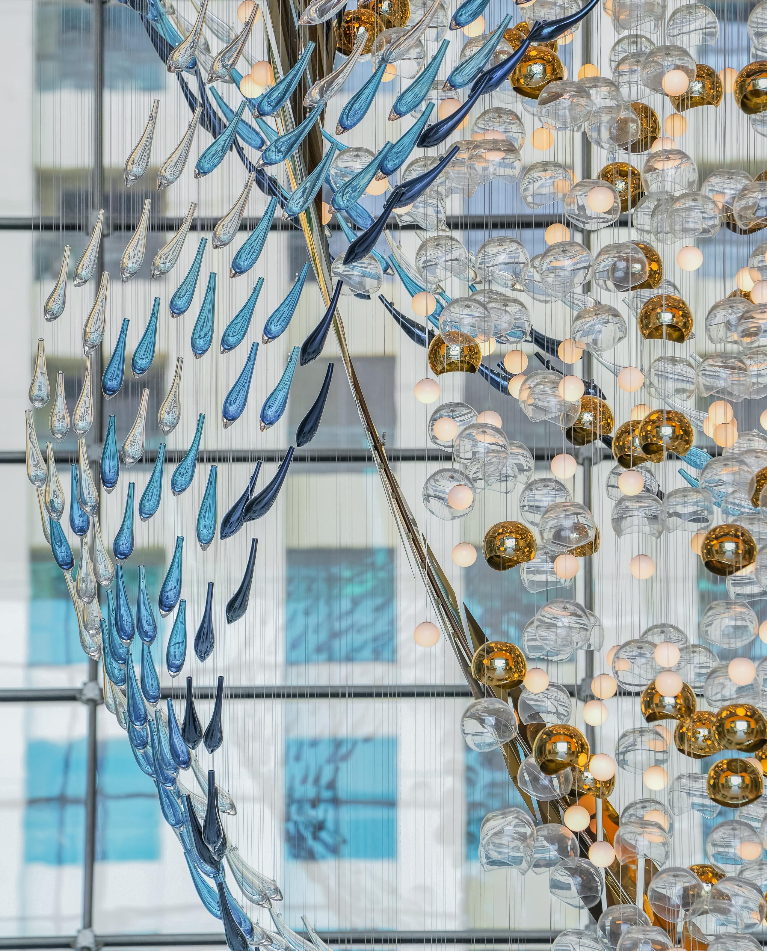 The breathtaking twelve-metre chandelier, visible from all sides of the glass-enclosed lobby, is inspired by the fascinating, diverse and colourful world beneath the sea that surrounds the hotel resort and the whole of Dubai. The design is composed of crystal balls with sandblasted spheres and stylized droplets resembling fish.