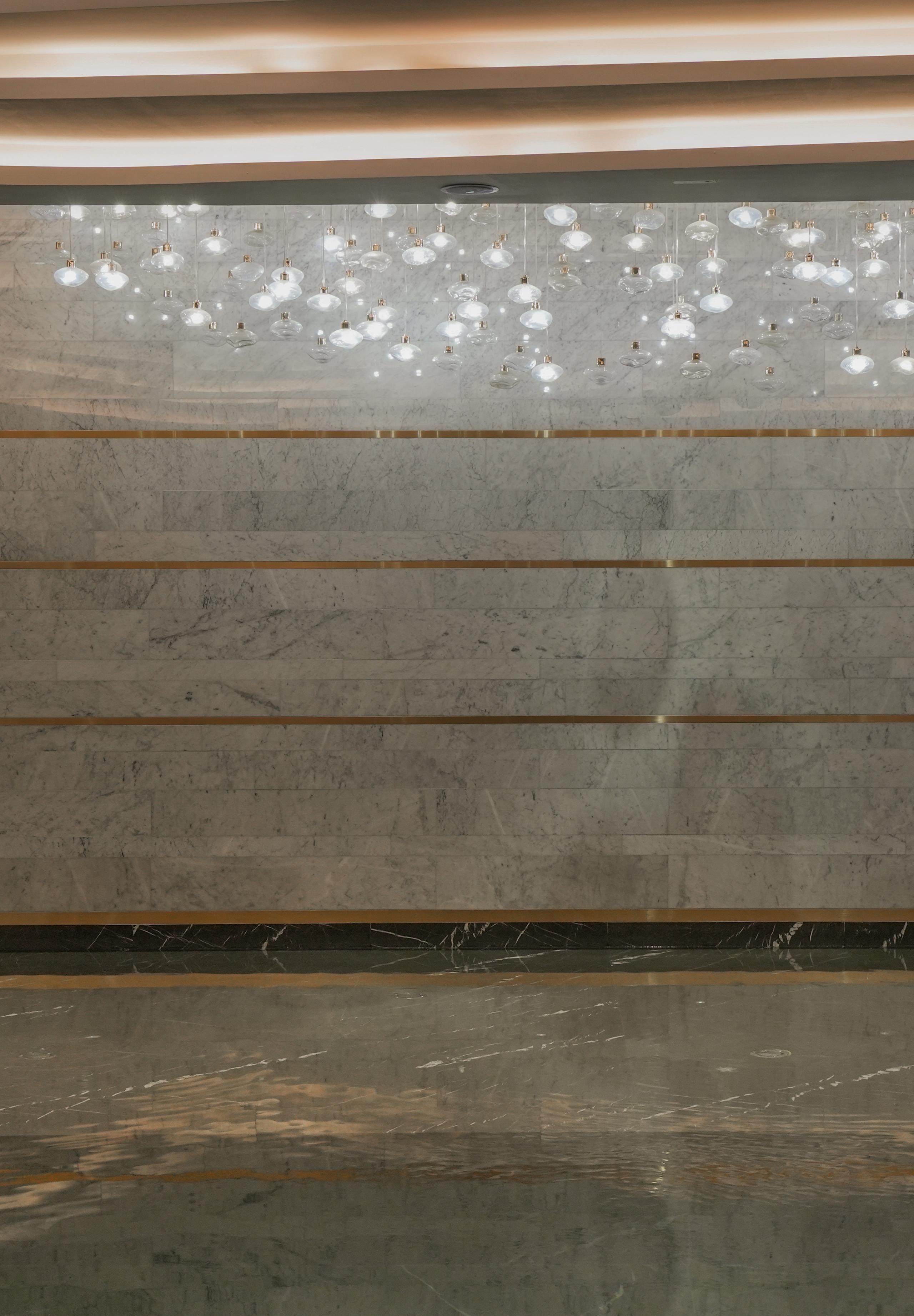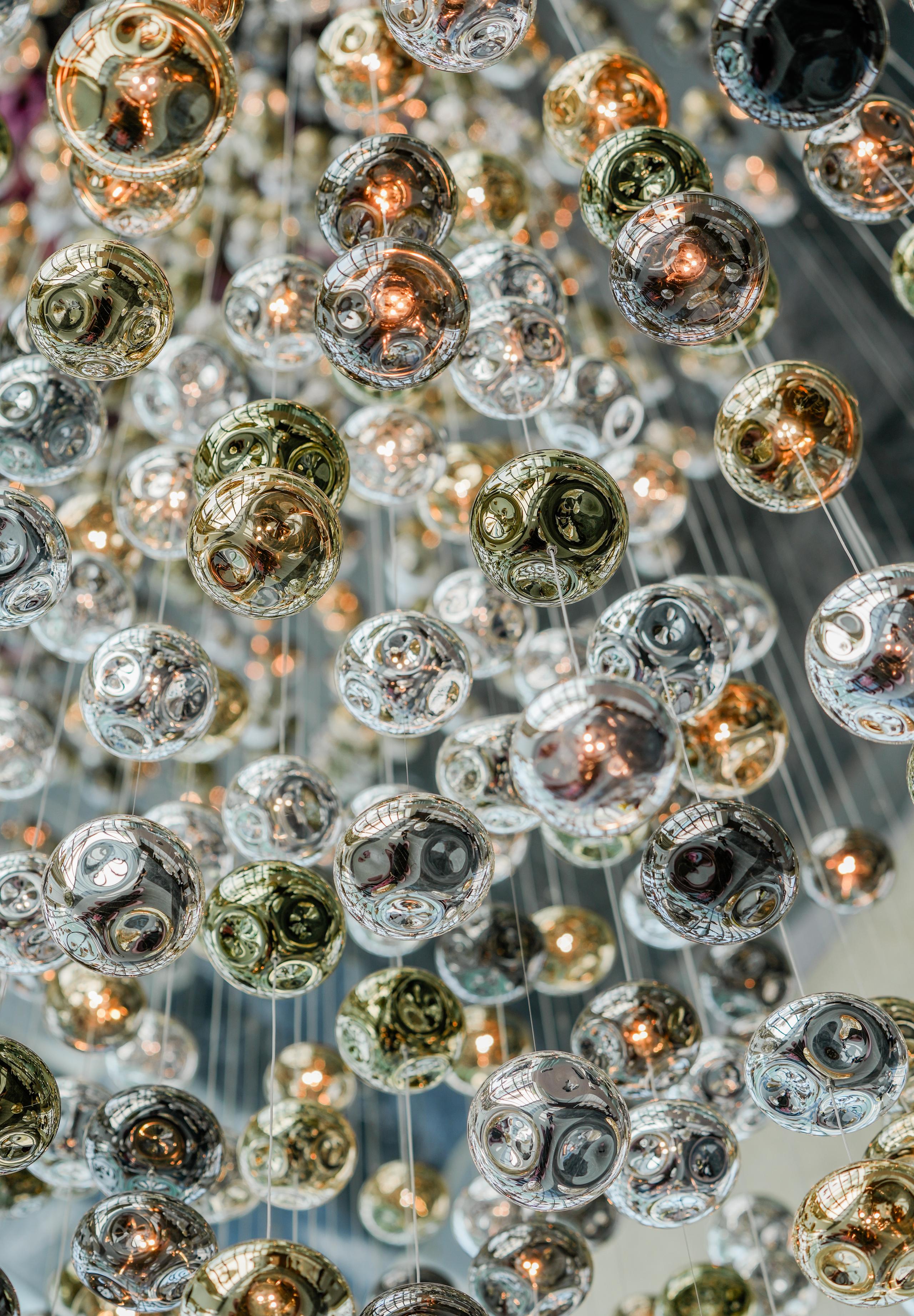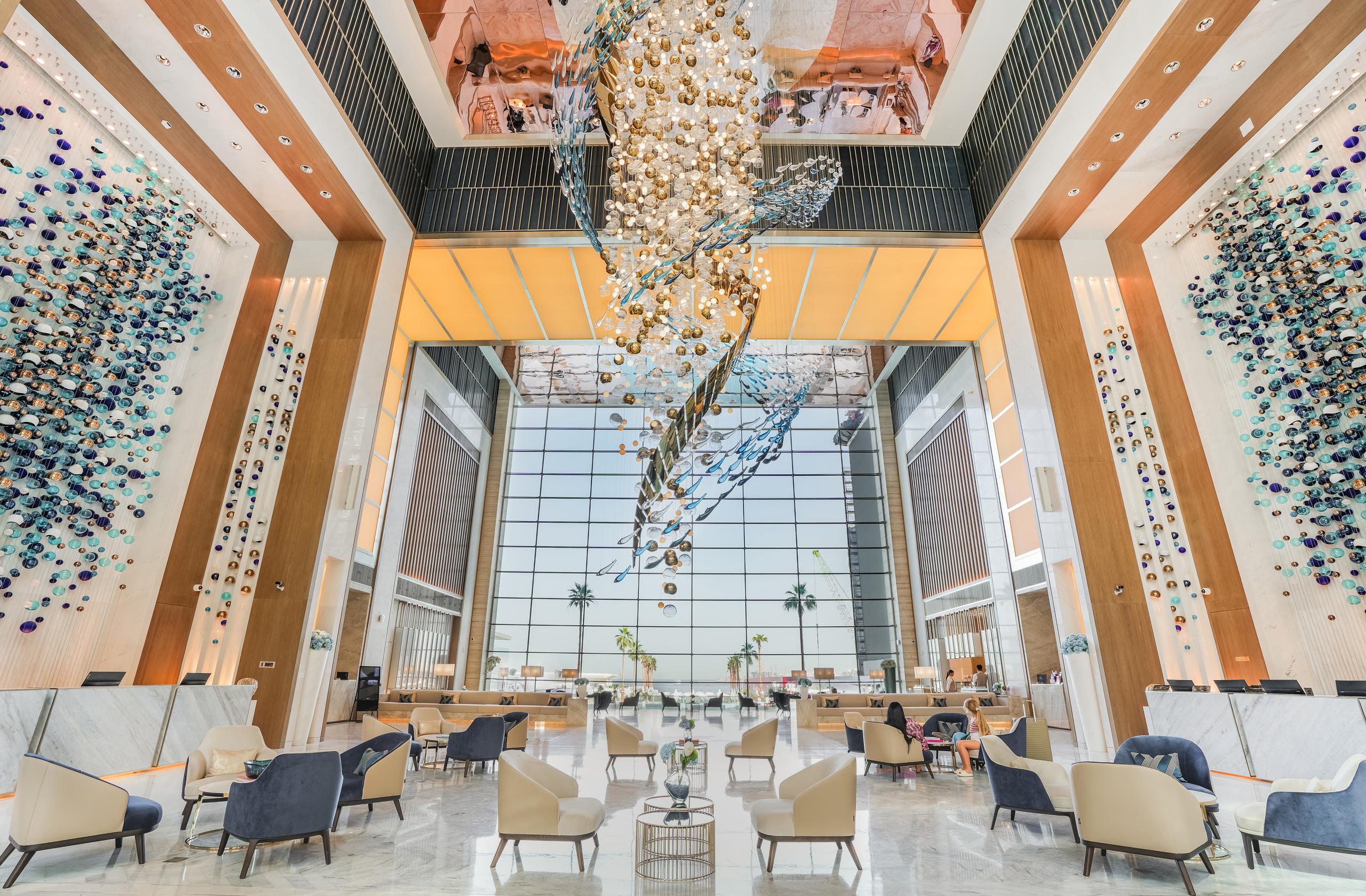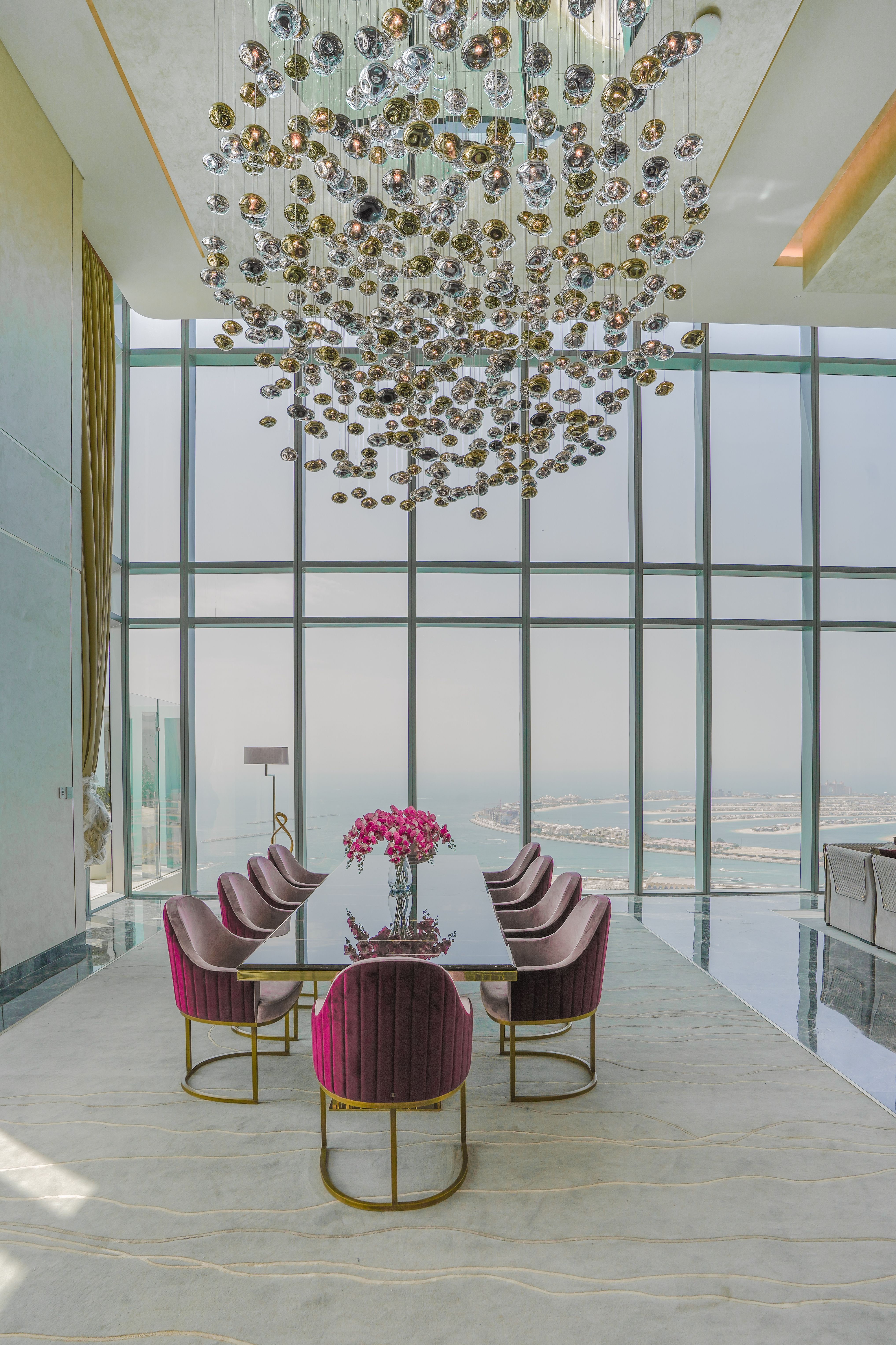 The breathtaking twelve-metre chandelier, visible from all sides of the glass-enclosed lobby, is inspired by the fascinating, diverse and colourful world beneath the sea that surrounds the hotel resort and the whole of Dubai. The design is composed of crystal balls with sandblasted spheres and stylized droplets resembling fish.