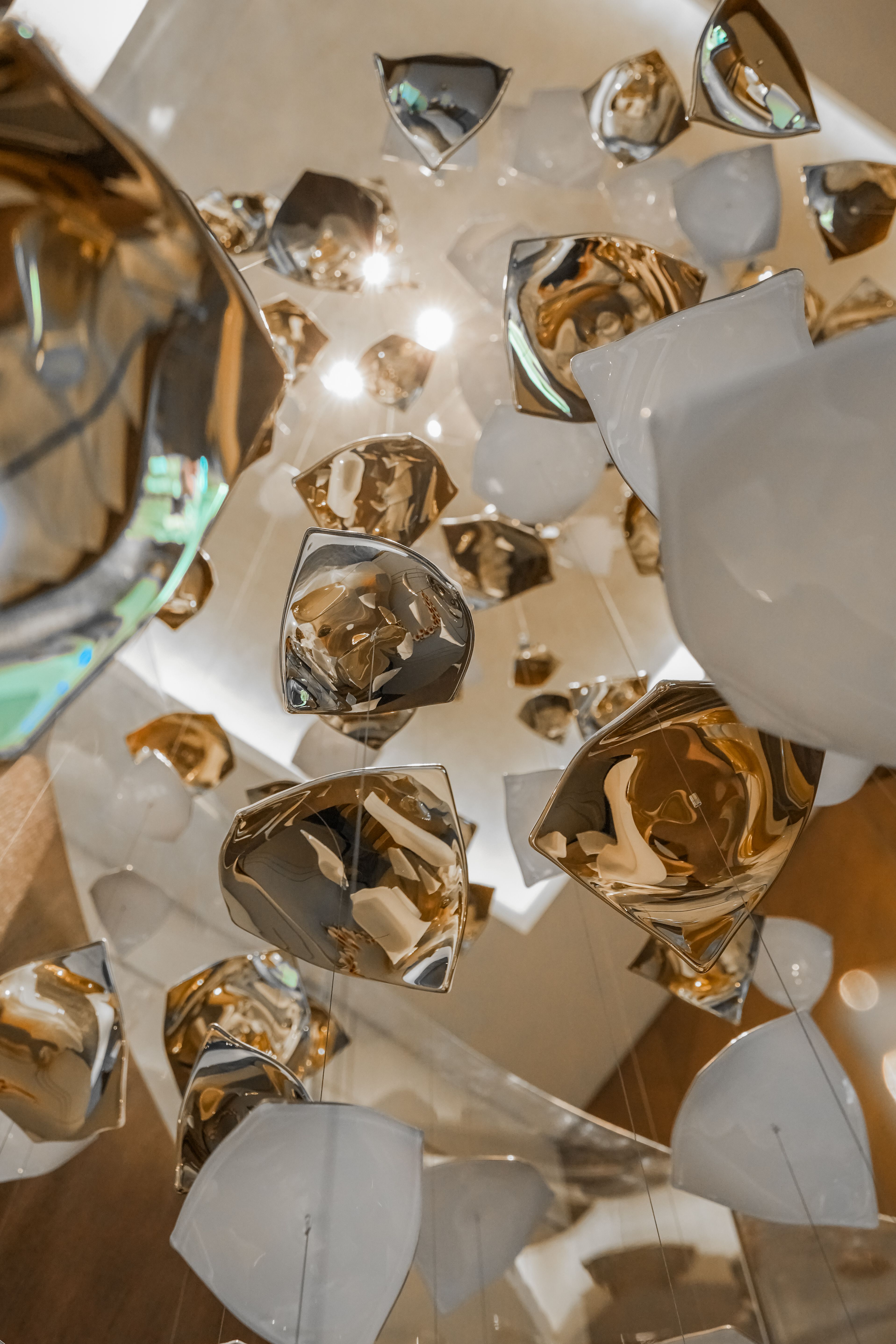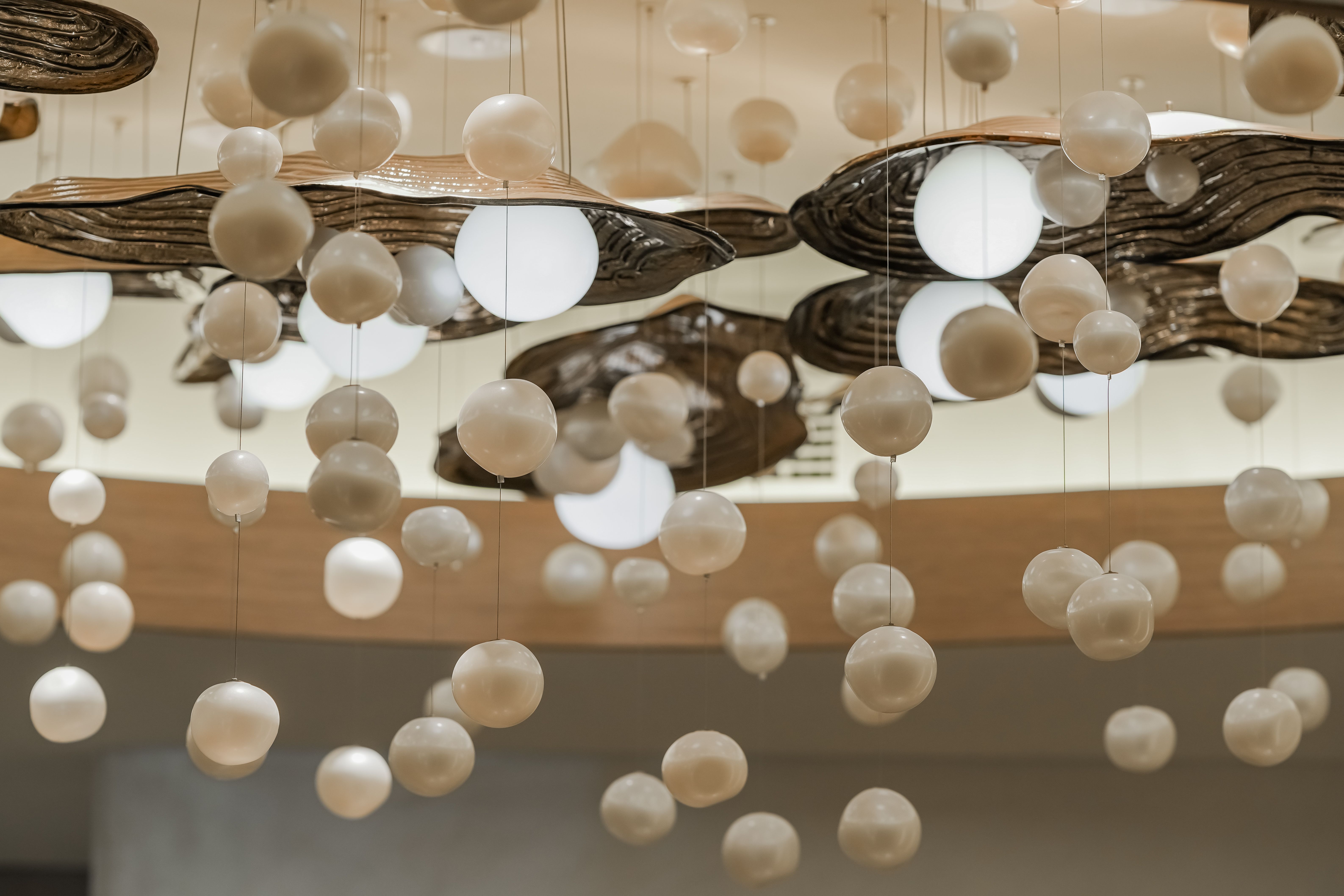 Each component of the main chandelier is also coated with a special nanocoating layer, significantly reducing maintenance needs. Sans Souci has been developing this unique technology for almost 20 years, which enhances the aesthetic and technical properties of glass. Unlike other methods, nanocoating uses minimal material, no water, and enables metal recovery and glass recycling, minimizing the overall ecological impact.
